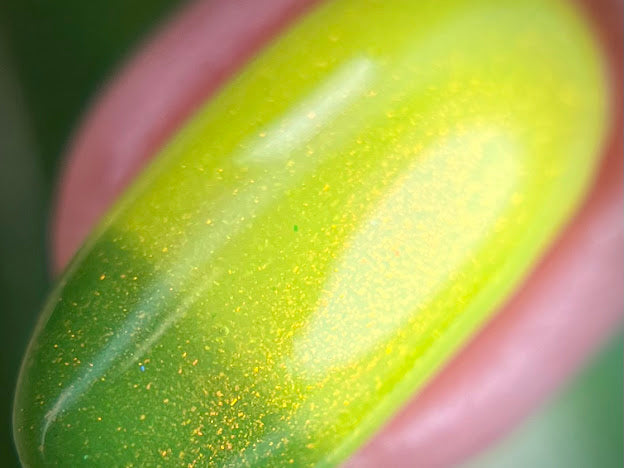 A green (cold) to bright yellow (warm) thermal with an intense glowey red/copper shimmer. Named by Mary Sandberg