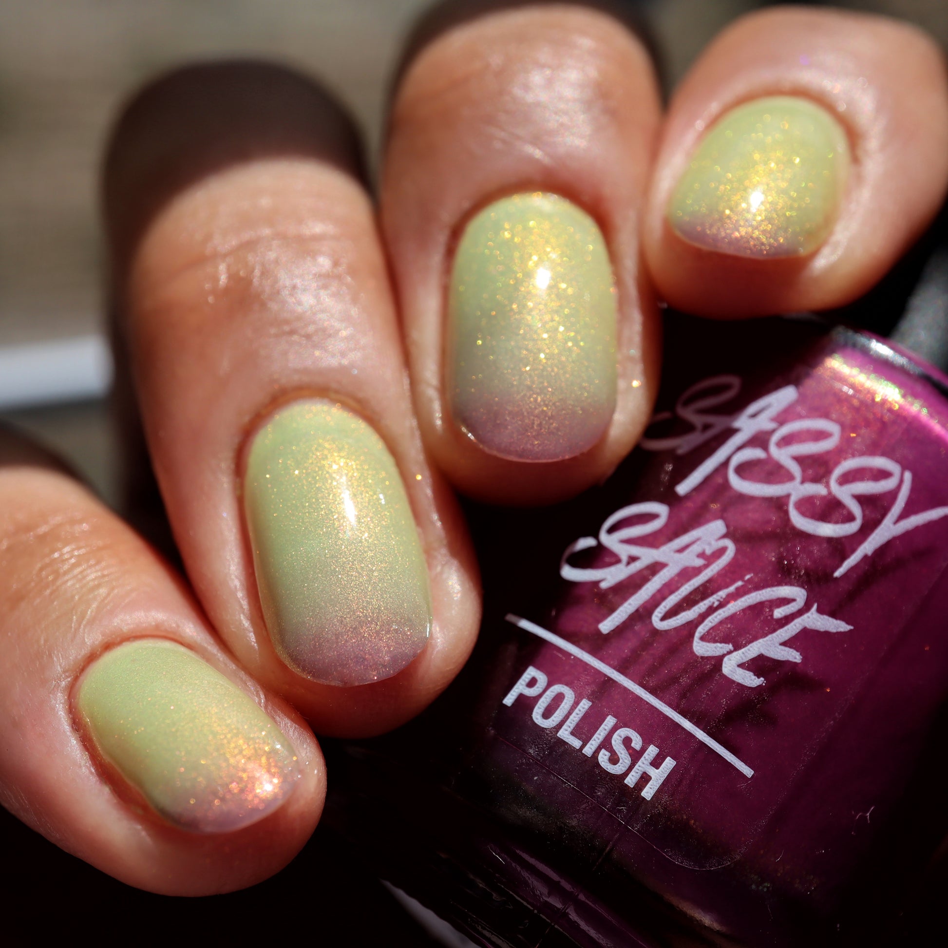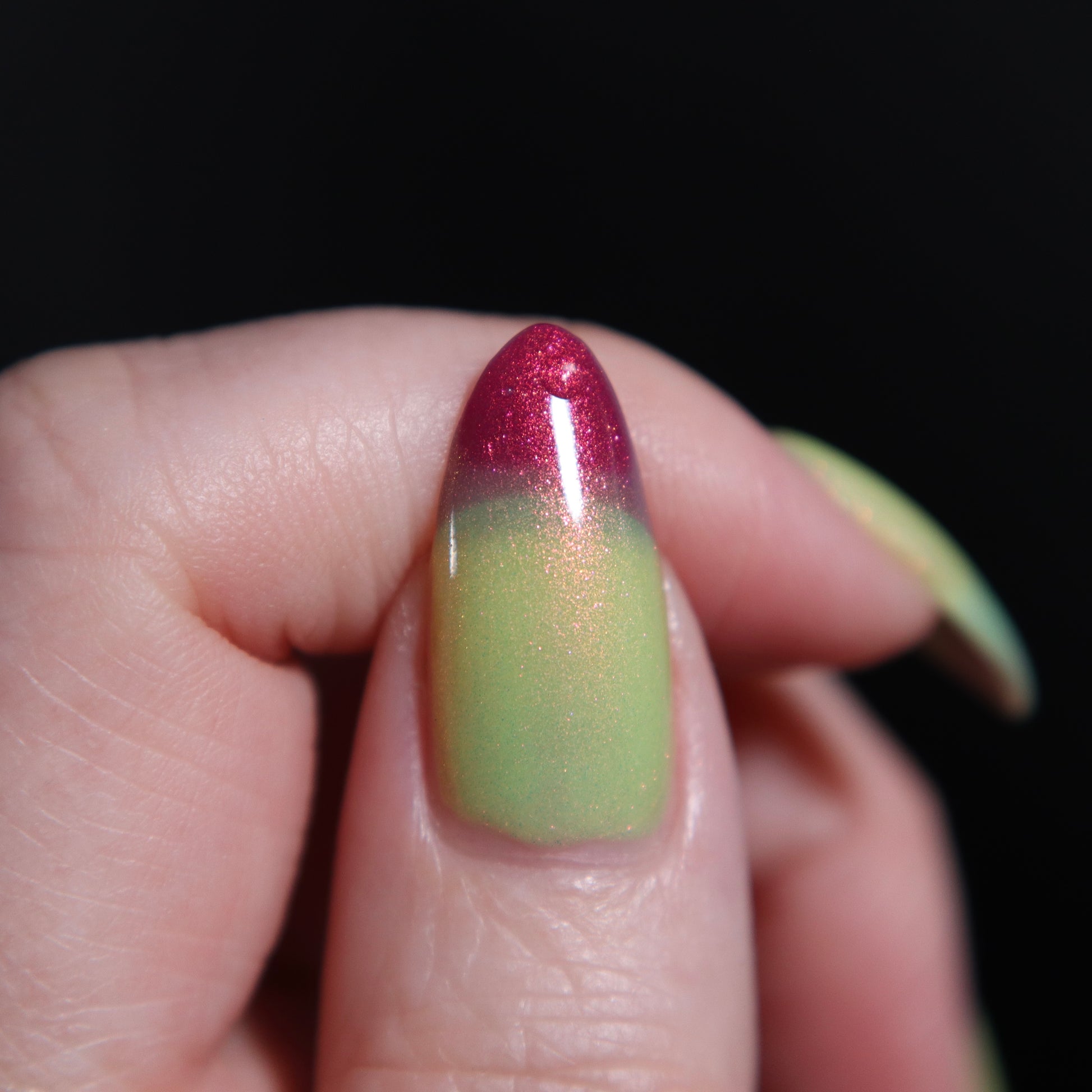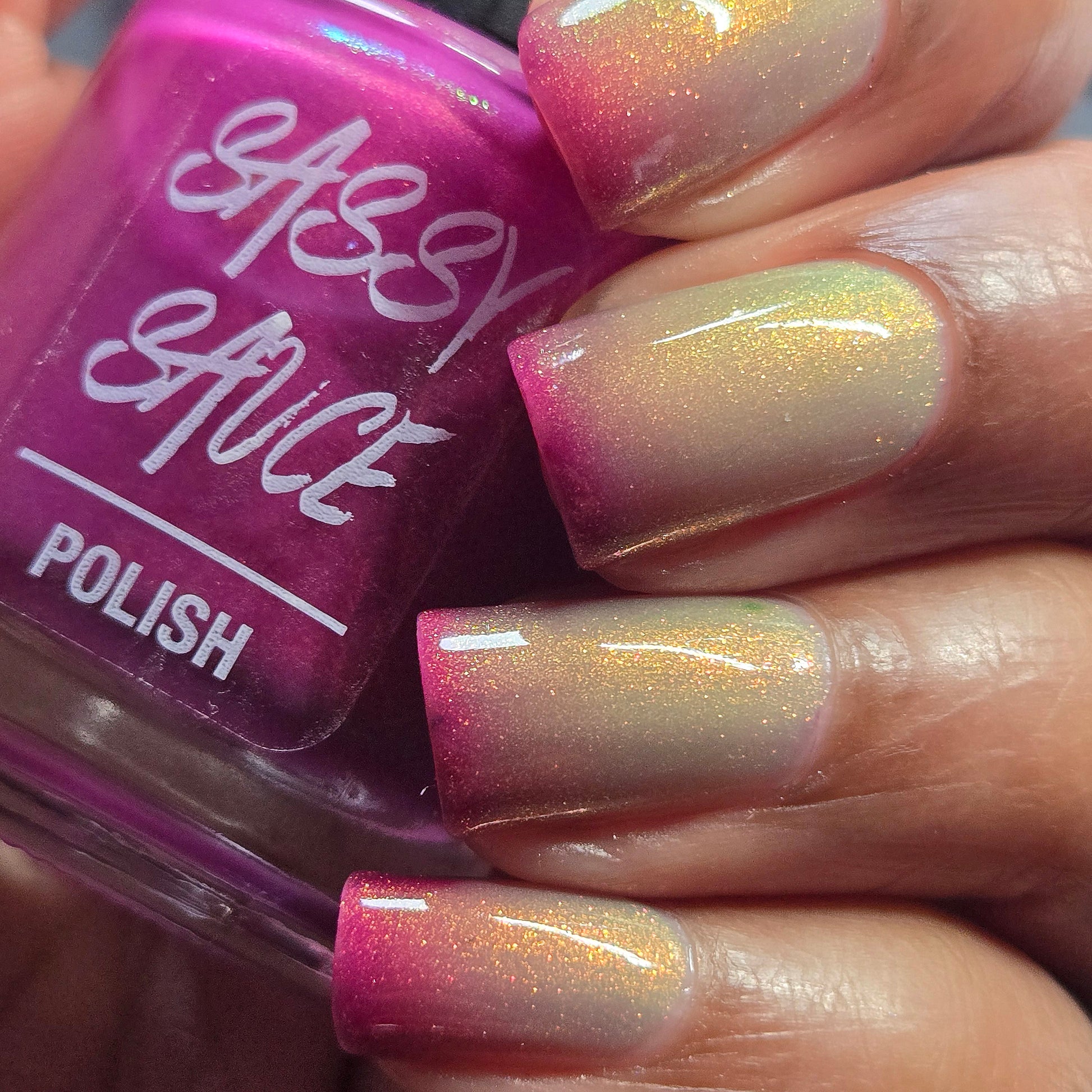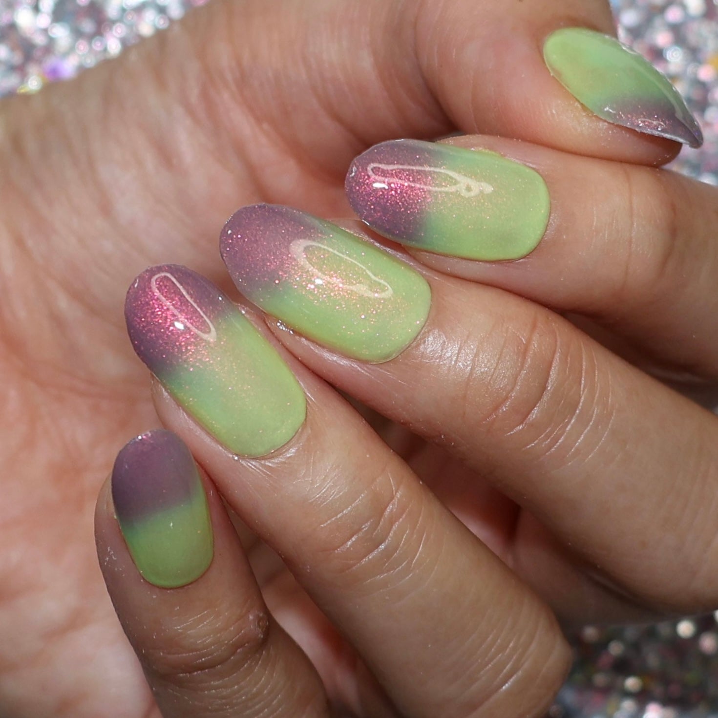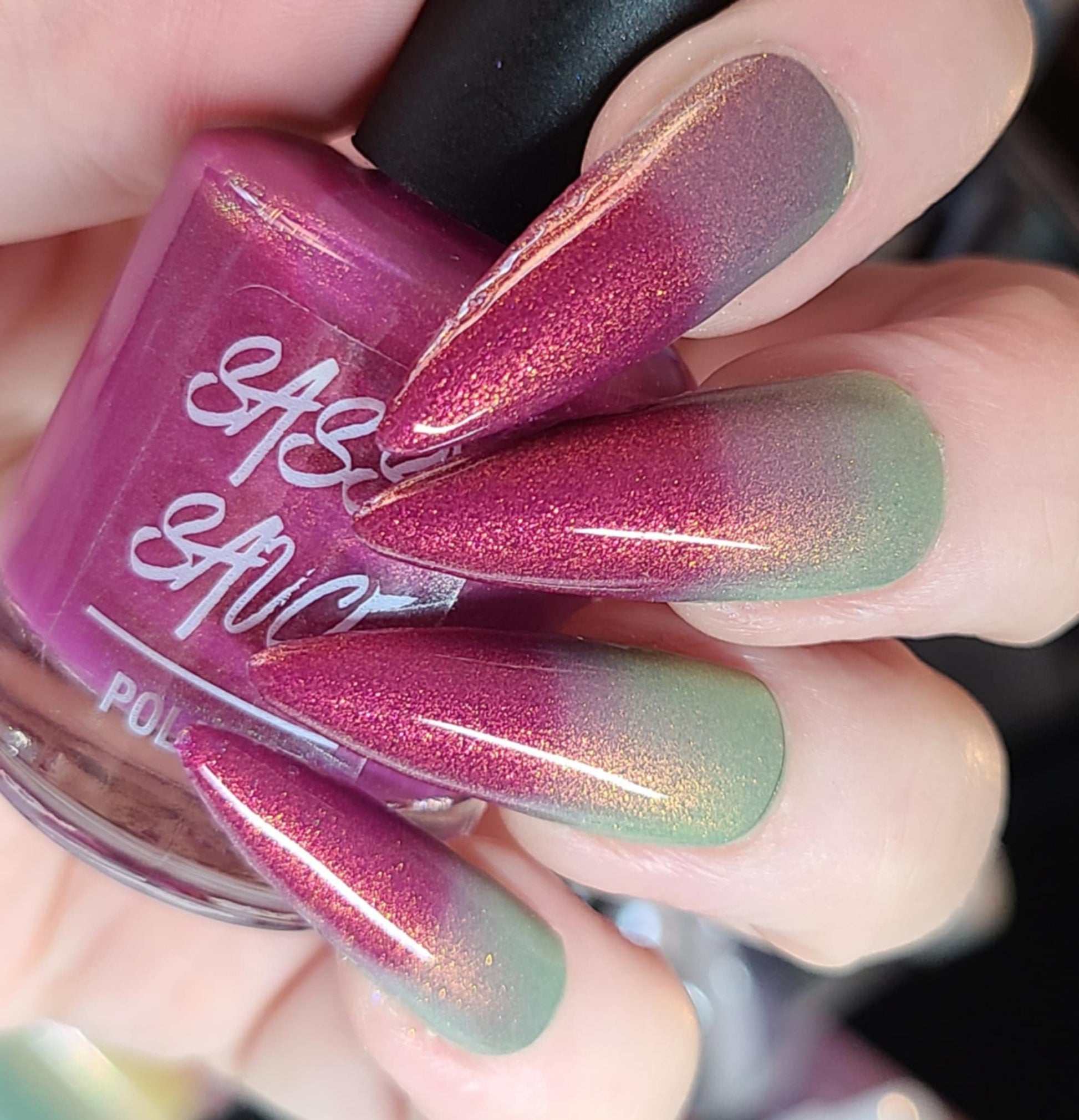 A purple (cold) to yellow (warm 88 degrees) thermal with red/copper/green shimmer. You may see some green transition in the thermal as well. This group custom is for the purple polish people fb group, please join if you are not already in there. Named by Mary Sandberg.