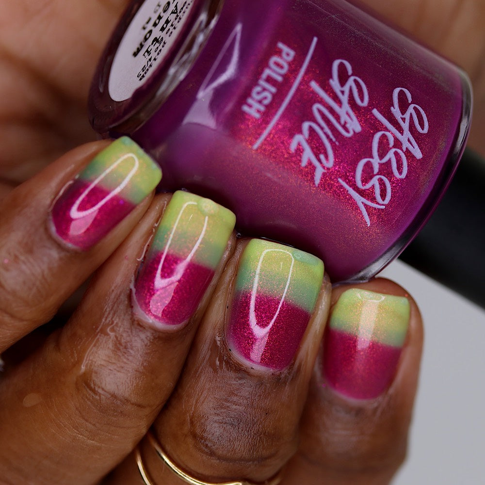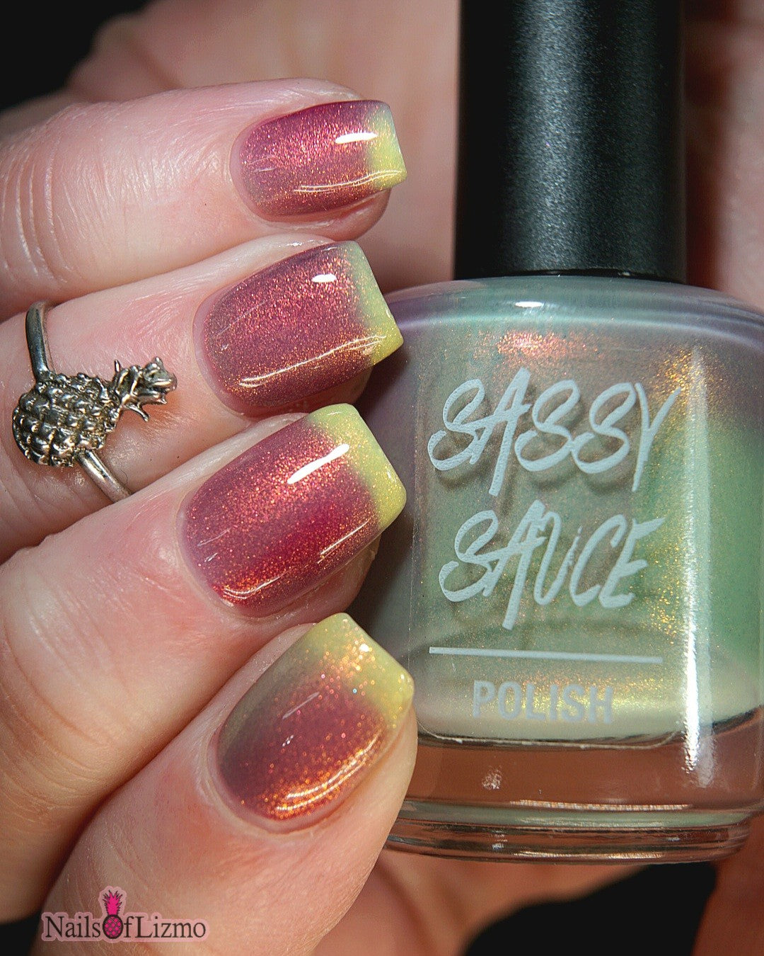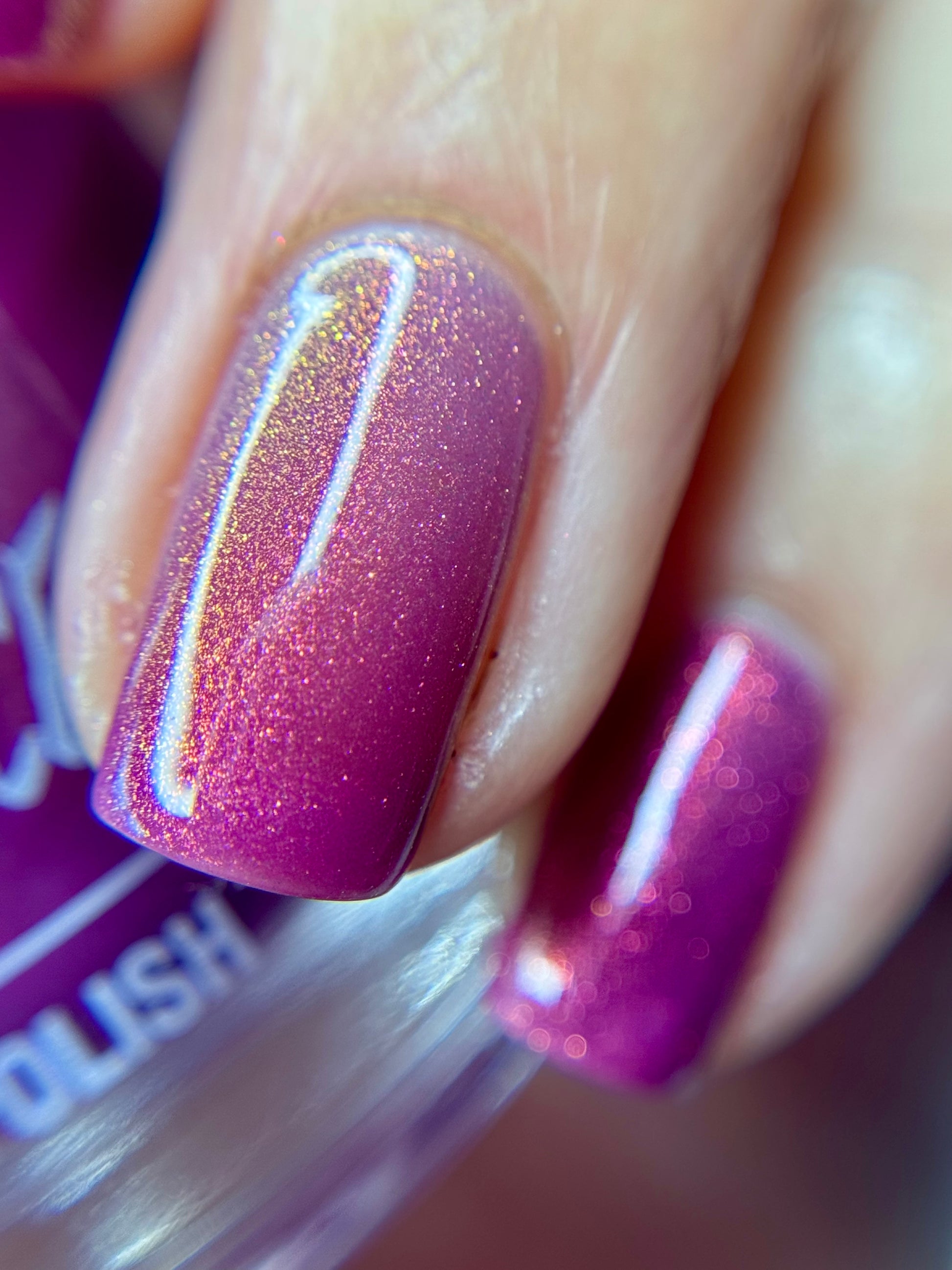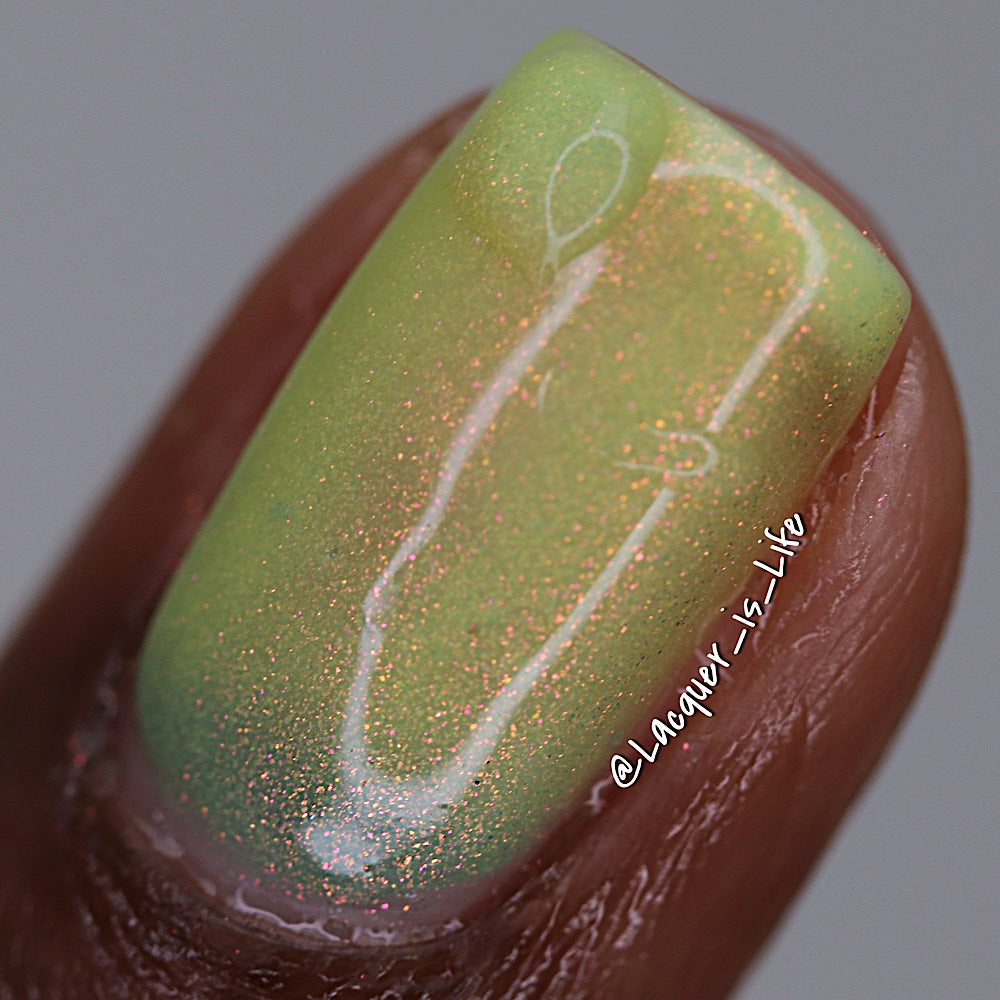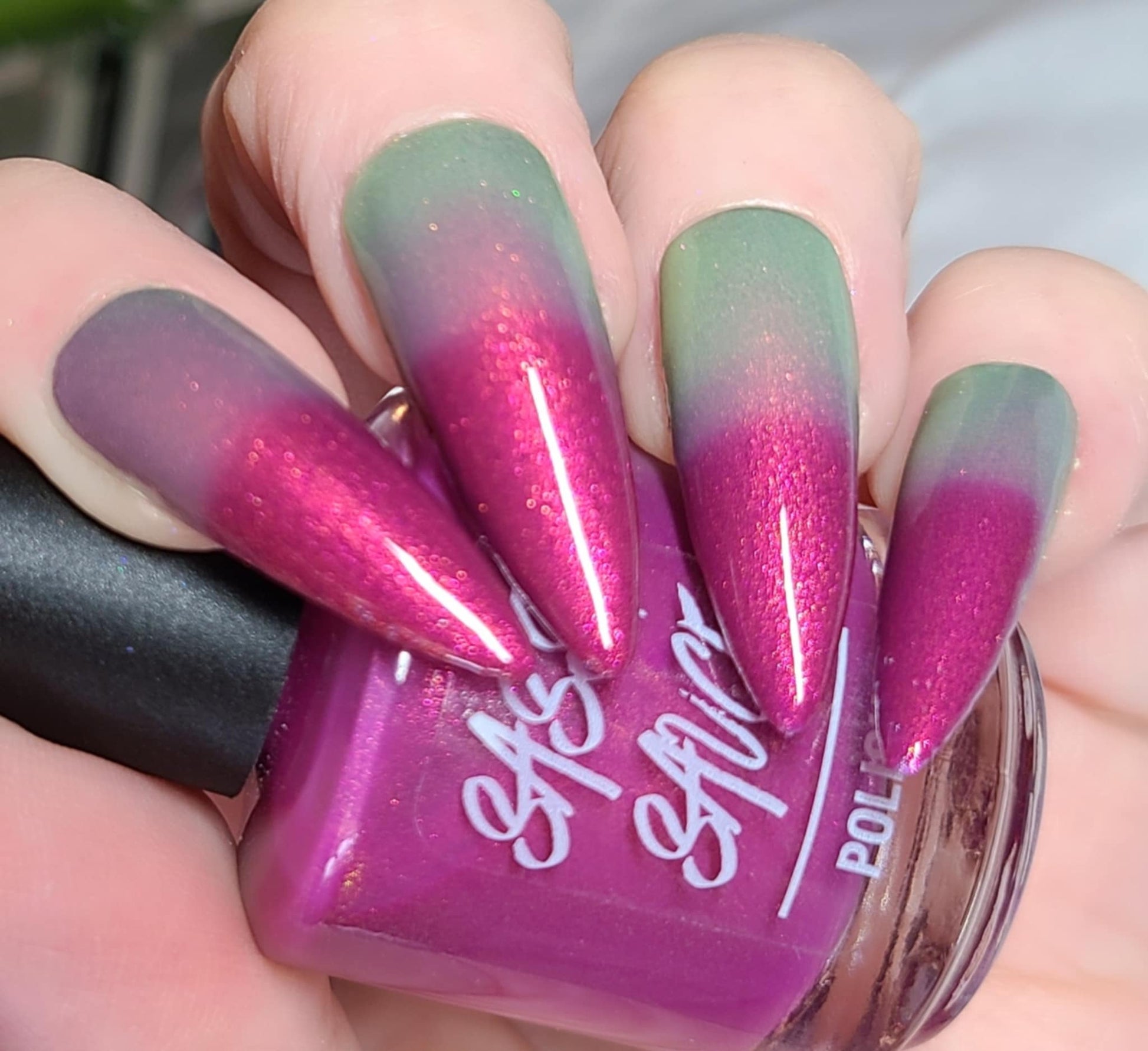 A purple (cold) to yellow (warm 88 degrees) thermal with red/copper/green shimmer. You may see some green transition in the thermal as well. This group custom is for the purple polish people fb group, please join if you are not already in there. Named by Mary Sandberg.