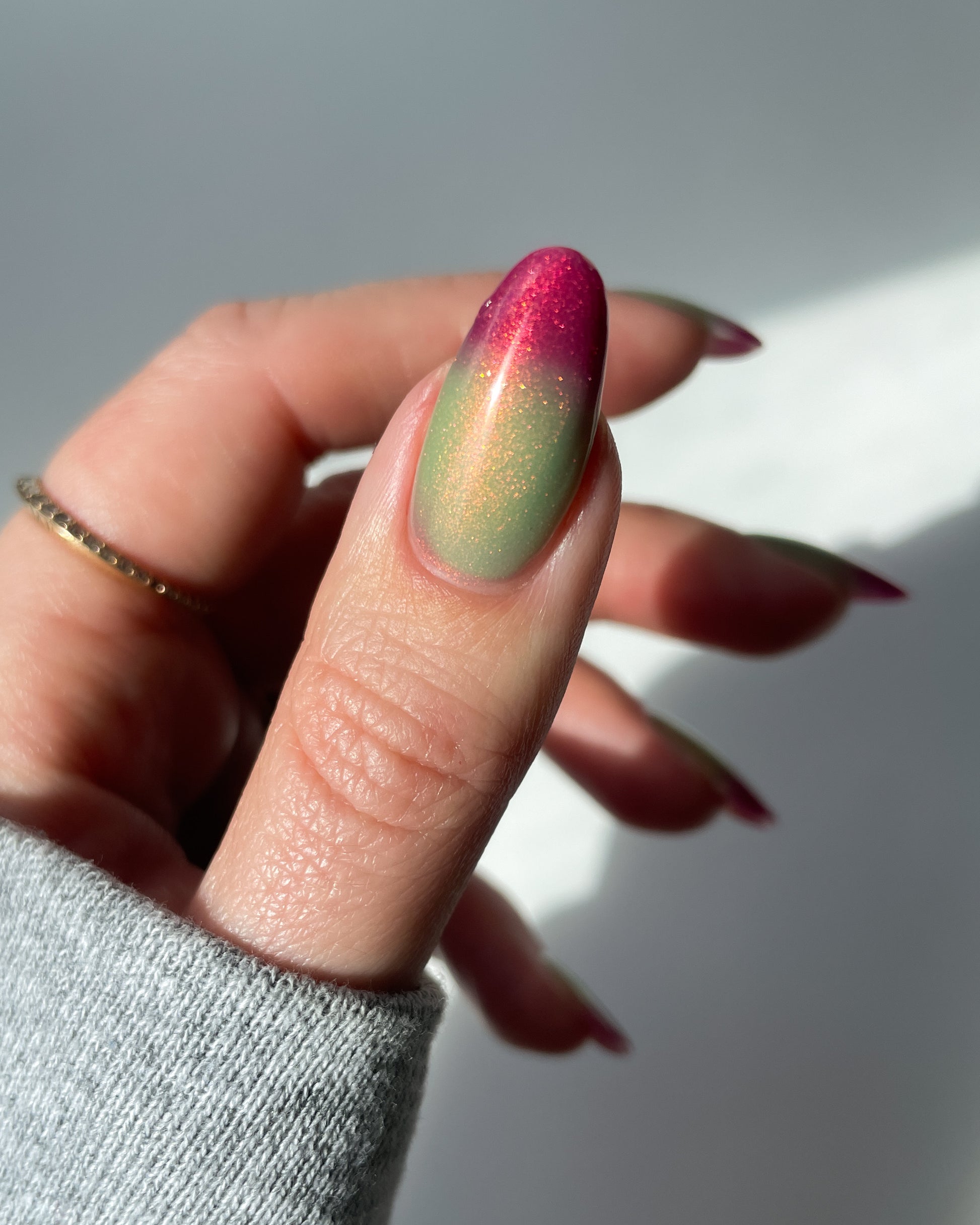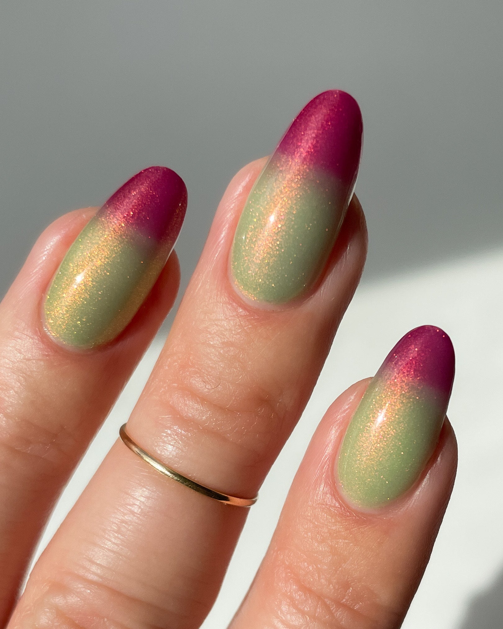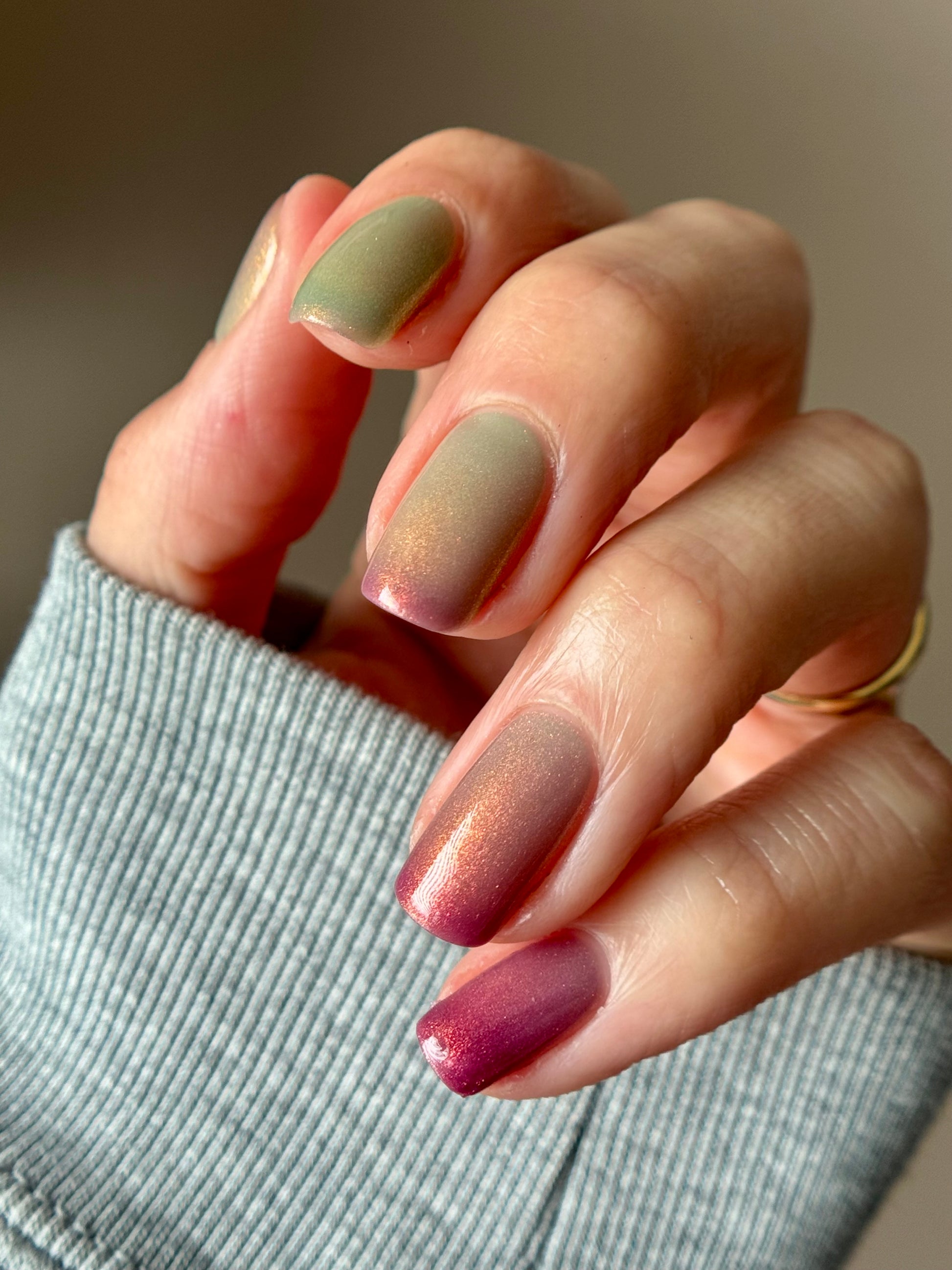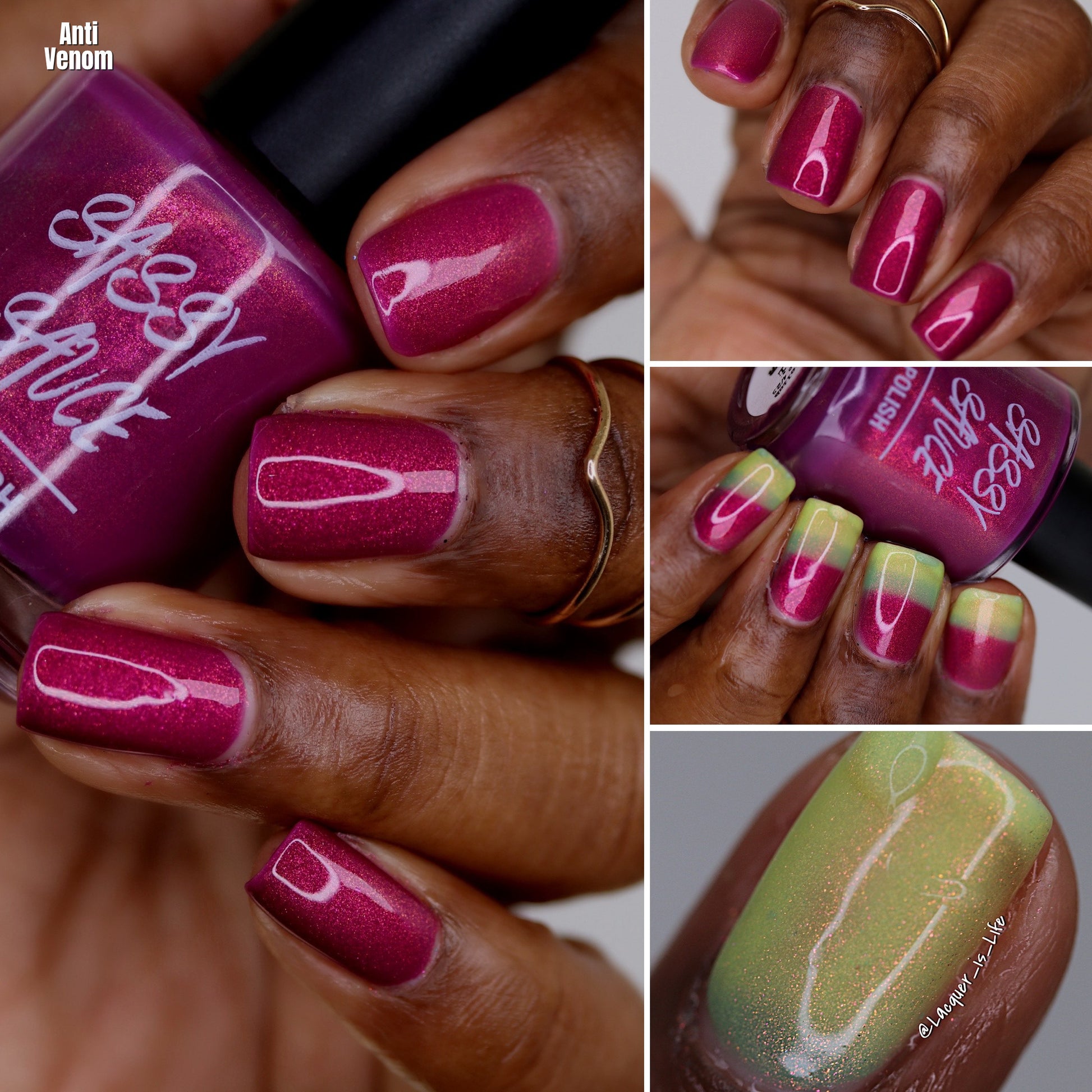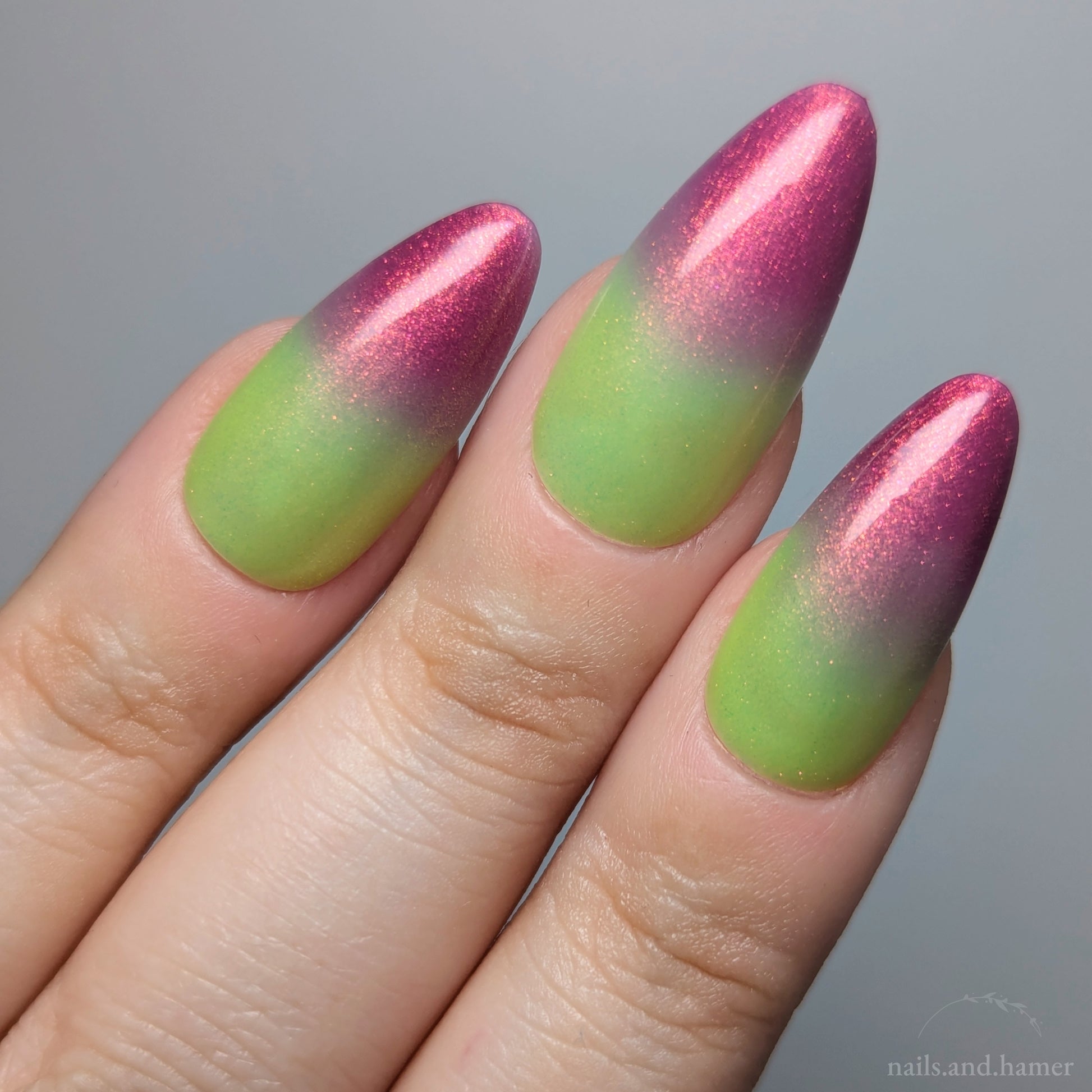 A purple (cold) to yellow (warm 88 degrees) thermal with red/copper/green shimmer. You may see some green transition in the thermal as well. This group custom is for the purple polish people fb group, please join if you are not already in there. Named by Mary Sandberg.