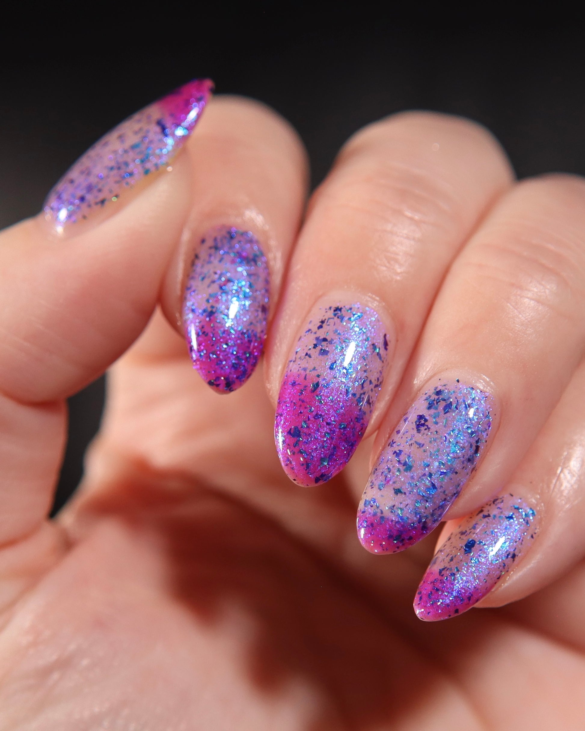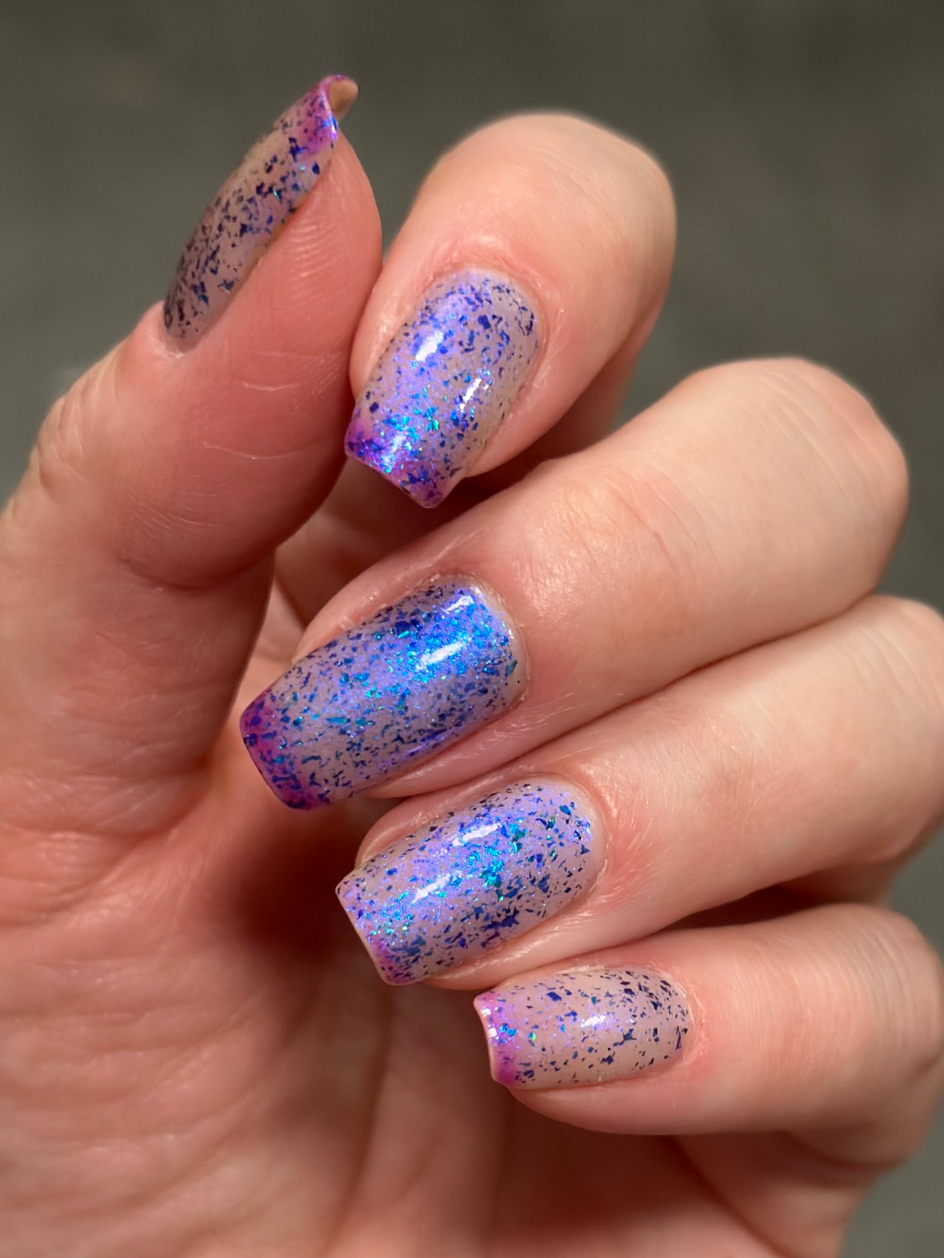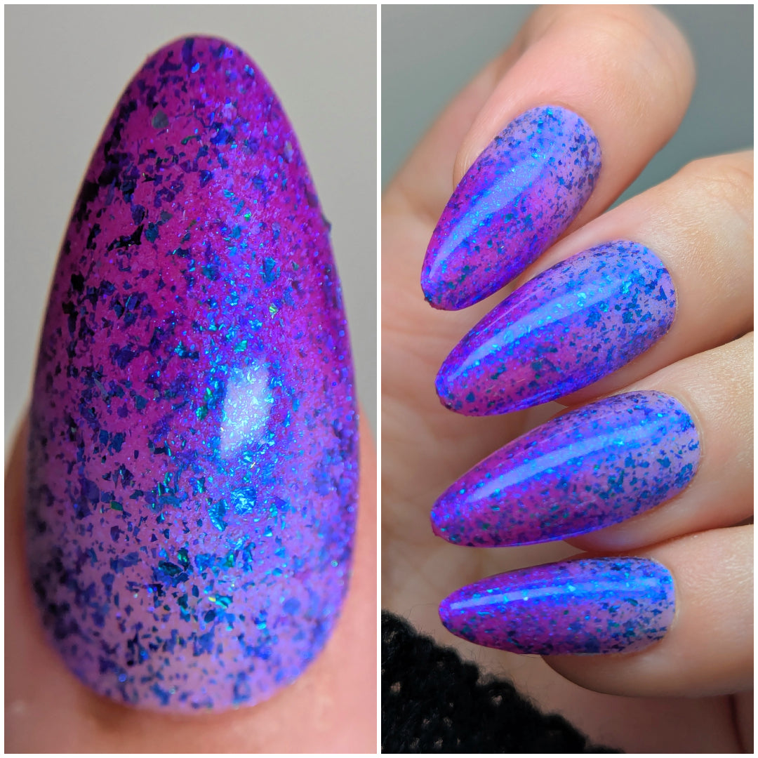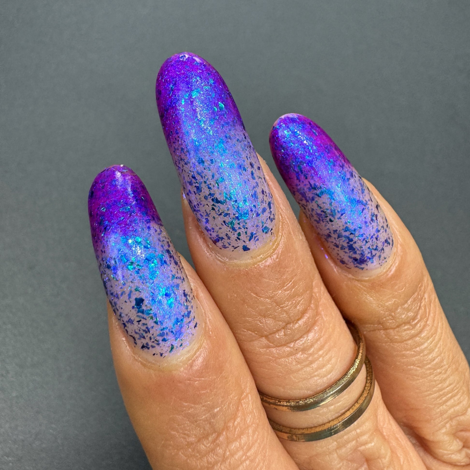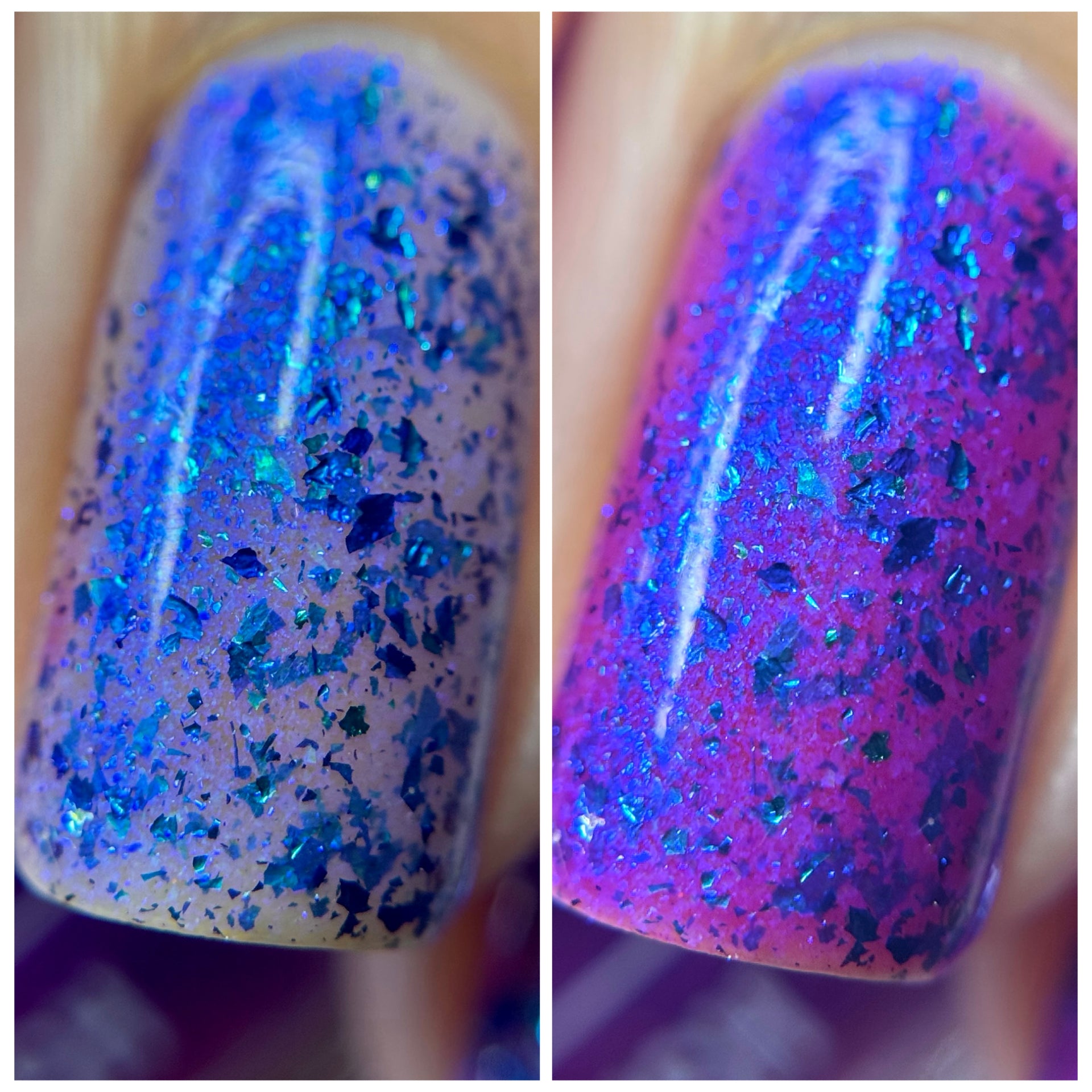 Purple (cold) to colorless (warm) thermal leaving behind a strong, ghostly blue shimmer and blue/green UCC flakies. Named by Mary Sandberg. (continue)