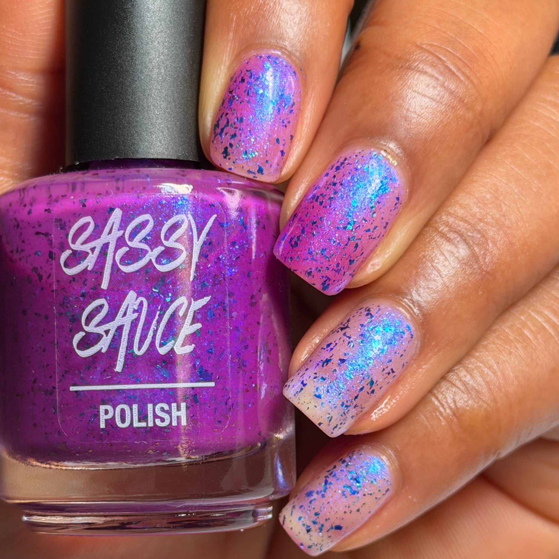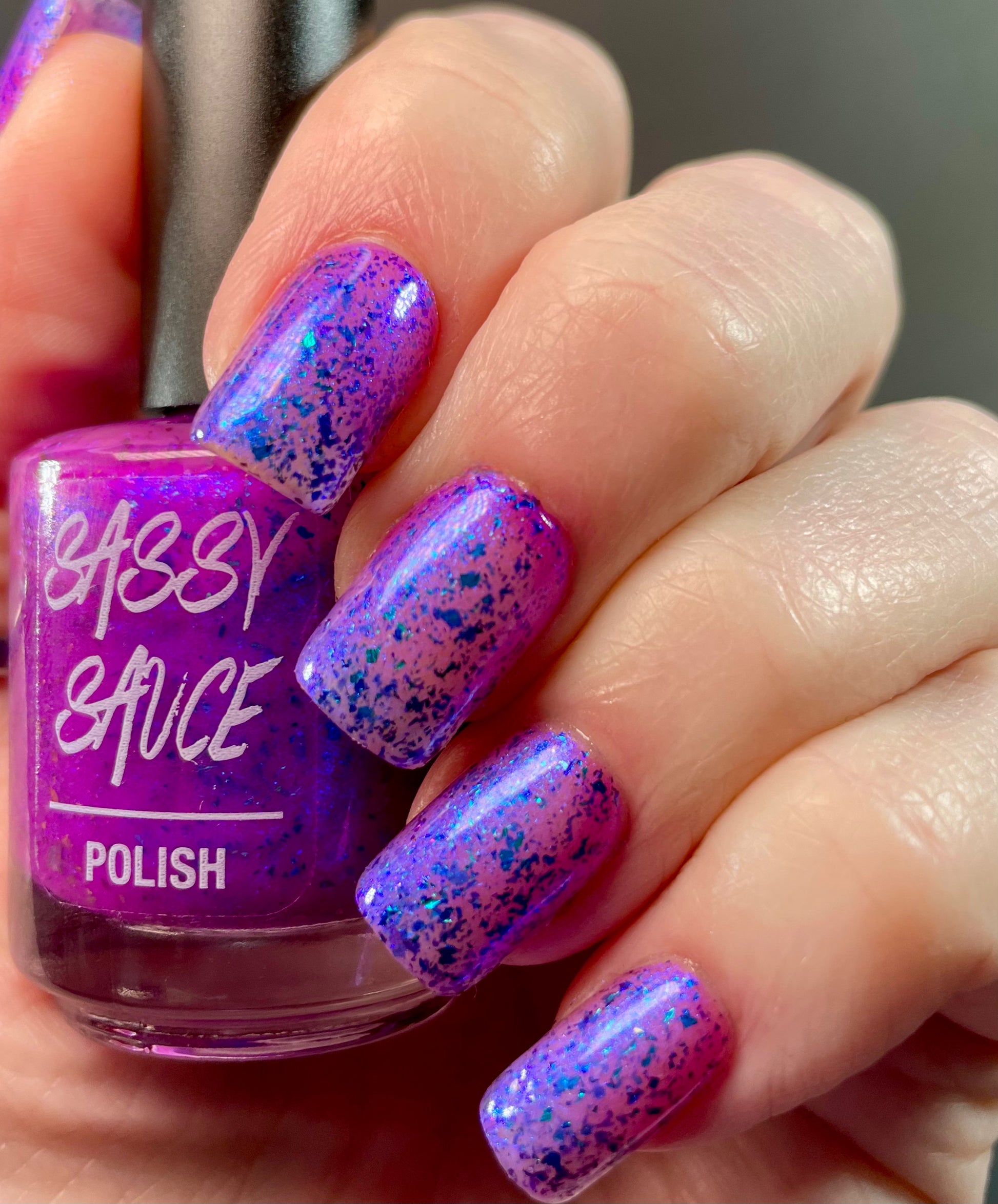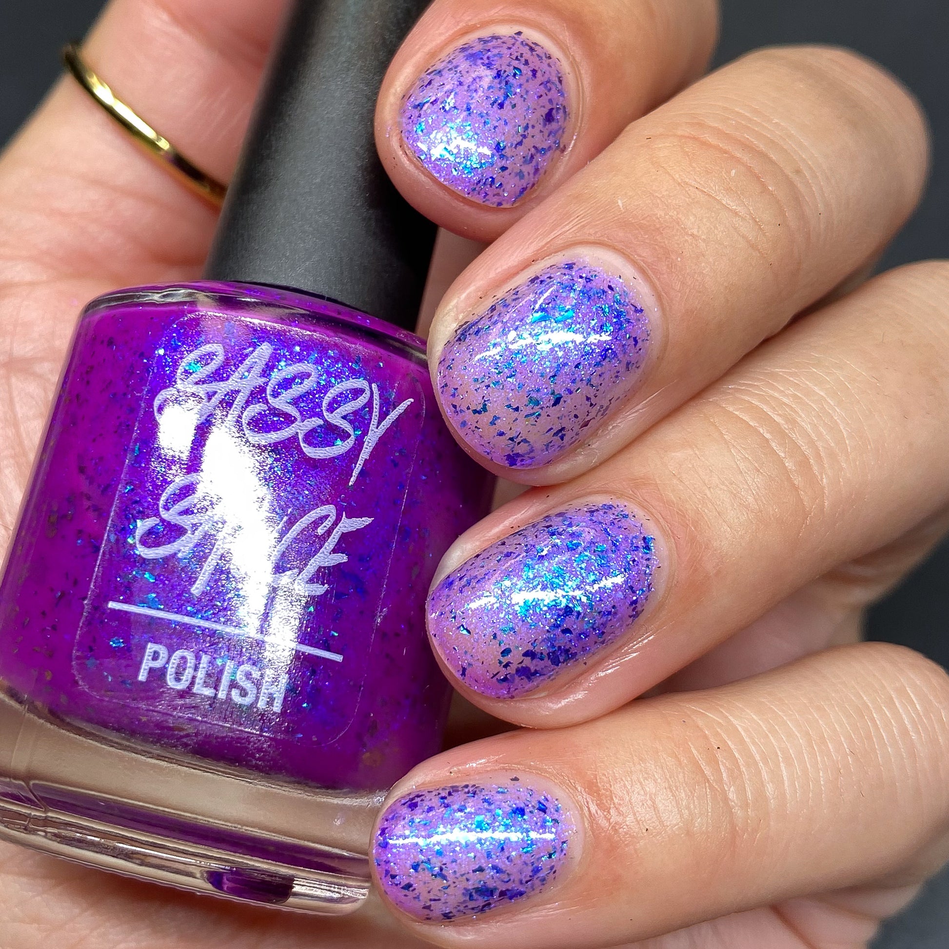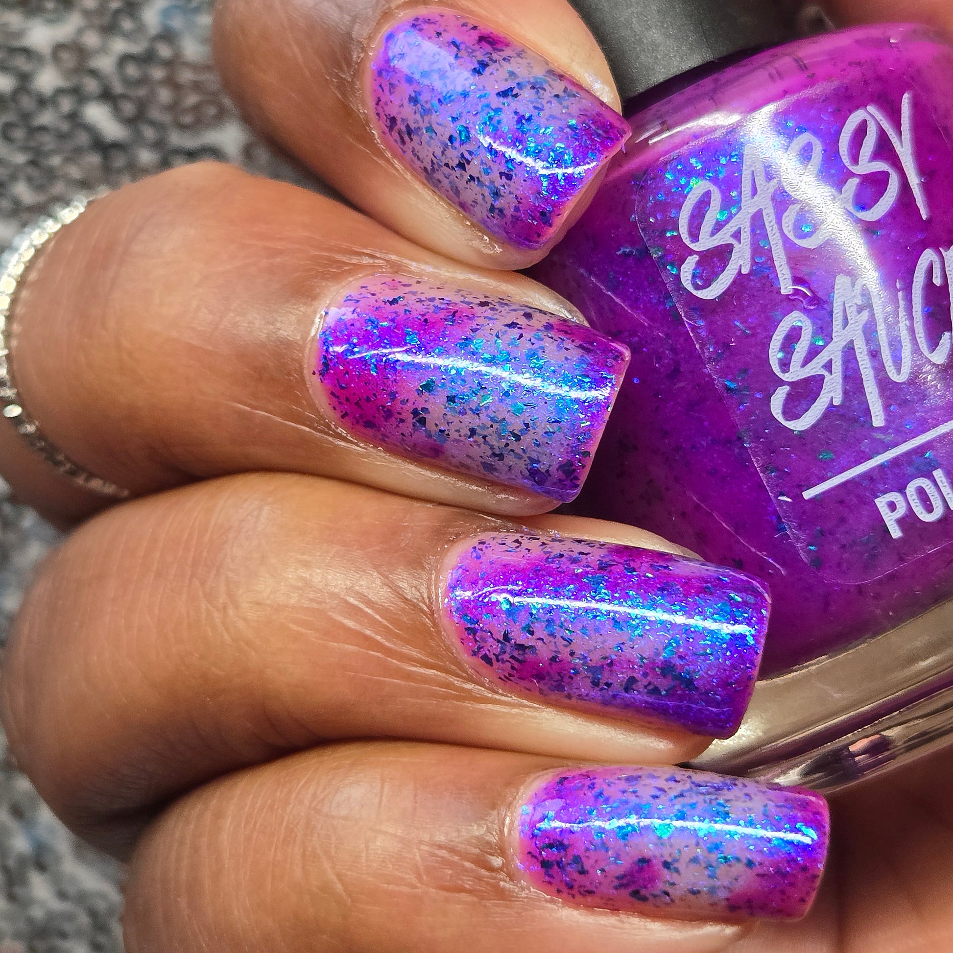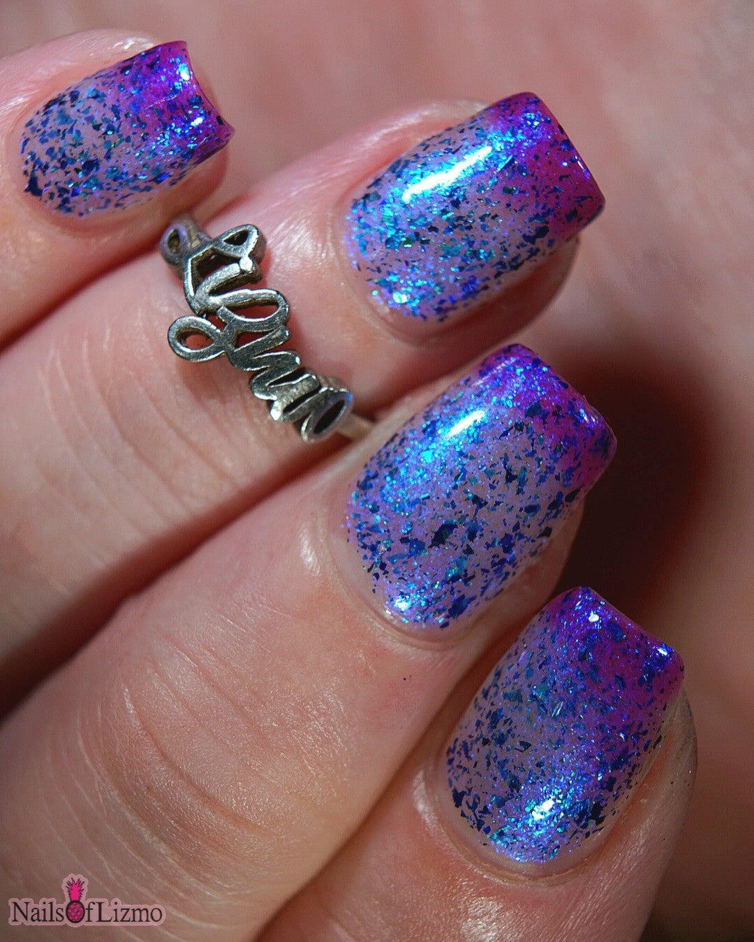Purple (cold) to colorless (warm) thermal leaving behind a strong, ghostly blue shimmer and blue/green UCC flakies. Named by Mary Sandberg. (continue)