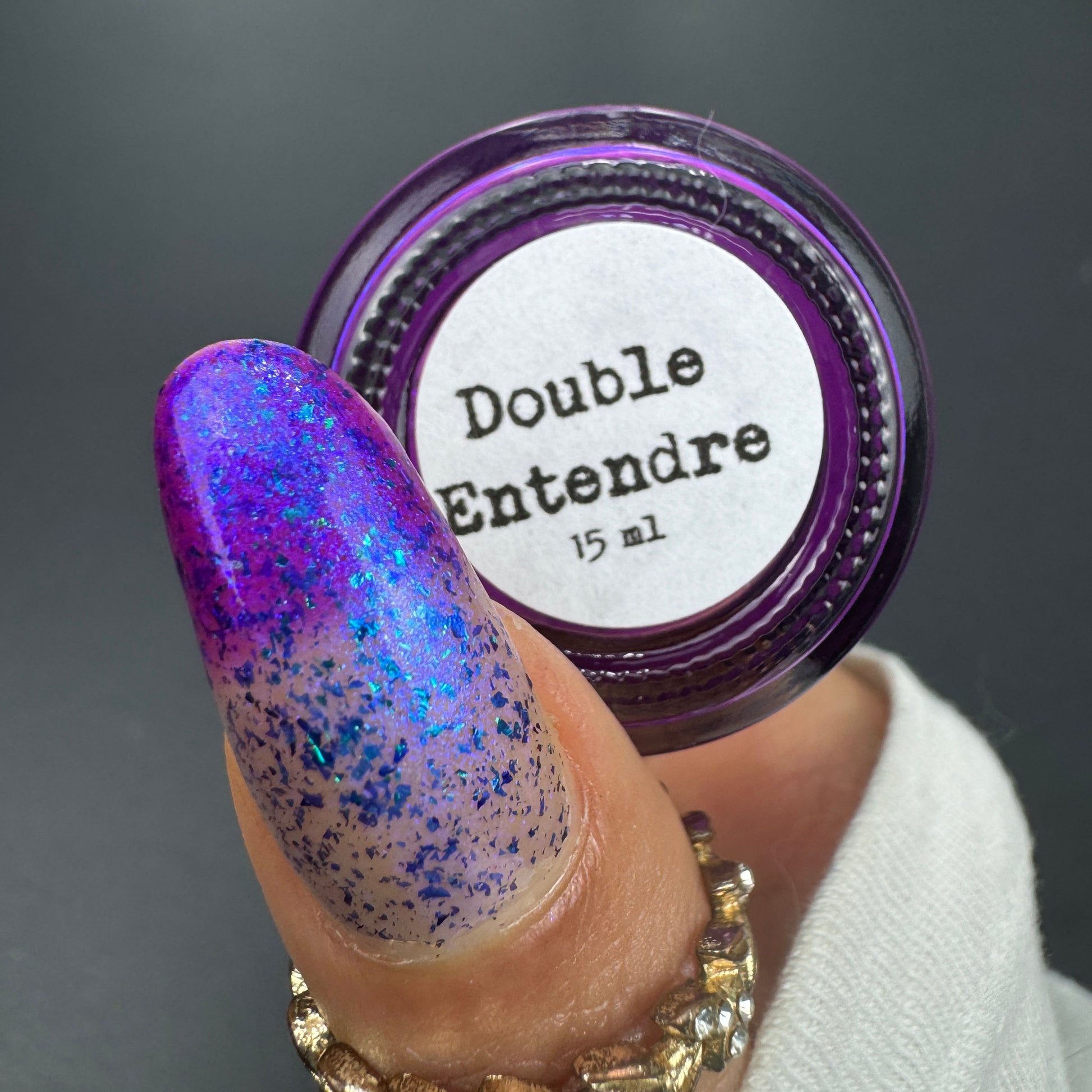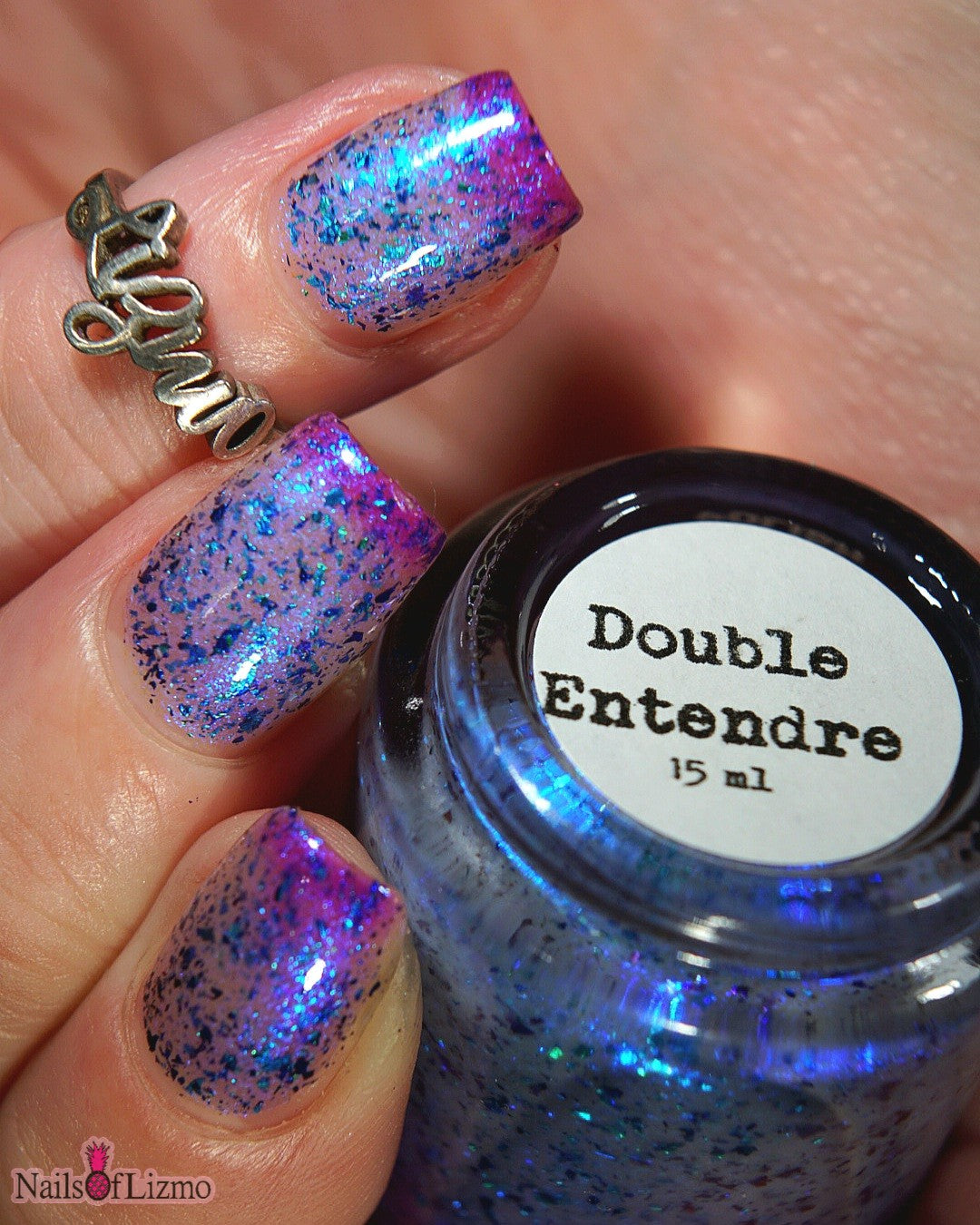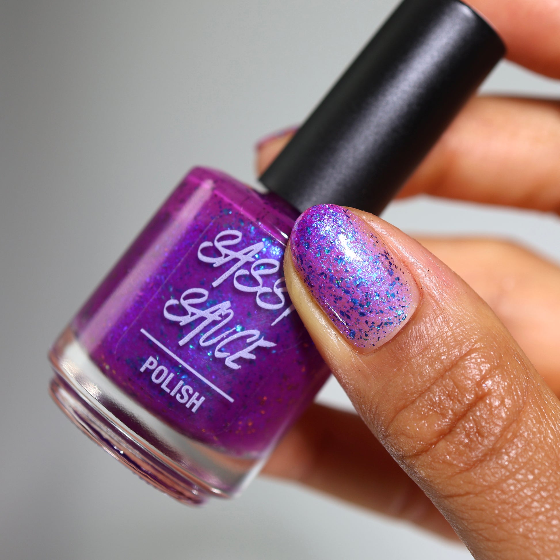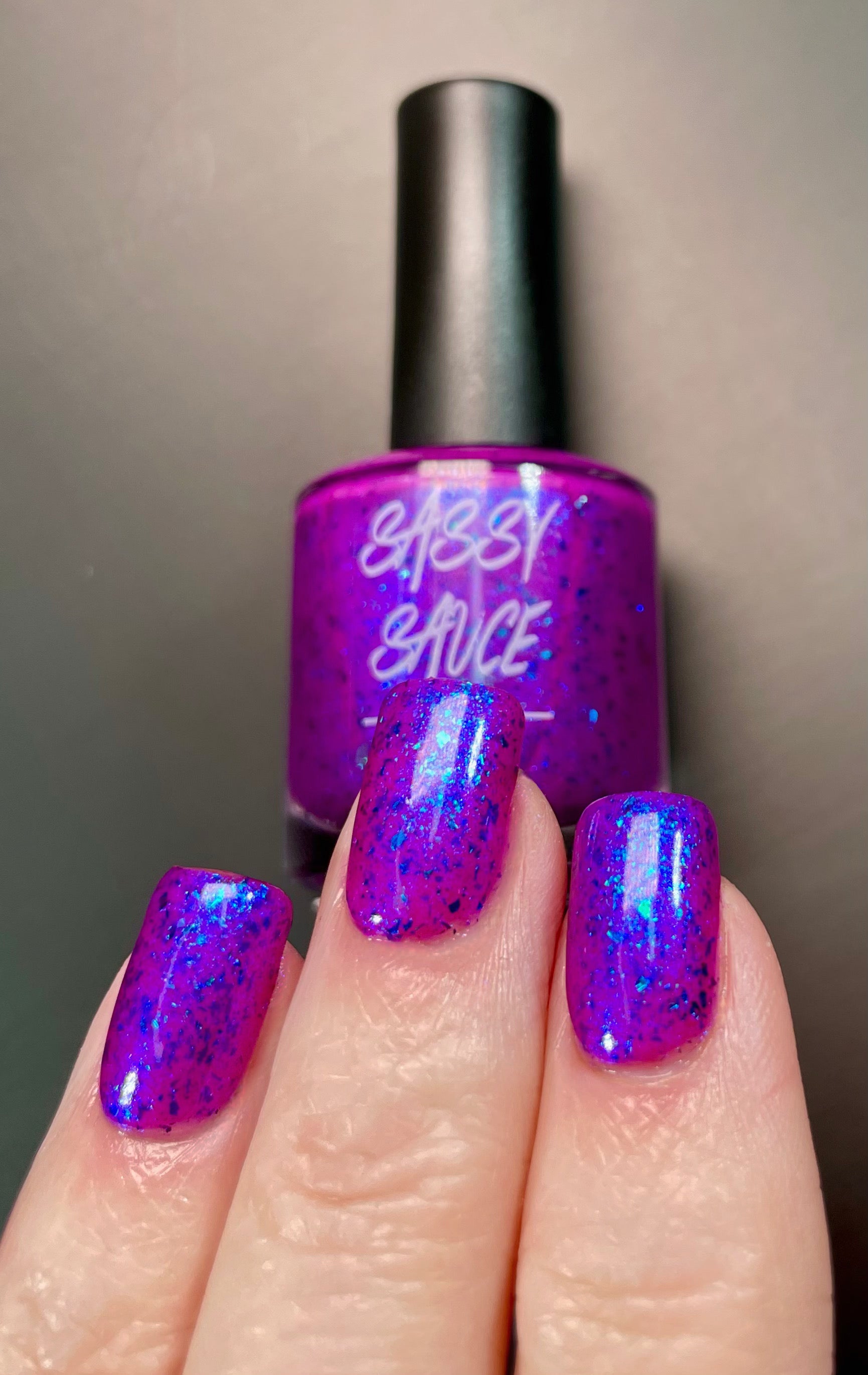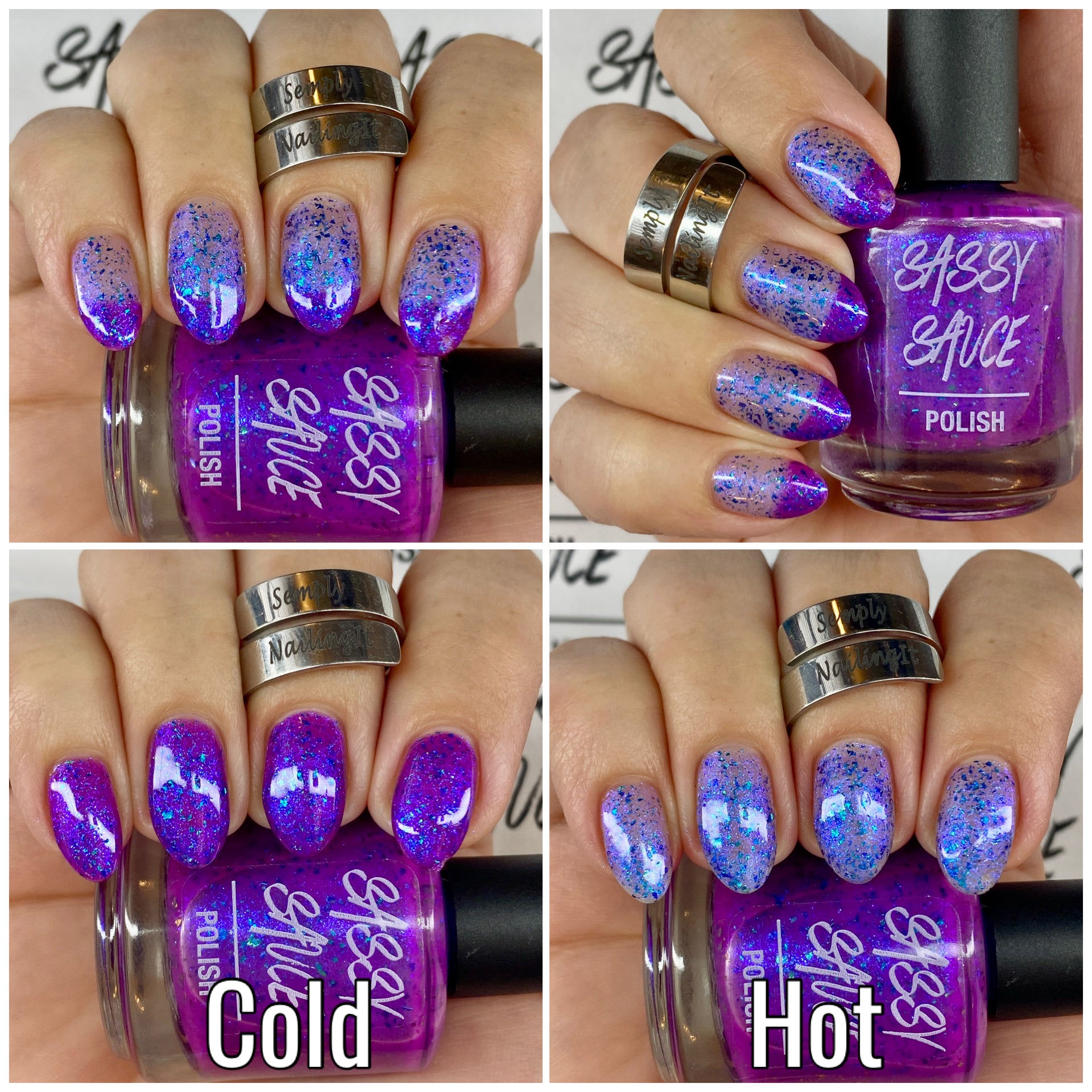 Purple (cold) to colorless (warm) thermal leaving behind a strong, ghostly blue shimmer and blue/green UCC flakies. Named by Mary Sandberg. (continue)