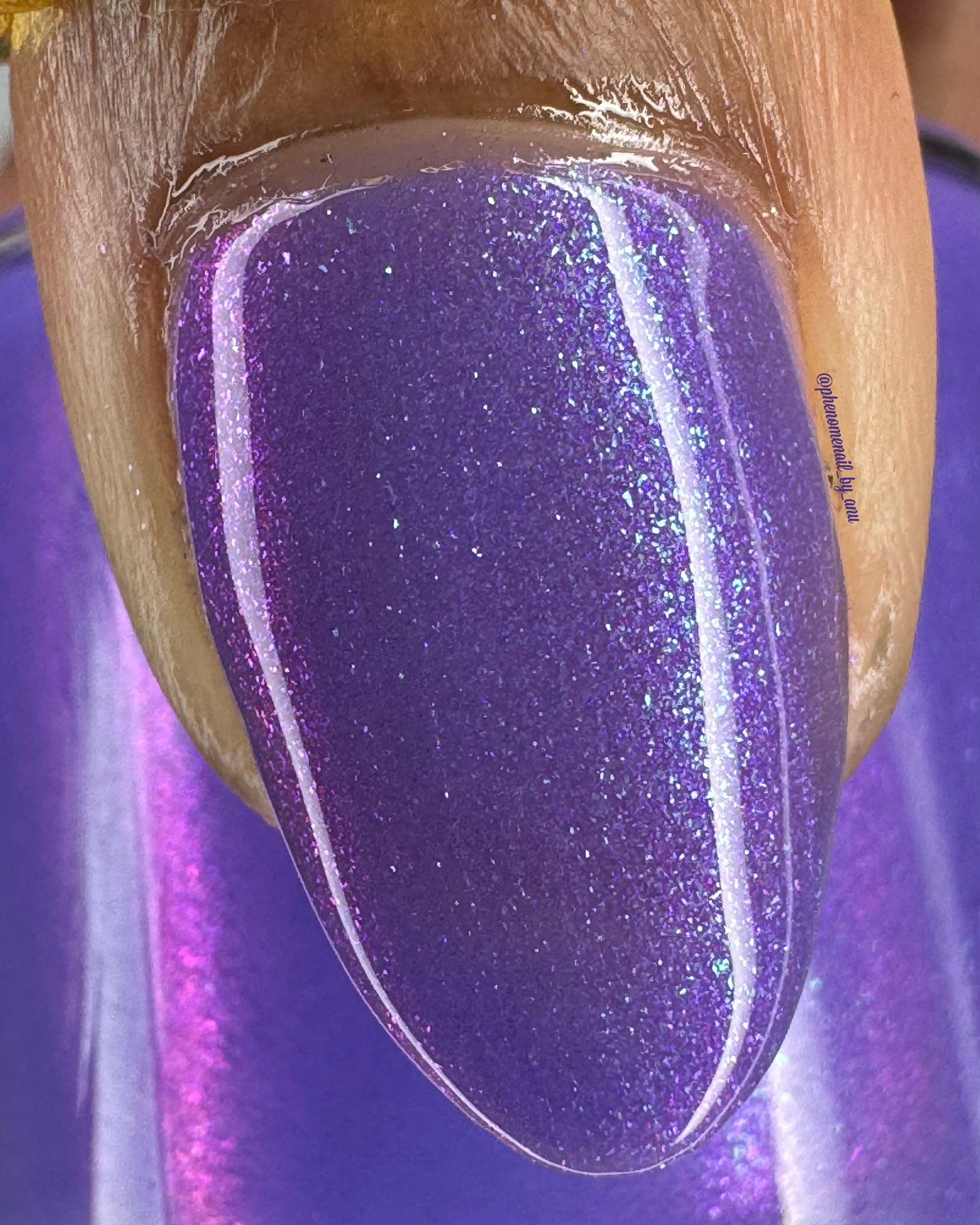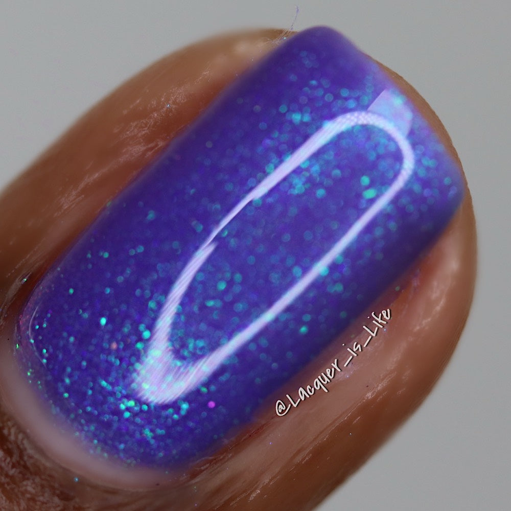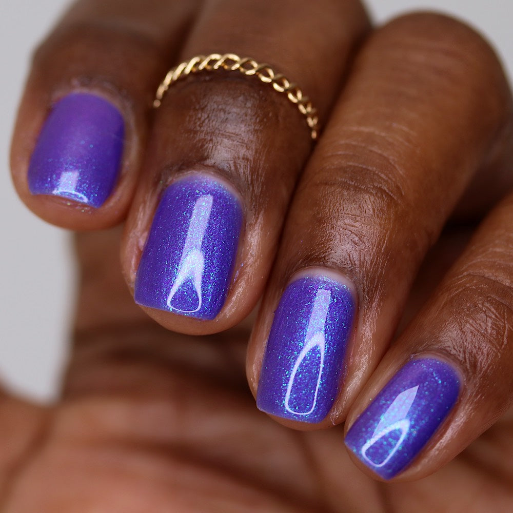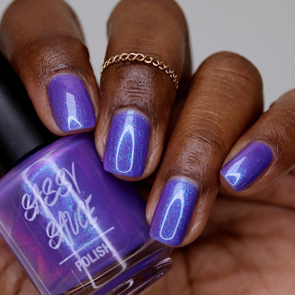 A purple base with purple/red/blue/green/shifty shimmer. There is a lot going on in this bottle. The name from Pam K in a convo a long time ago. I told her I was going to use this one day!!!!