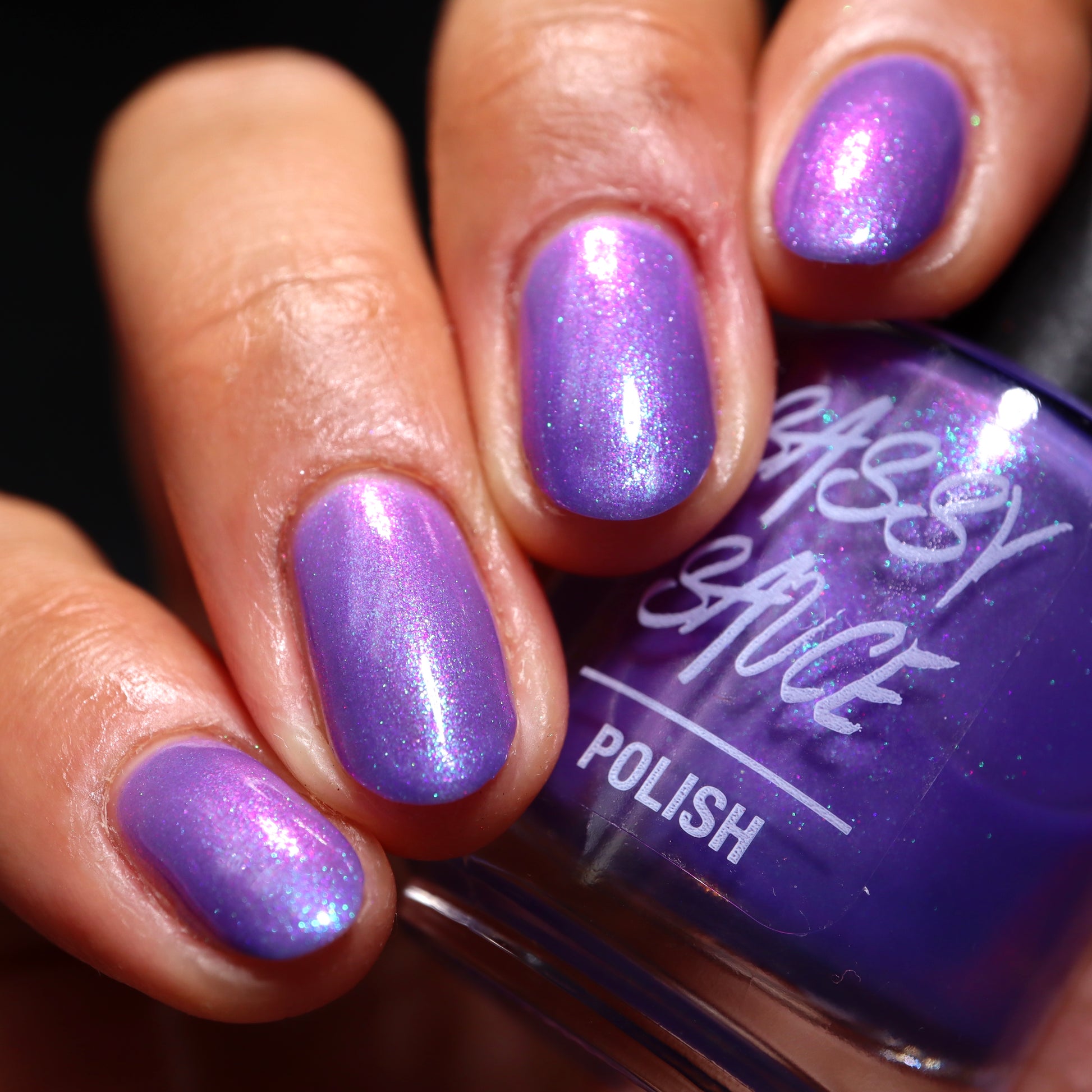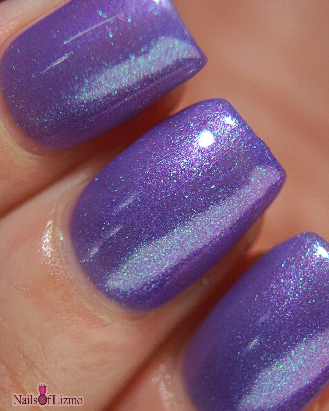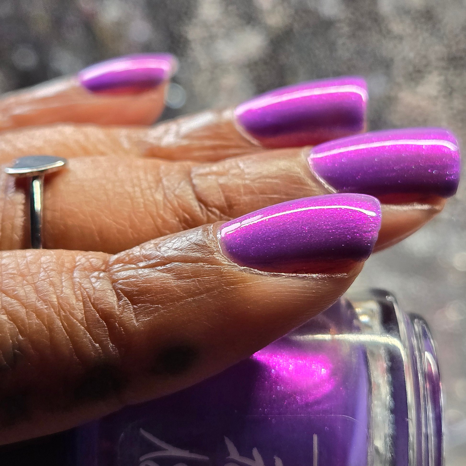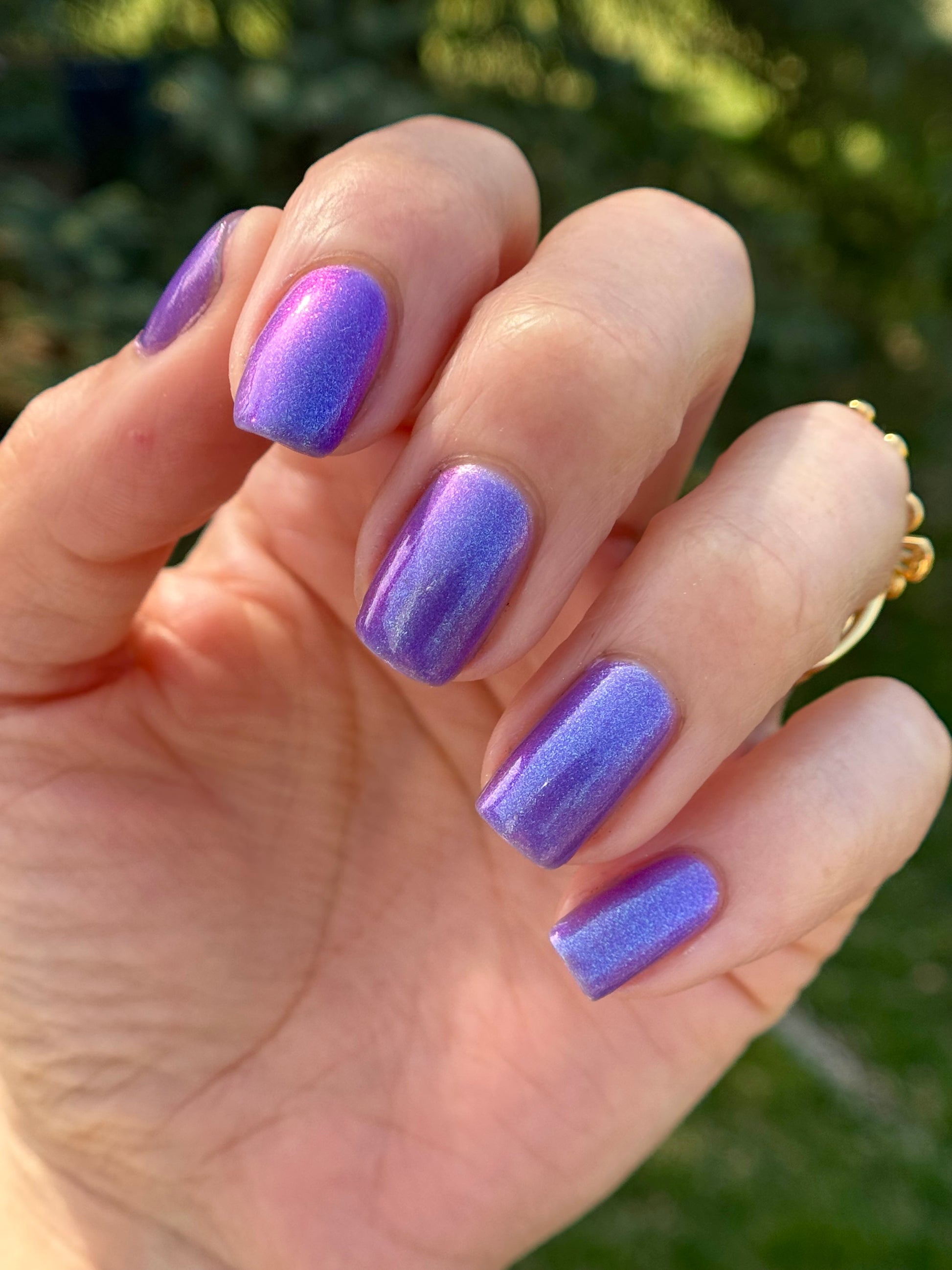 A purple base with purple/red/blue/green/shifty shimmer. There is a lot going on in this bottle. The name from Pam K in a convo a long time ago. I told her I was going to use this one day!!!!