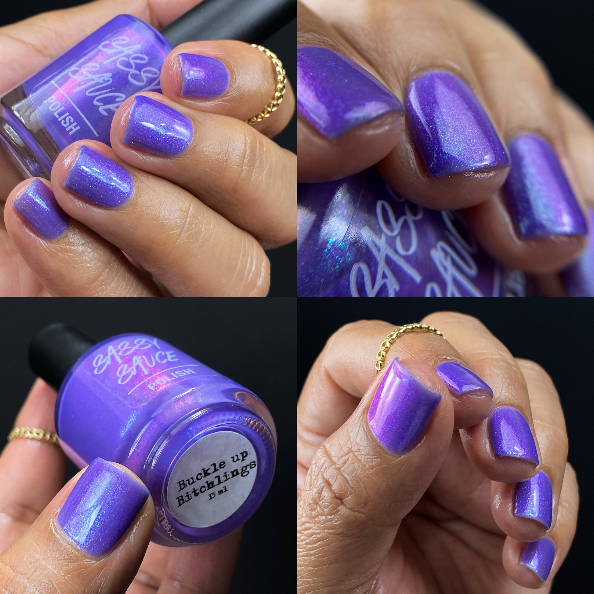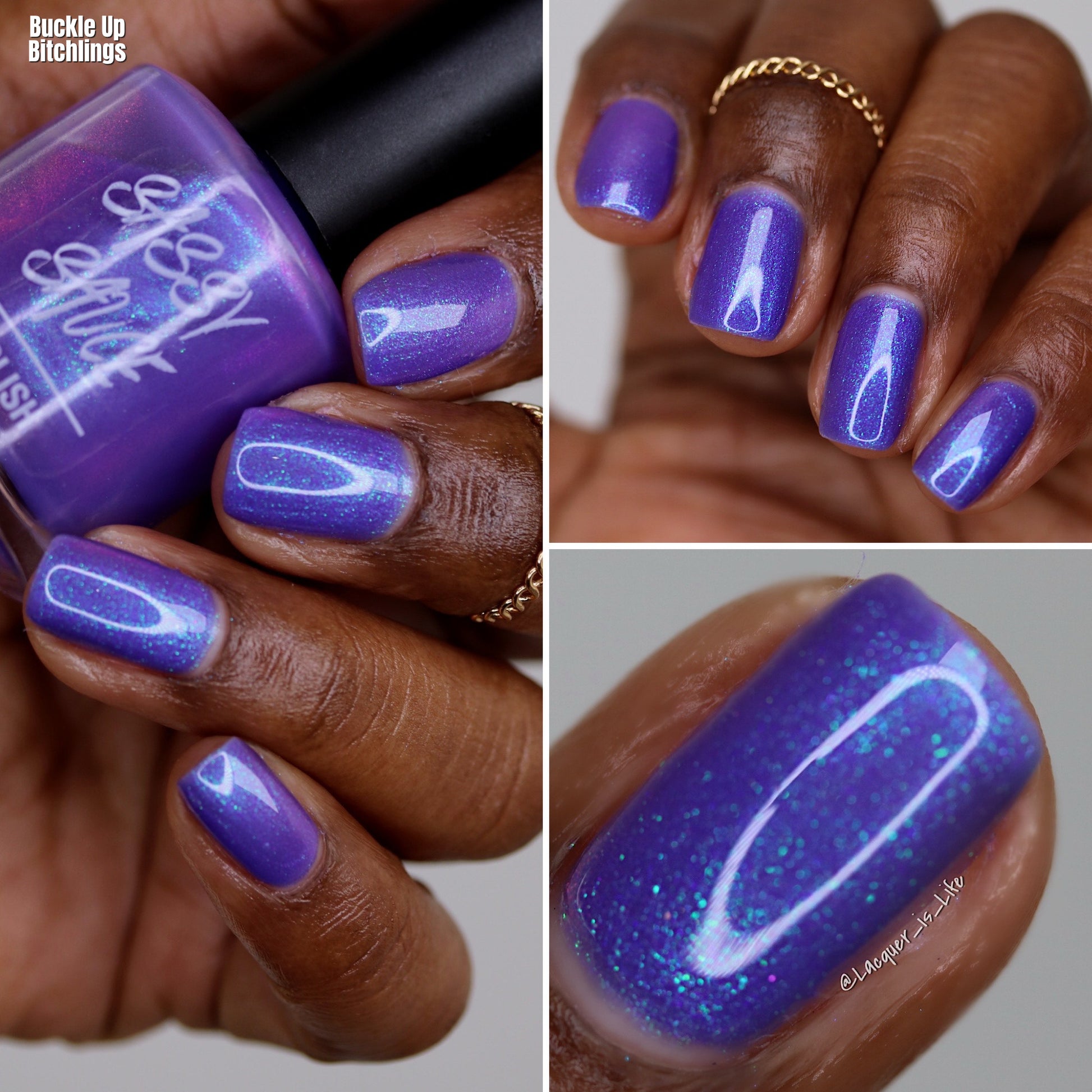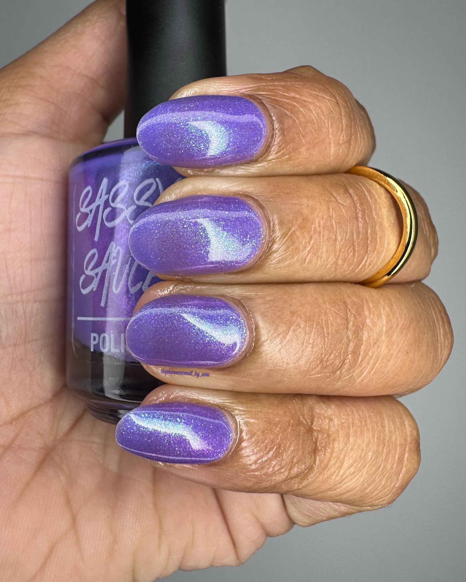 A purple base with purple/red/blue/green/shifty shimmer. There is a lot going on in this bottle. The name from Pam K in a convo a long time ago. I told her I was going to use this one day!!!!