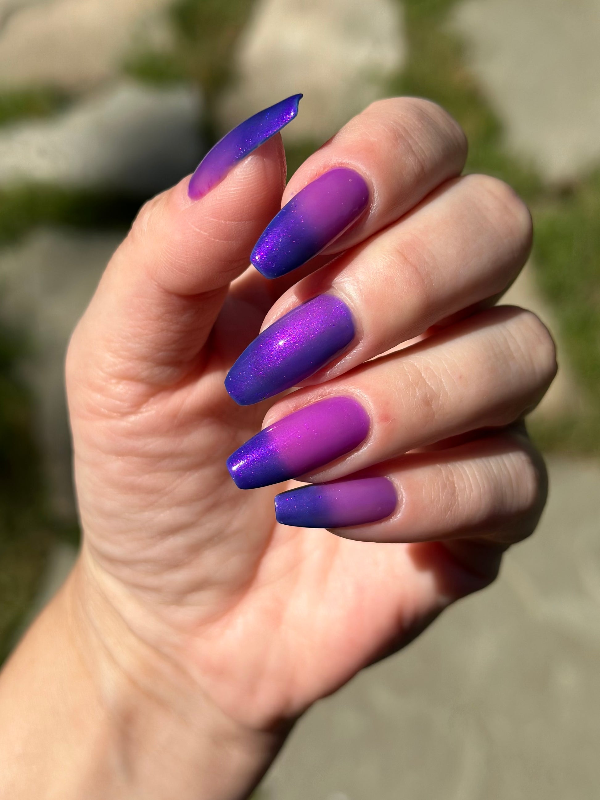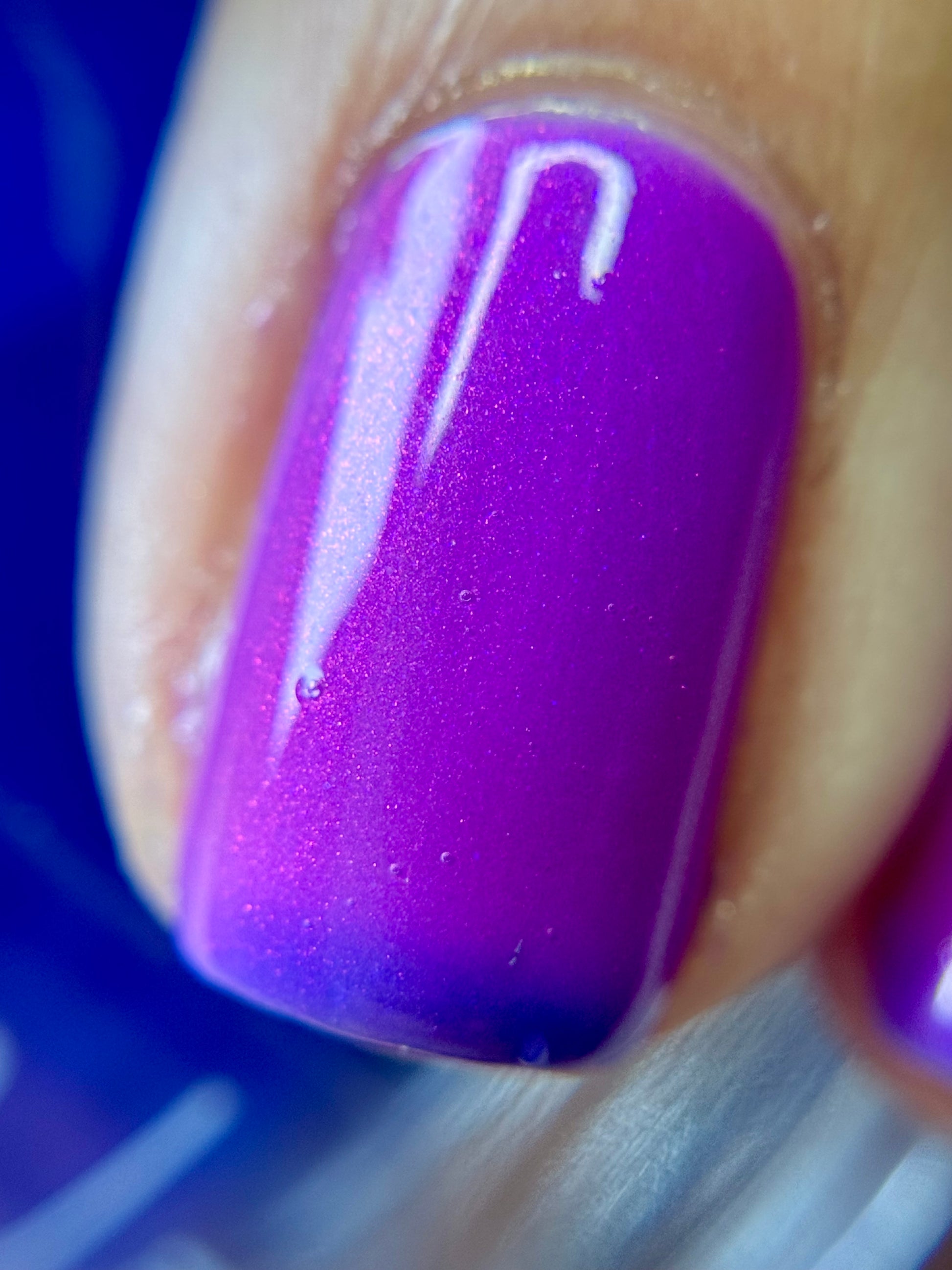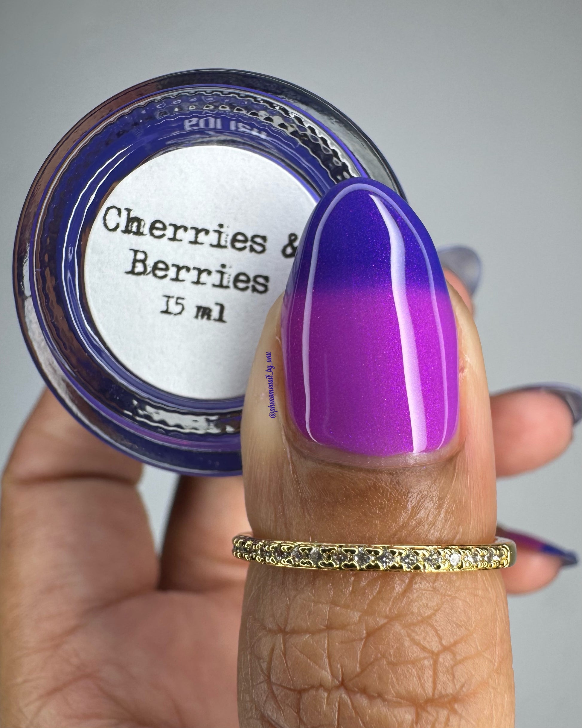 A sapphire (cold) to purple (Warm) thermal with a purple/red shimmer that will pop in the sun. A dearly departed friend used to say cherries and berries every time we passed someone pulled over on the side of the road.