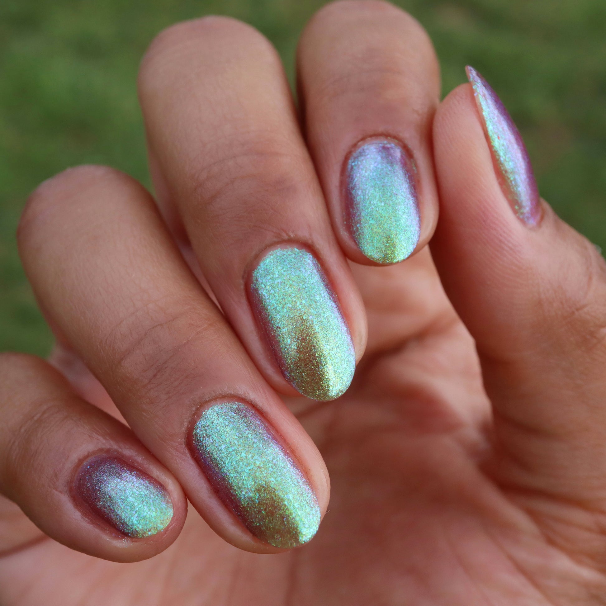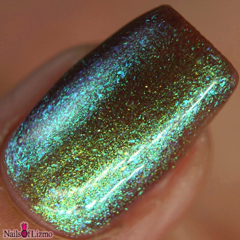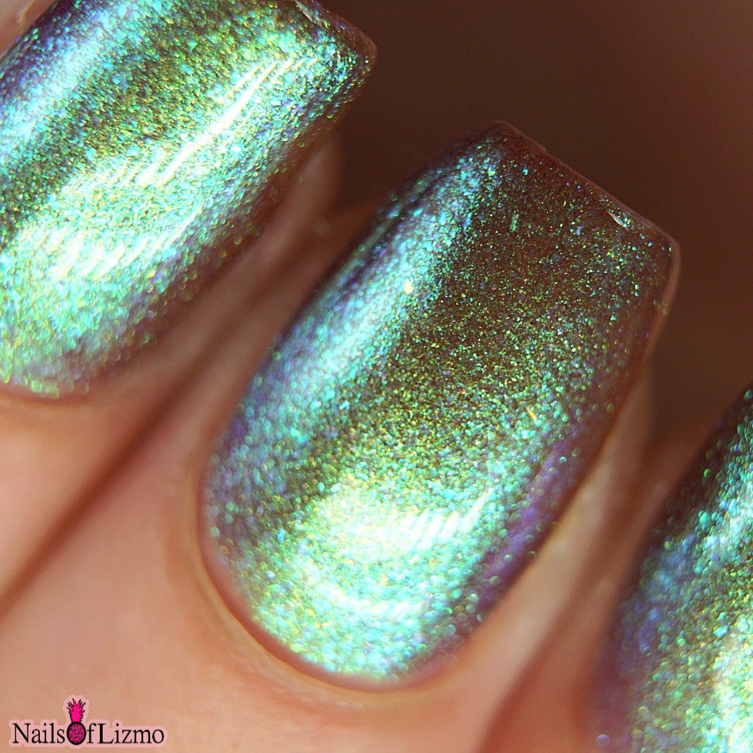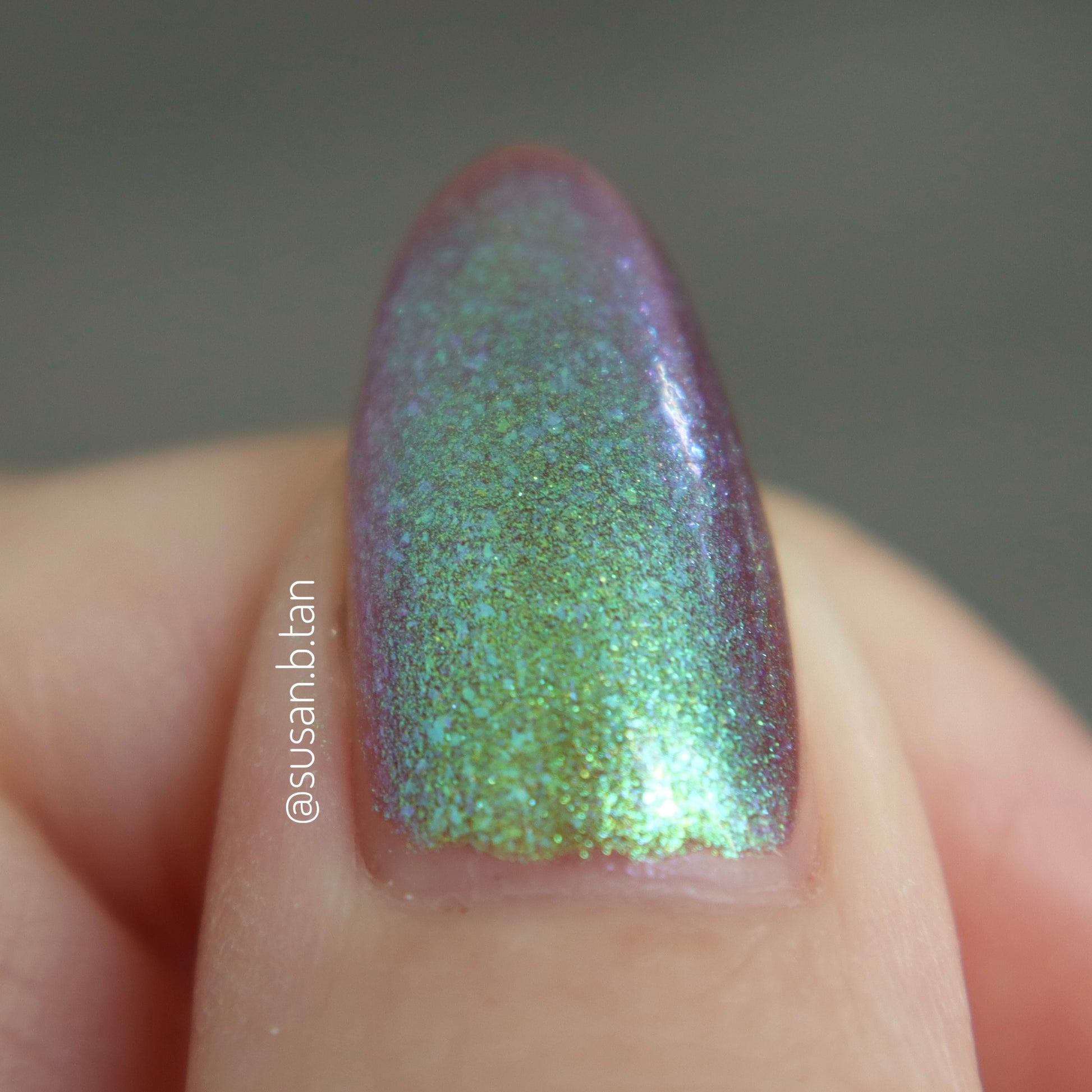 A taupe base with large particle green/blue/purple shifting shimmer. Named by Mary Sandberg.
