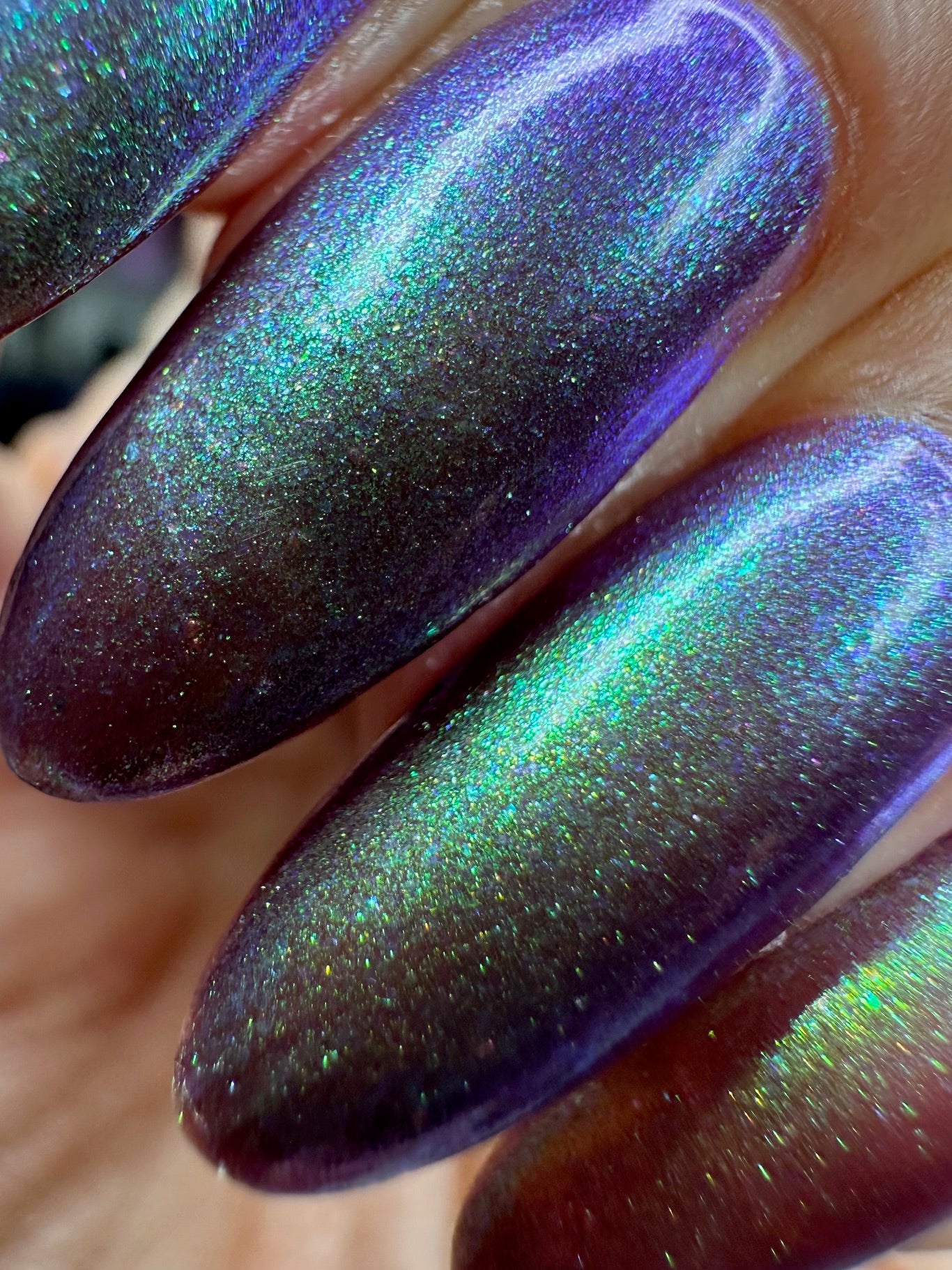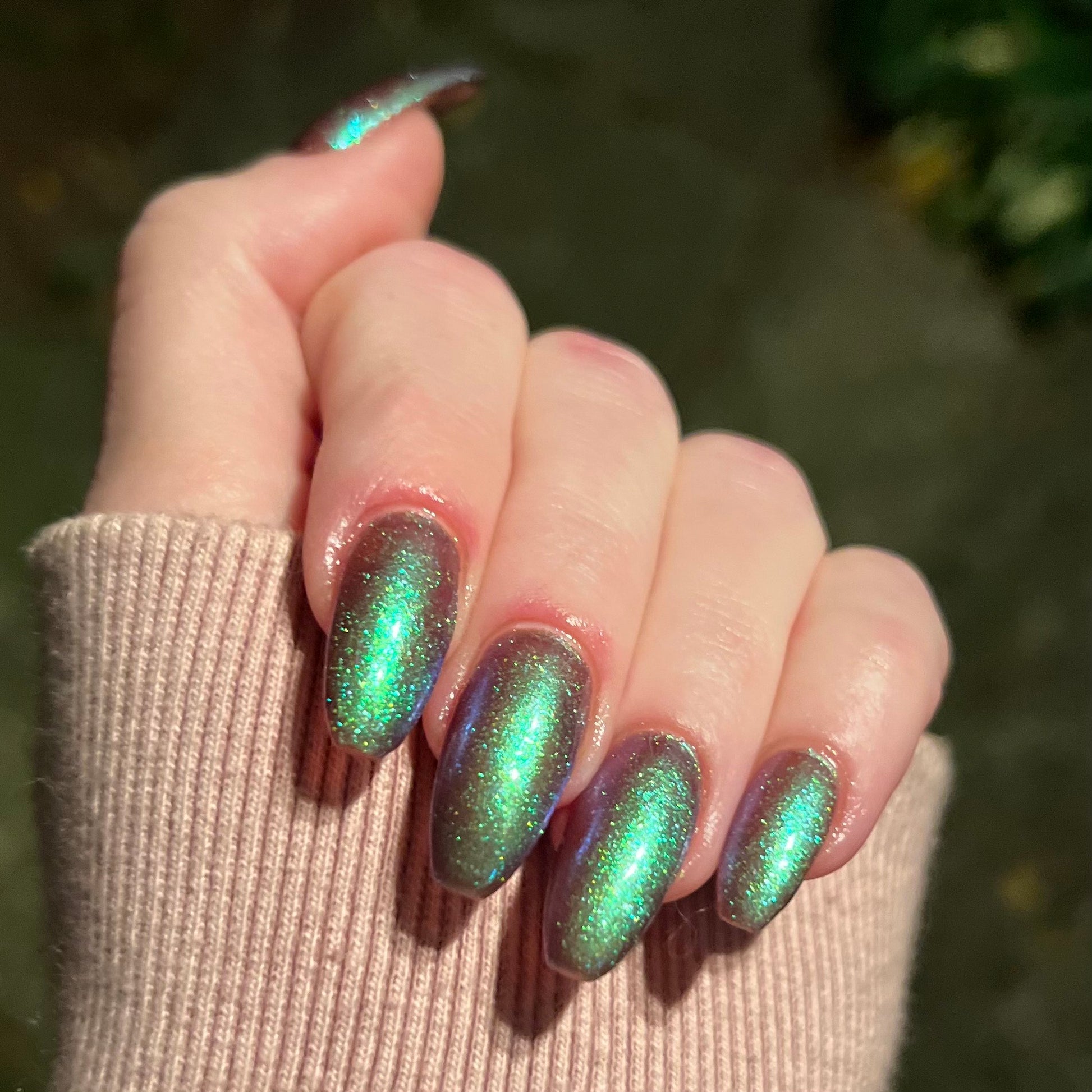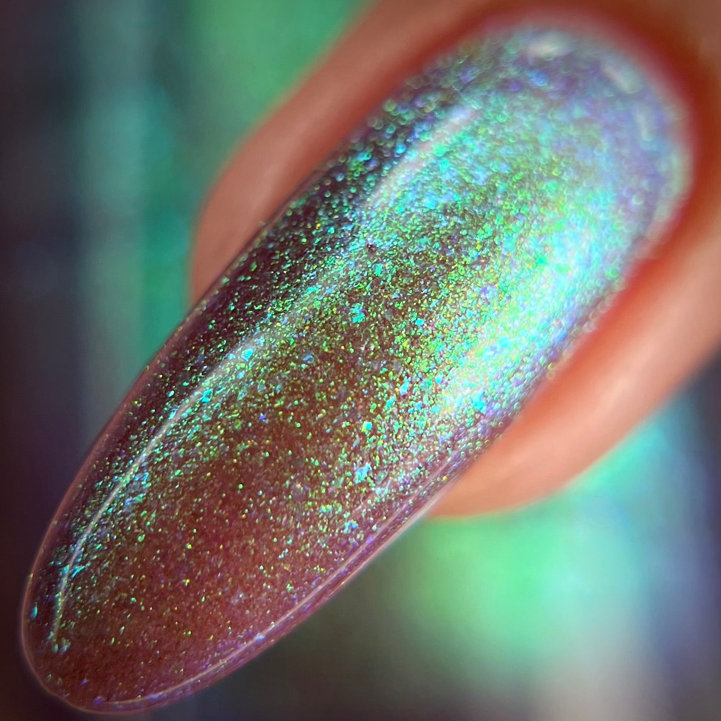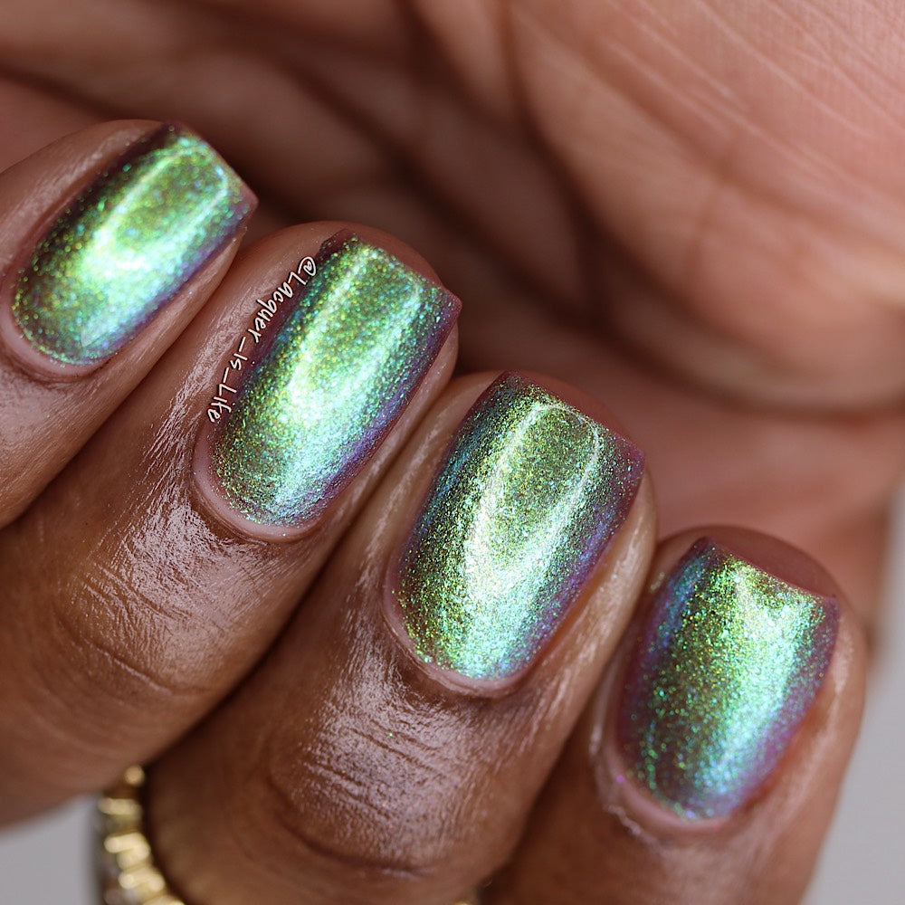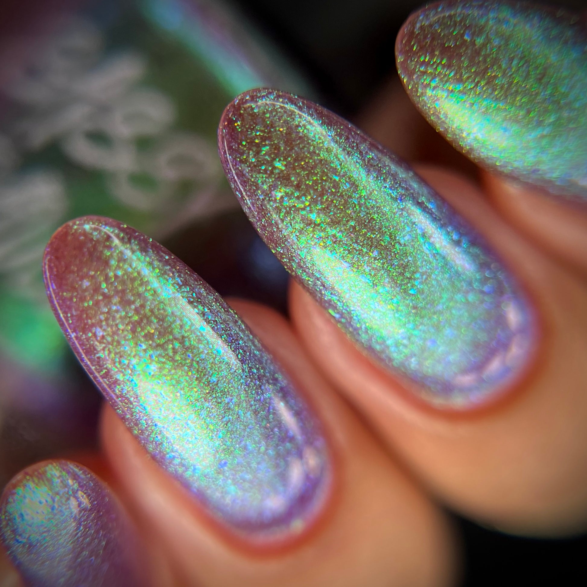 A taupe base with large particle green/blue/purple shifting shimmer. Named by Mary Sandberg.