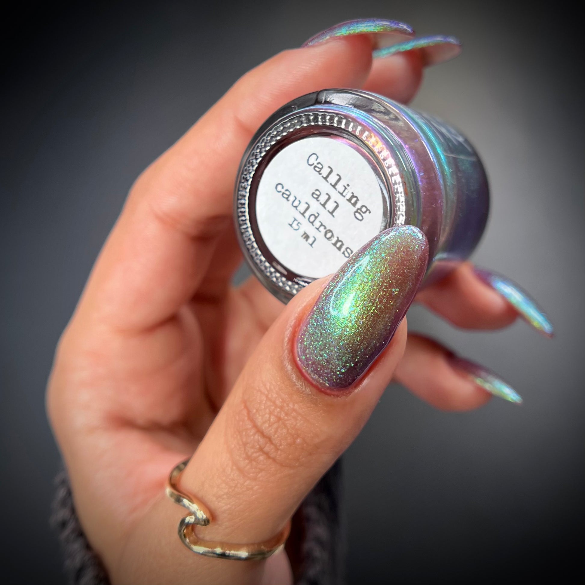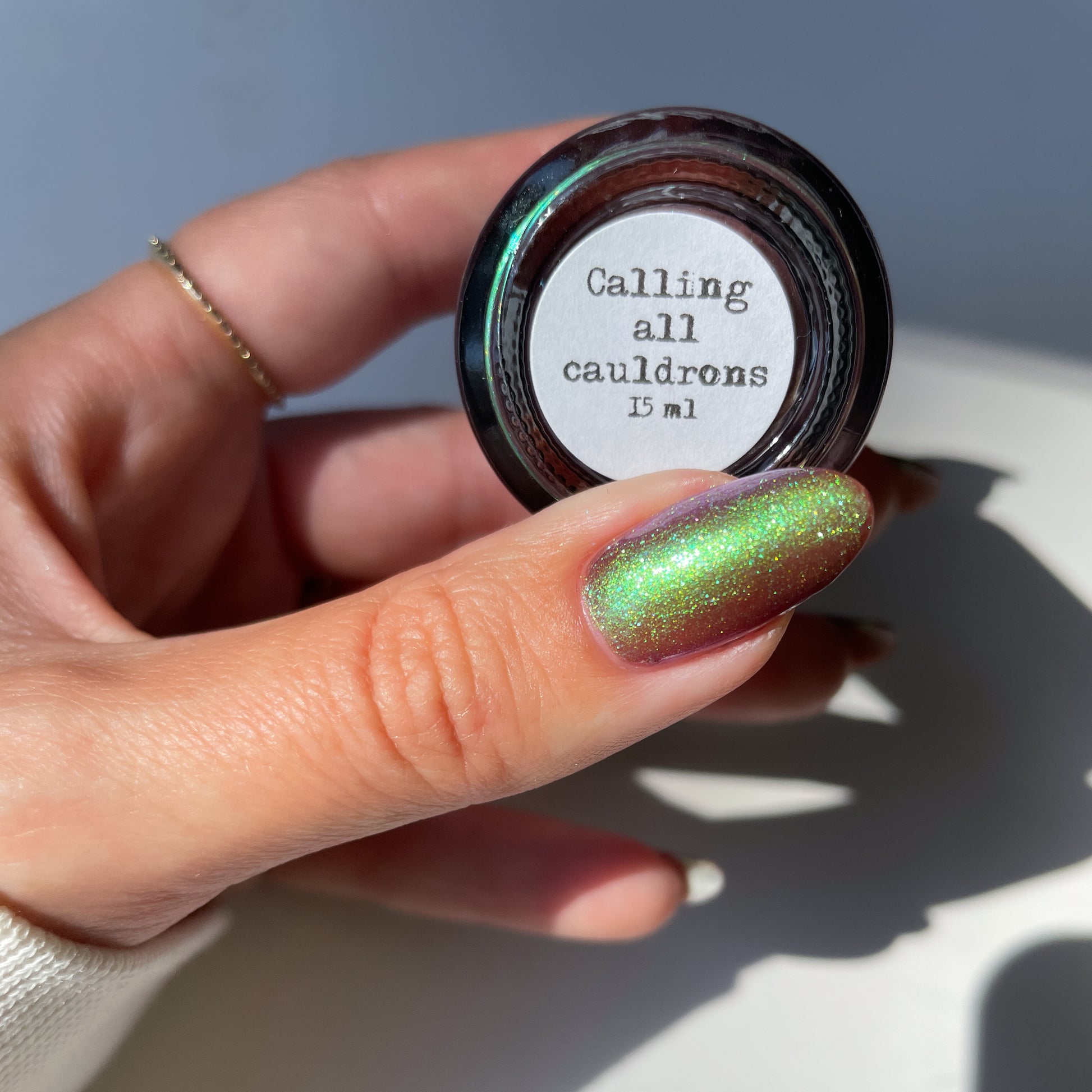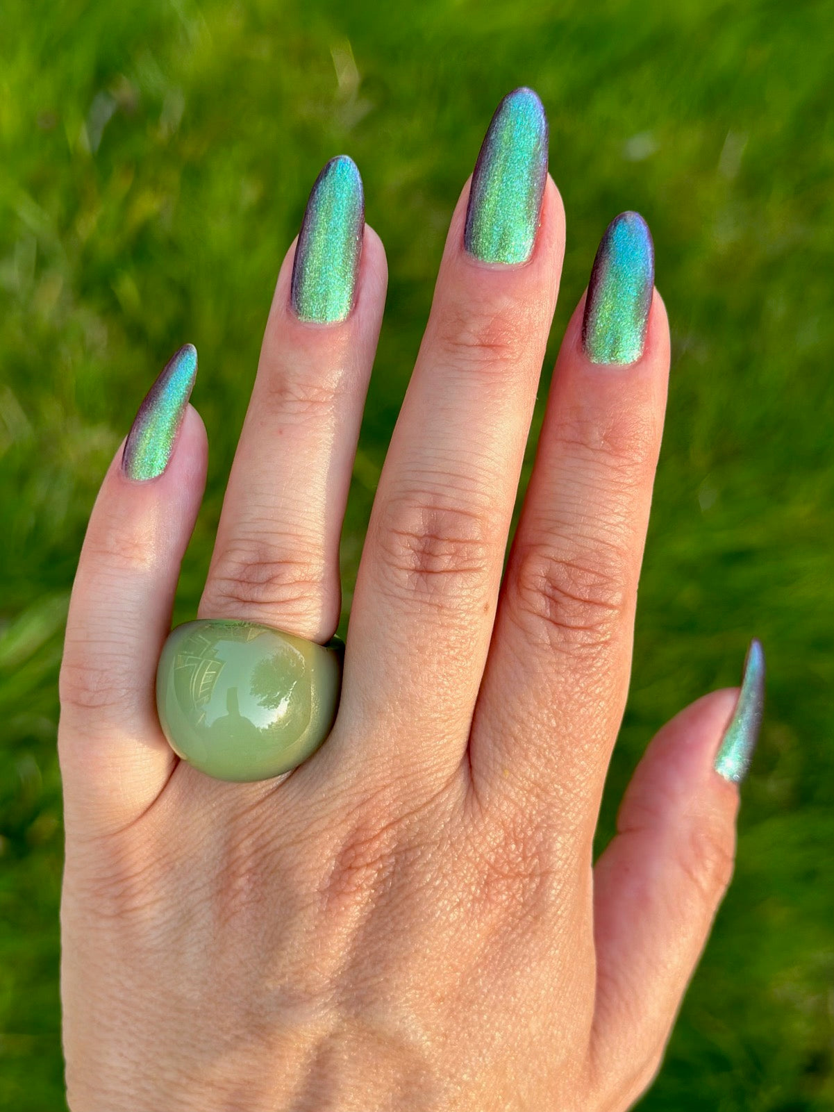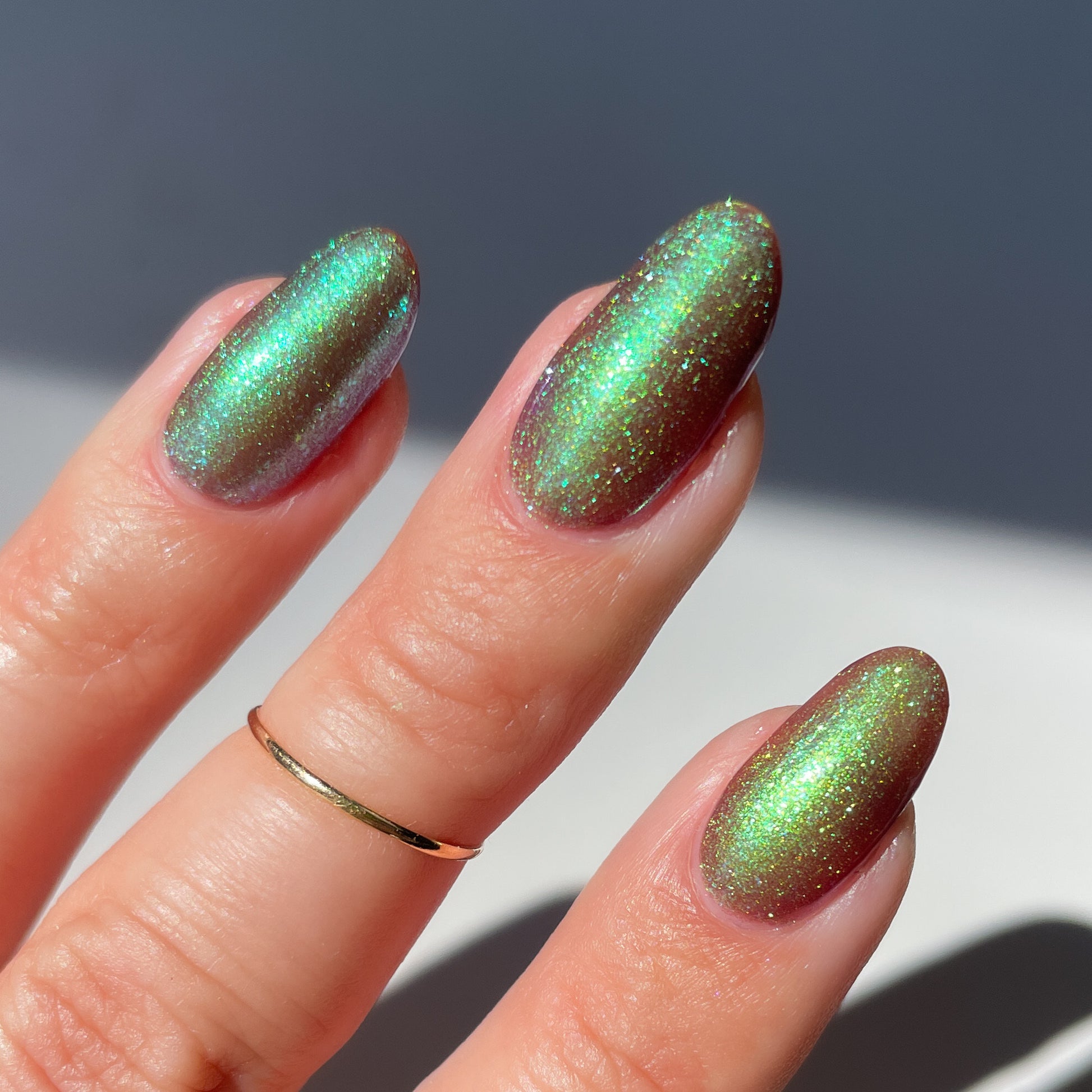 A taupe base with large particle green/blue/purple shifting shimmer. Named by Mary Sandberg.