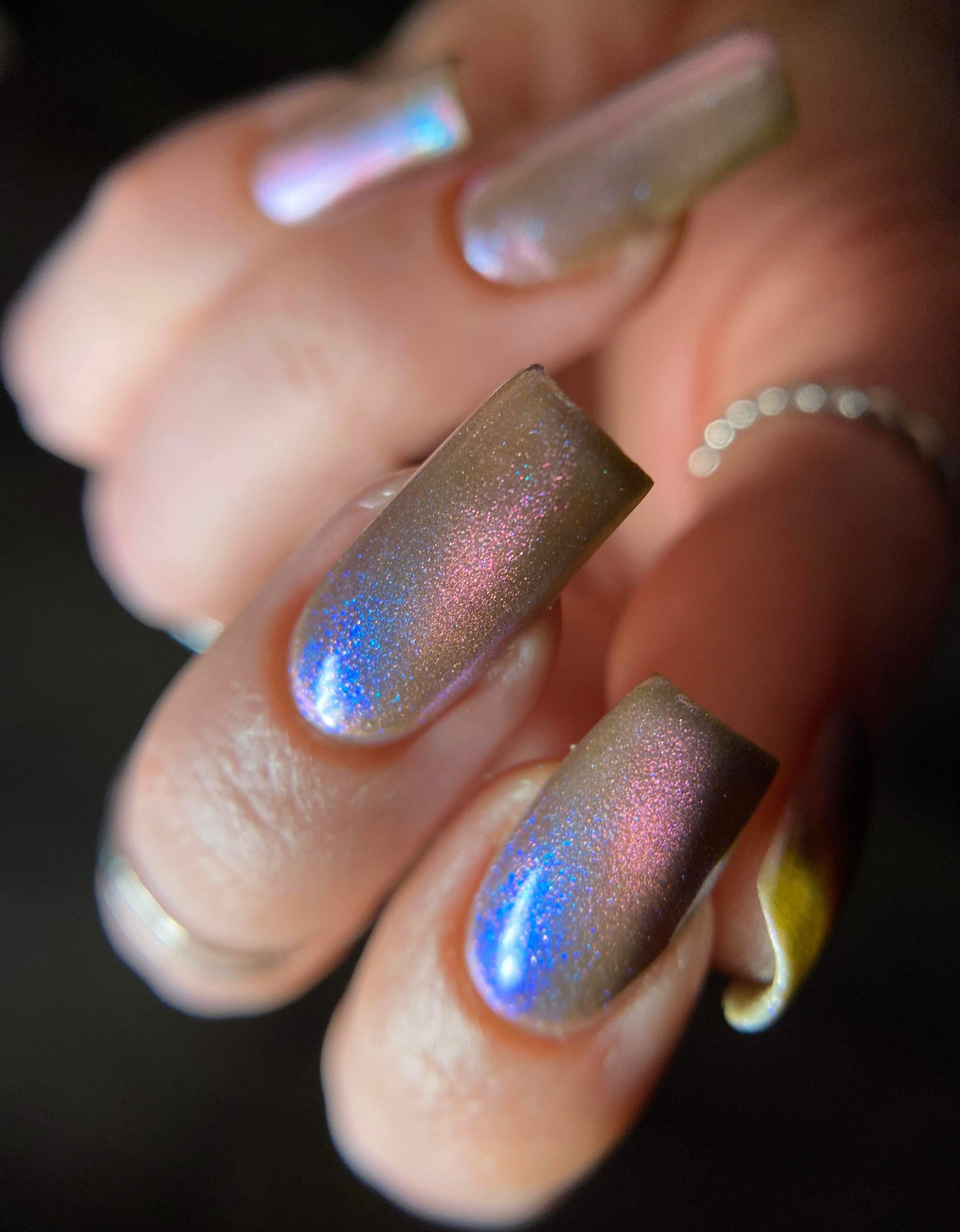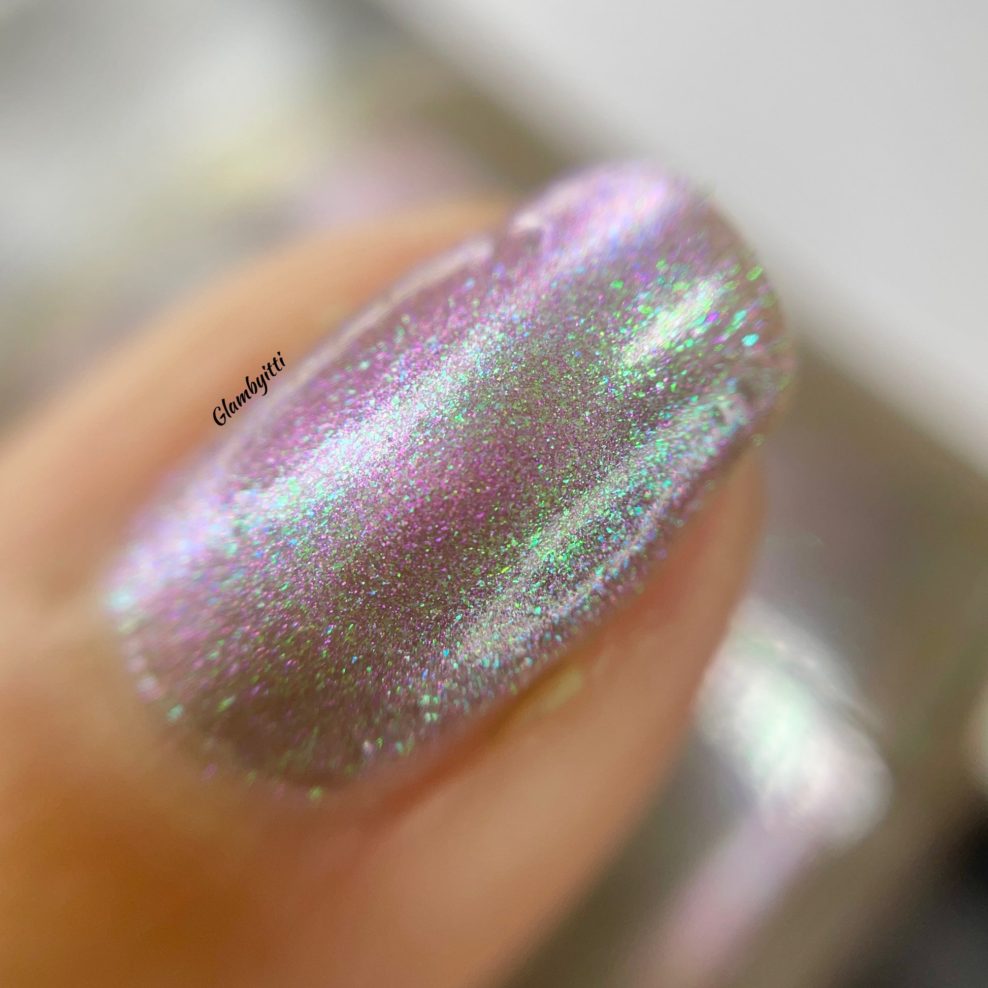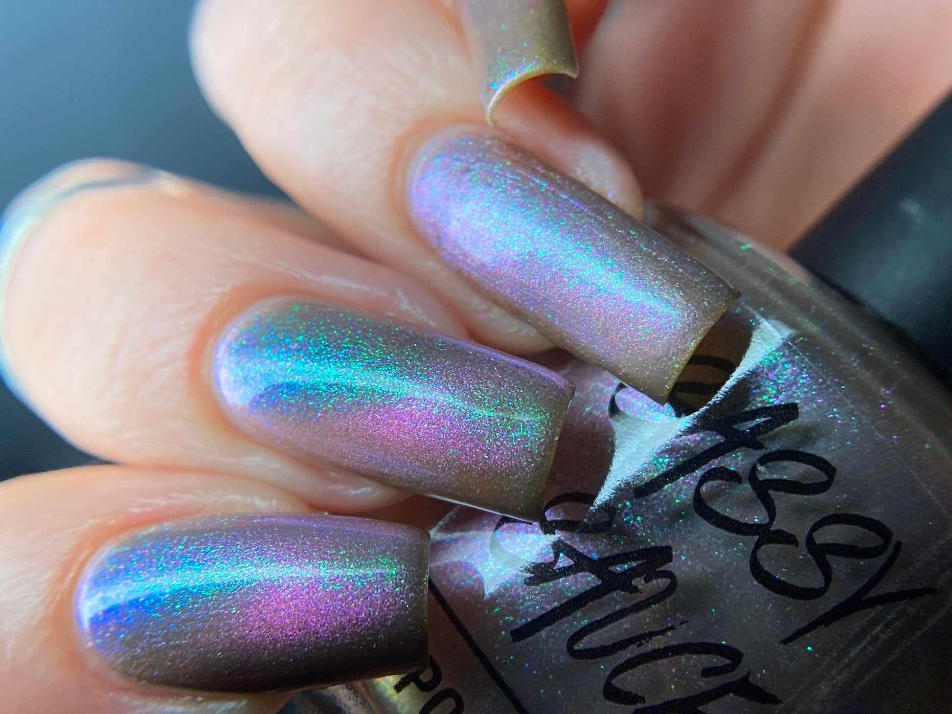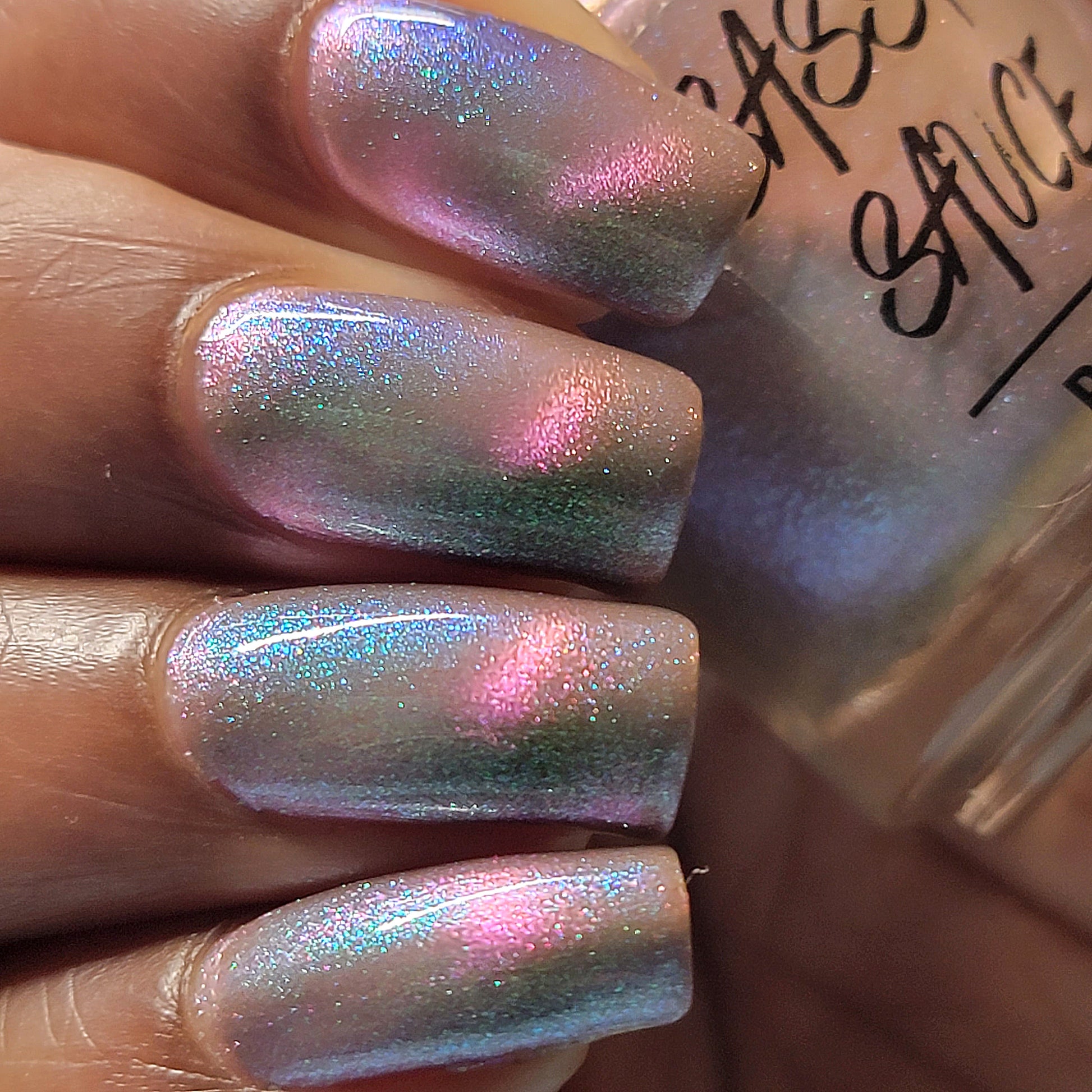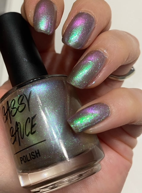 A milky mocha, shimmery, magnetic base with a large particle shifty shimmer that bounces between green/blue/purple. When magnetized, it will pull a pinky purple effect leaving the sparkling shimmer in the background. Named by Mary Sandberg