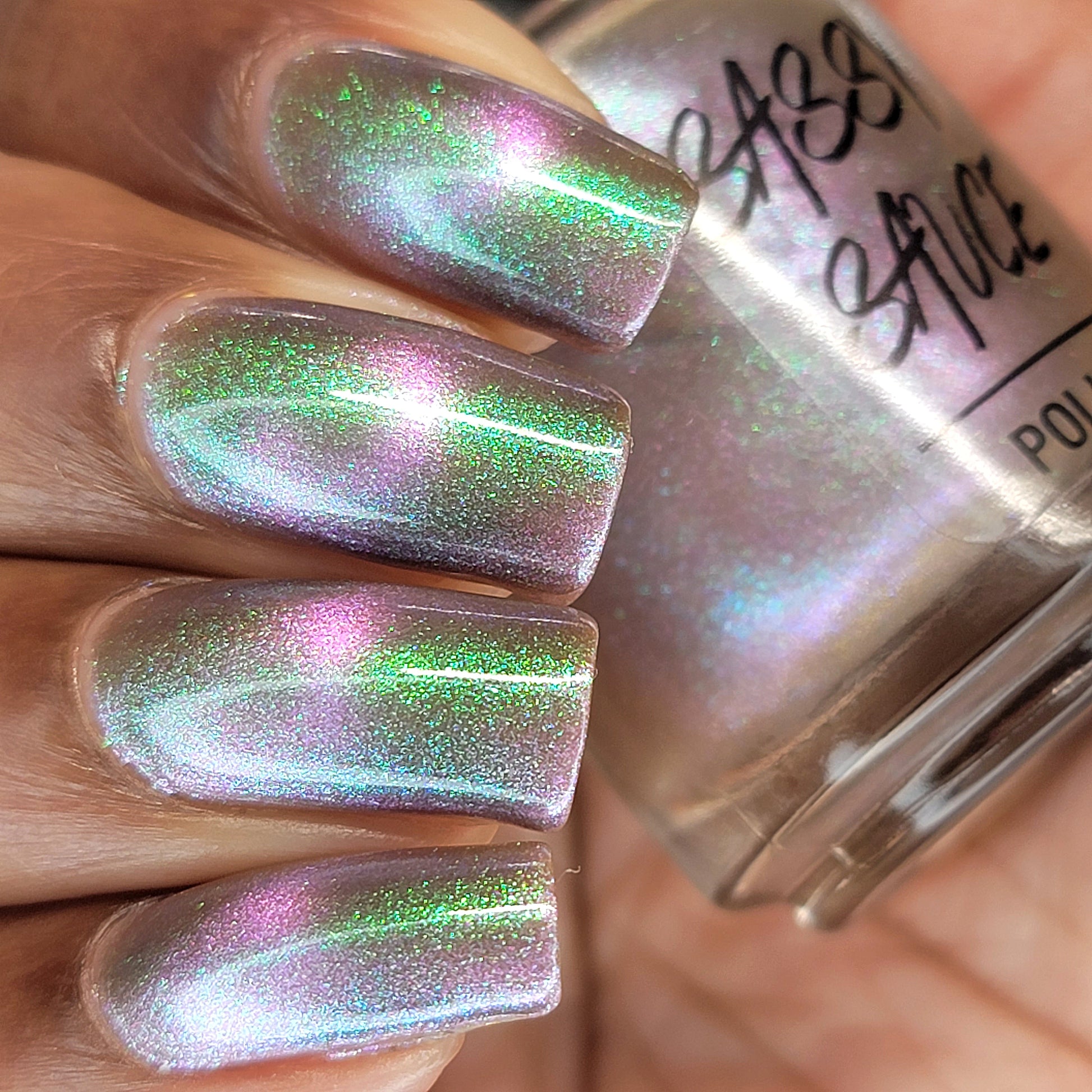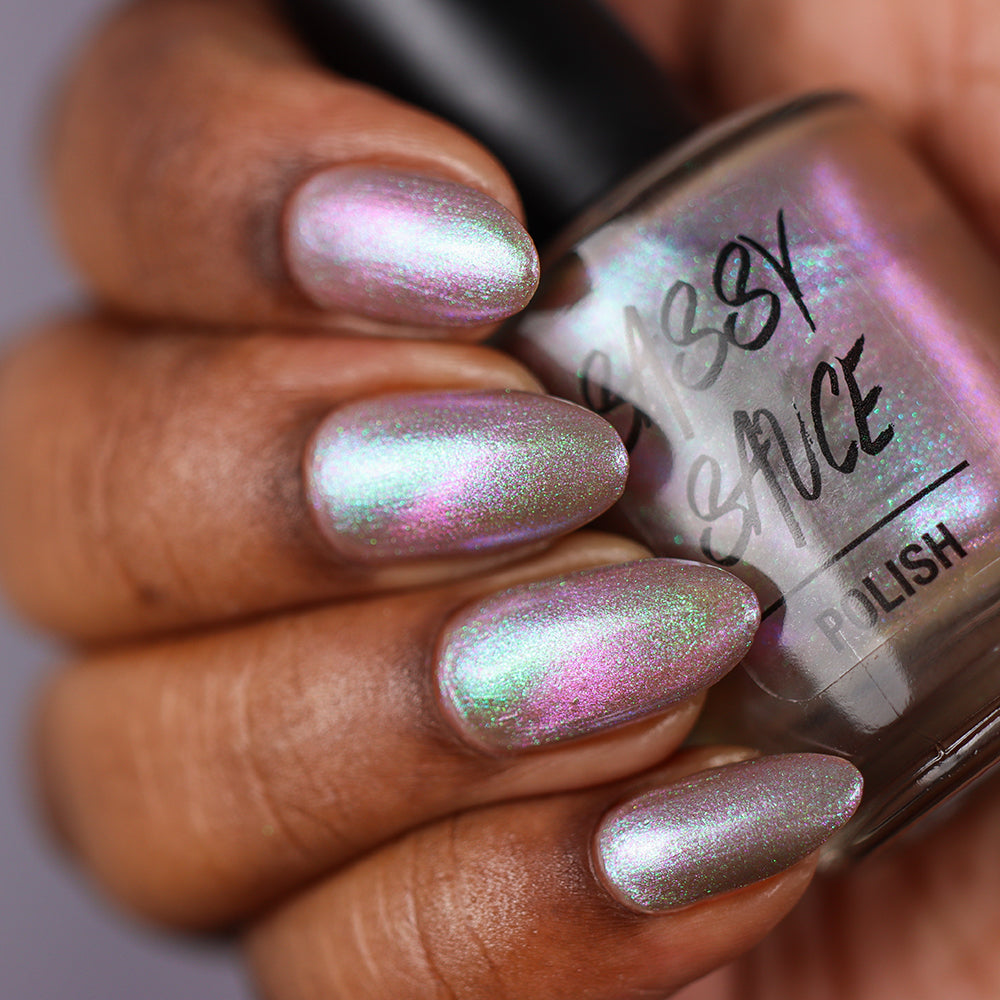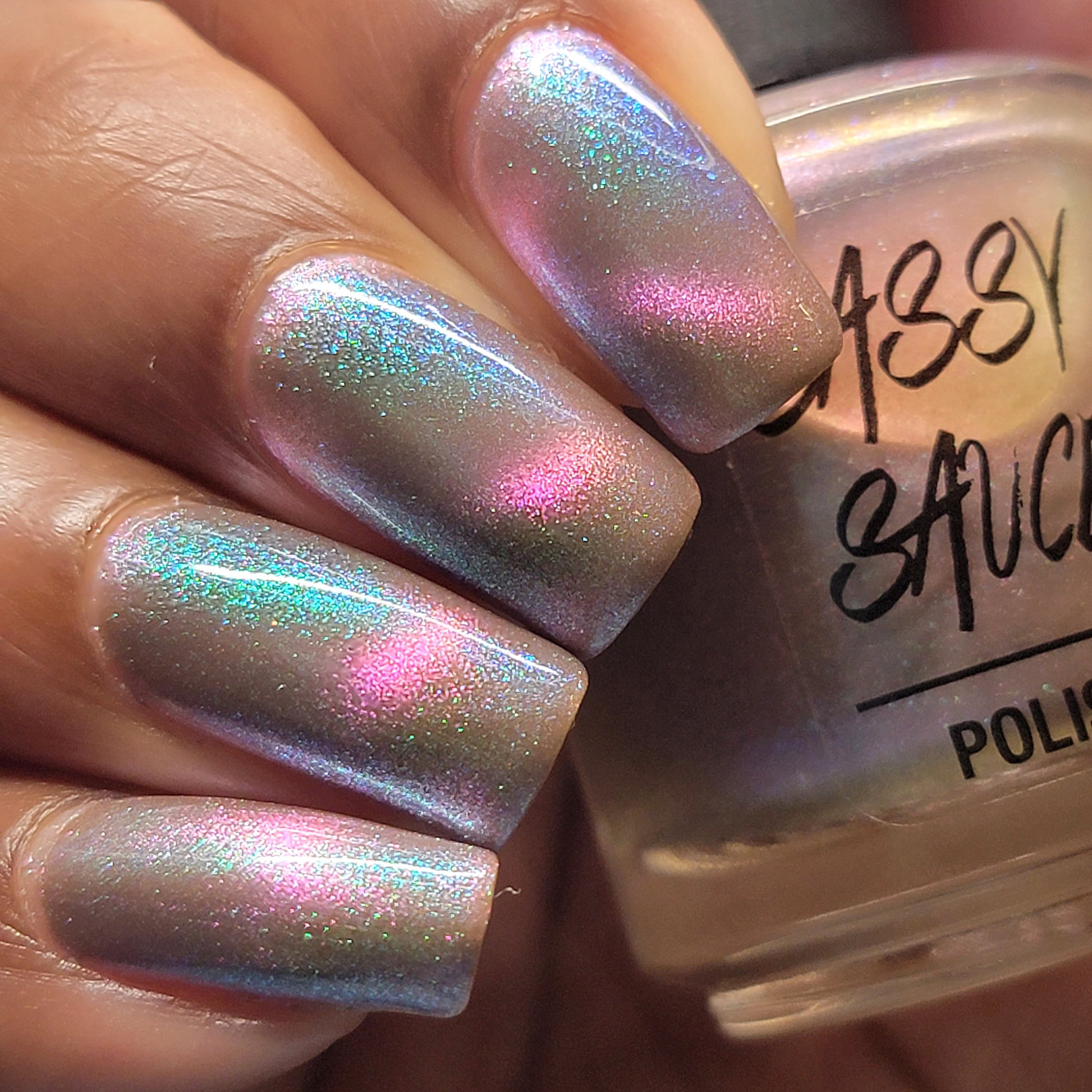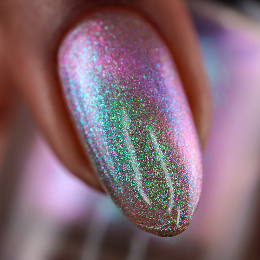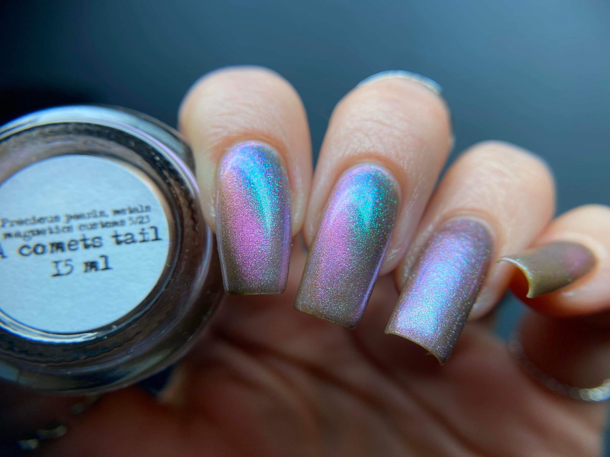 A milky mocha, shimmery, magnetic base with a large particle shifty shimmer that bounces between green/blue/purple. When magnetized, it will pull a pinky purple effect leaving the sparkling shimmer in the background. Named by Mary Sandberg