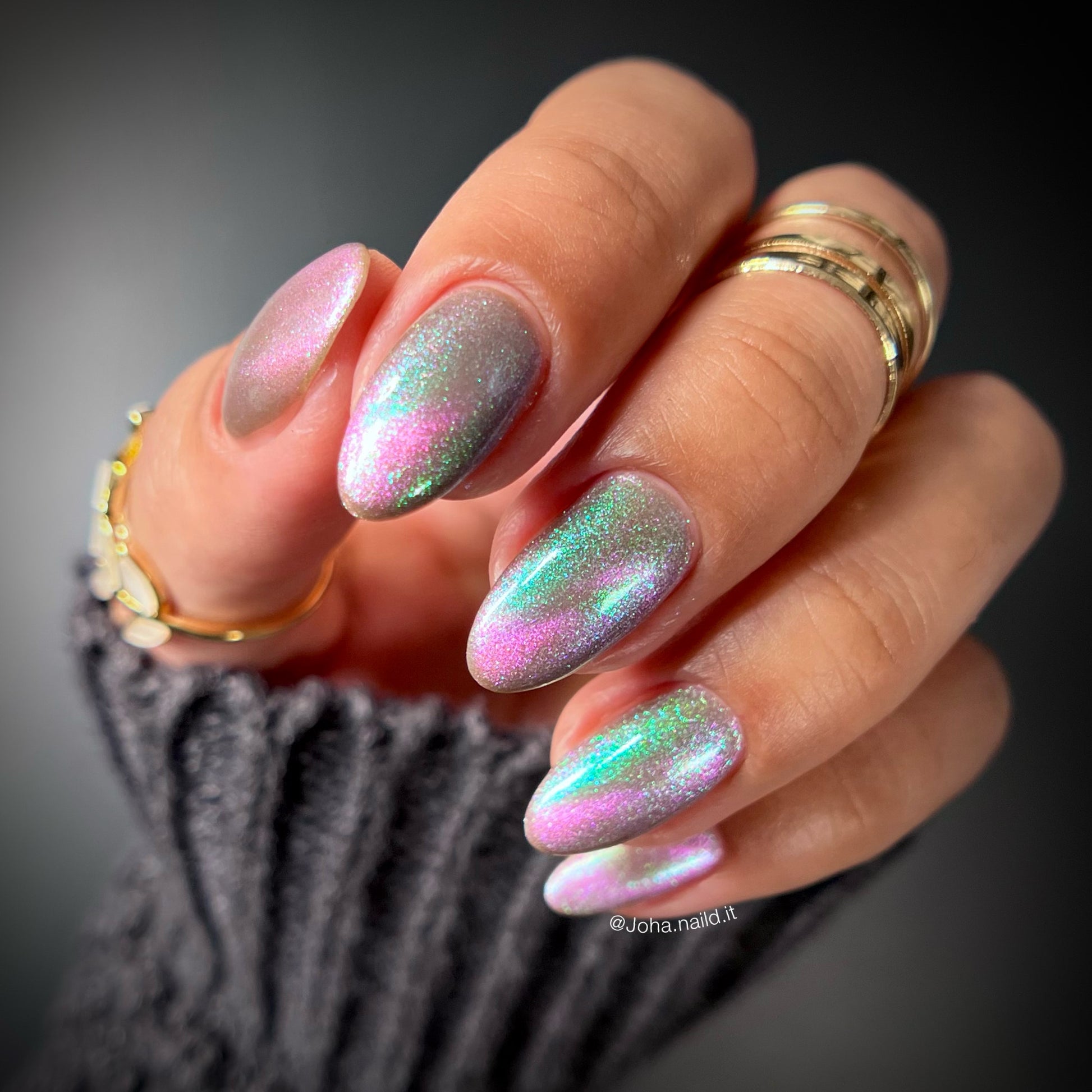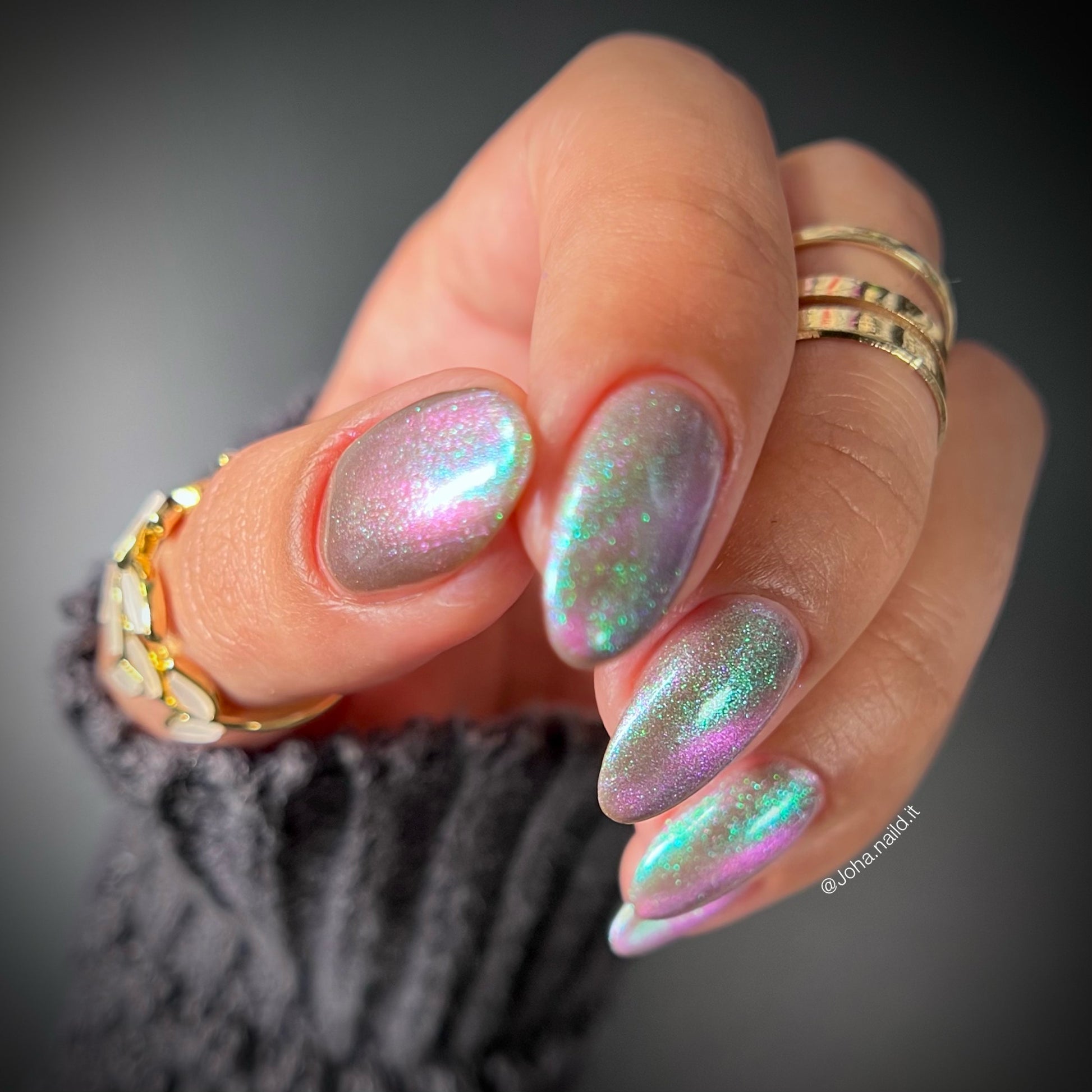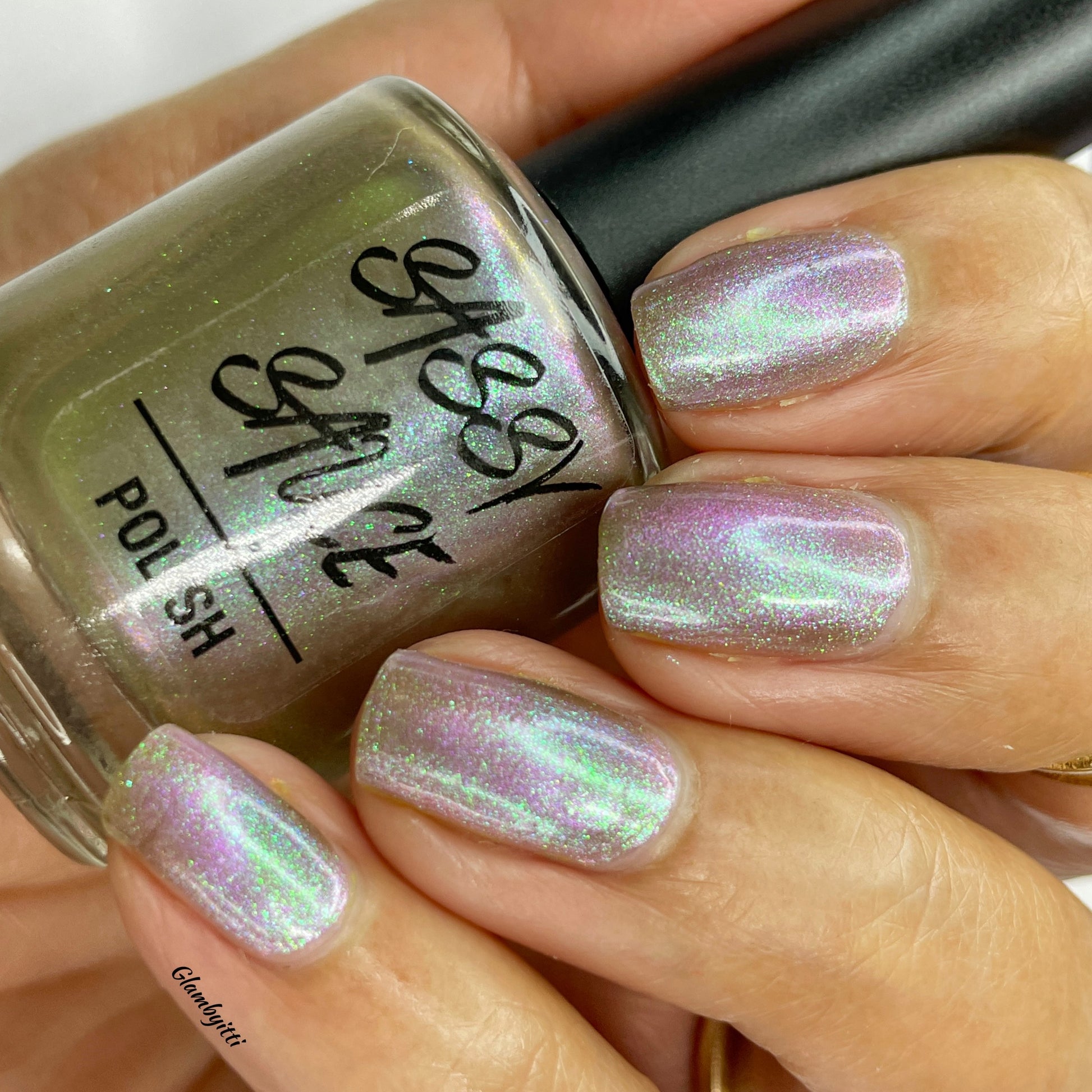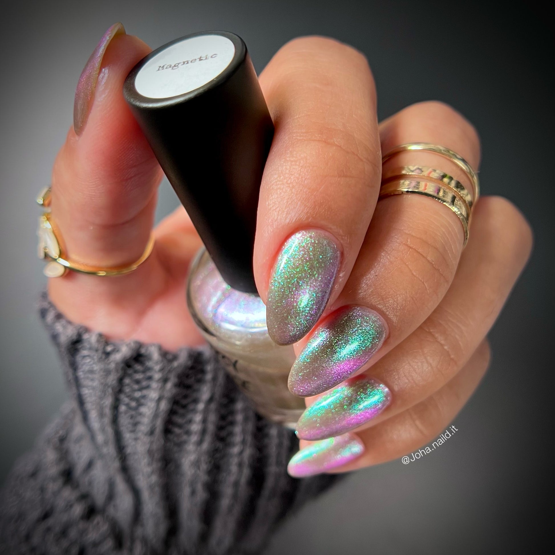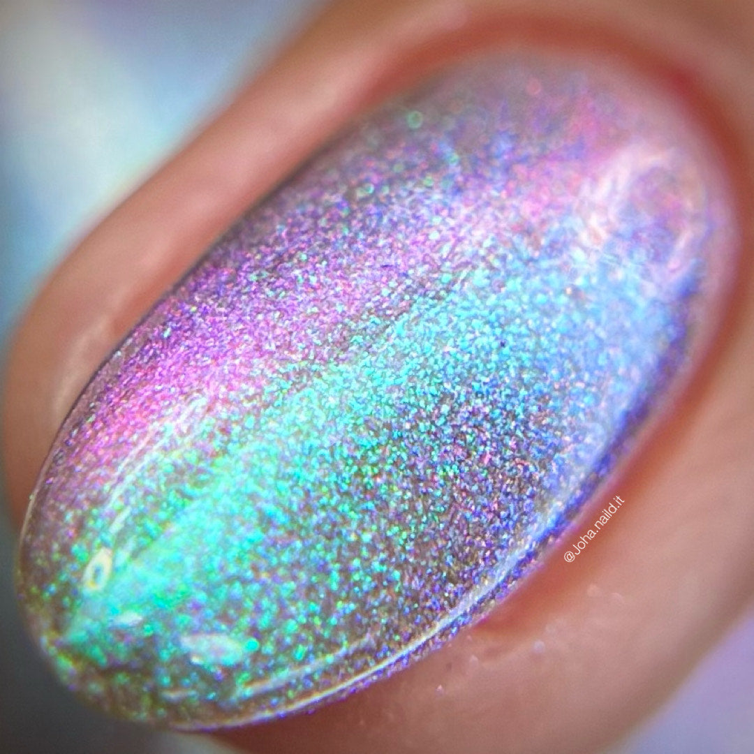 A milky mocha, shimmery, magnetic base with a large particle shifty shimmer that bounces between green/blue/purple. When magnetized, it will pull a pinky purple effect leaving the sparkling shimmer in the background. Named by Mary Sandberg