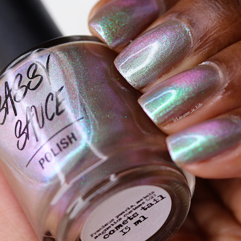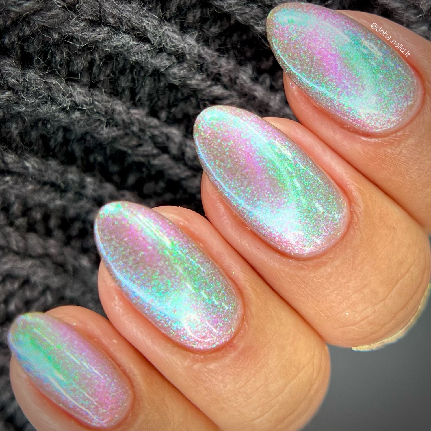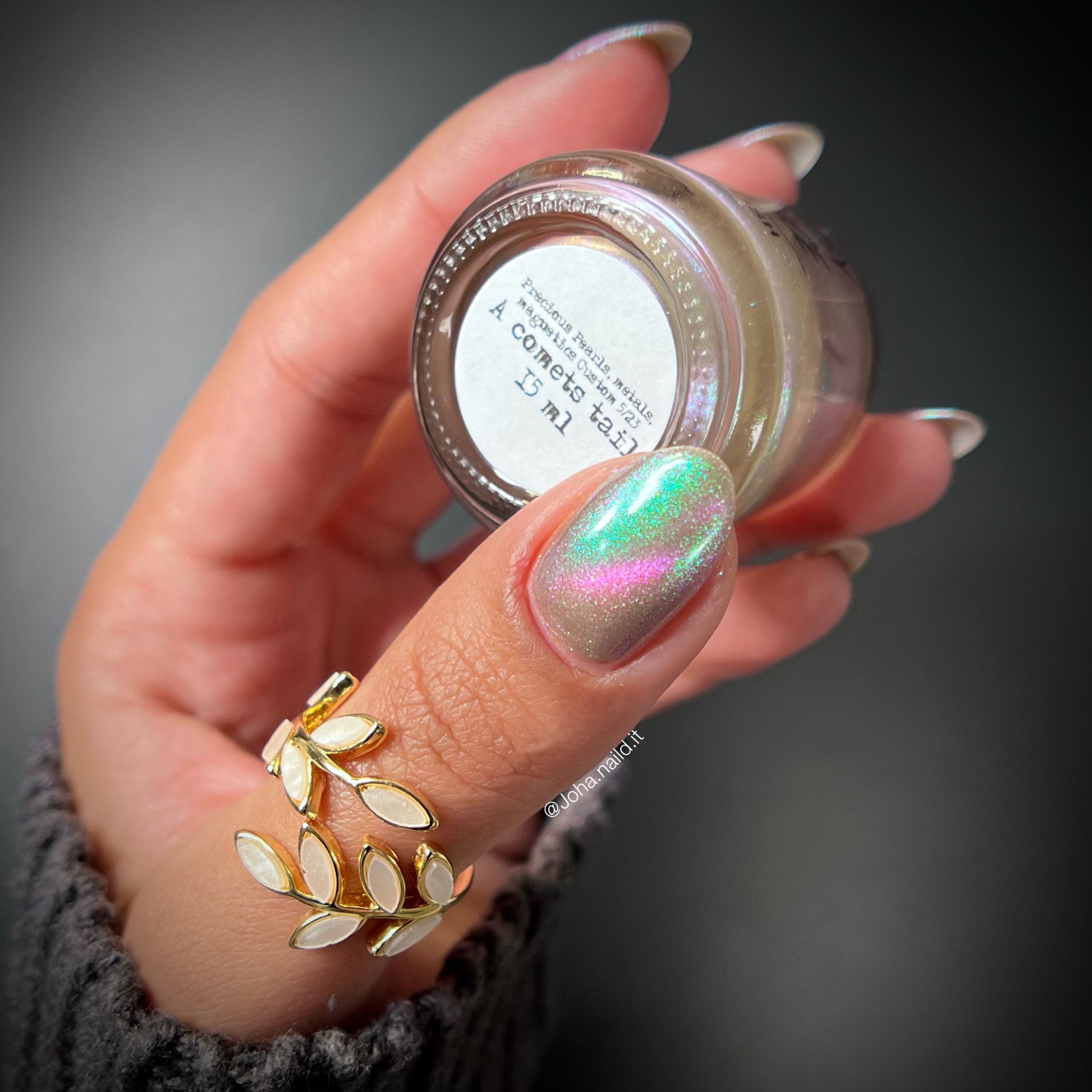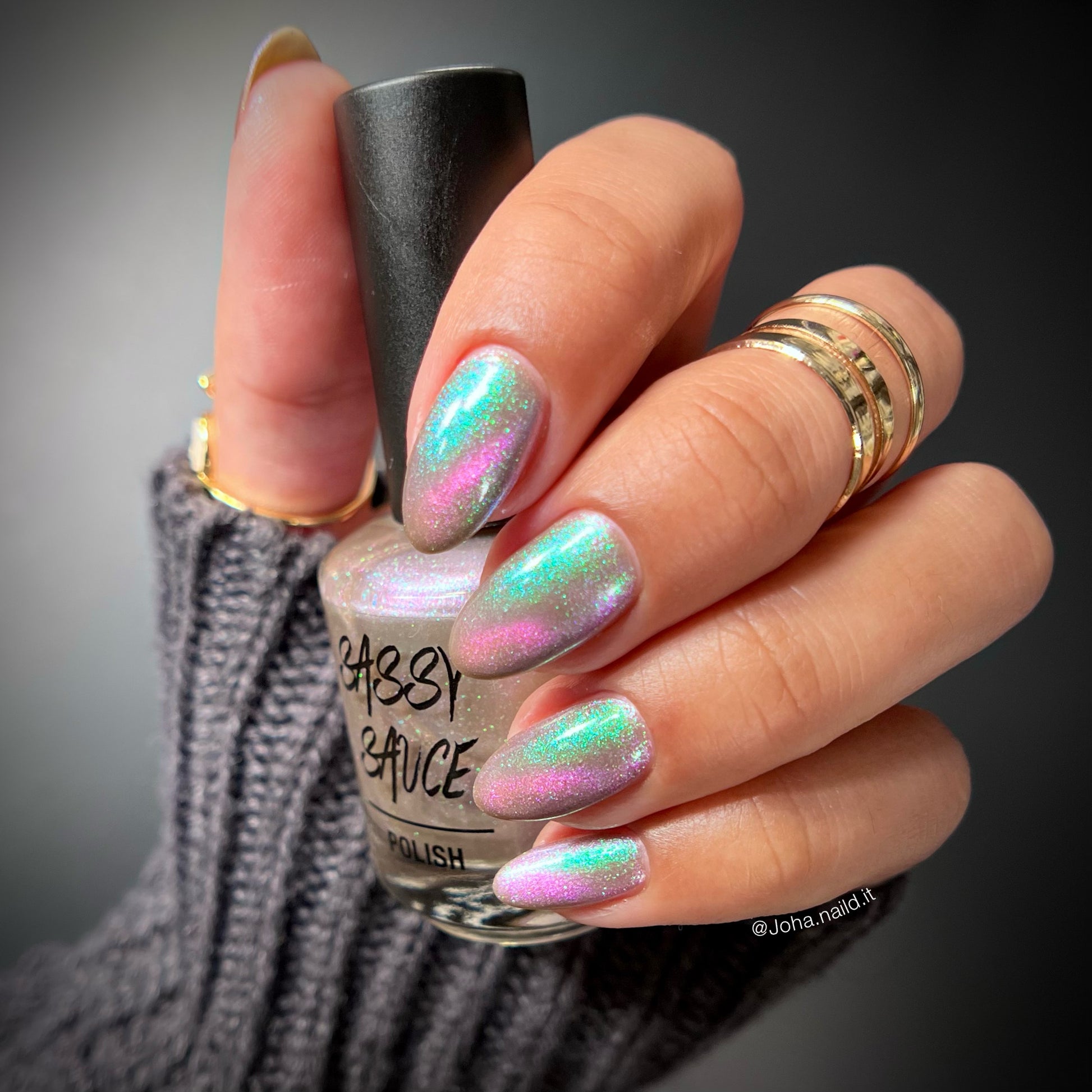 A milky mocha, shimmery, magnetic base with a large particle shifty shimmer that bounces between green/blue/purple. When magnetized, it will pull a pinky purple effect leaving the sparkling shimmer in the background. Named by Mary Sandberg