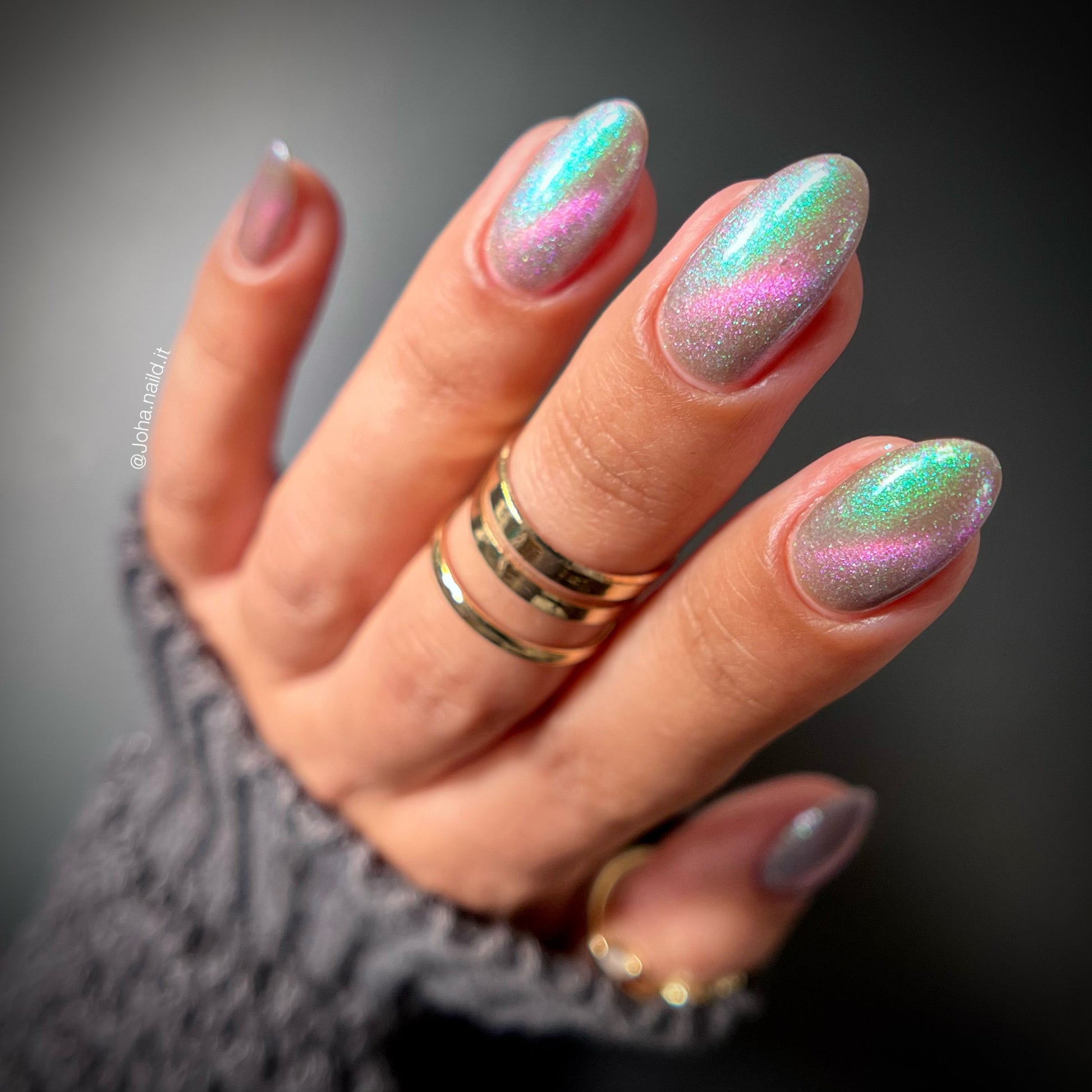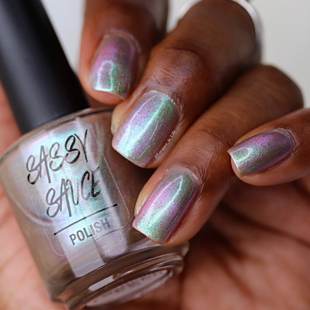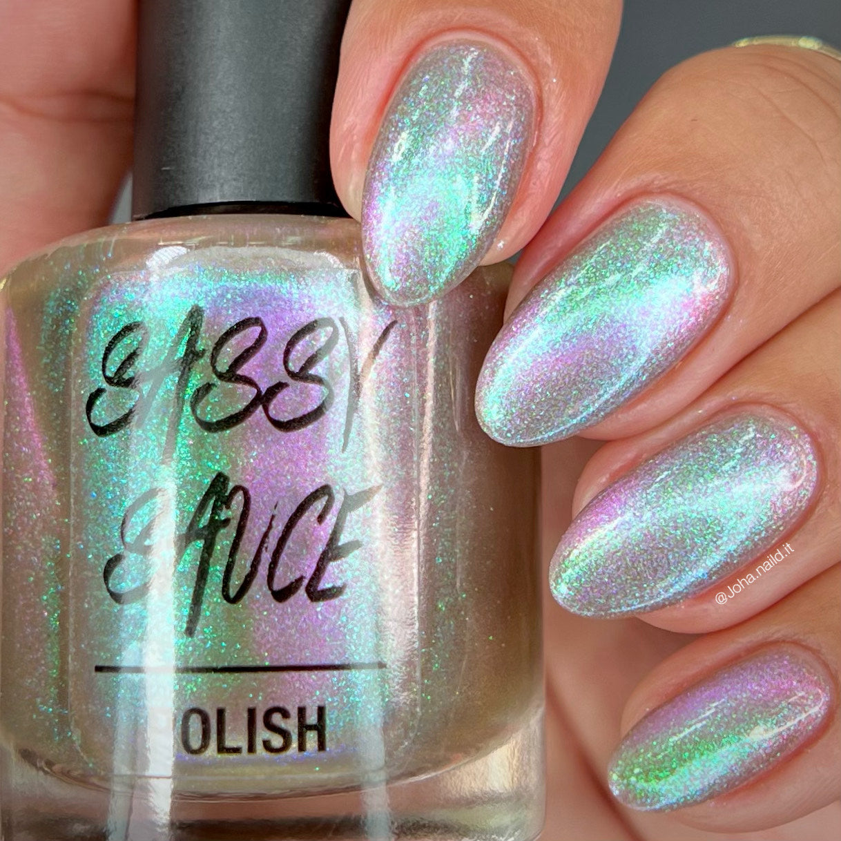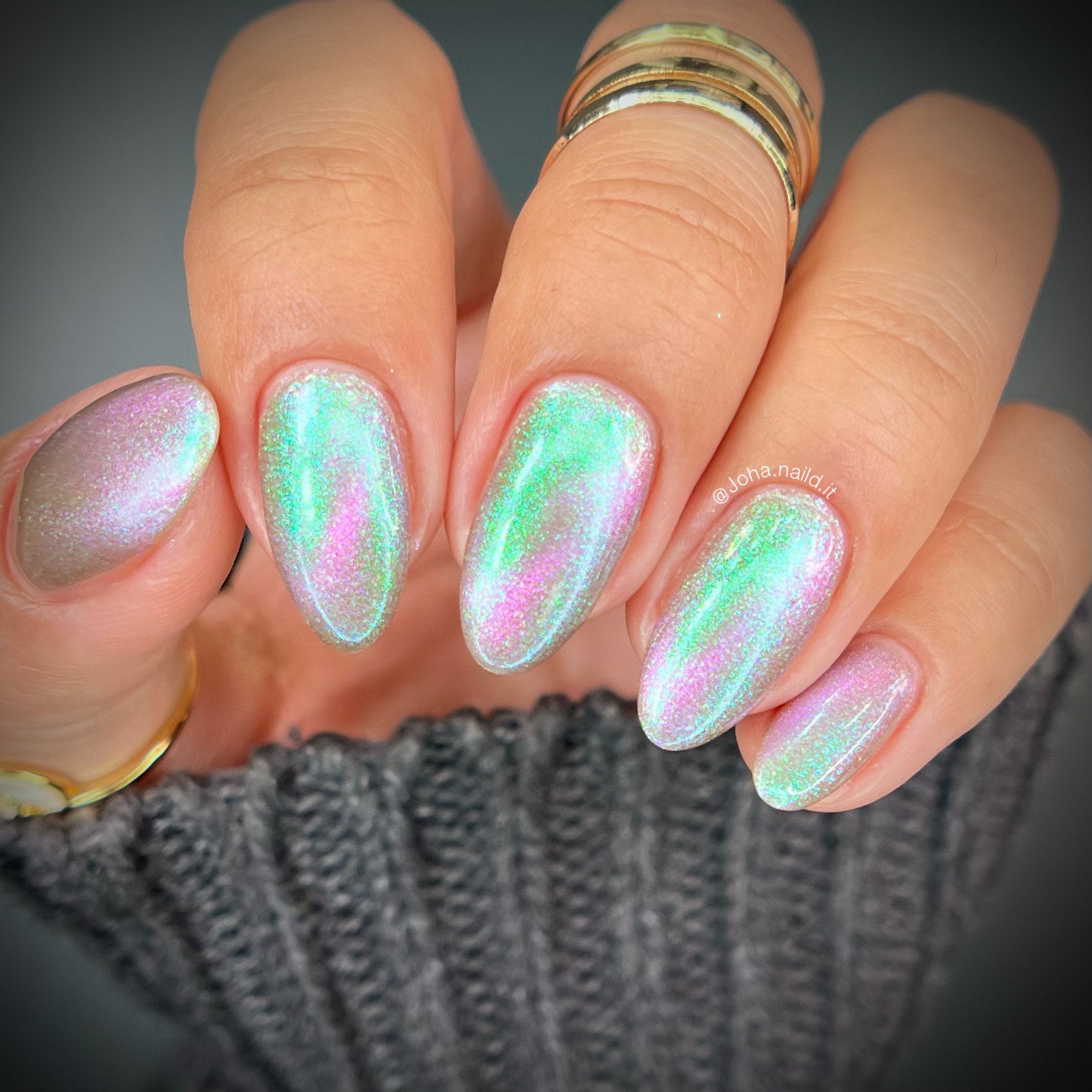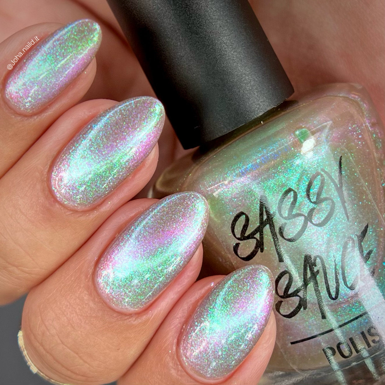 A milky mocha, shimmery, magnetic base with a large particle shifty shimmer that bounces between green/blue/purple. When magnetized, it will pull a pinky purple effect leaving the sparkling shimmer in the background. Named by Mary Sandberg