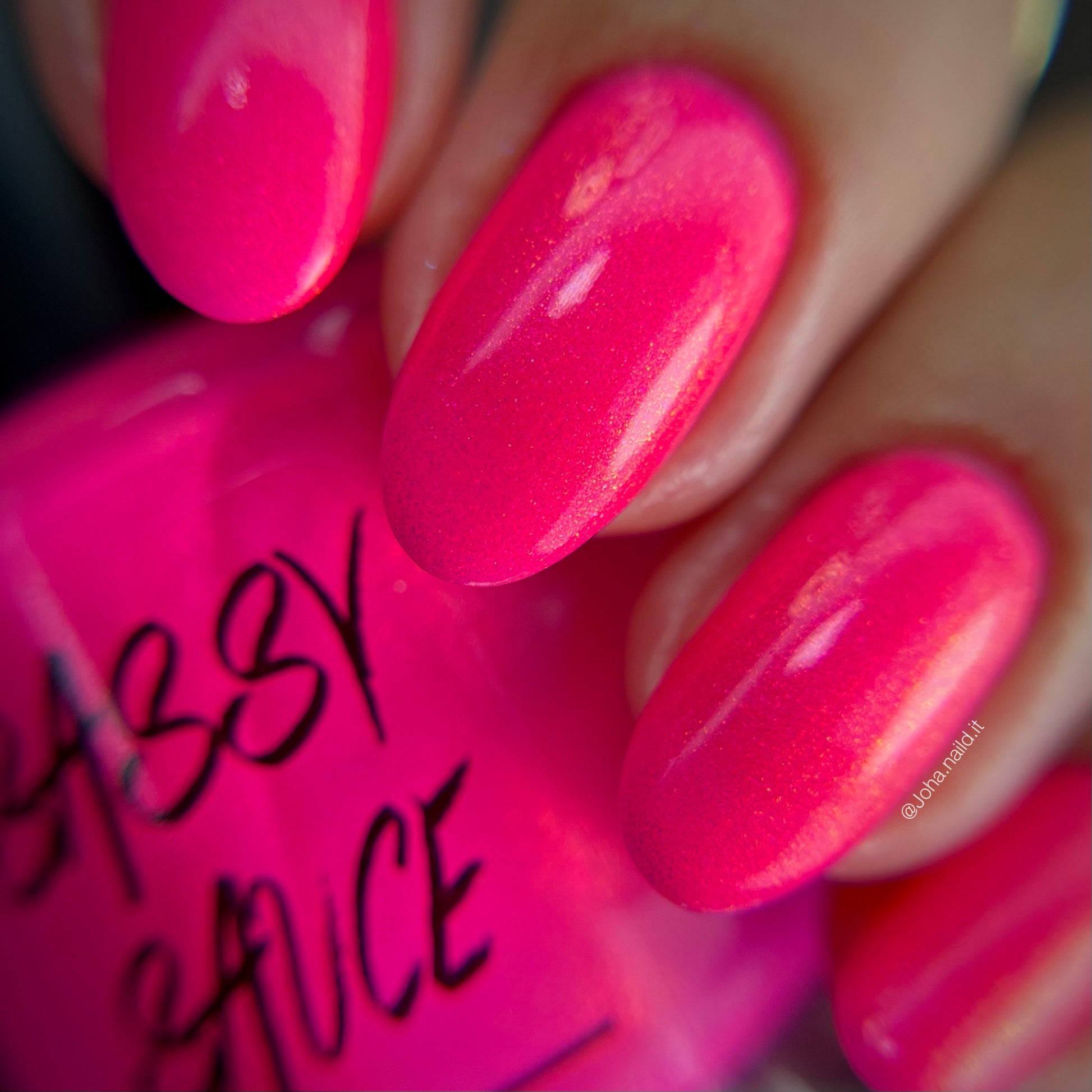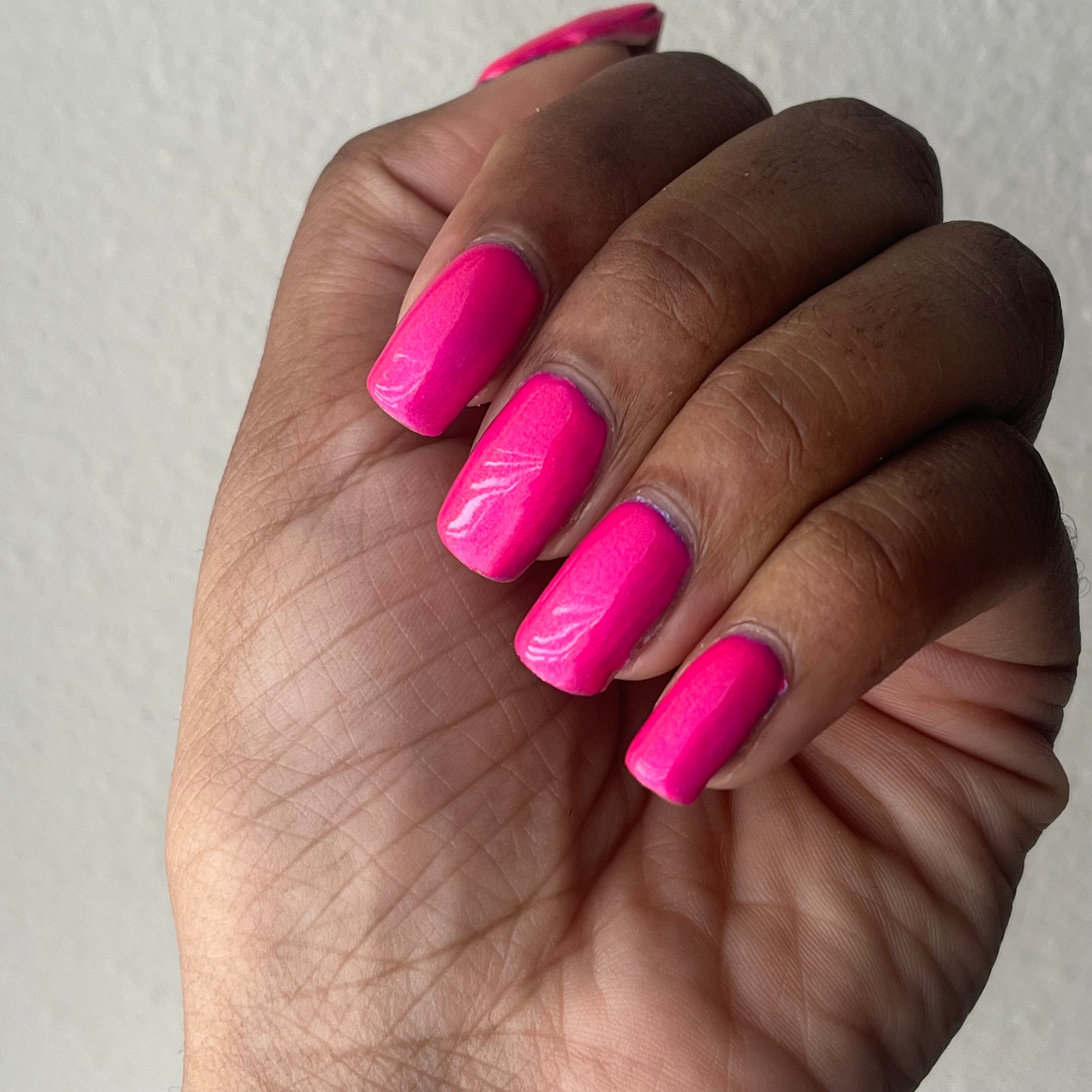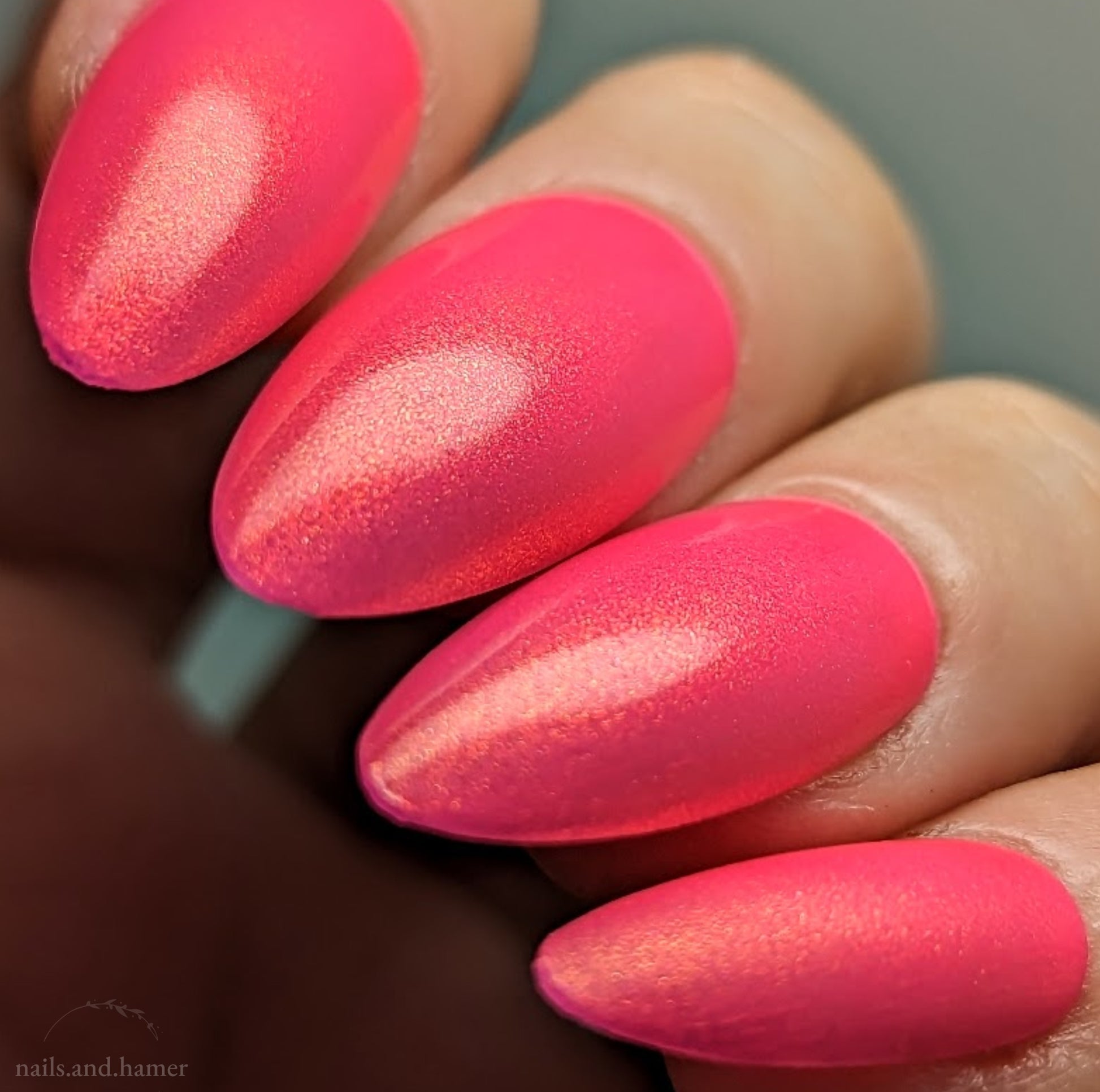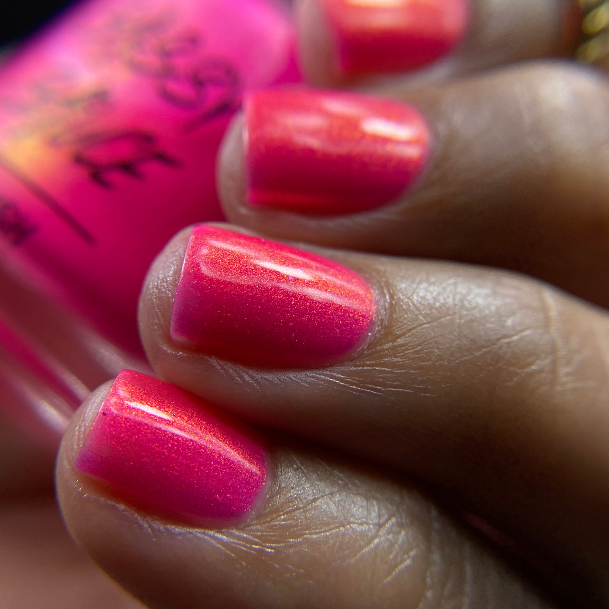 A bright glowey magenta pink with a strong golden orange shimmer. Part of a duo made for my girl LaTannya @lacquer2lashes. Bright and bold, just like her personality!!!!!