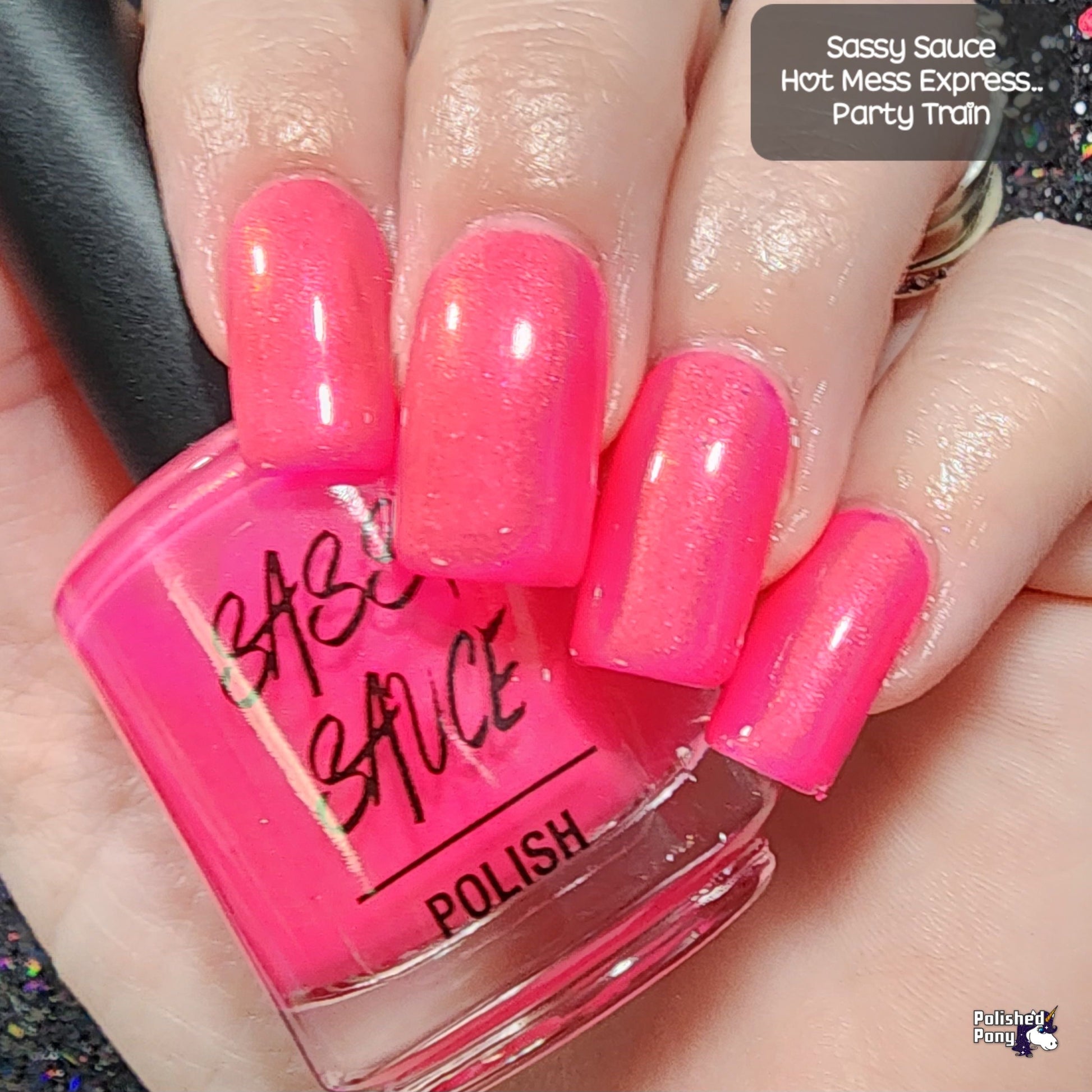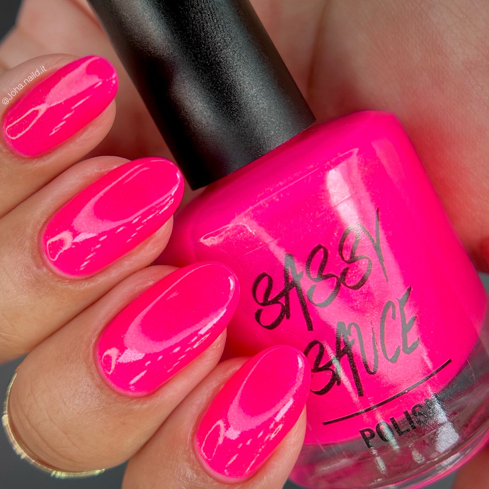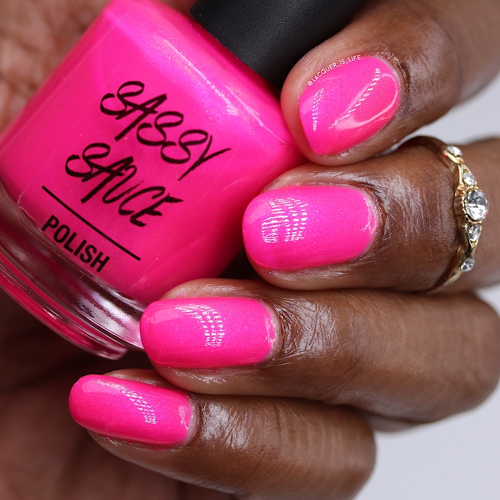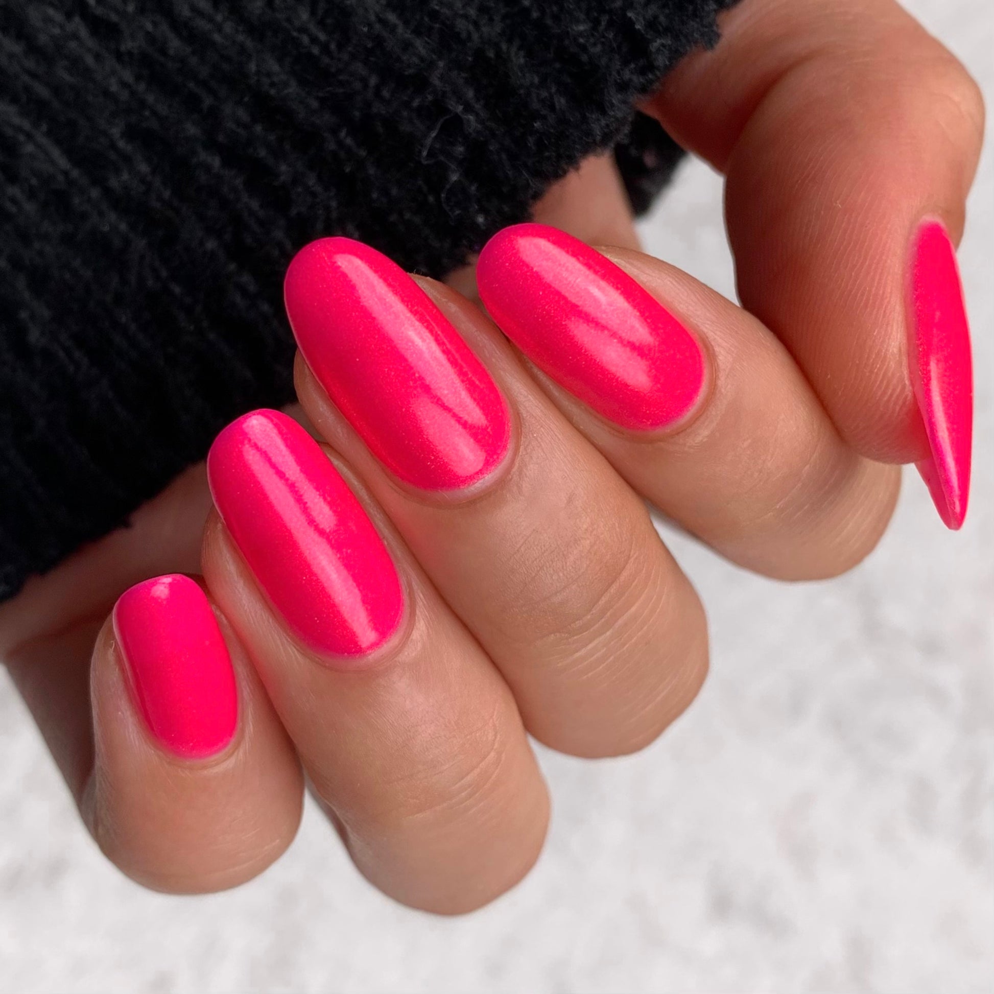 A bright glowey magenta pink with a strong golden orange shimmer. Part of a duo made for my girl LaTannya @lacquer2lashes. Bright and bold, just like her personality!!!!!