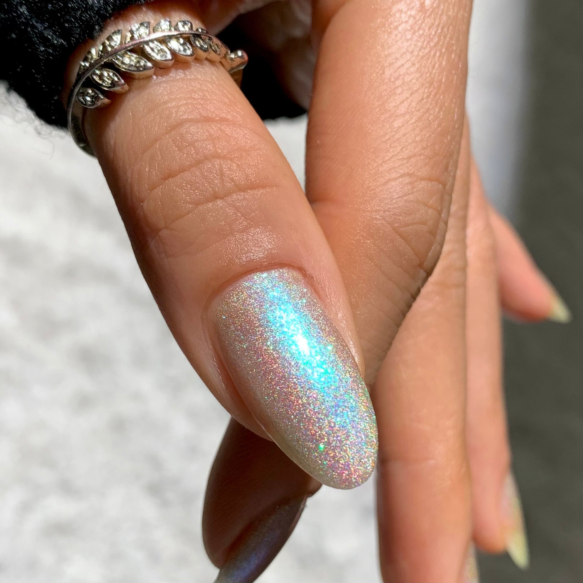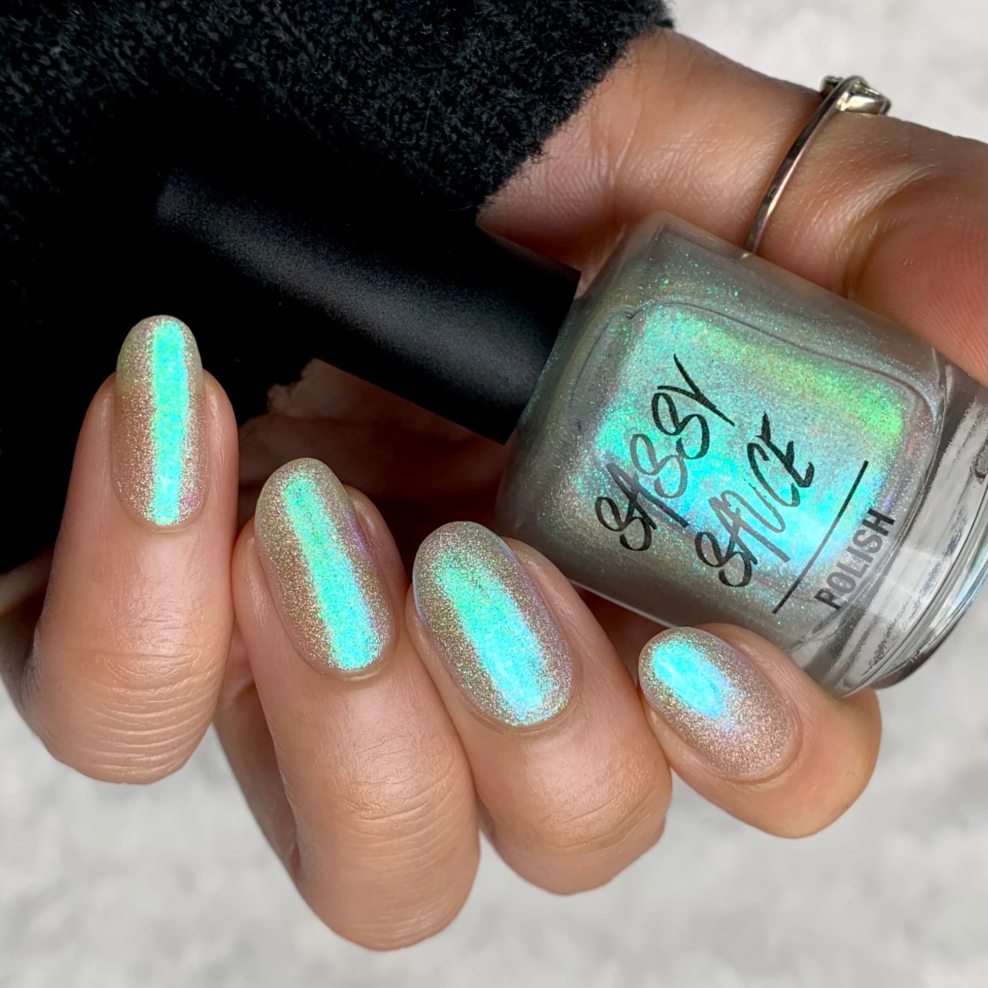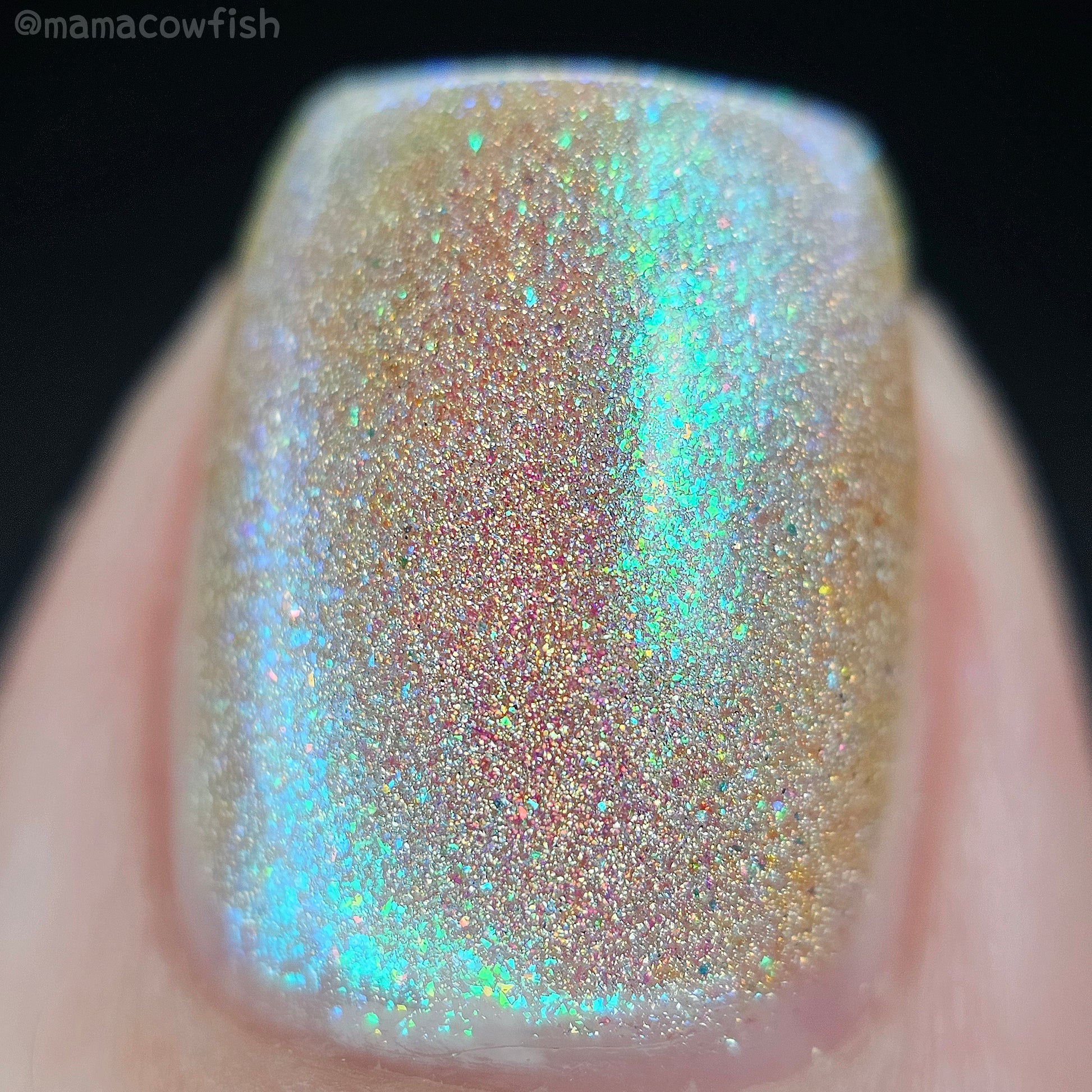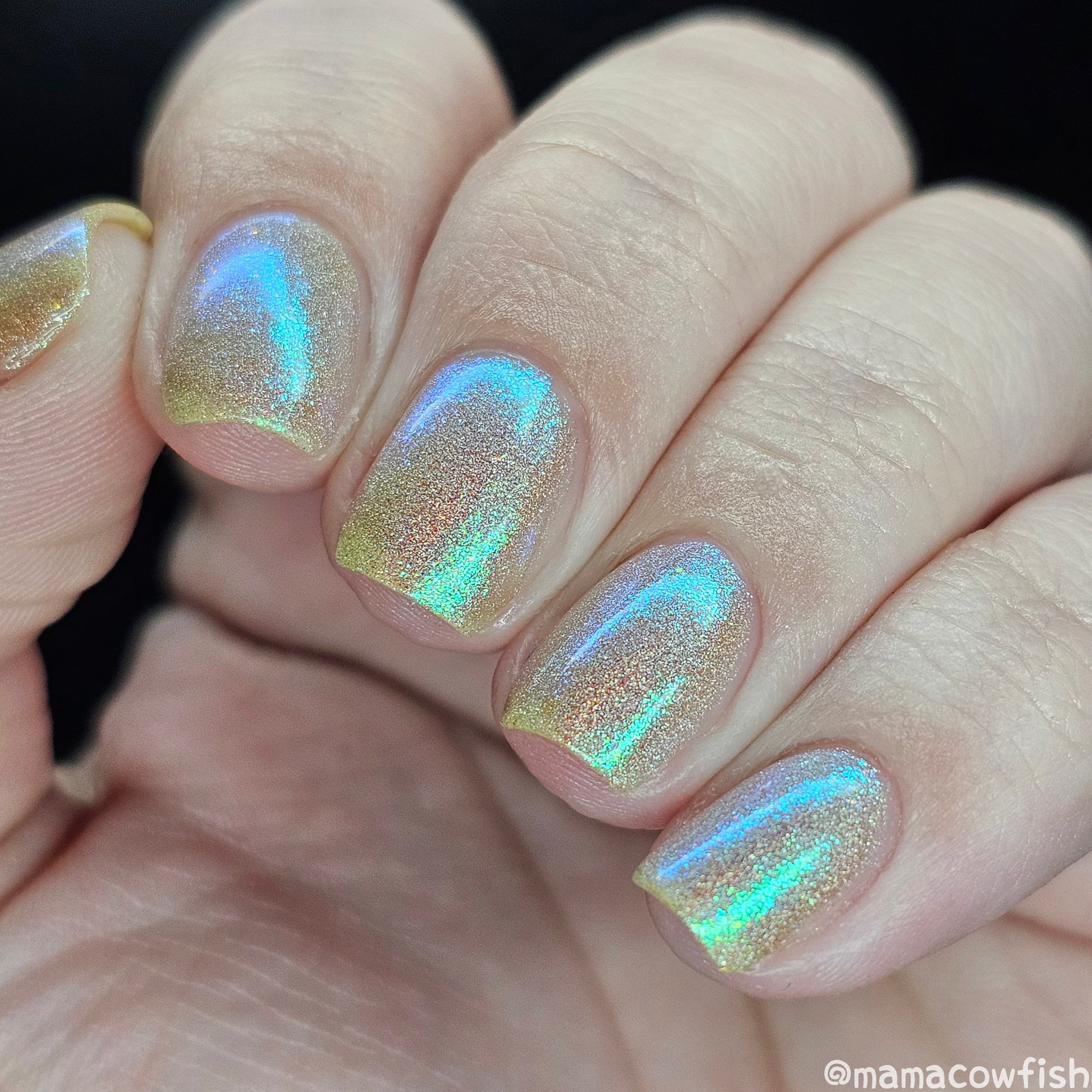 Have you blown bubbles lately? This polish reminded me of that cool little rainbow that hits the bubble when the sun is shining!!! I miss the sun!!!! It is a large particle blue/green/violet shifting shimmer with scattered linear holo. It is opaque in 2 coats and you will see a really cool flame, I see red. If you use it as a topper, hold on to your hat folks. I put it over violet and it just morphed. You will see what I mean.