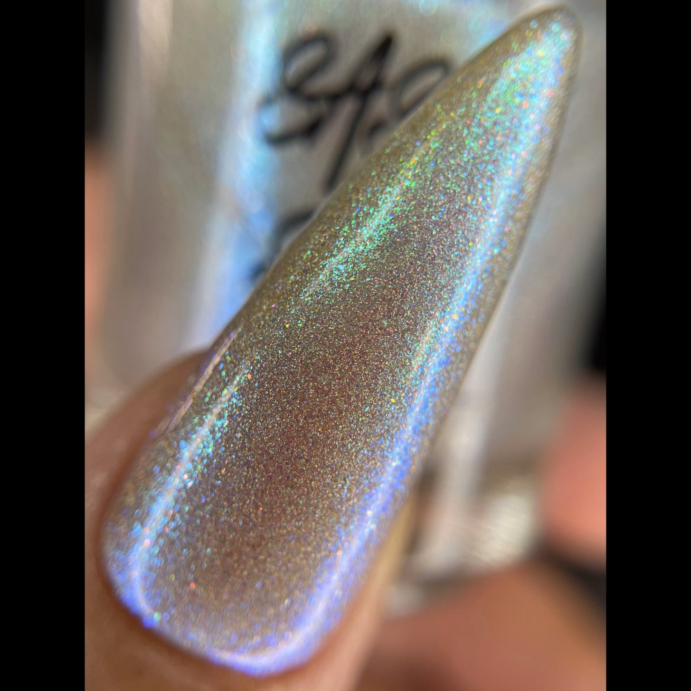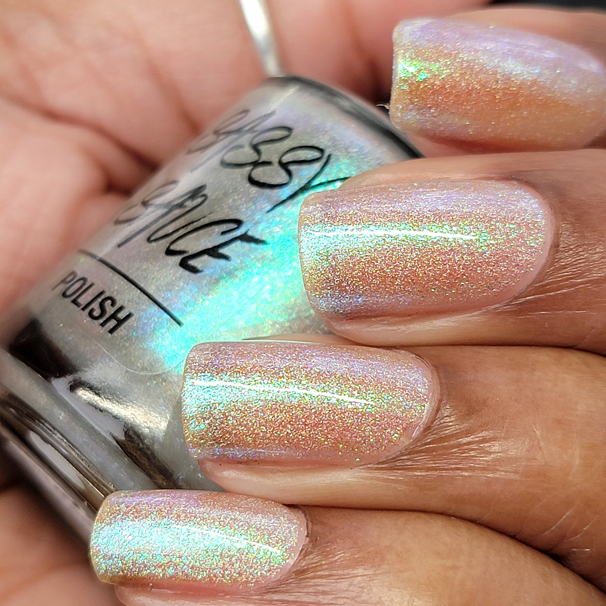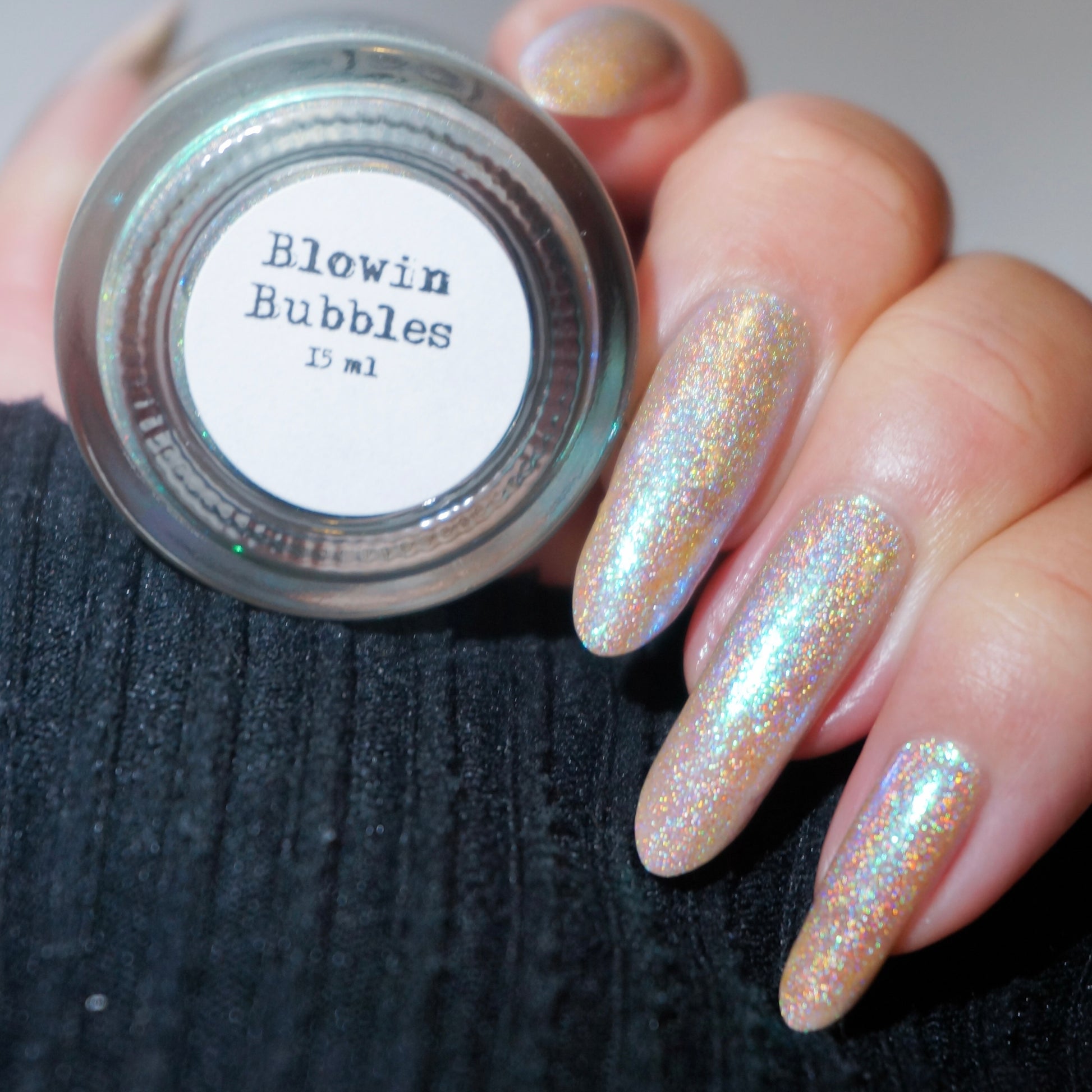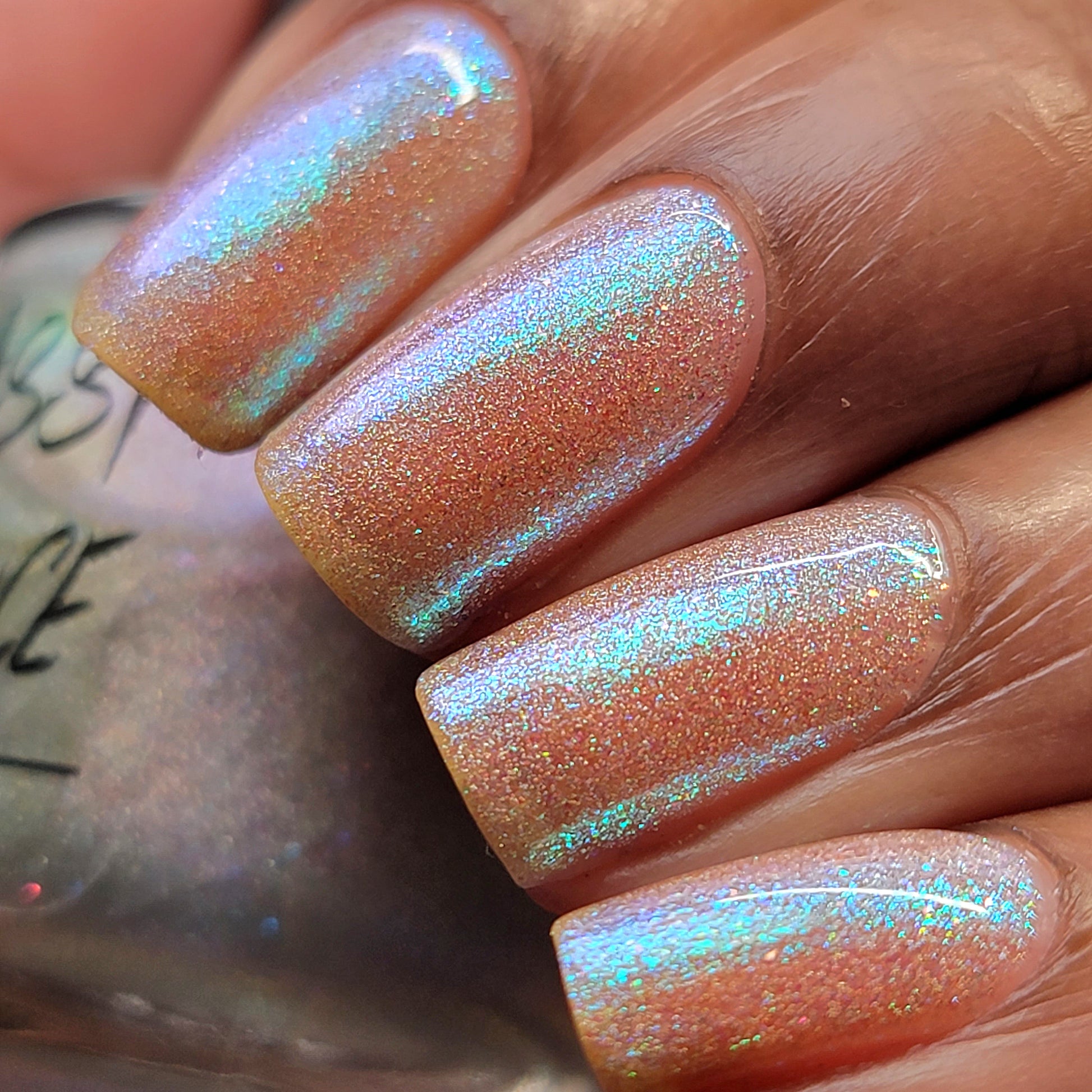 Have you blown bubbles lately? This polish reminded me of that cool little rainbow that hits the bubble when the sun is shining!!! I miss the sun!!!! It is a large particle blue/green/violet shifting shimmer with scattered linear holo. It is opaque in 2 coats and you will see a really cool flame, I see red. If you use it as a topper, hold on to your hat folks. I put it over violet and it just morphed. You will see what I mean.