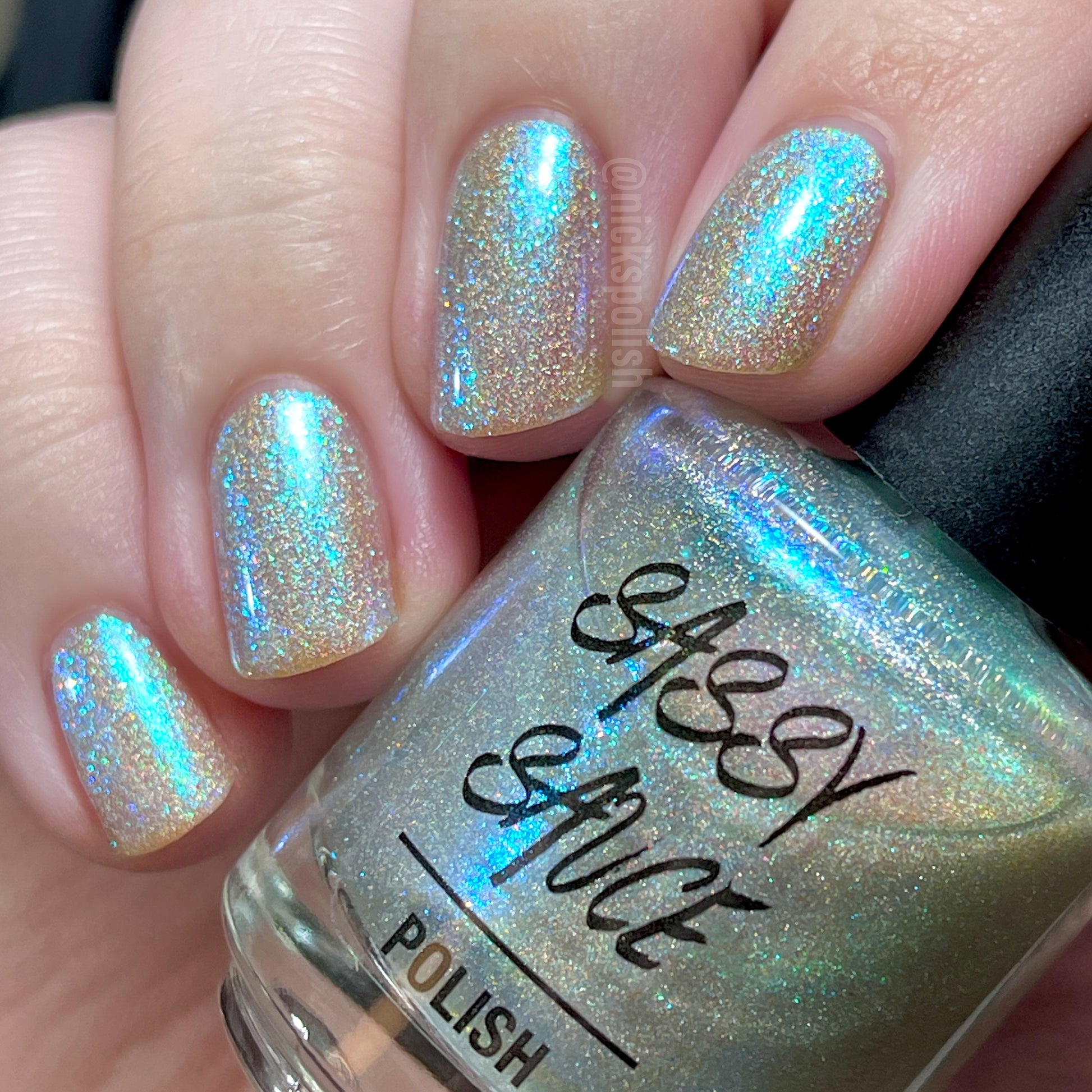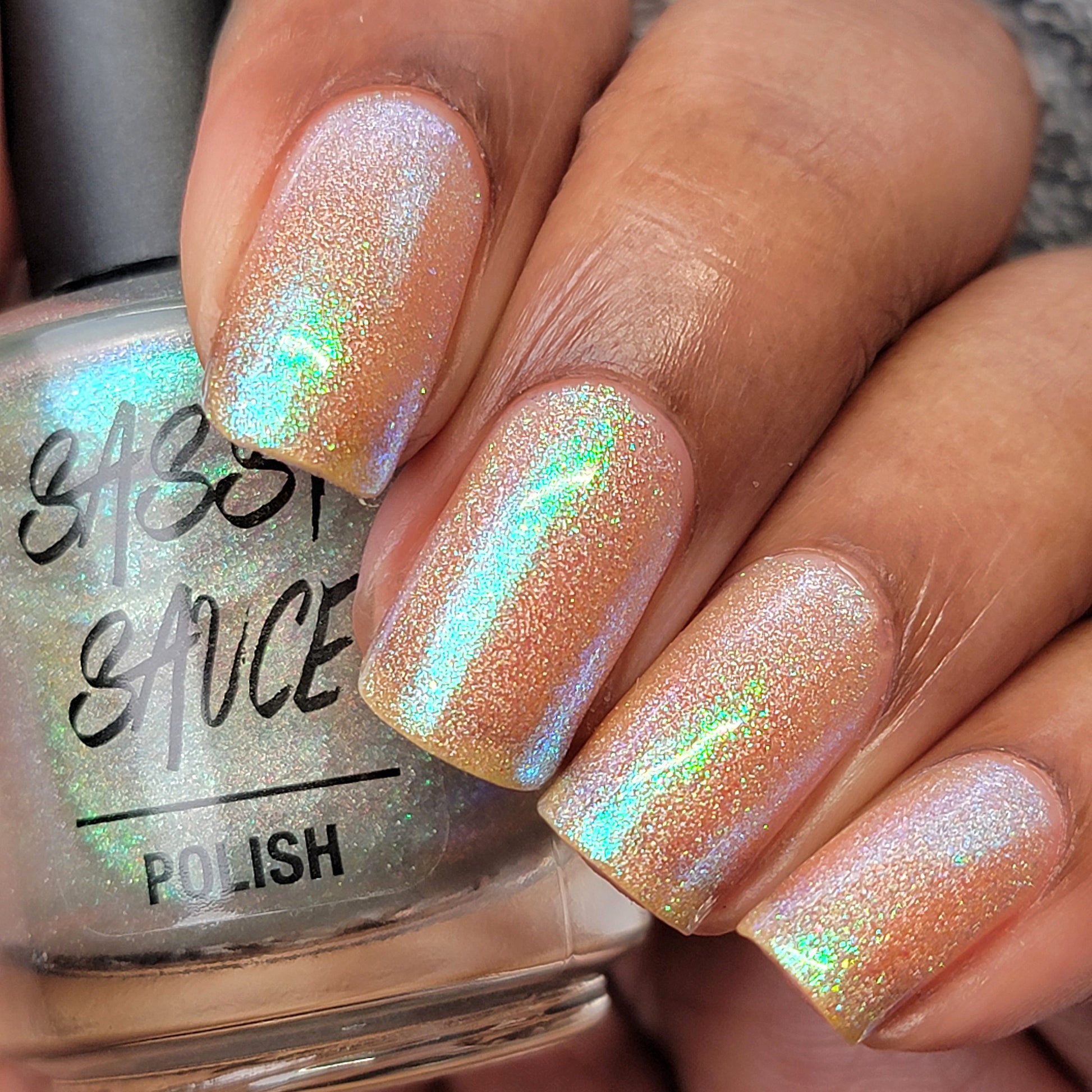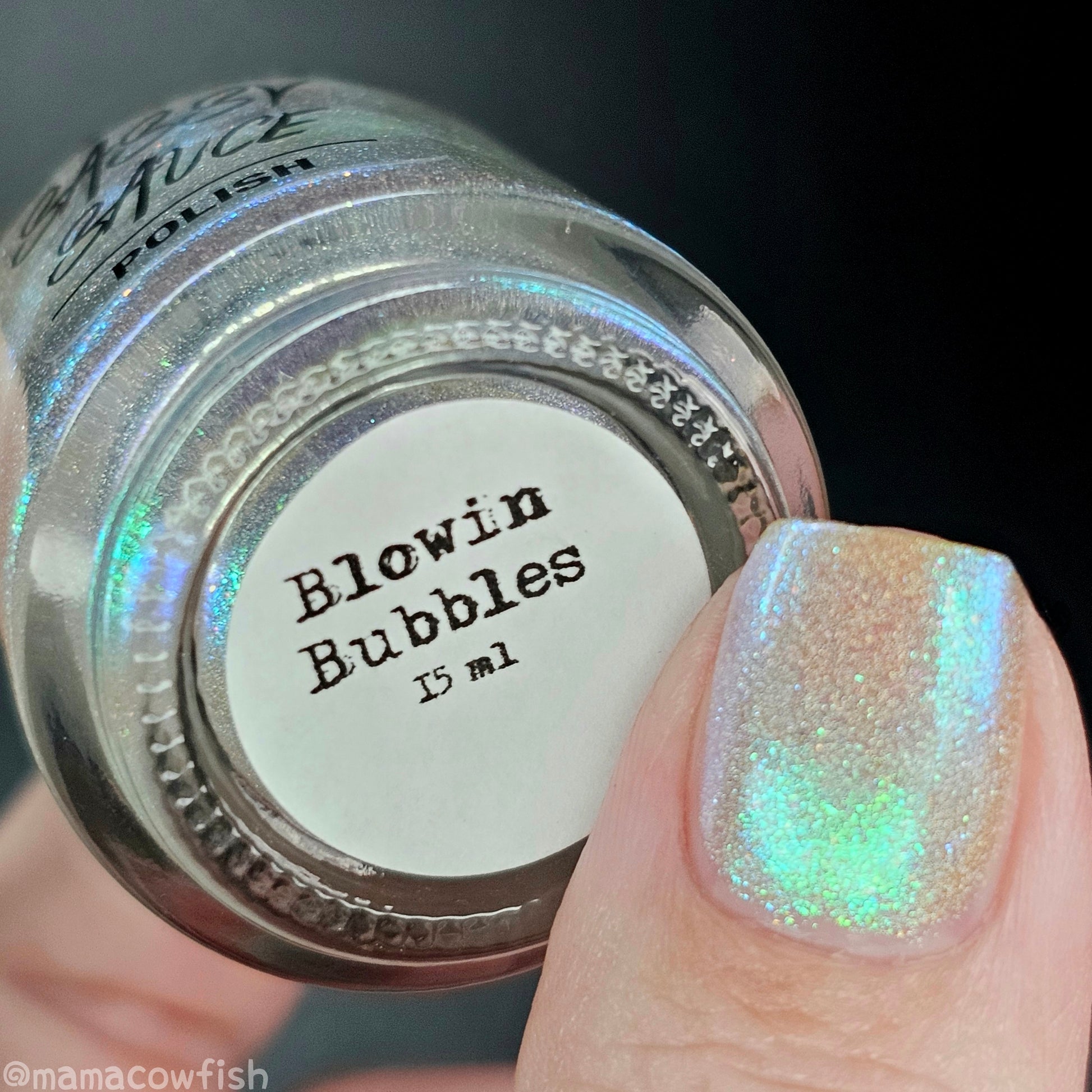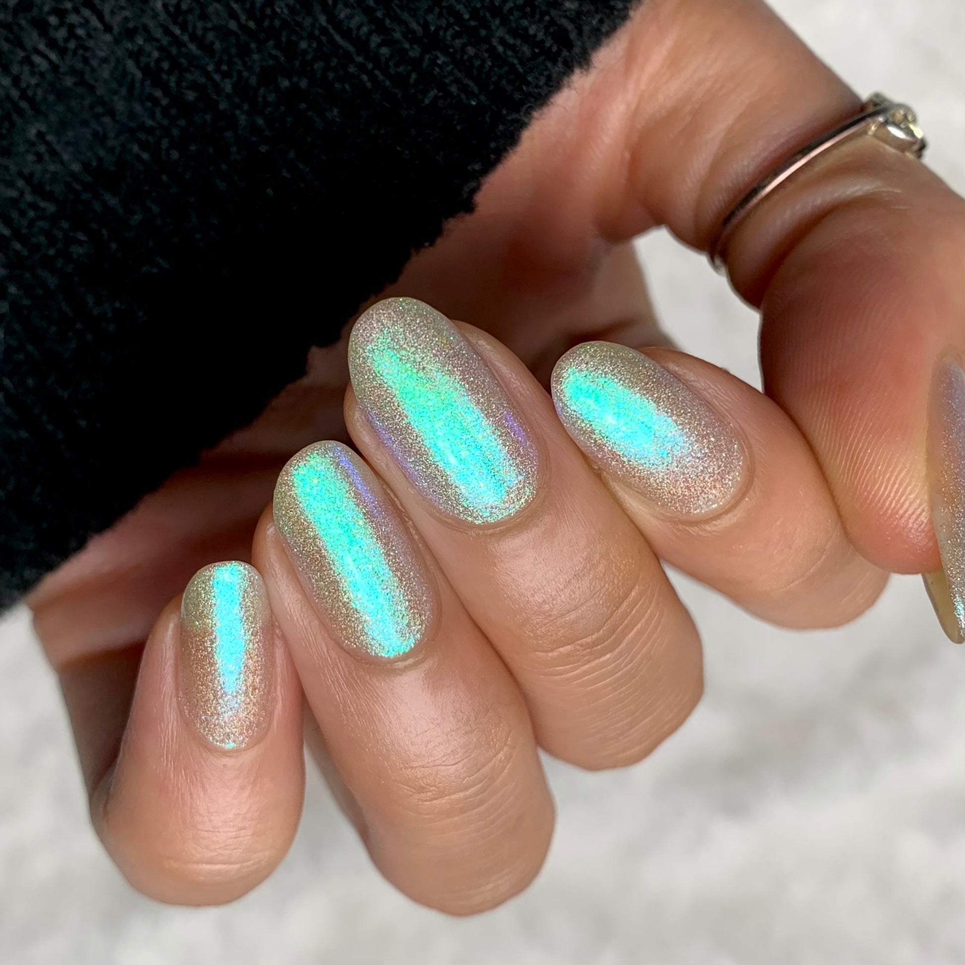 Have you blown bubbles lately? This polish reminded me of that cool little rainbow that hits the bubble when the sun is shining!!! I miss the sun!!!! It is a large particle blue/green/violet shifting shimmer with scattered linear holo. It is opaque in 2 coats and you will see a really cool flame, I see red. If you use it as a topper, hold on to your hat folks. I put it over violet and it just morphed. You will see what I mean.