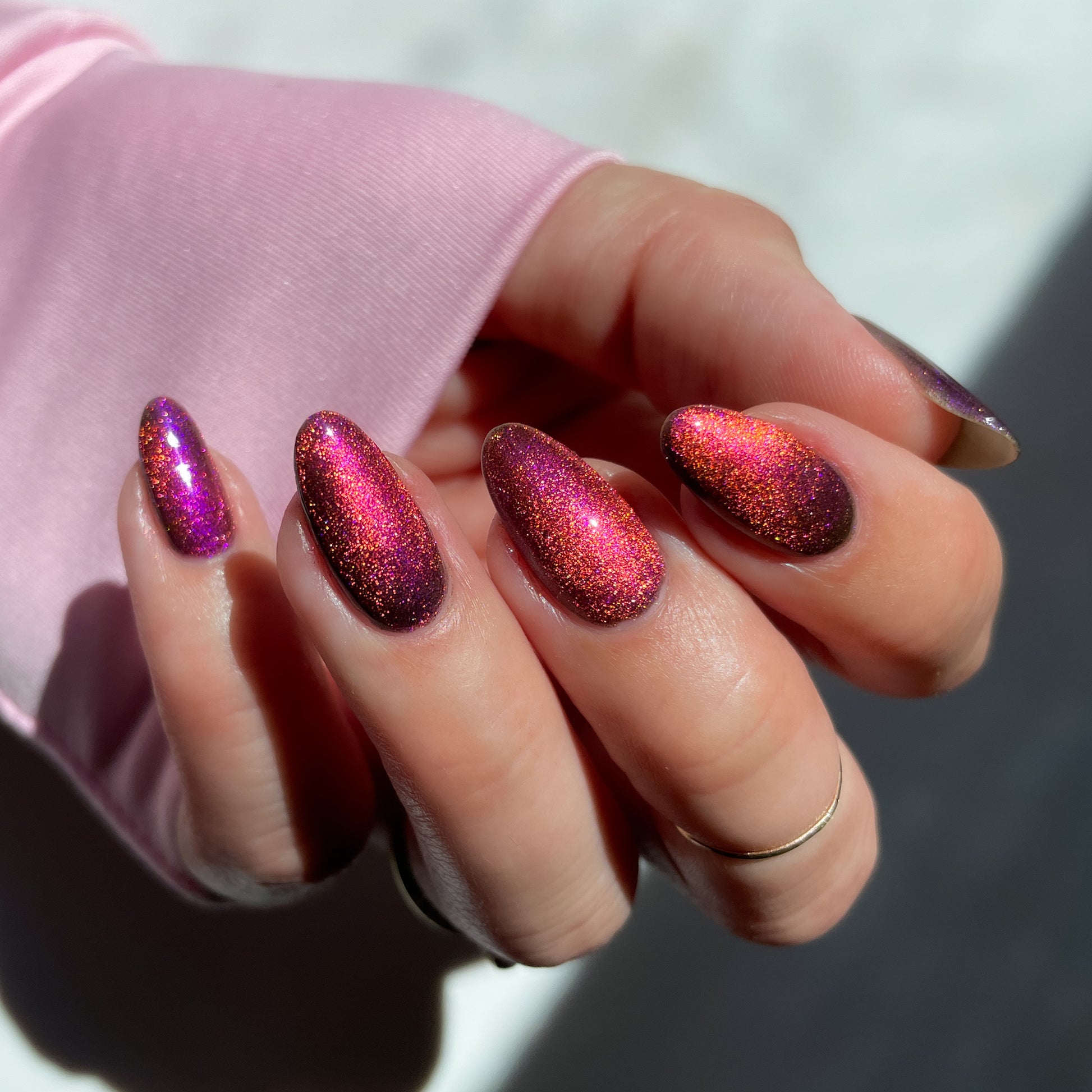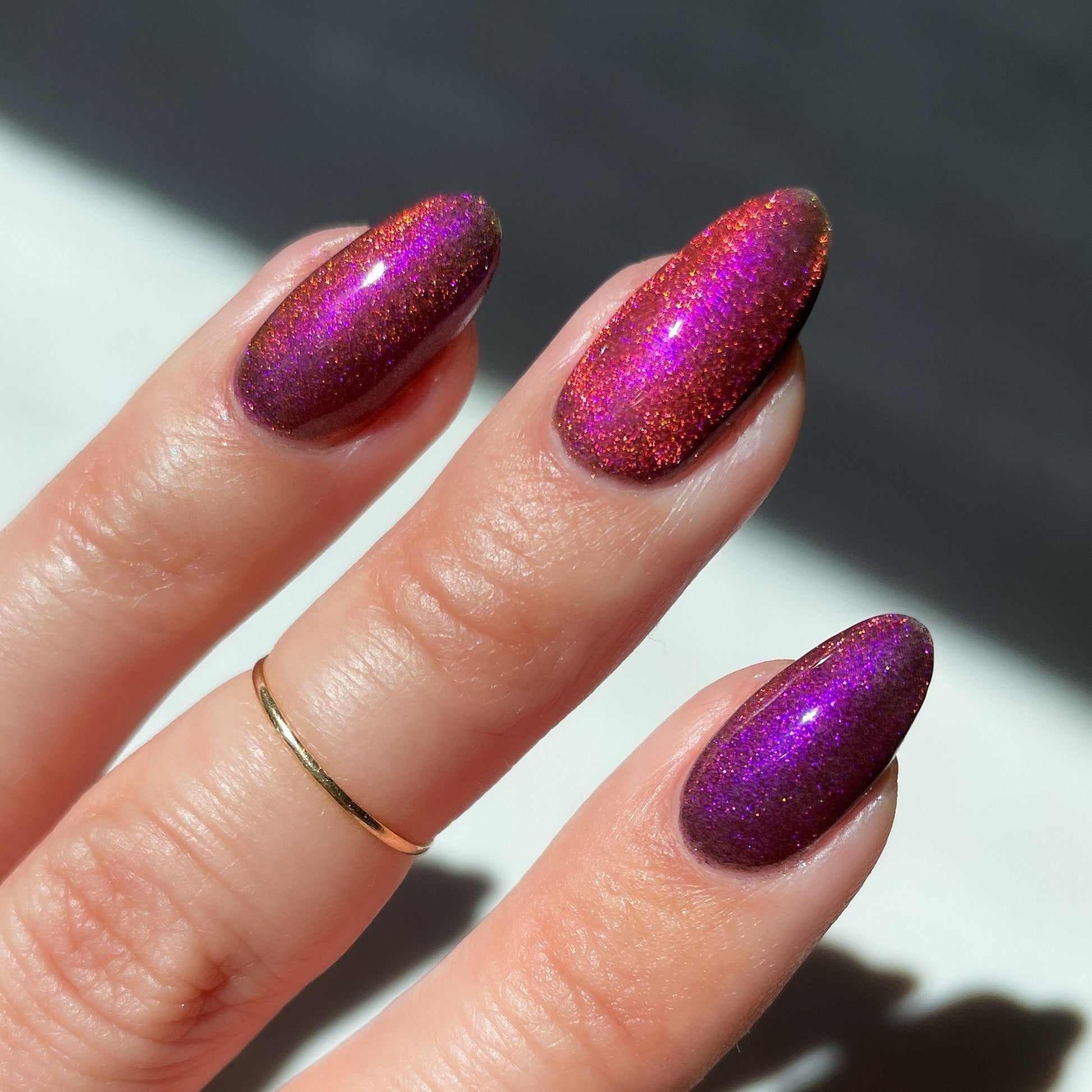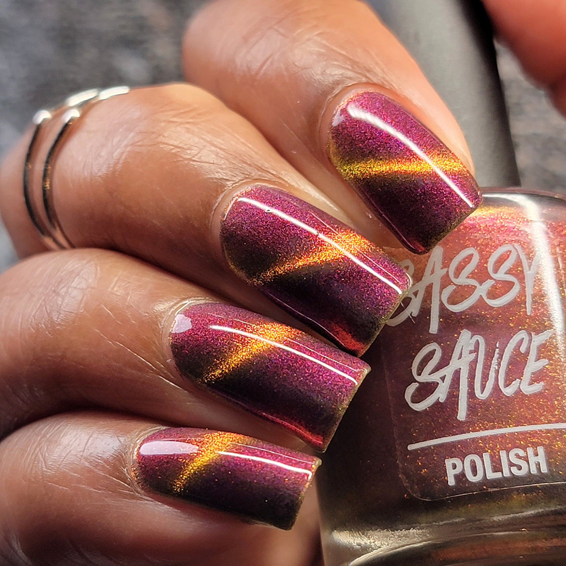 A multi chrome magnetic copper/pink/golden green, when magnetized pulls a golden/pink cat eye and leaves a purple background.