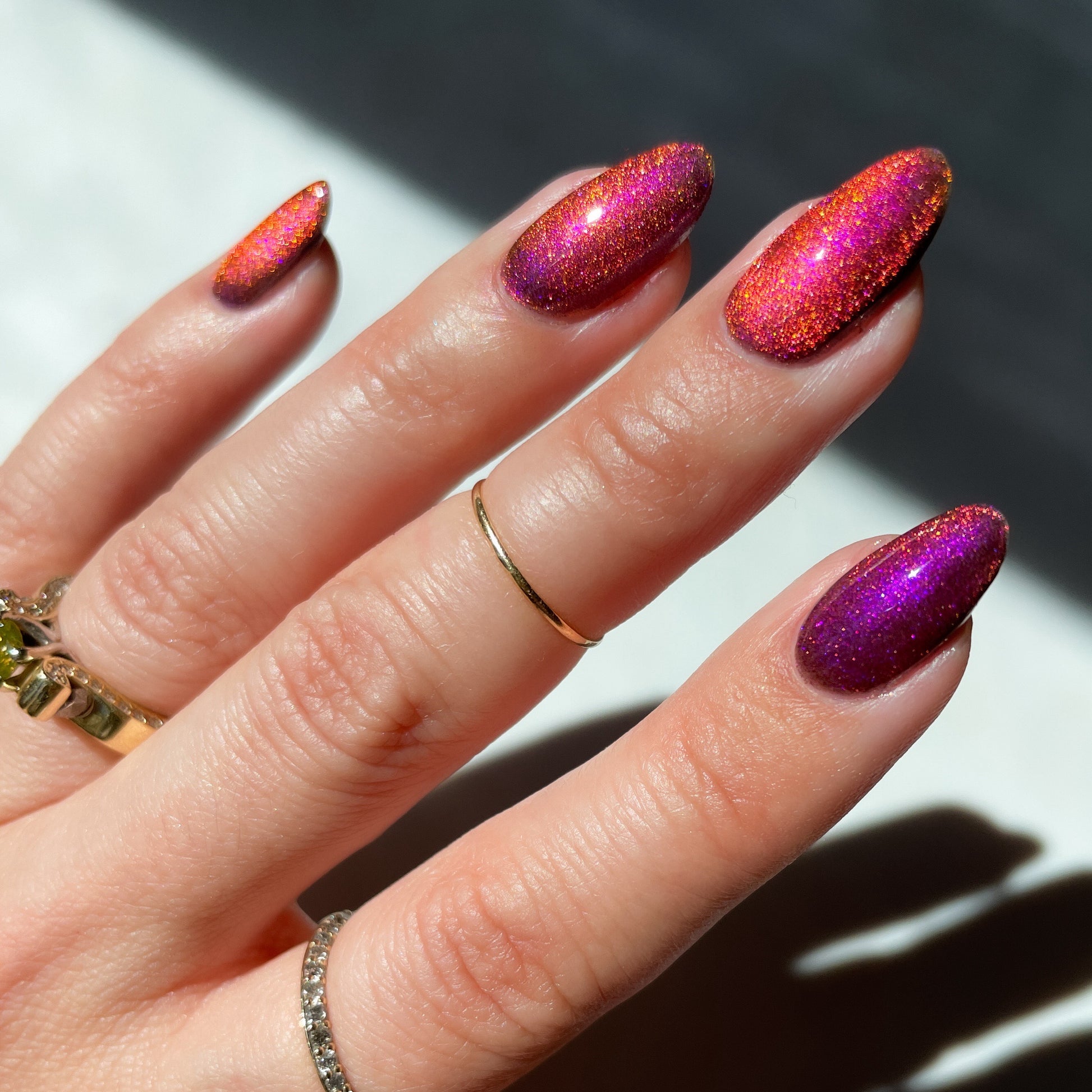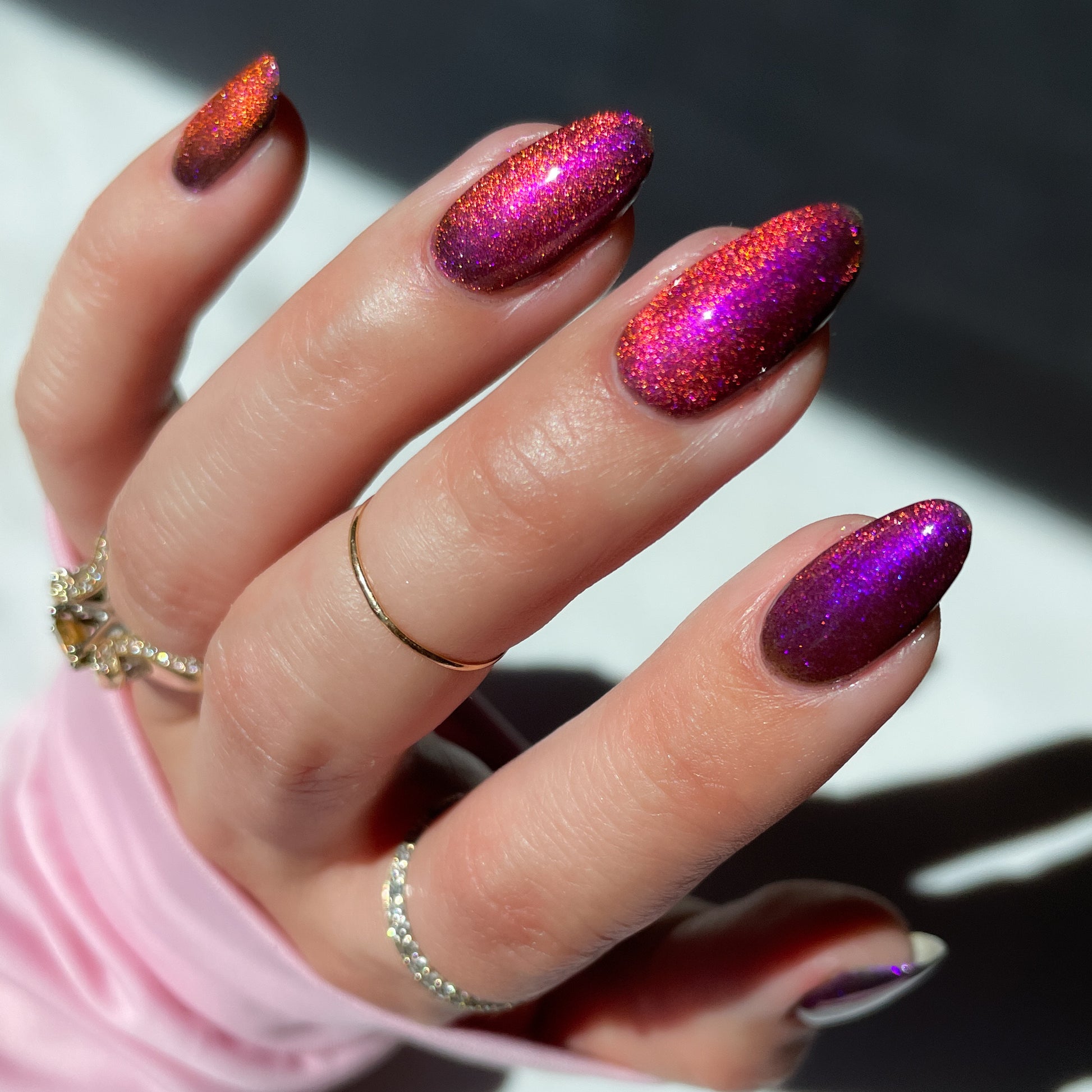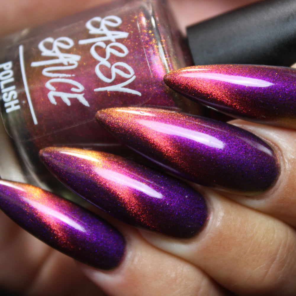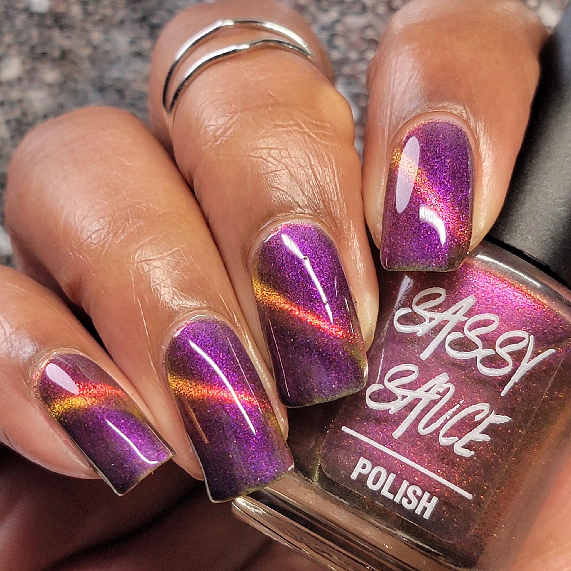A multi chrome magnetic copper/pink/golden green, when magnetized pulls a golden/pink cat eye and leaves a purple background.