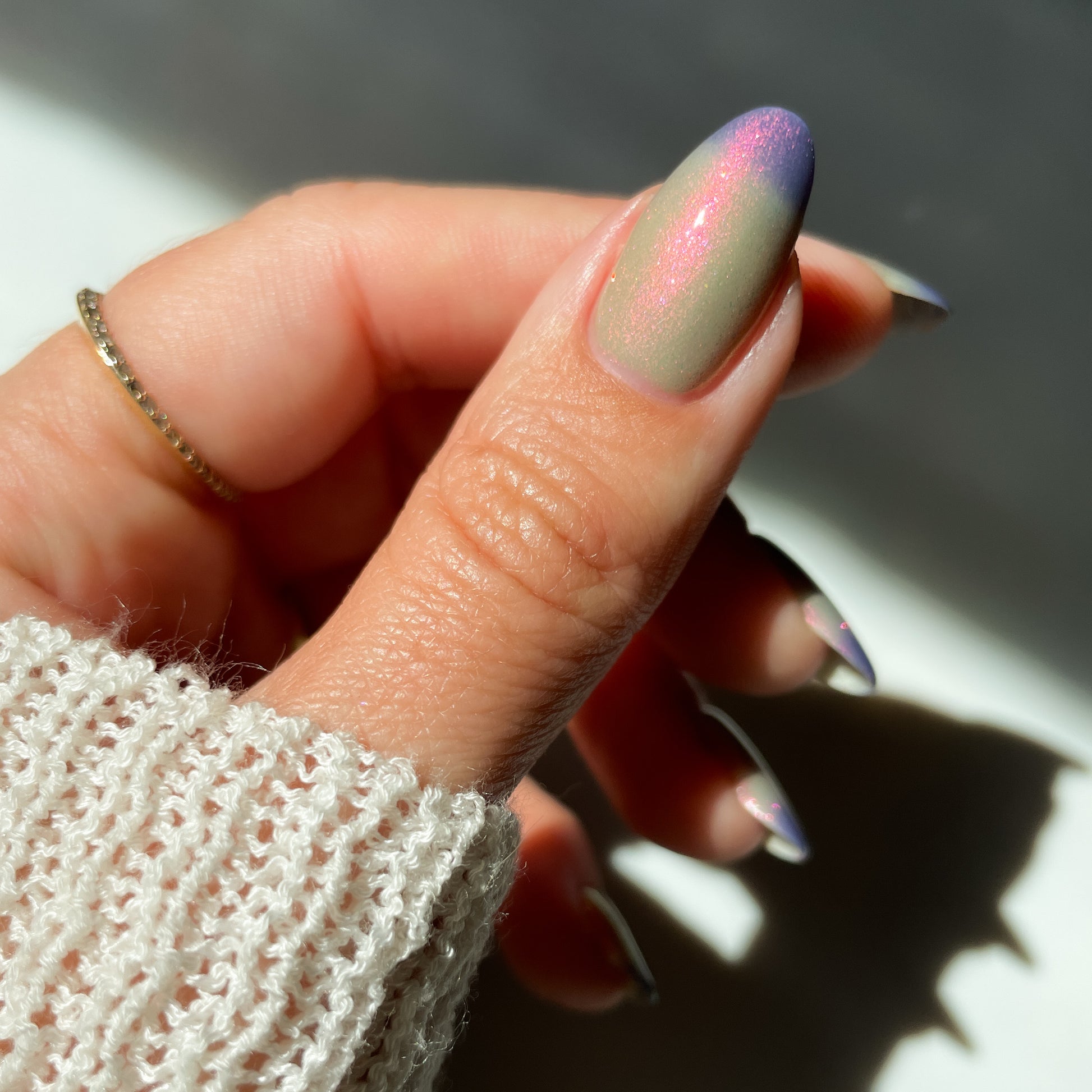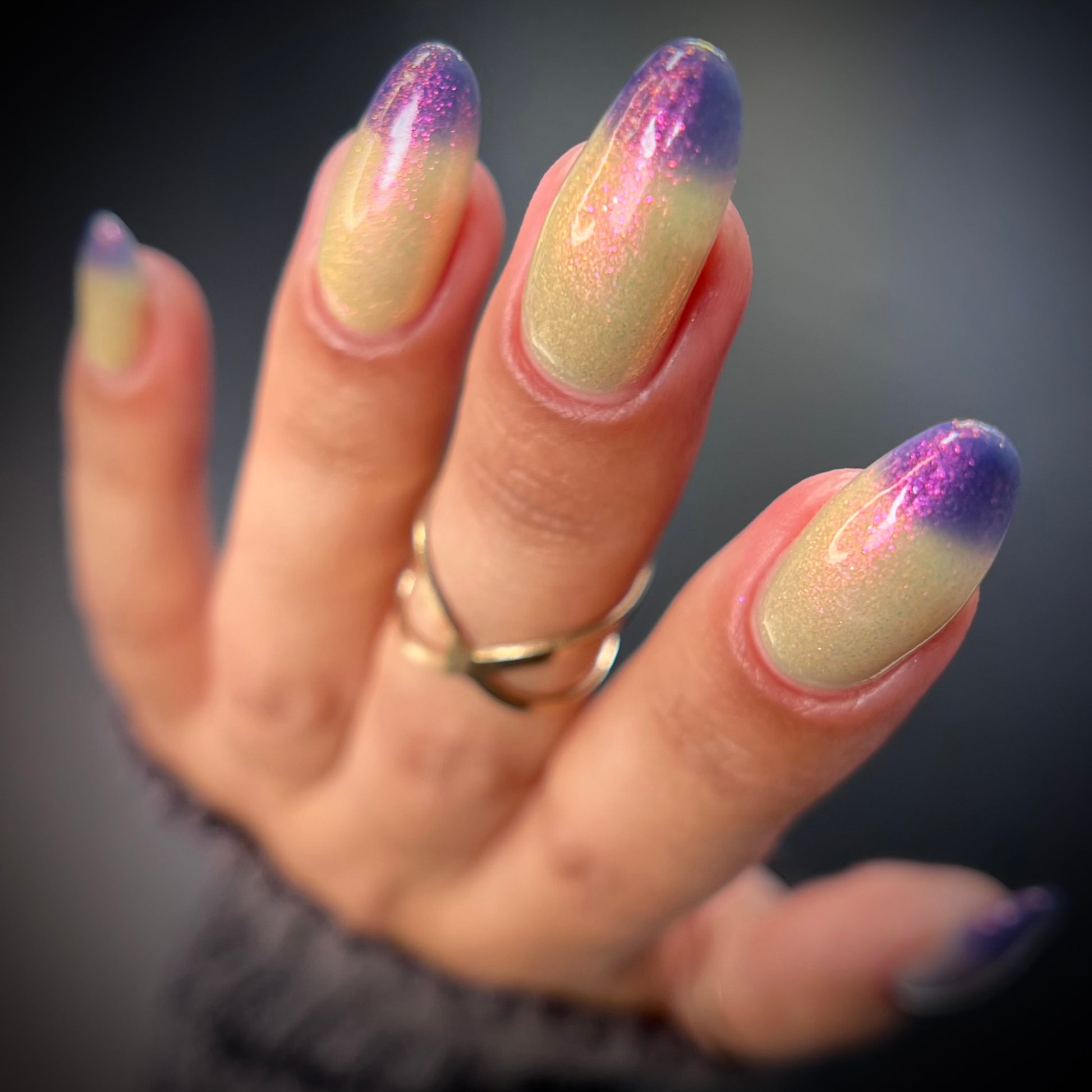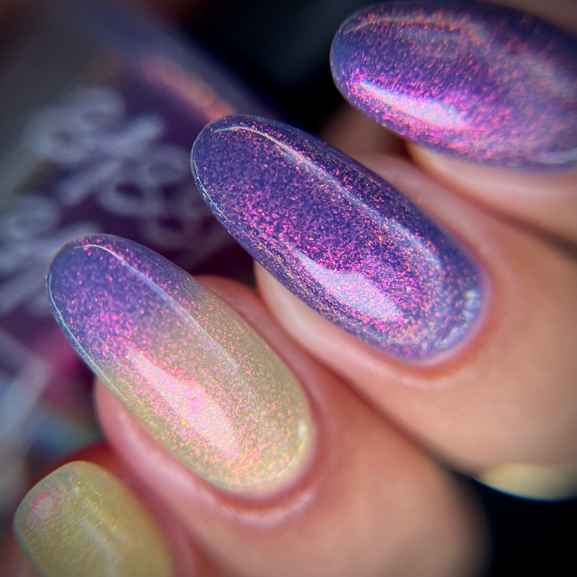 A smokey blue thermal (cold) with large particle purple/pink/green shimmer that warms to a pale blue. Named by Mary Sandberg