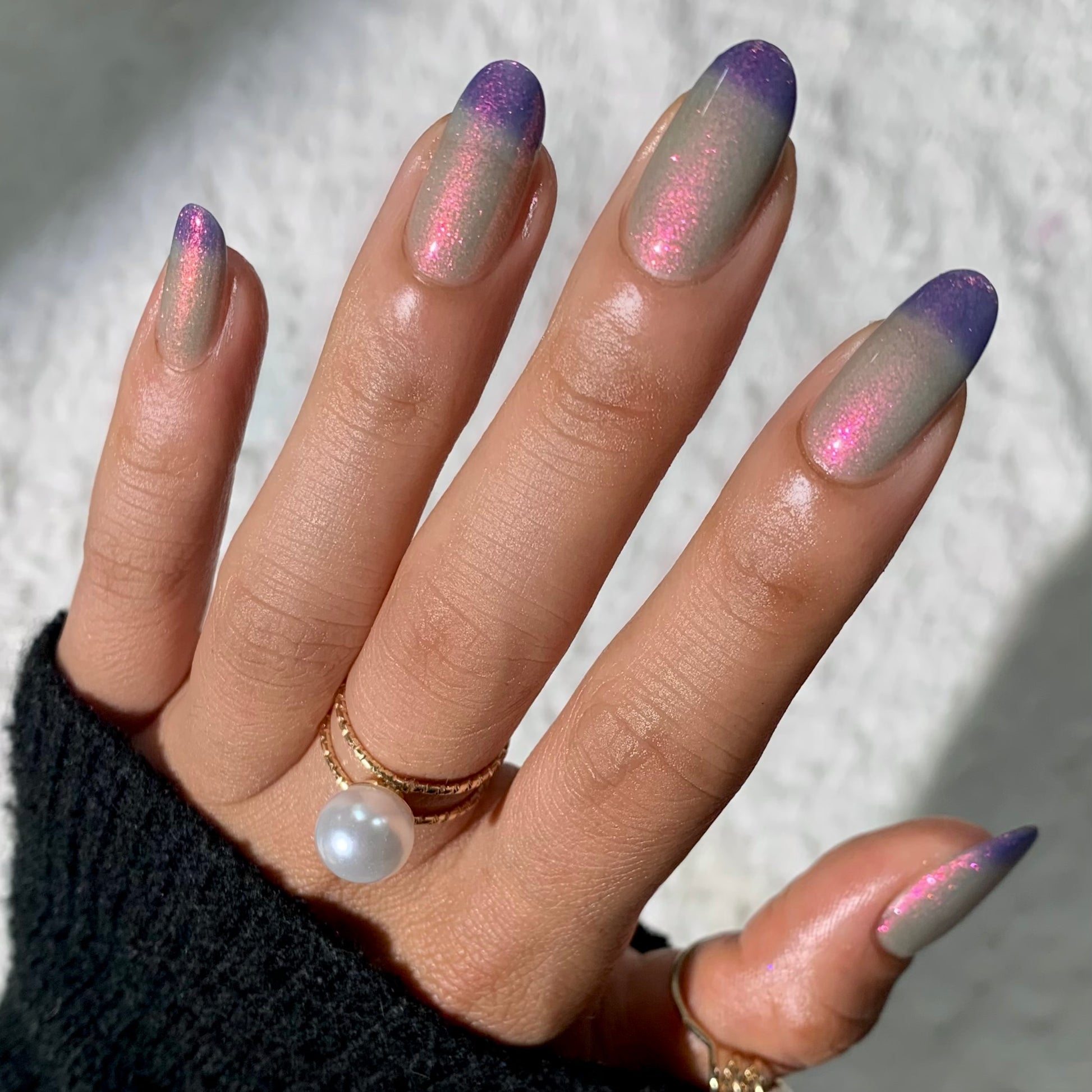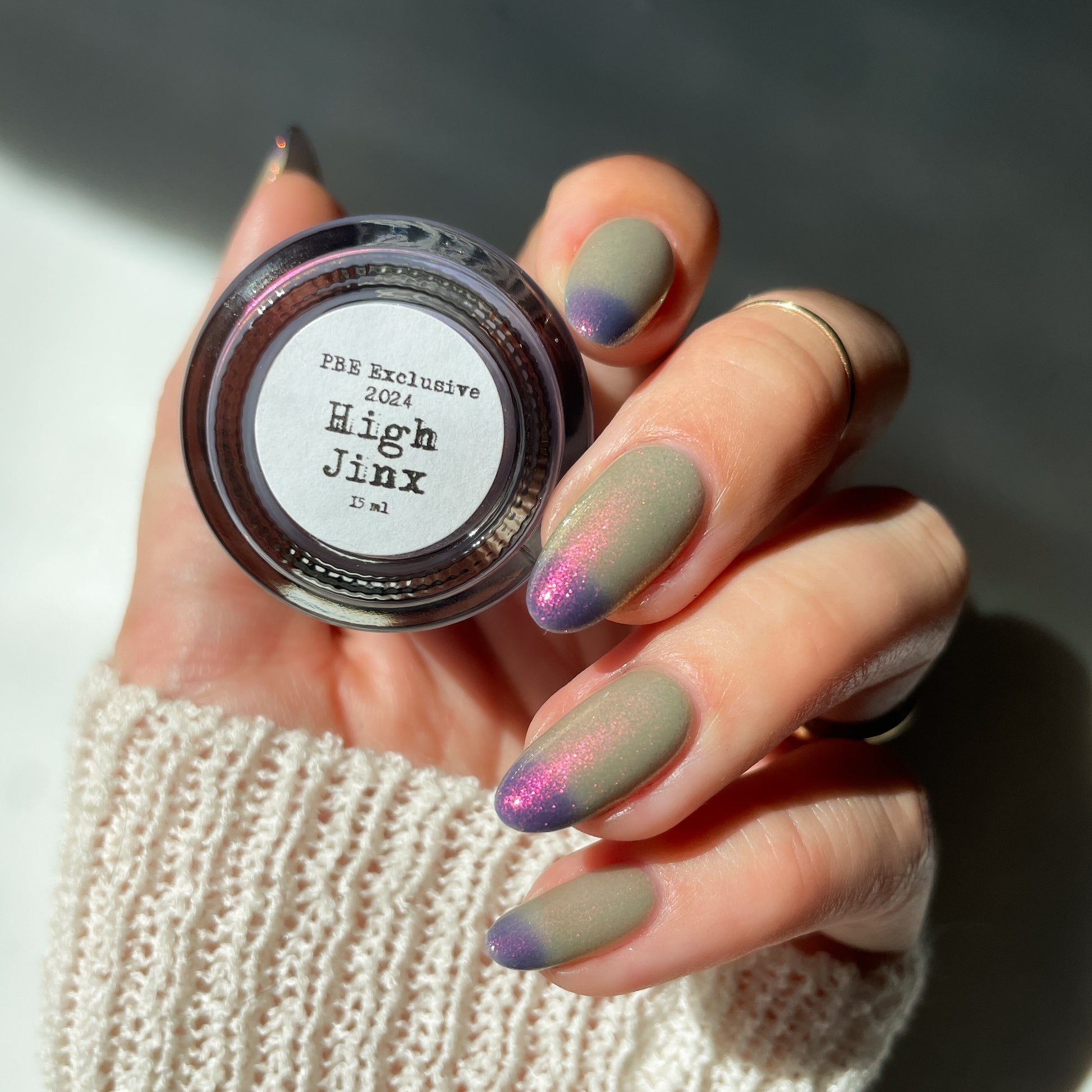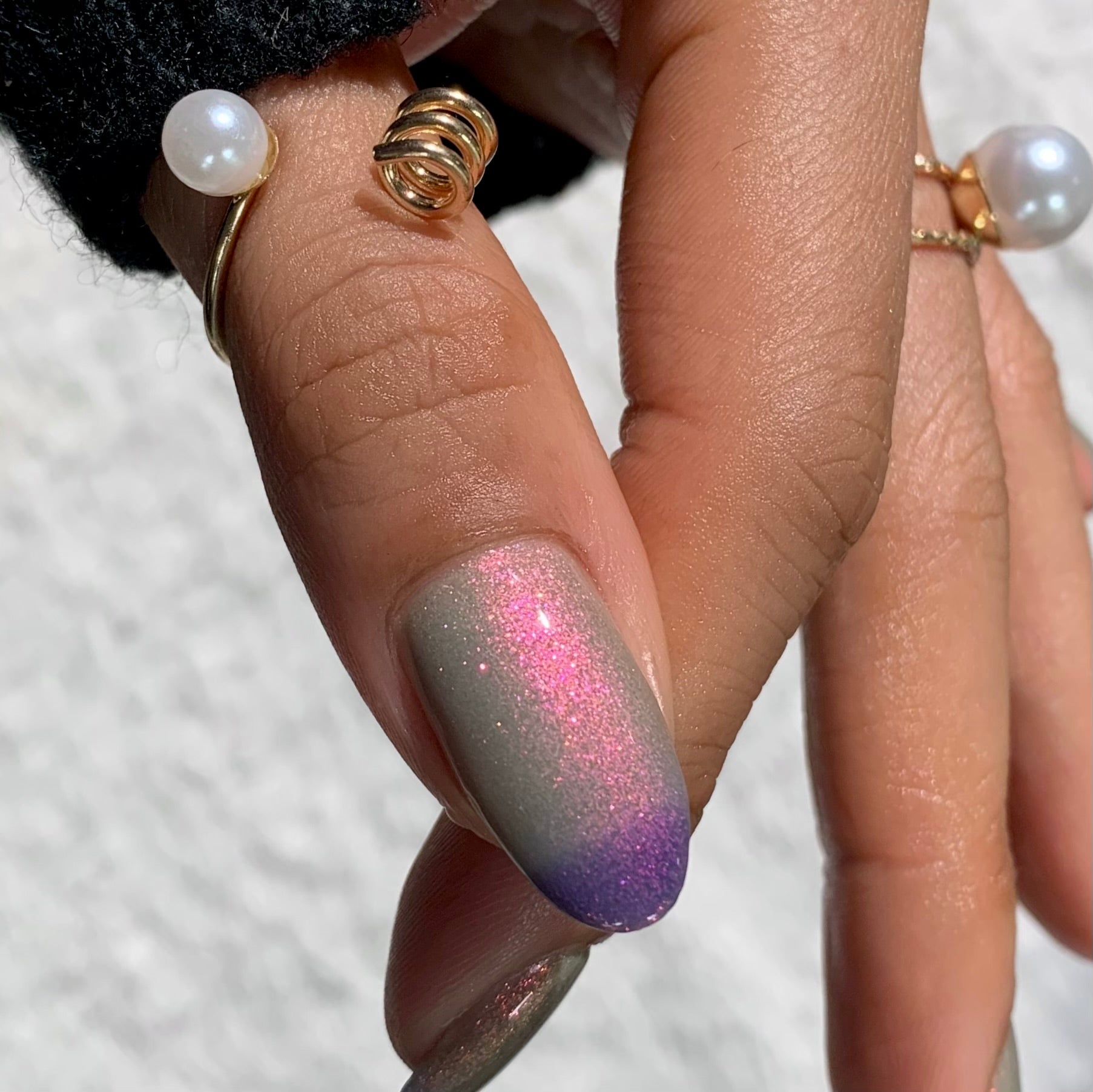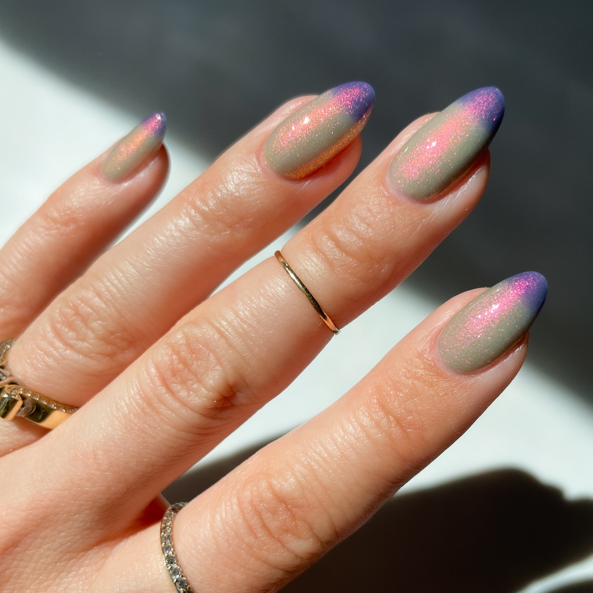 A smokey blue thermal (cold) with large particle purple/pink/green shimmer that warms to a pale blue. Named by Mary Sandberg