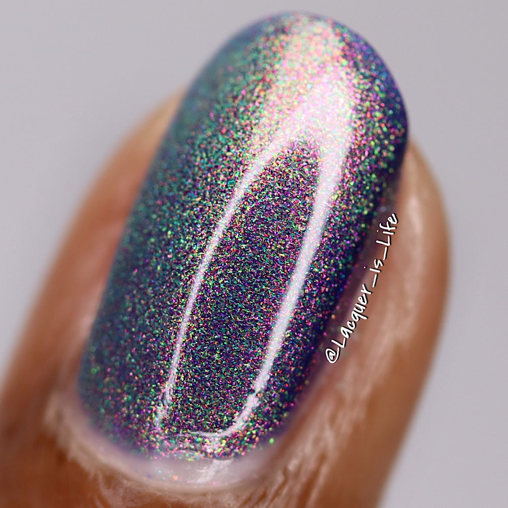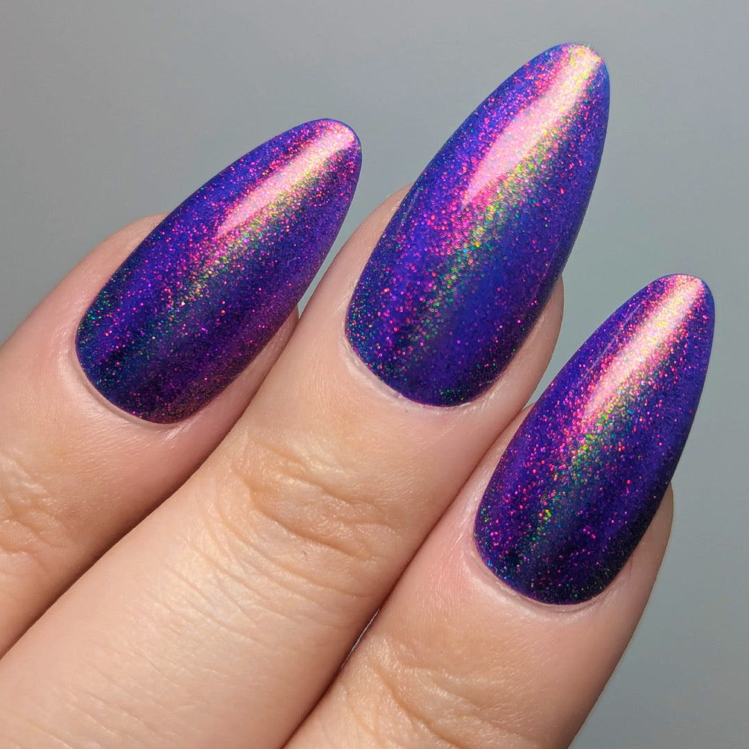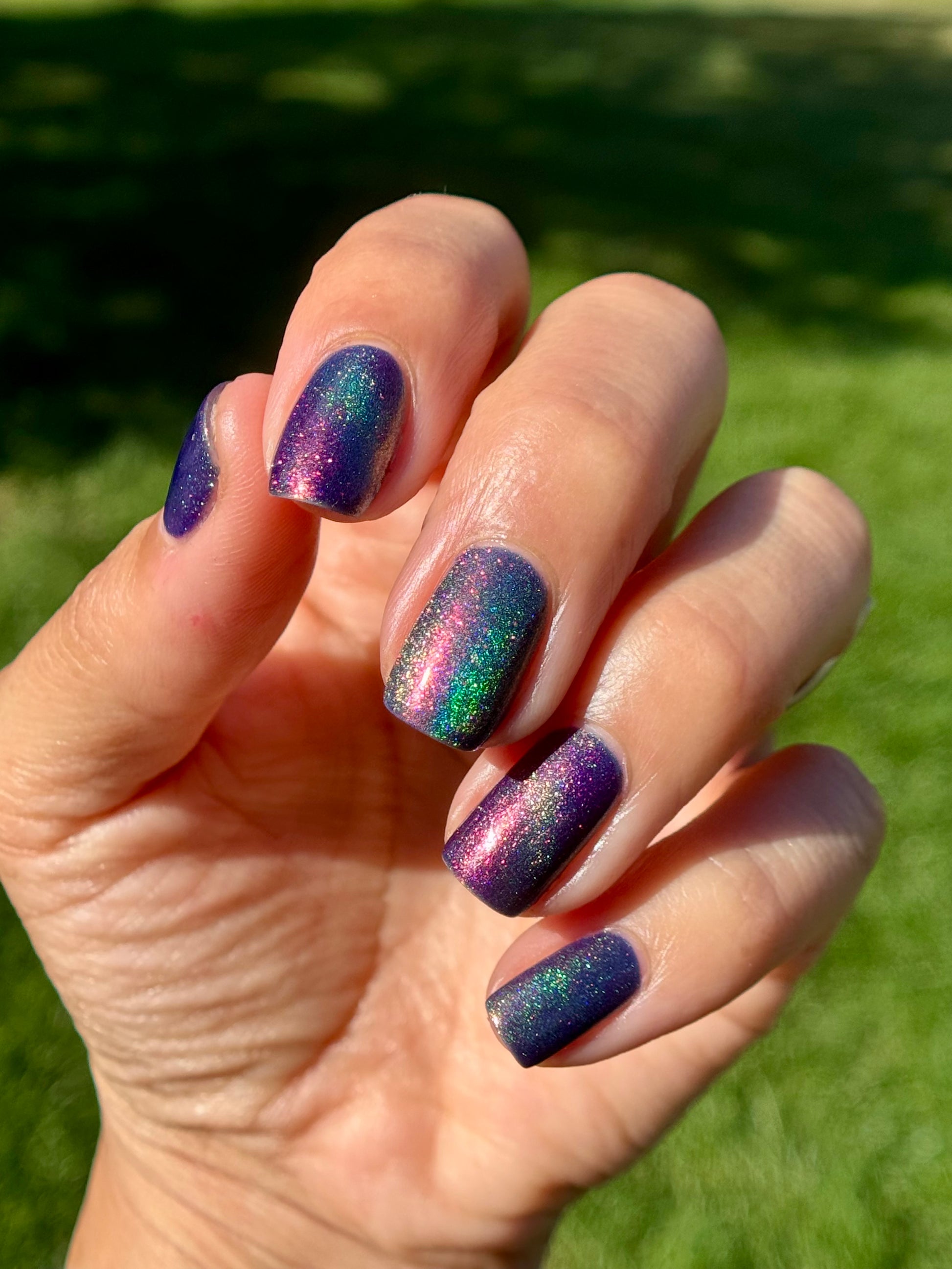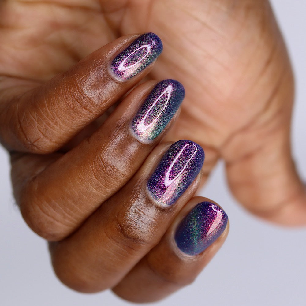 A violet base with sparkling ghostly green holo magnetic effect particle, when magnetized it leaves a coppery sparkle in the background. I love this with the velvet effect. It is not an in your face magnetic, however it does give a very unique effect. Named by Mary Sandberg.