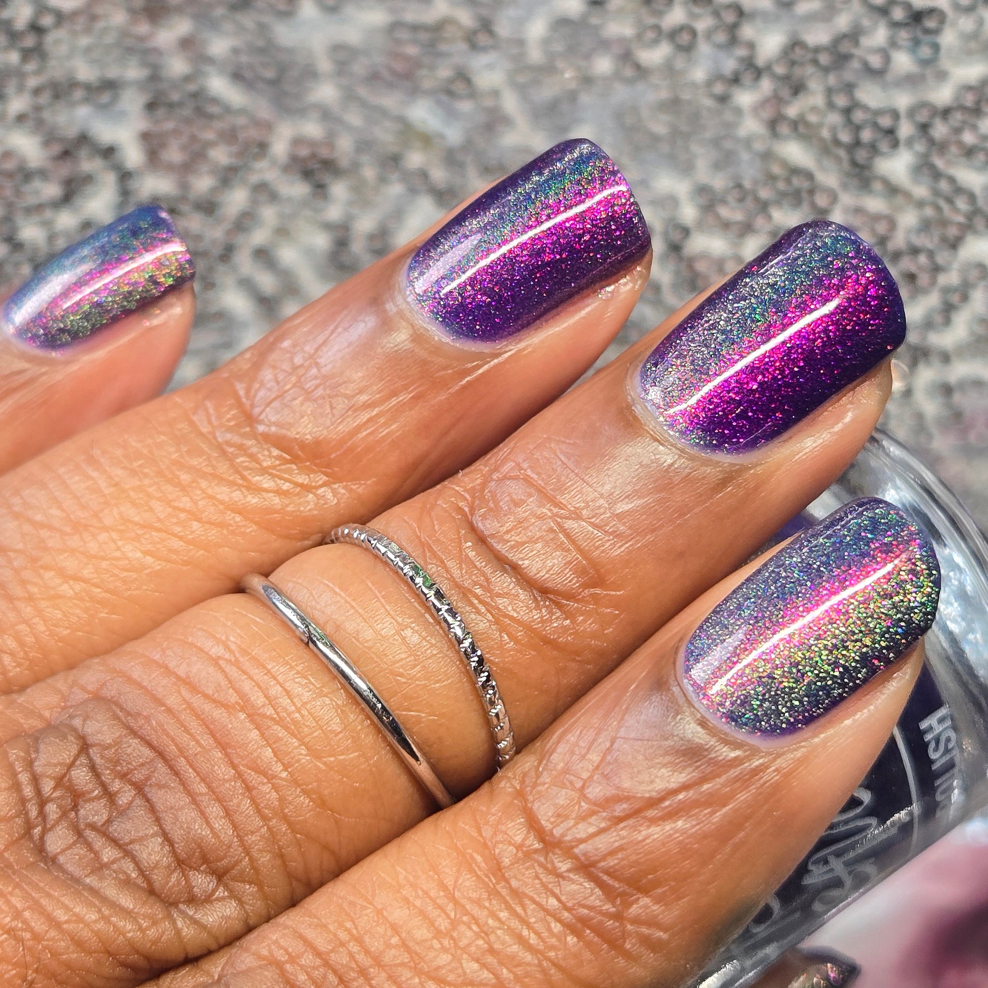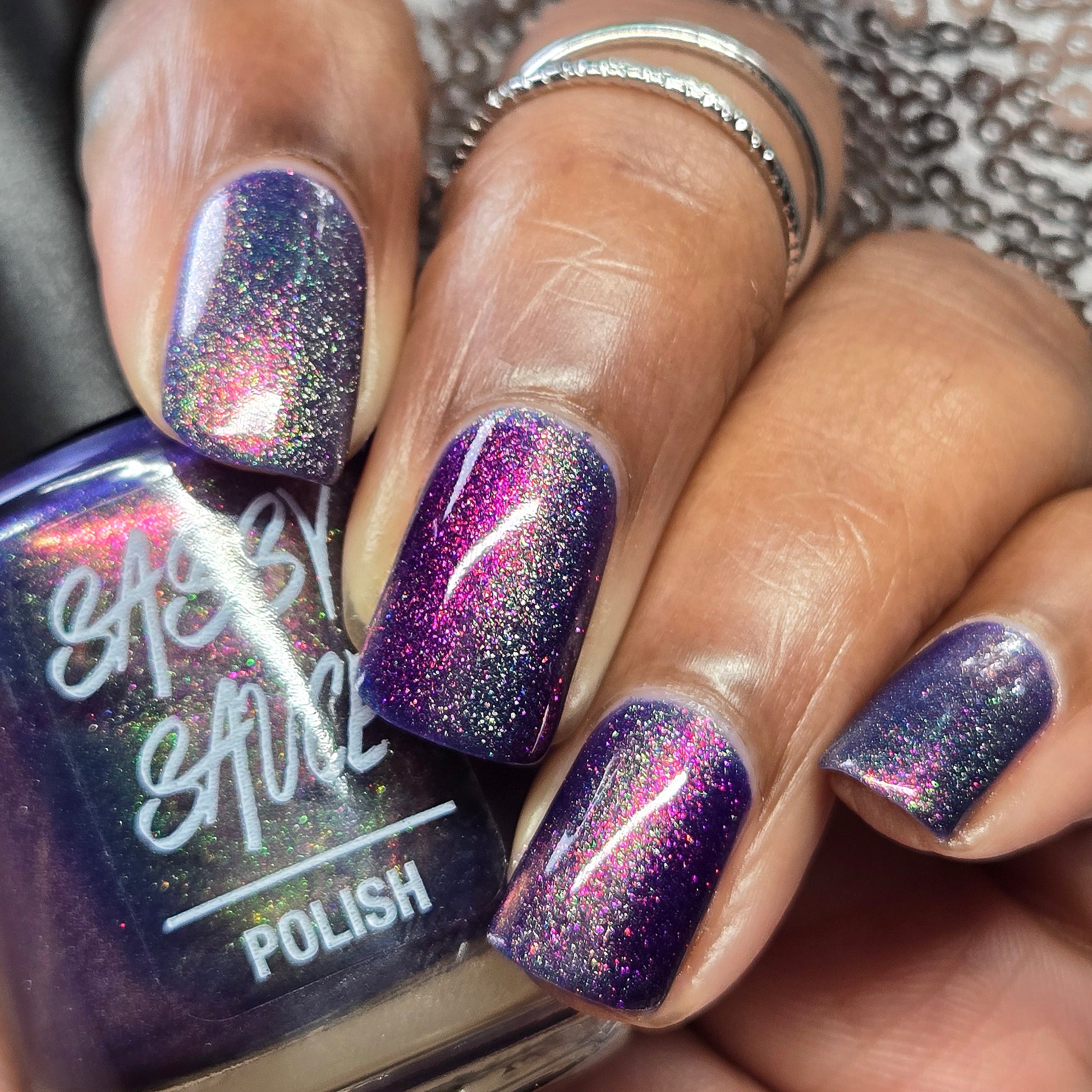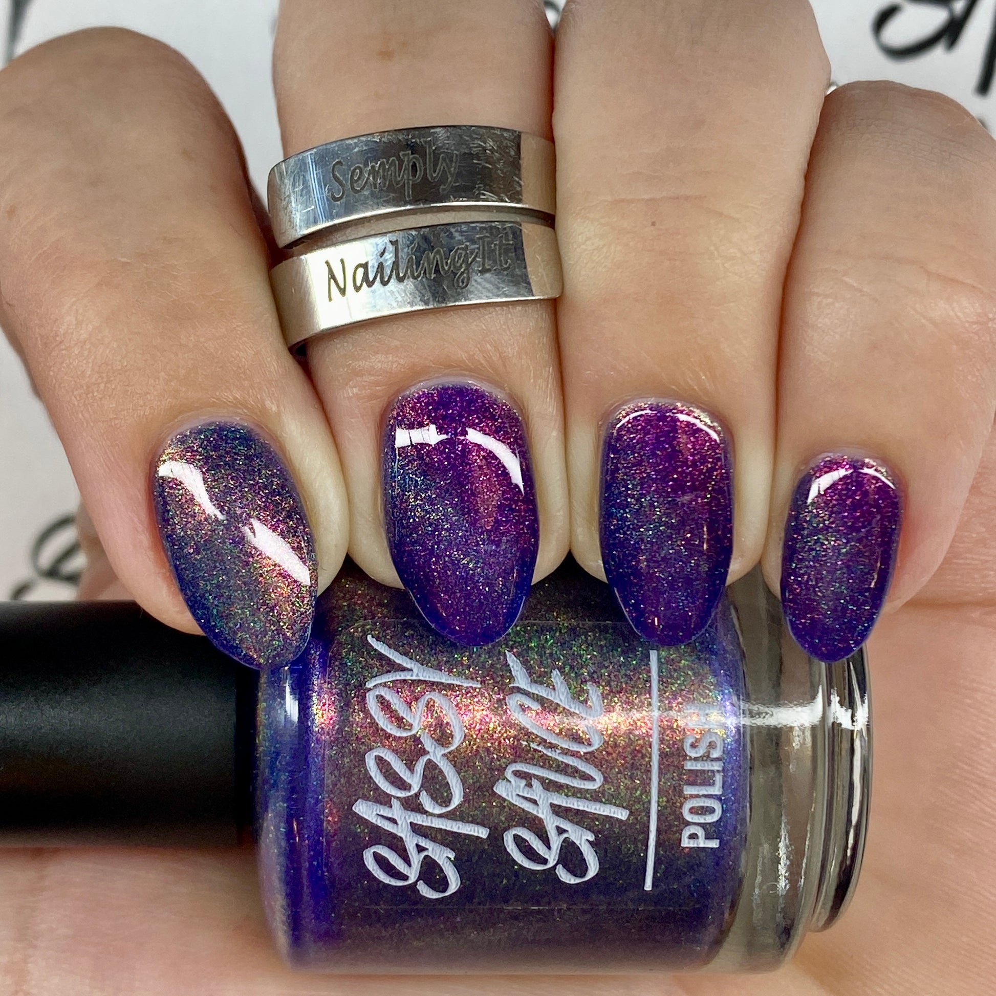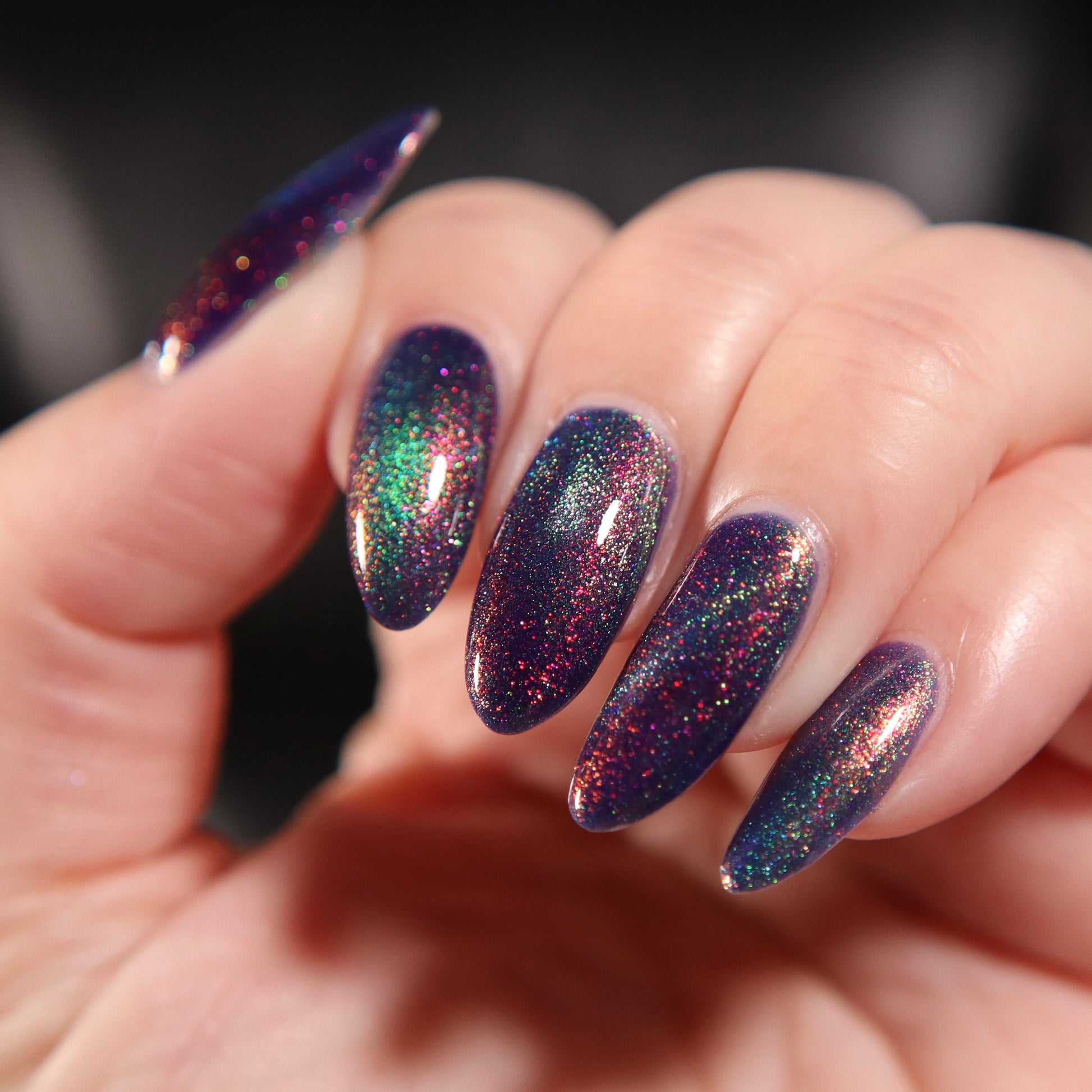 A violet base with sparkling ghostly green holo magnetic effect particle, when magnetized it leaves a coppery sparkle in the background. I love this with the velvet effect. It is not an in your face magnetic, however it does give a very unique effect. Named by Mary Sandberg.