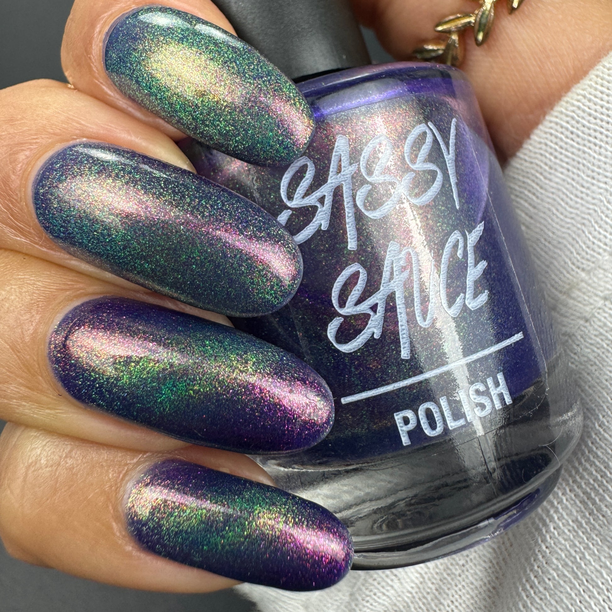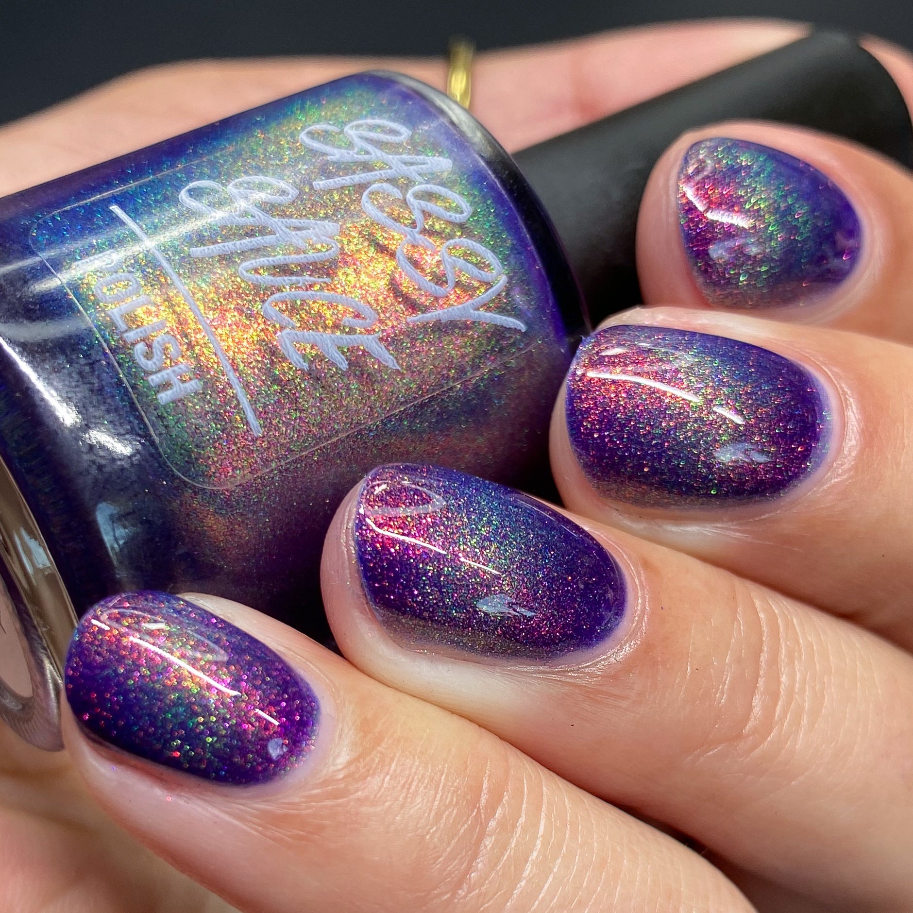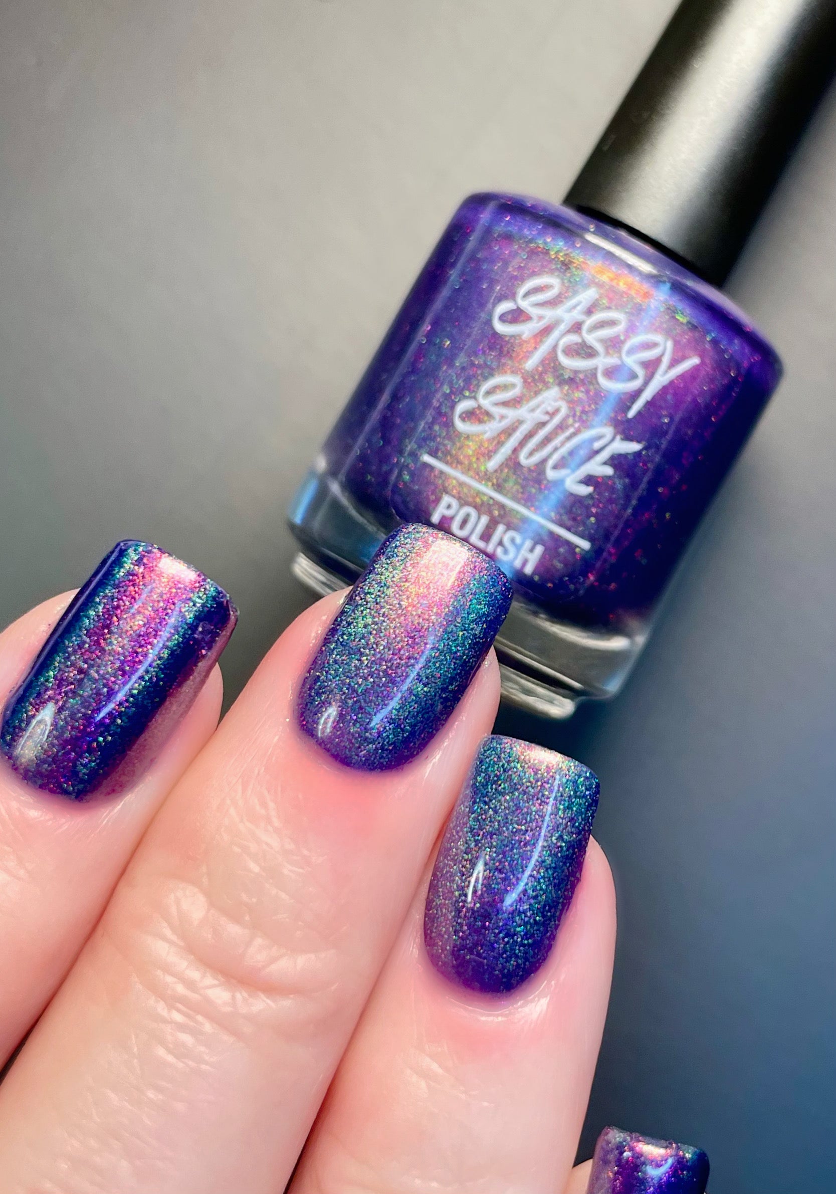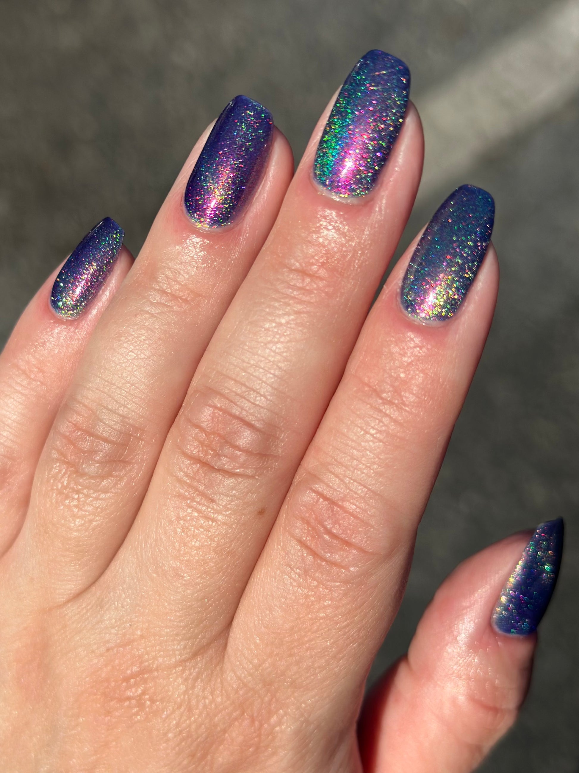 A violet base with sparkling ghostly green holo magnetic effect particle, when magnetized it leaves a coppery sparkle in the background. I love this with the velvet effect. It is not an in your face magnetic, however it does give a very unique effect. Named by Mary Sandberg.