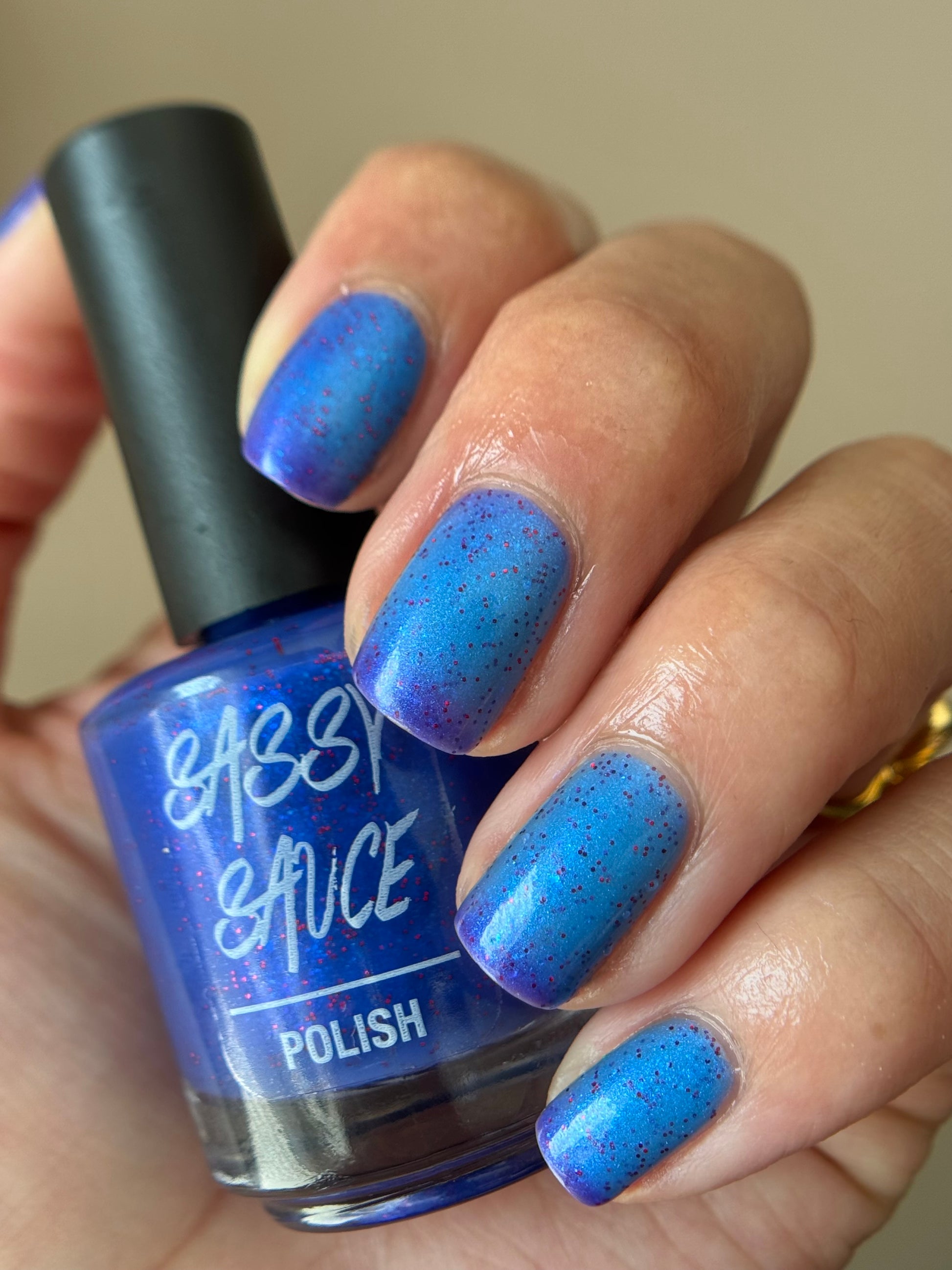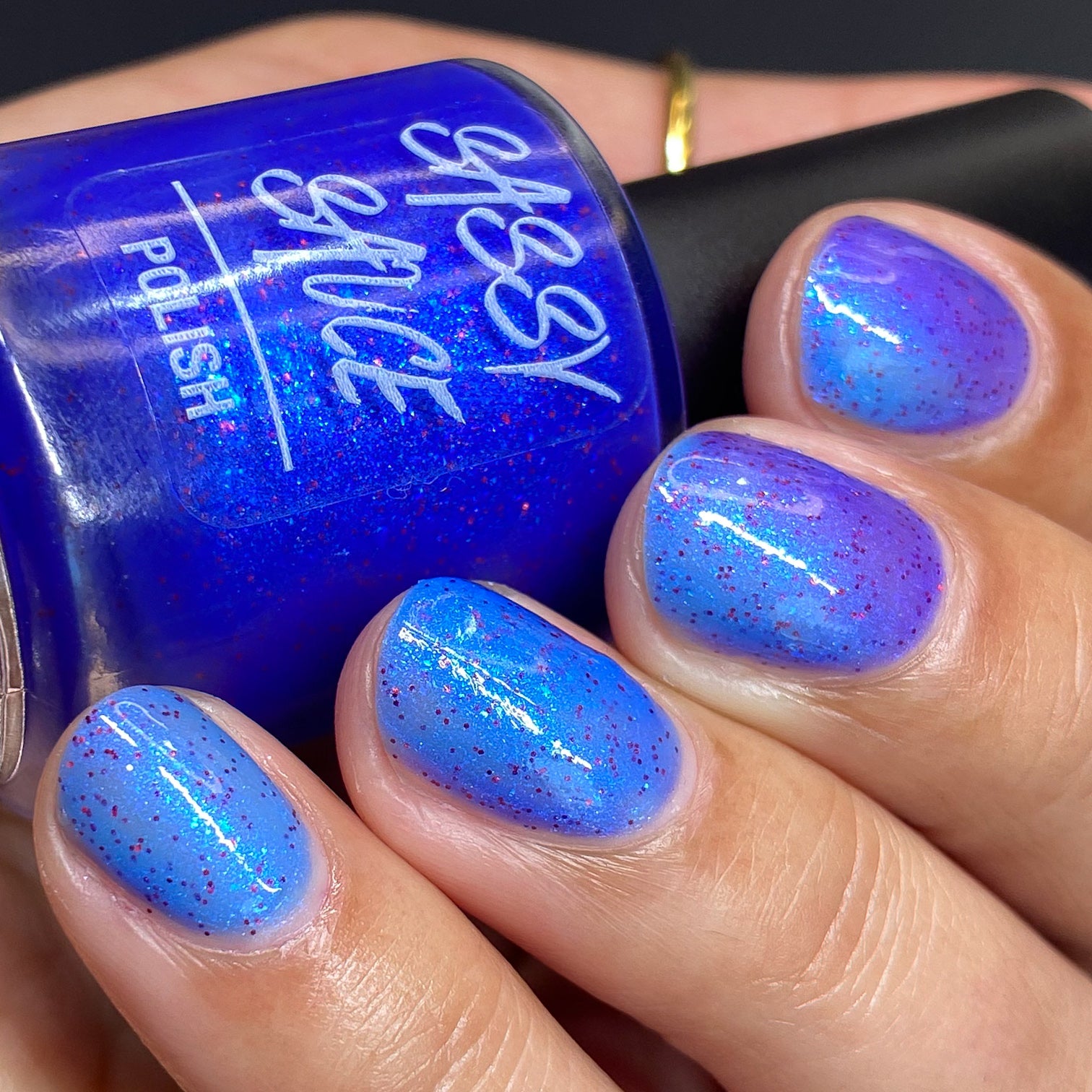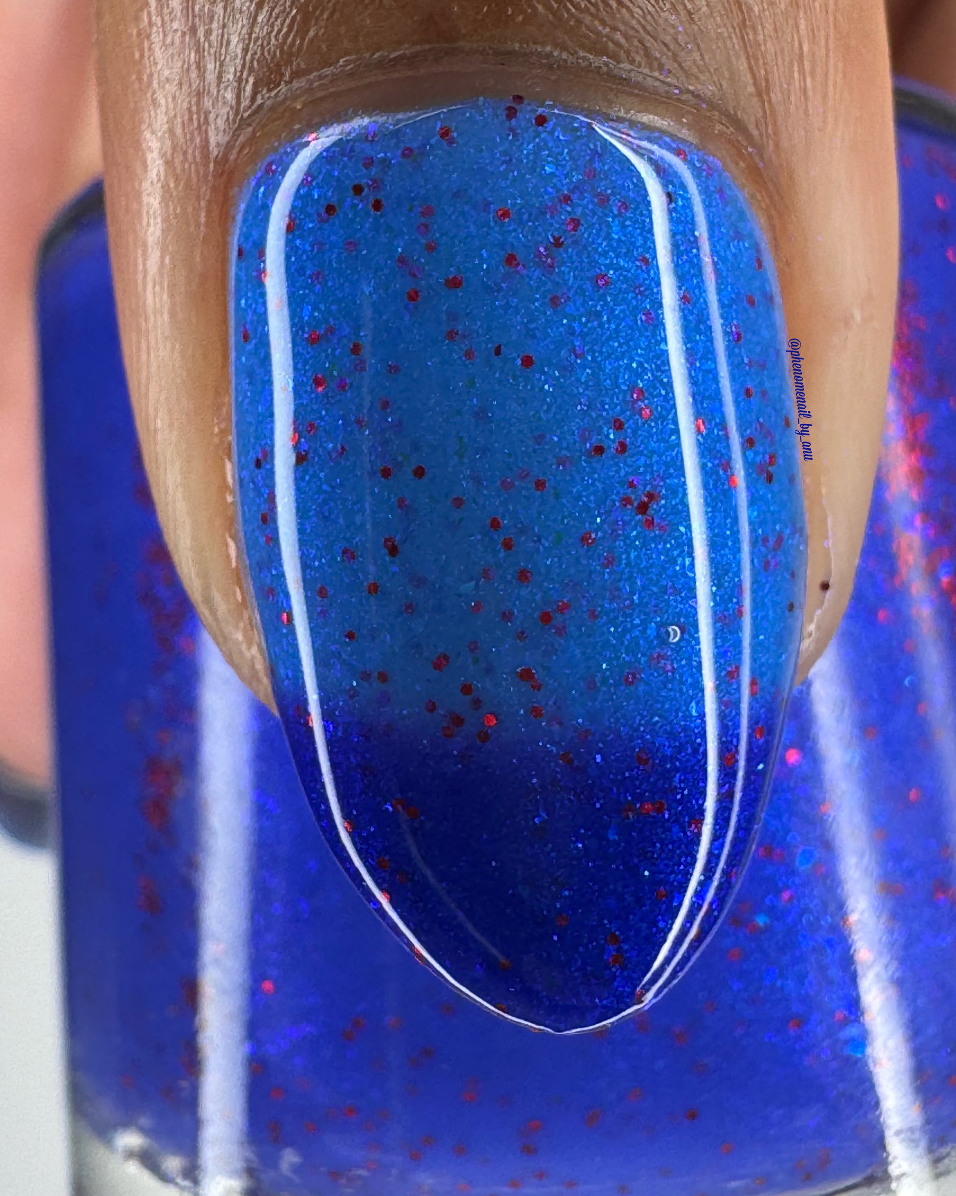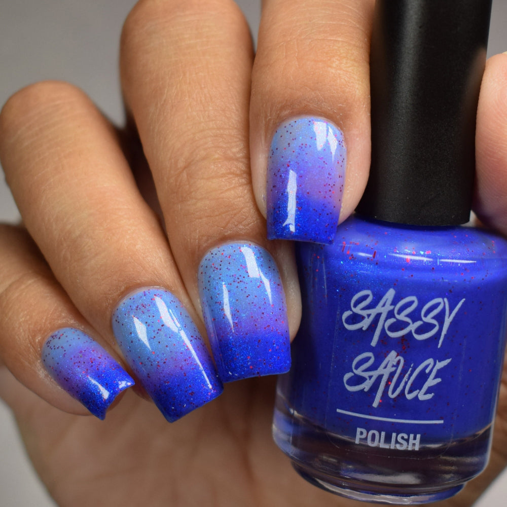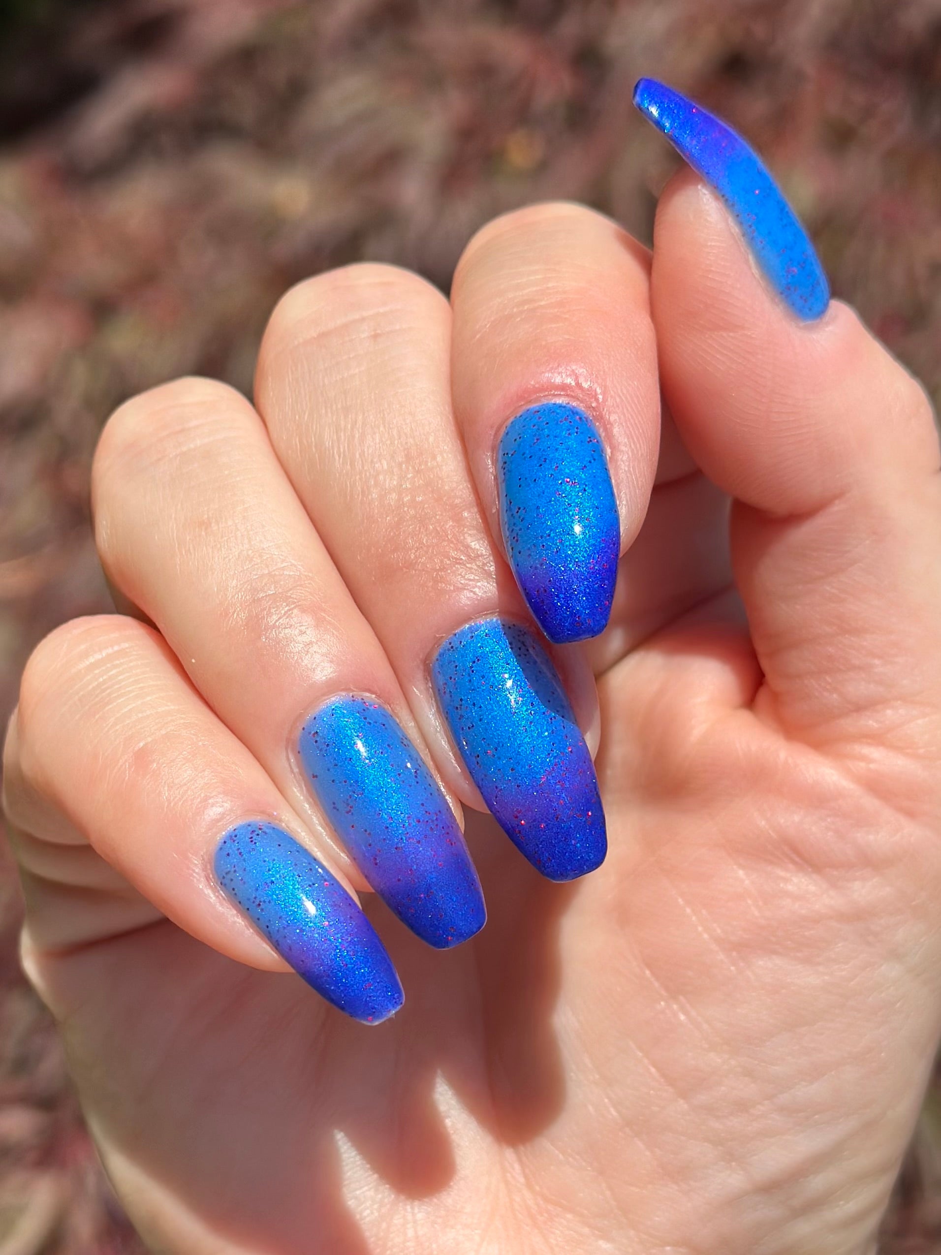 A sapphire (cold) to light blue (warm) thermal with a glowey blue shimmer and red micro glitter. This one was a request from Jessica Reed-Schmid to match a pair of her favorite shoes. Hunt her down at expo, sha may have the shoes on and will probably be wearing the polish. She is a super human with a heart of gold!!!