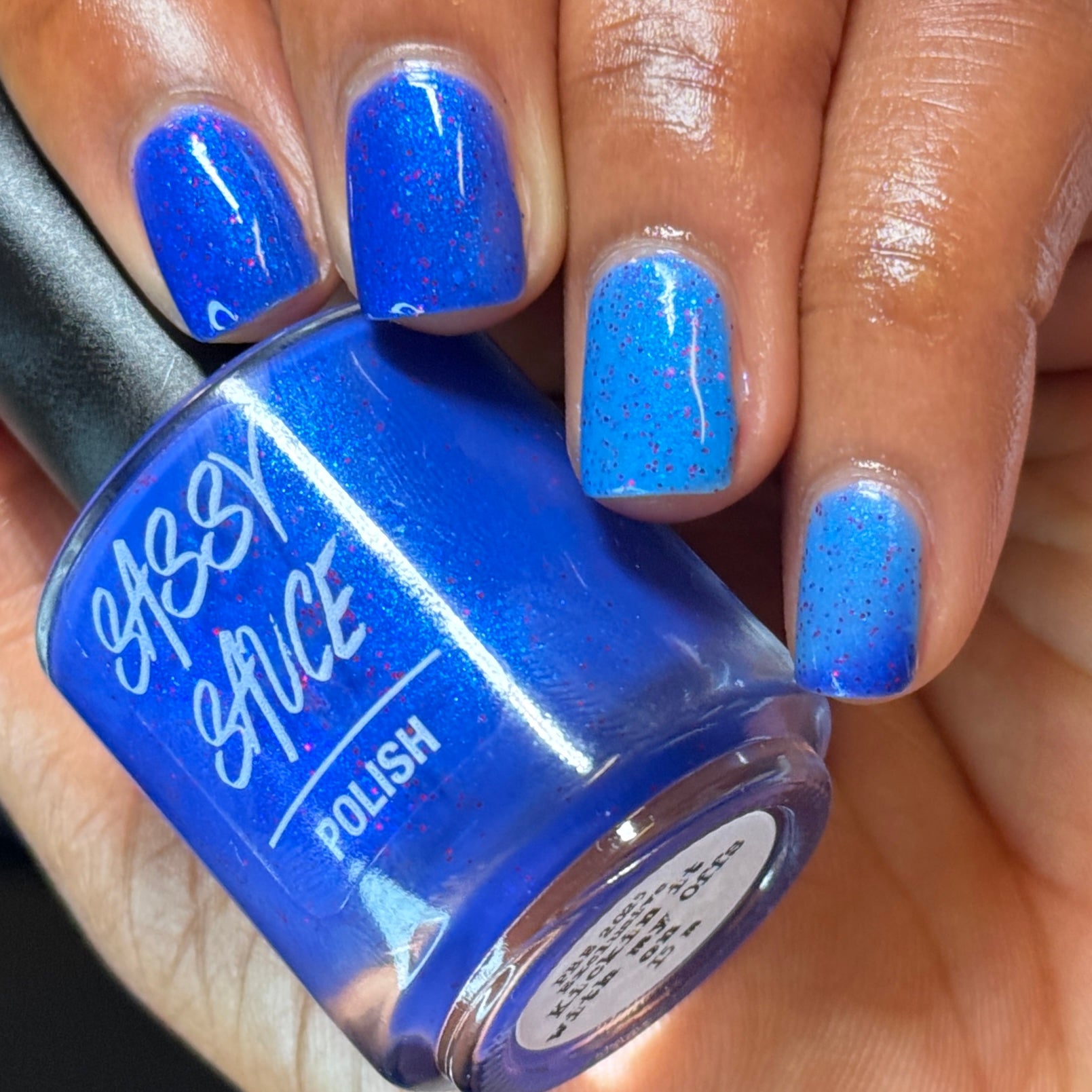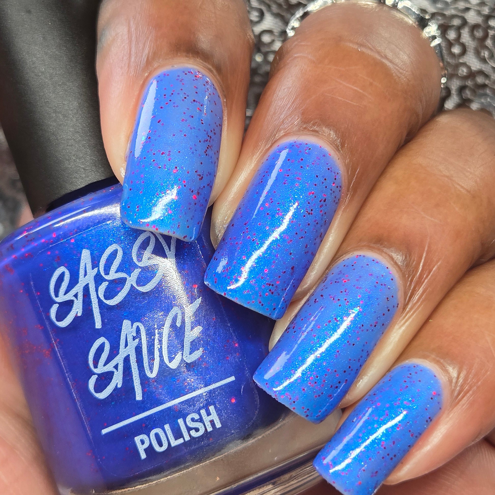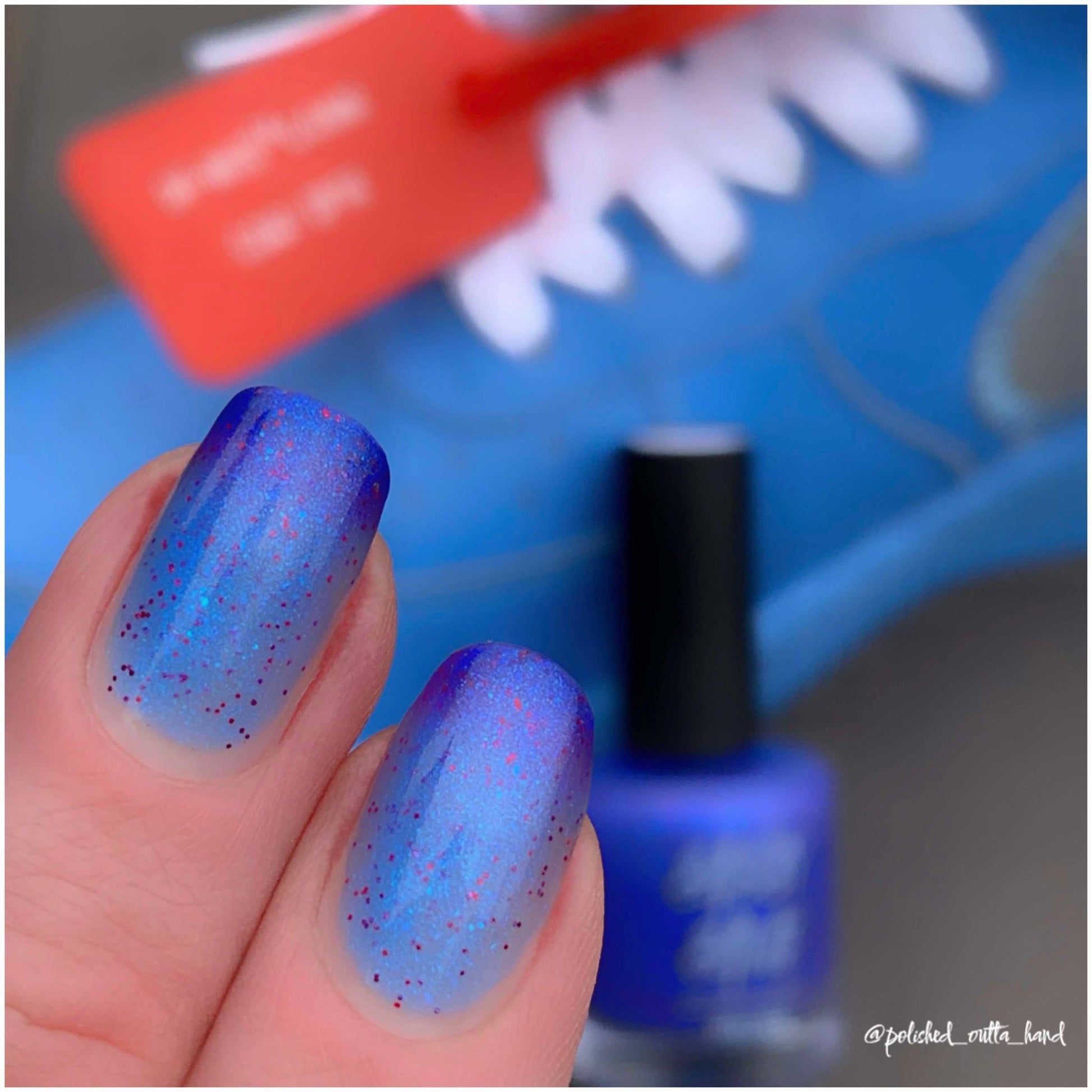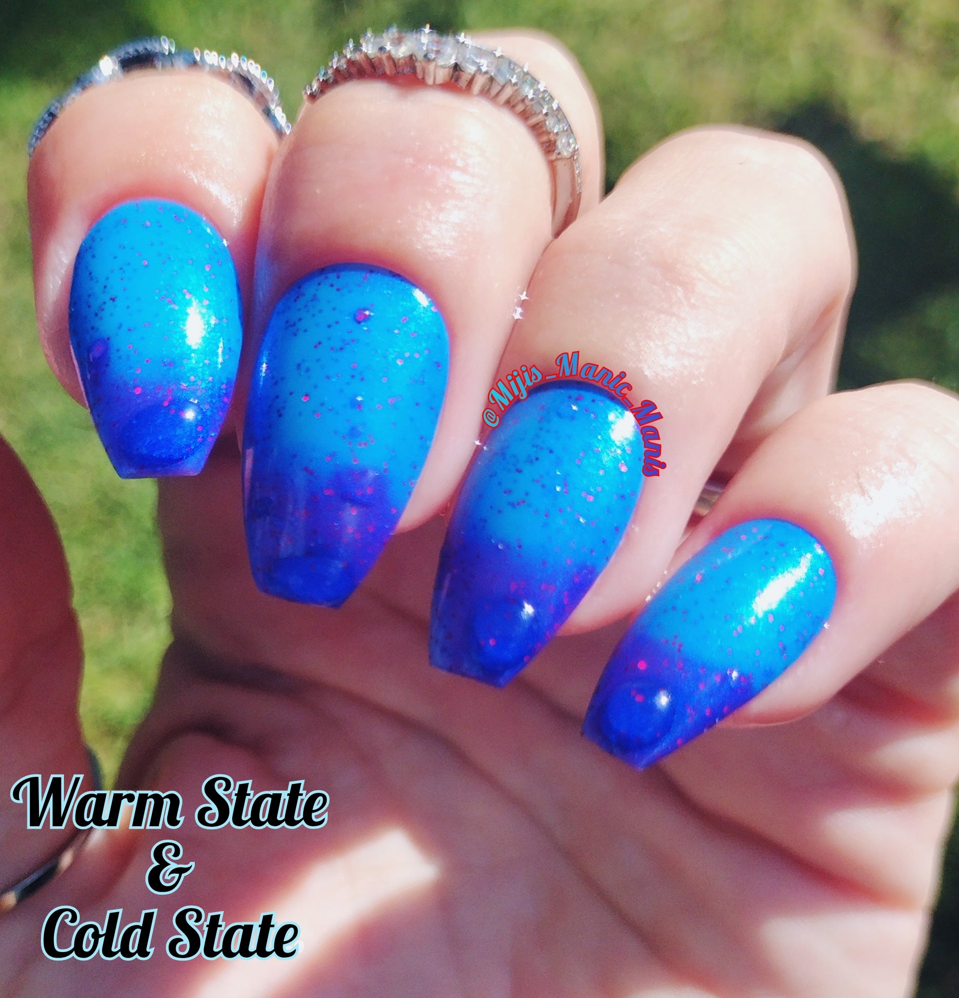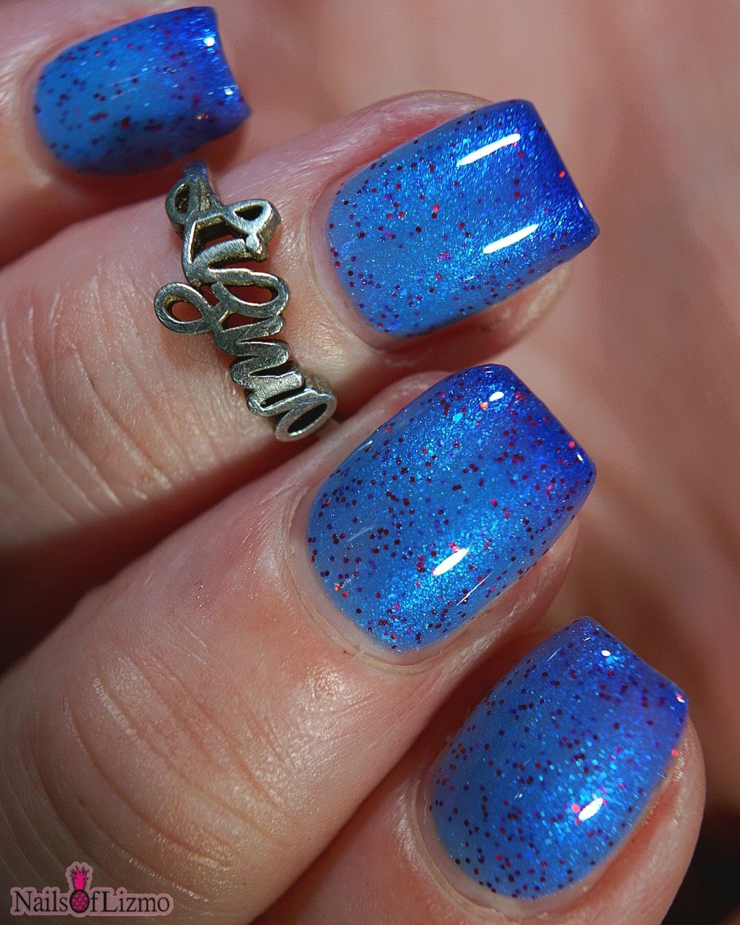 A sapphire (cold) to light blue (warm) thermal with a glowey blue shimmer and red micro glitter. This one was a request from Jessica Reed-Schmid to match a pair of her favorite shoes. Hunt her down at expo, sha may have the shoes on and will probably be wearing the polish. She is a super human with a heart of gold!!!
