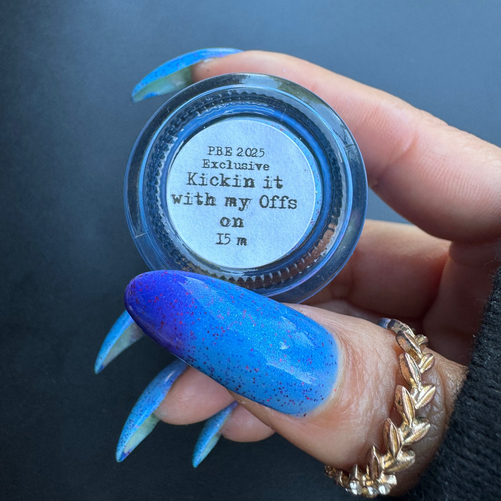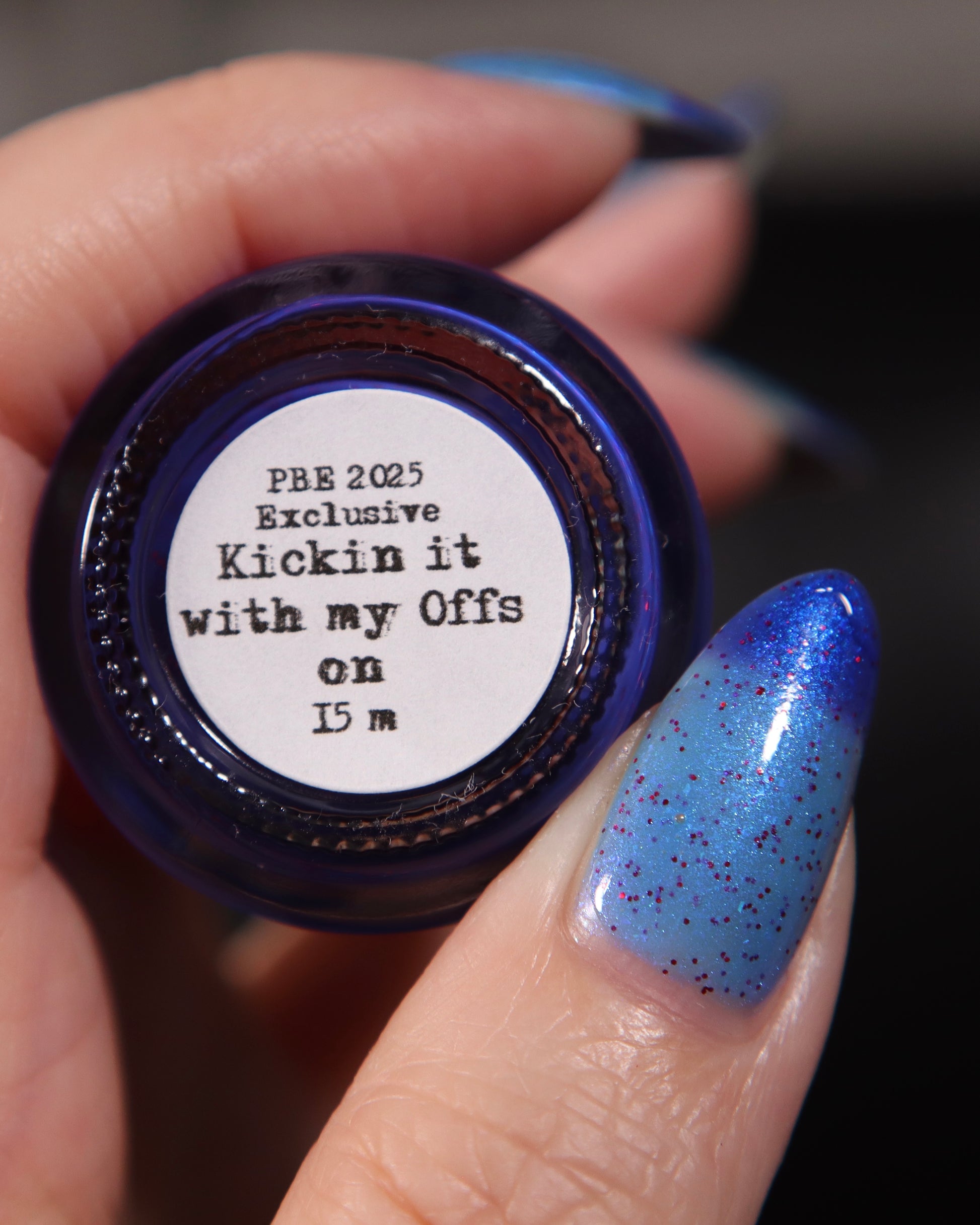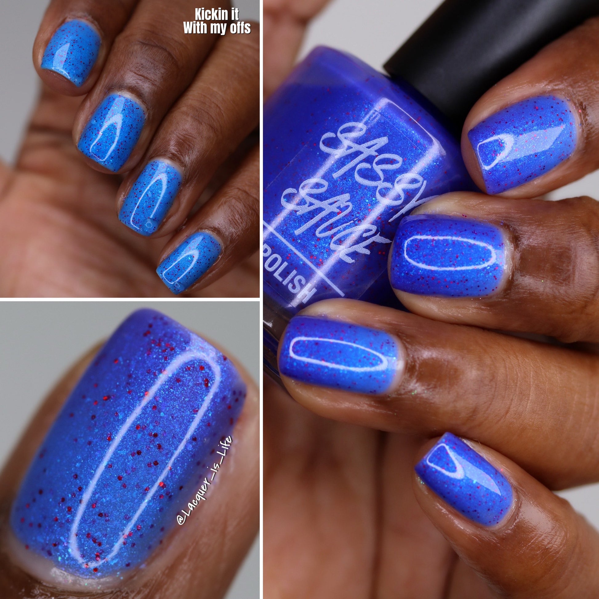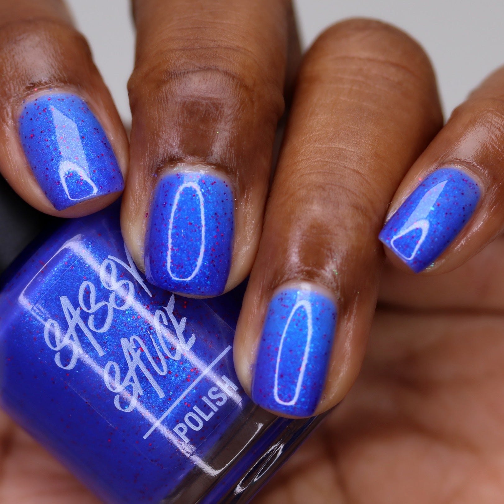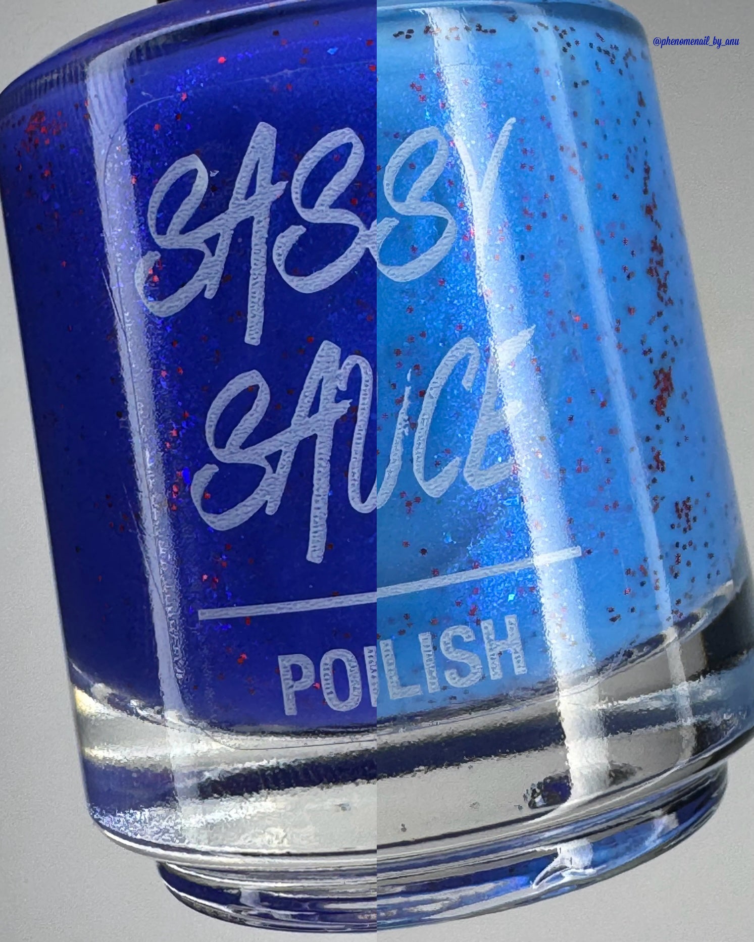 A sapphire (cold) to light blue (warm) thermal with a glowey blue shimmer and red micro glitter. This one was a request from Jessica Reed-Schmid to match a pair of her favorite shoes. Hunt her down at expo, sha may have the shoes on and will probably be wearing the polish. She is a super human with a heart of gold!!!
