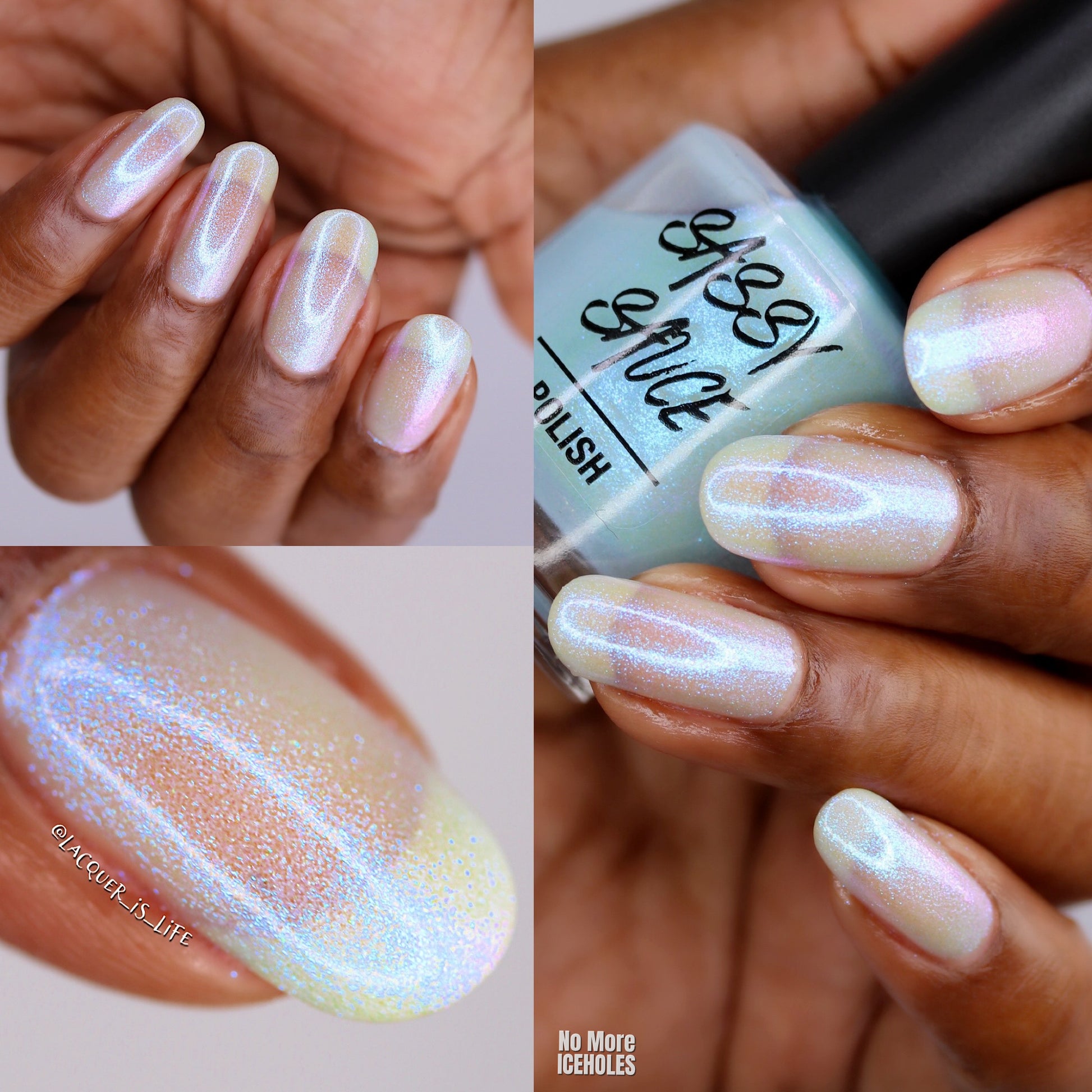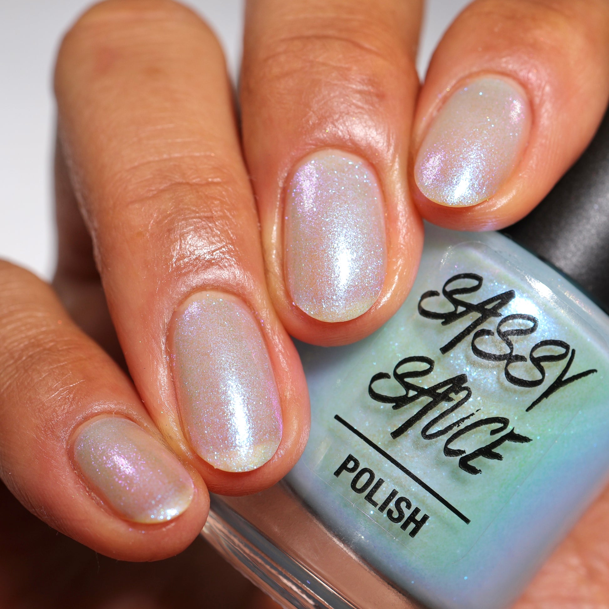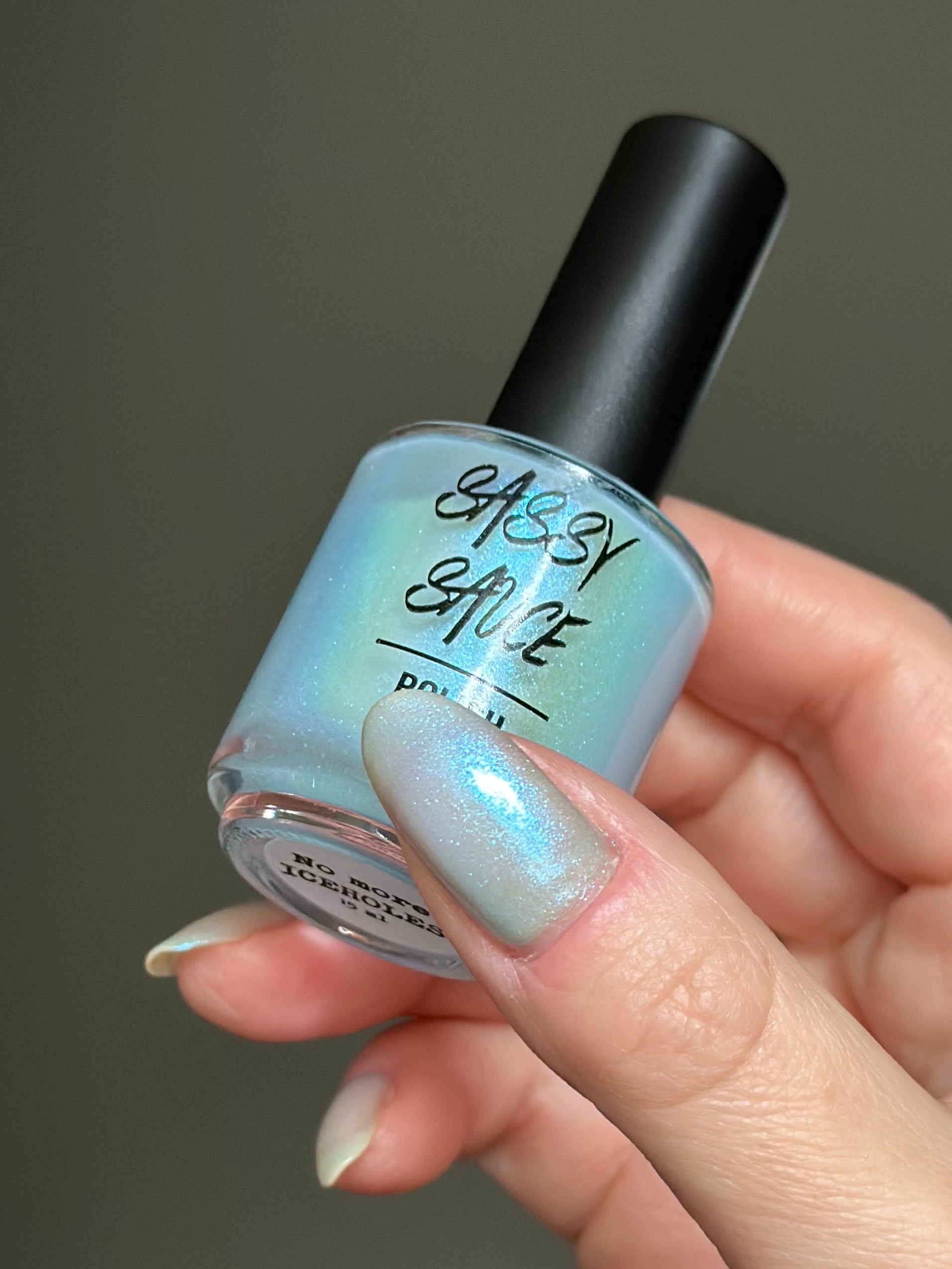 A sheer, milky baby blue tinted base with an opalescent glow, kissed by ultra-fine iridescent shimmer that flashes blue, aqua, pink with a soft glow as the light shifts. It has that “lit from within” look. Cloudy, airy, and luminous, like moonlight filtering through icicles. Delicate, glowy, and quietly mesmerizing rather than bold. This shade feels like a soft spell whispered at twilight. Can be used as a topper or built up for opacity. Named by Mary Sandberg……