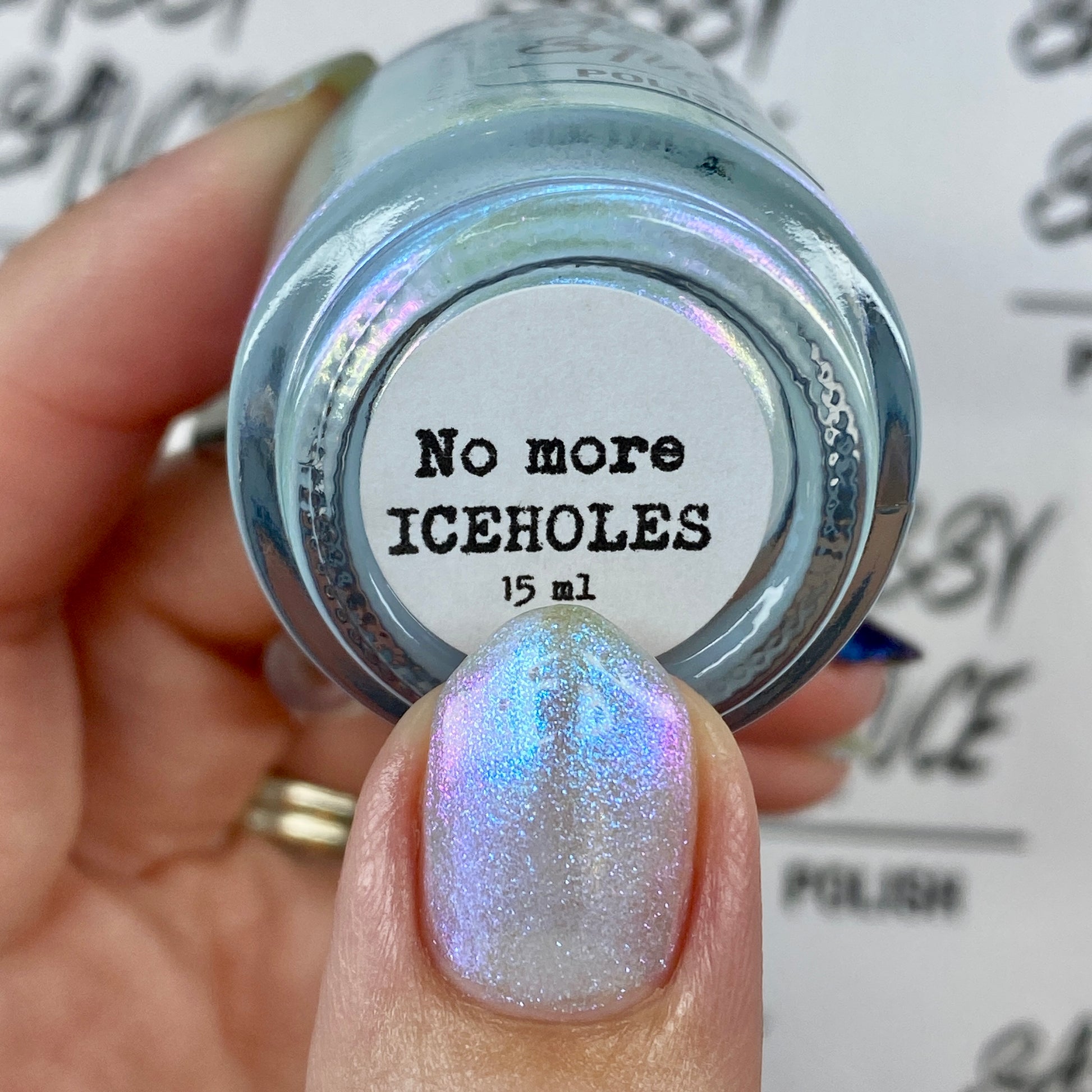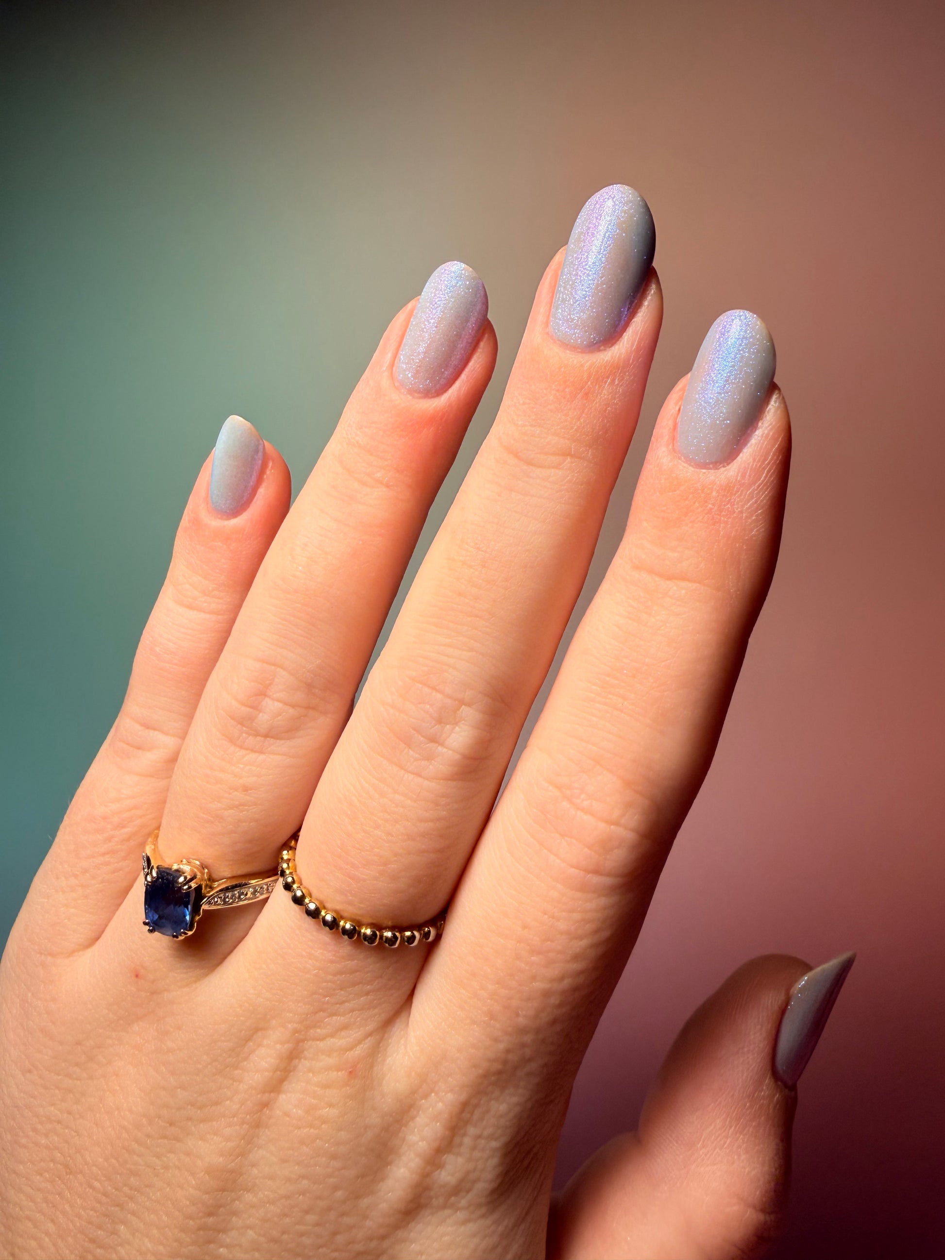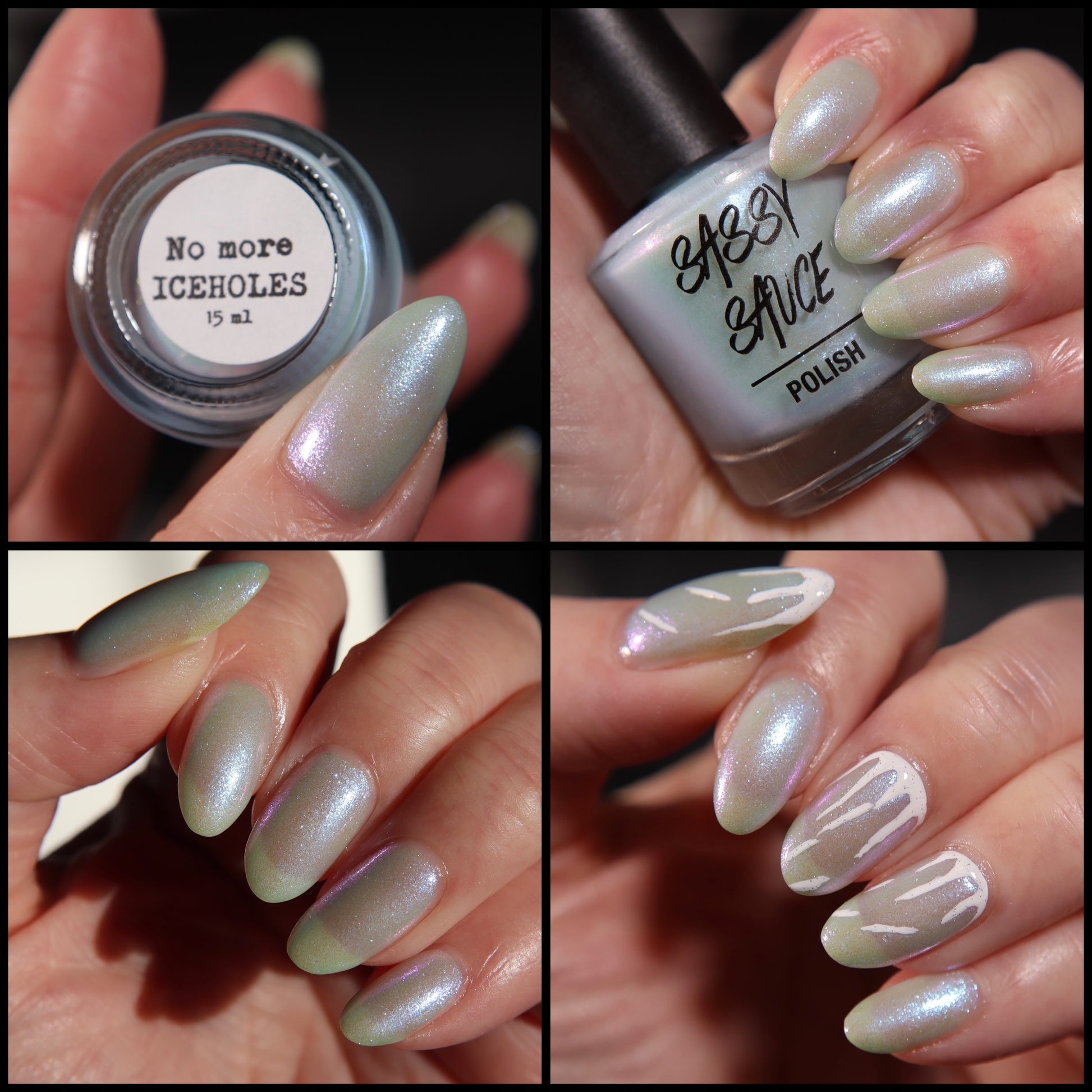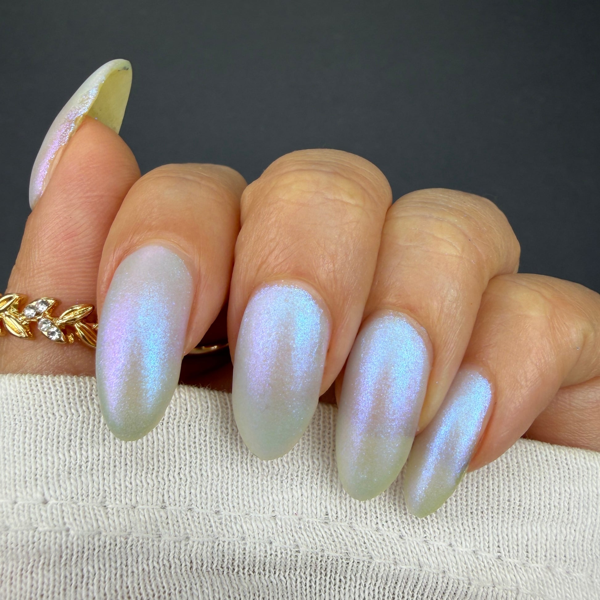 A sheer, milky baby blue tinted base with an opalescent glow, kissed by ultra-fine iridescent shimmer that flashes blue, aqua, pink with a soft glow as the light shifts. It has that “lit from within” look. Cloudy, airy, and luminous, like moonlight filtering through icicles. Delicate, glowy, and quietly mesmerizing rather than bold. This shade feels like a soft spell whispered at twilight. Can be used as a topper or built up for opacity. Named by Mary Sandberg……