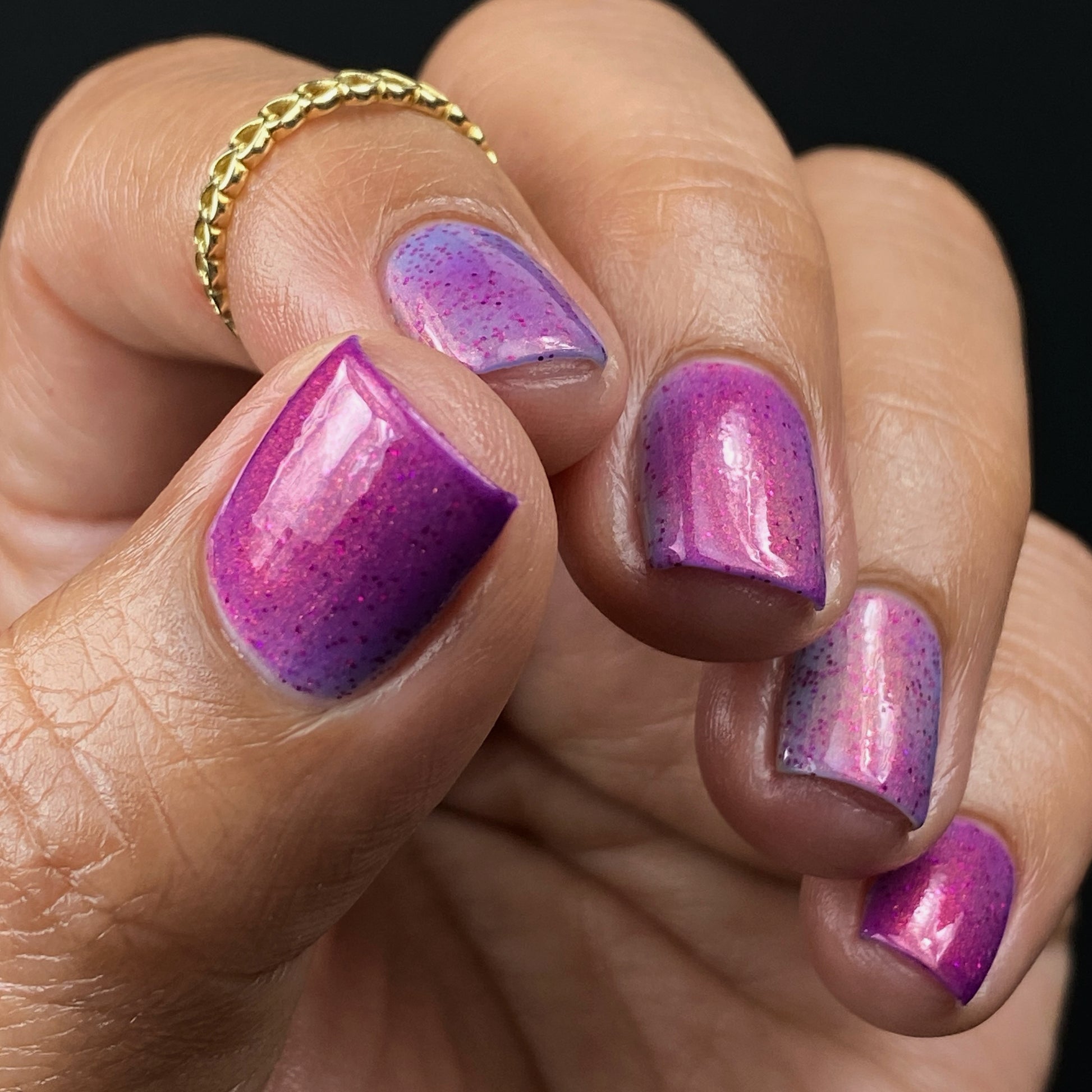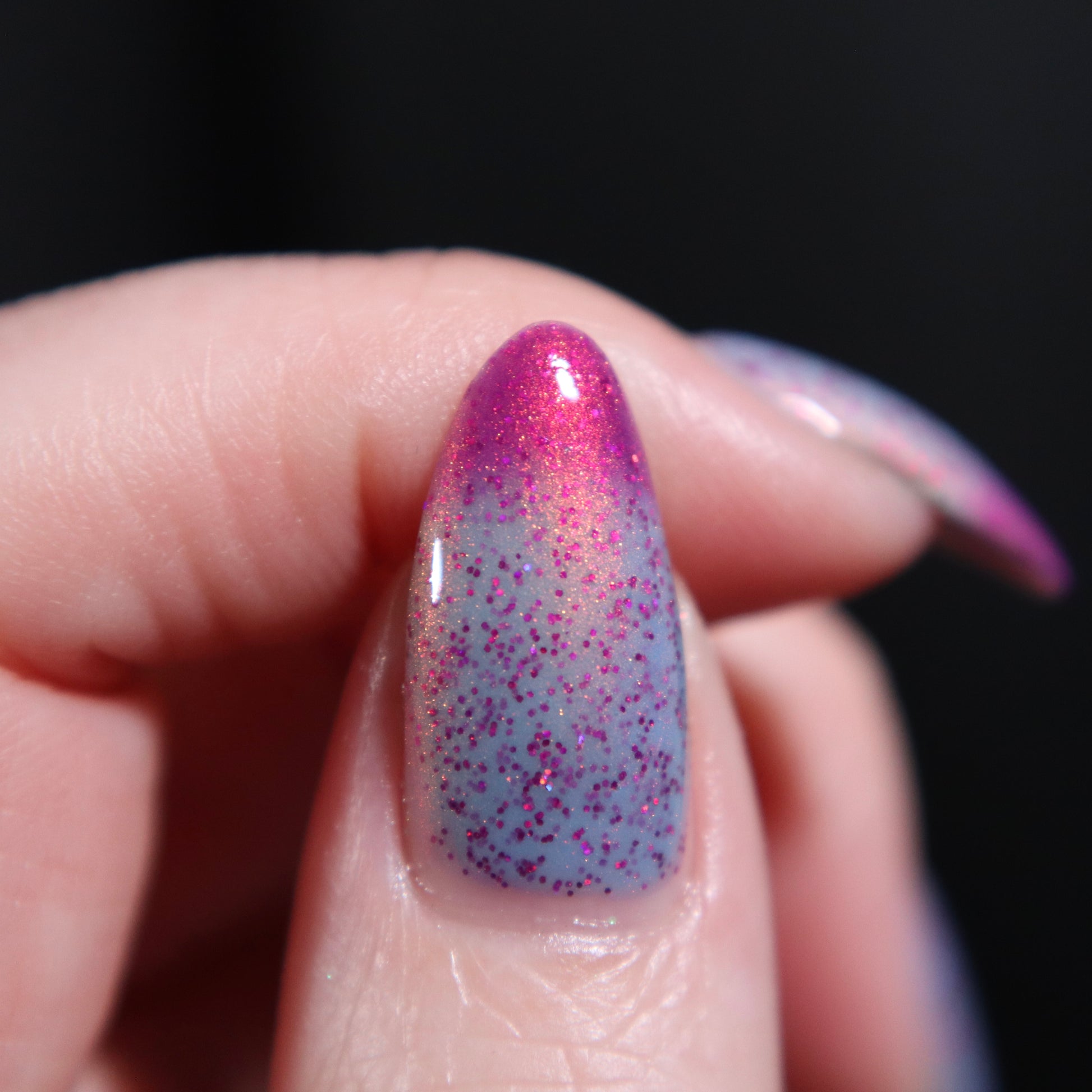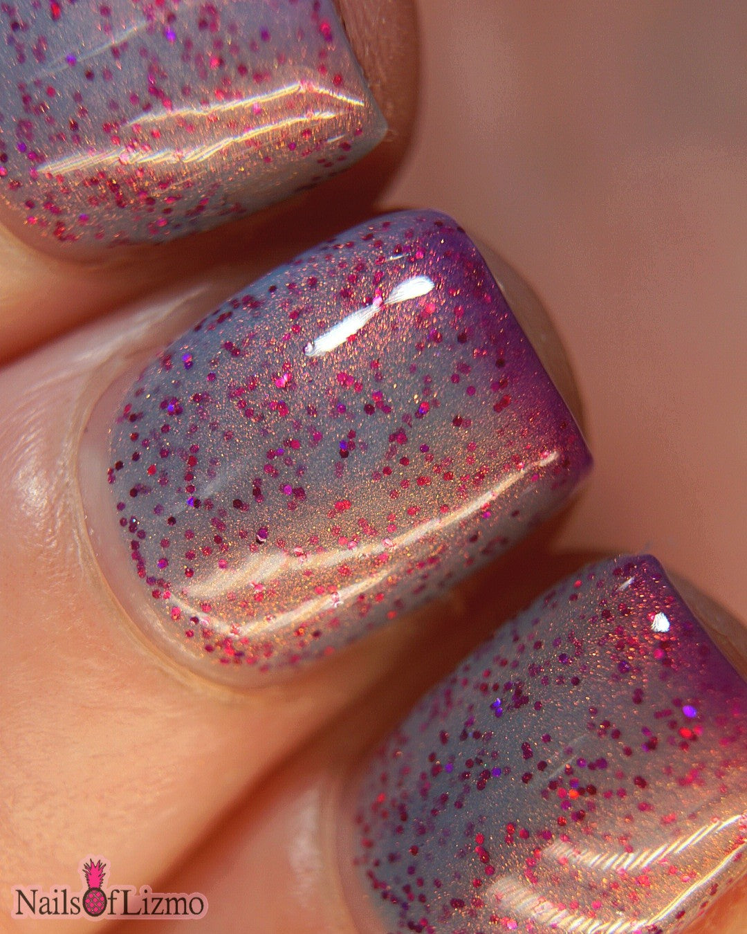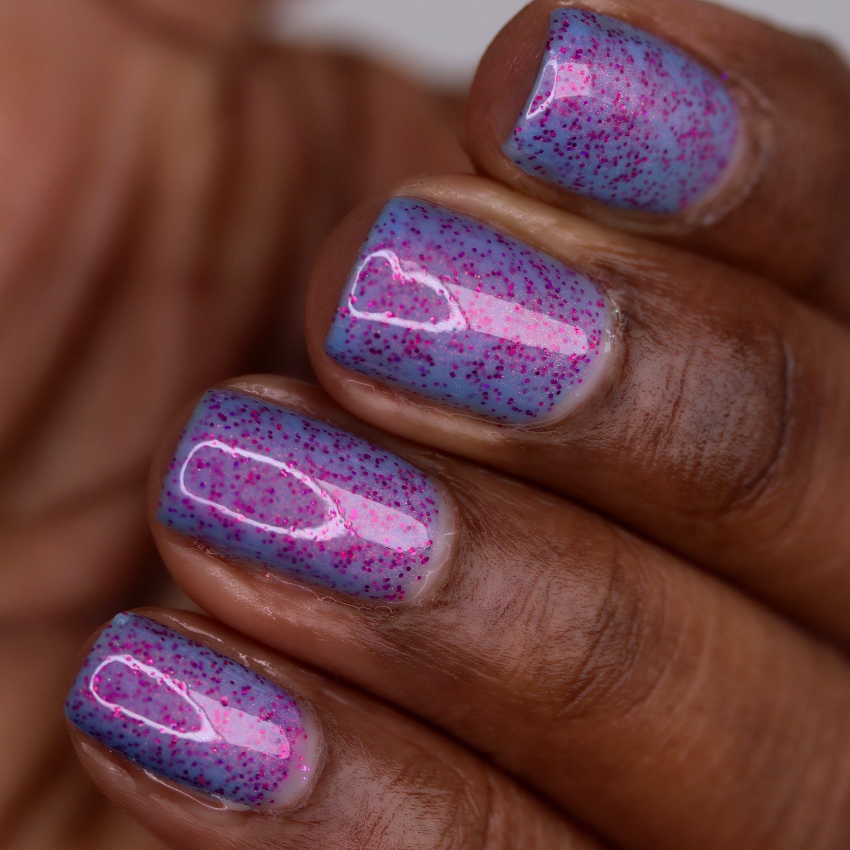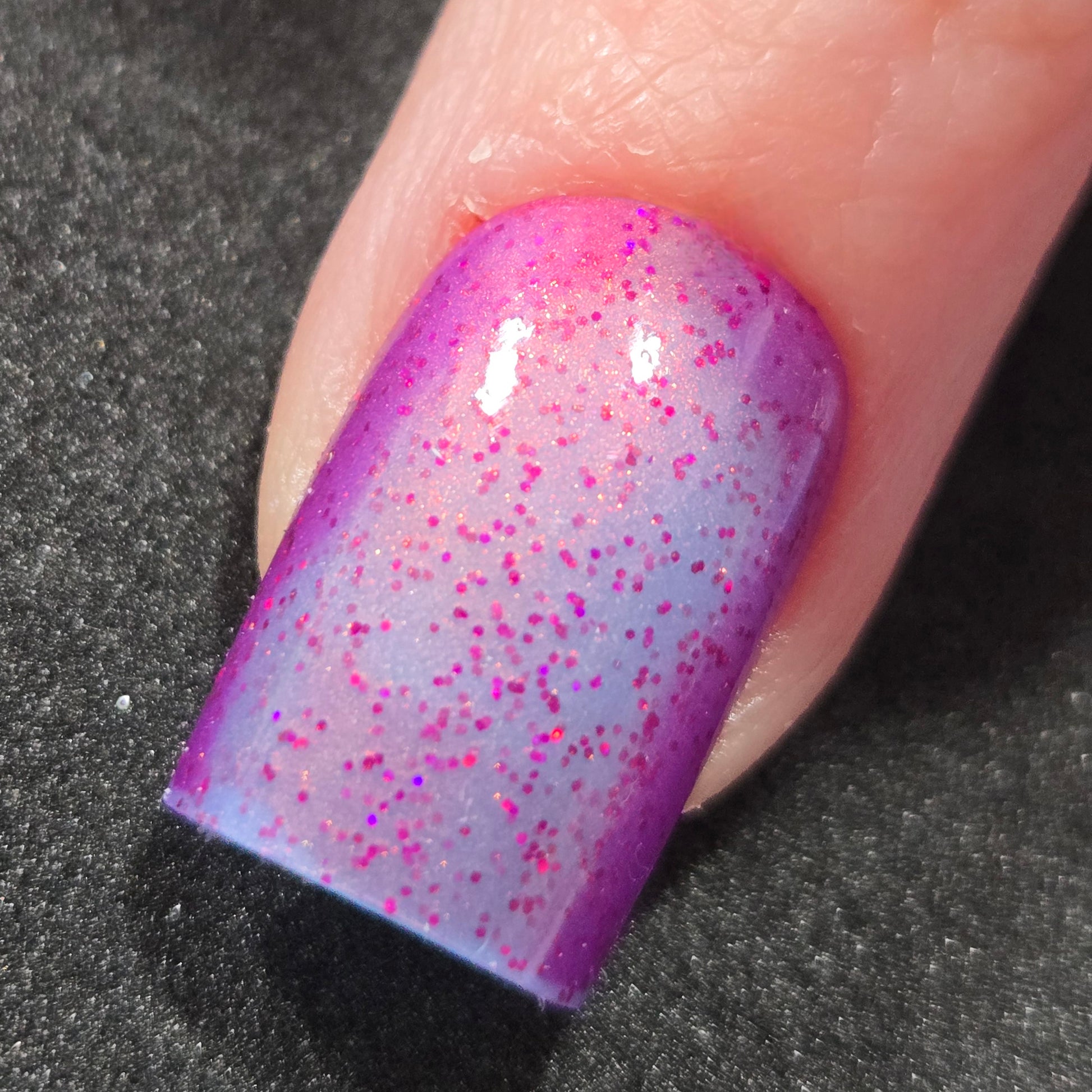 A purple (cold) thermal with glowey copper/red shimmer. When warm (88 degrees) it will change to a light blue revealing fuchsia glitter pigment.