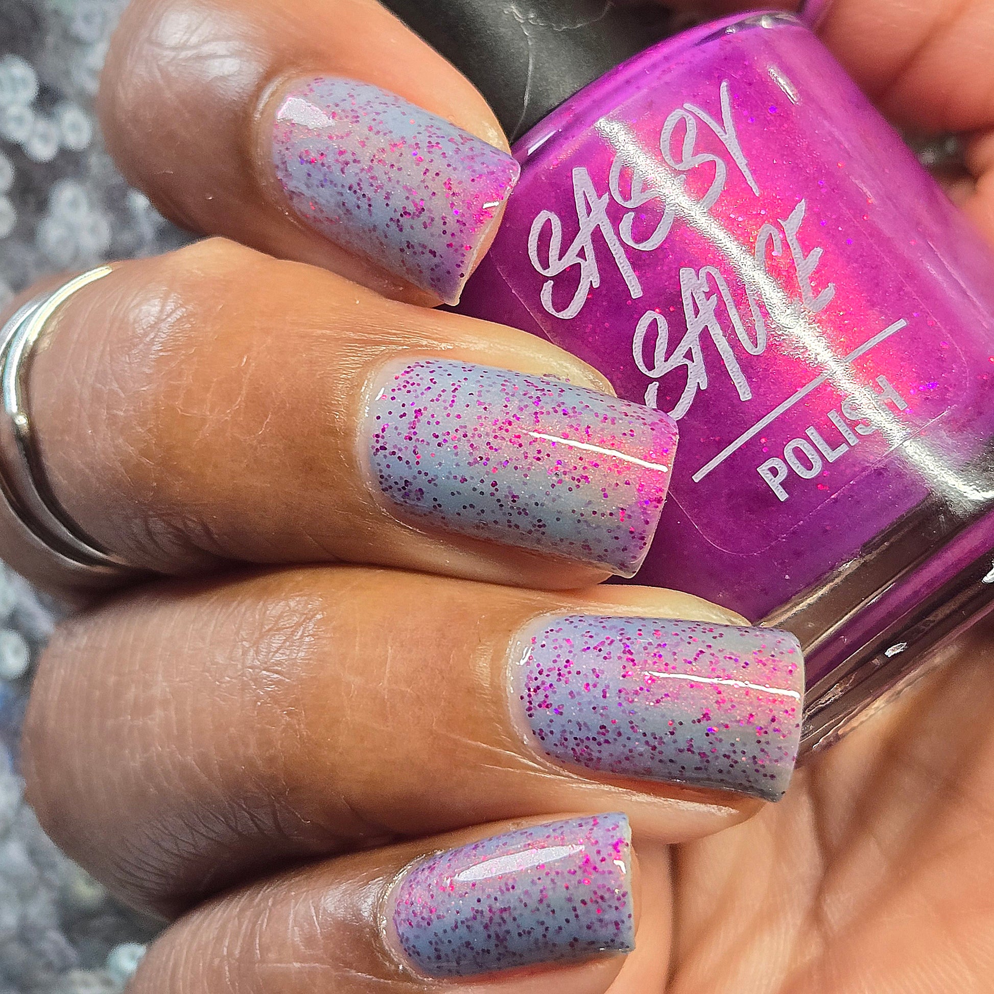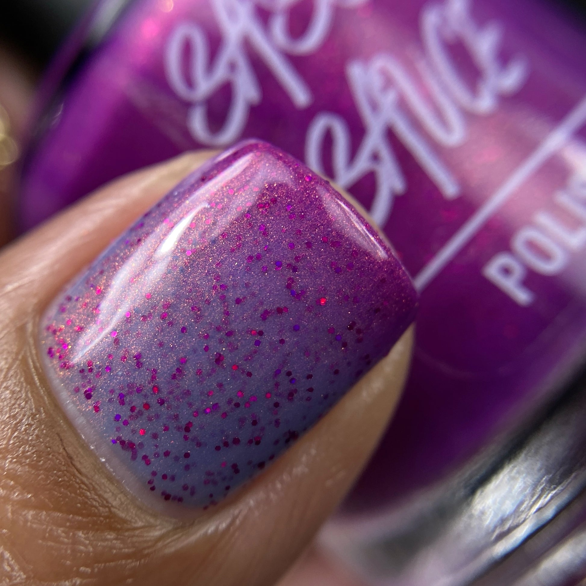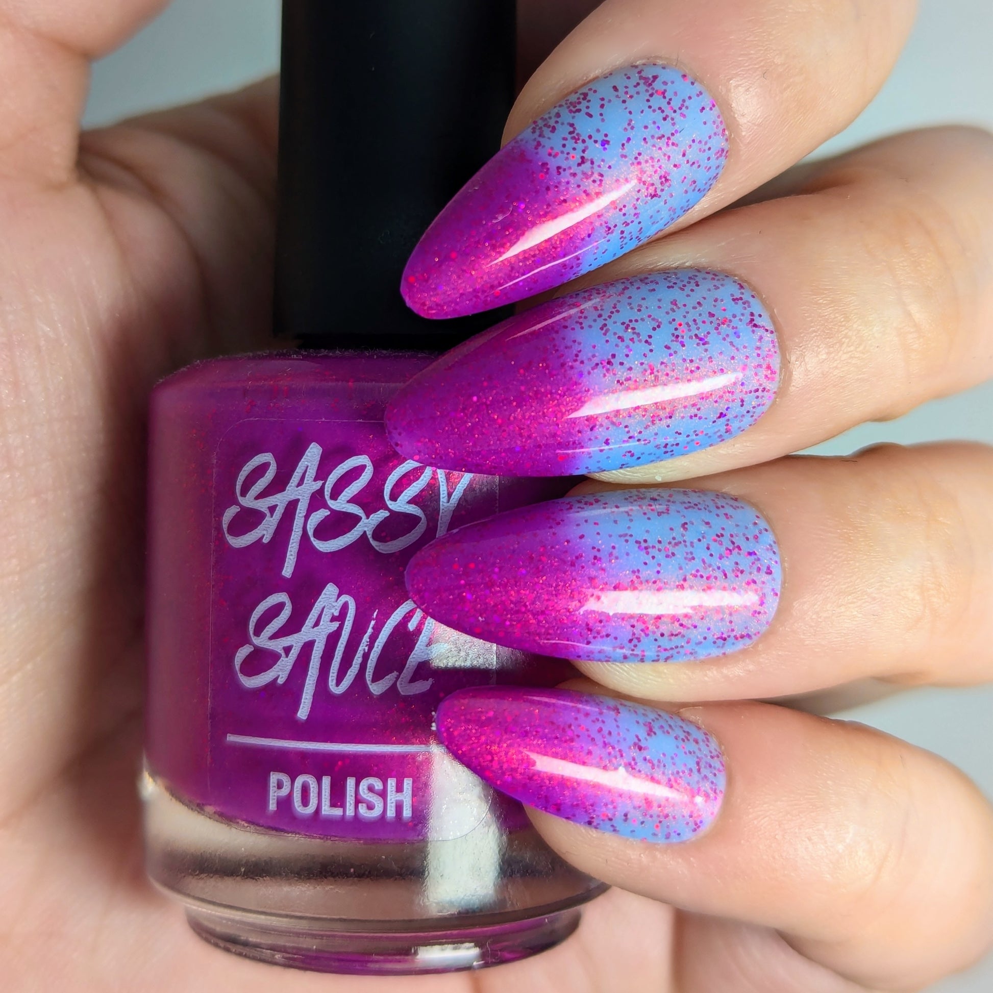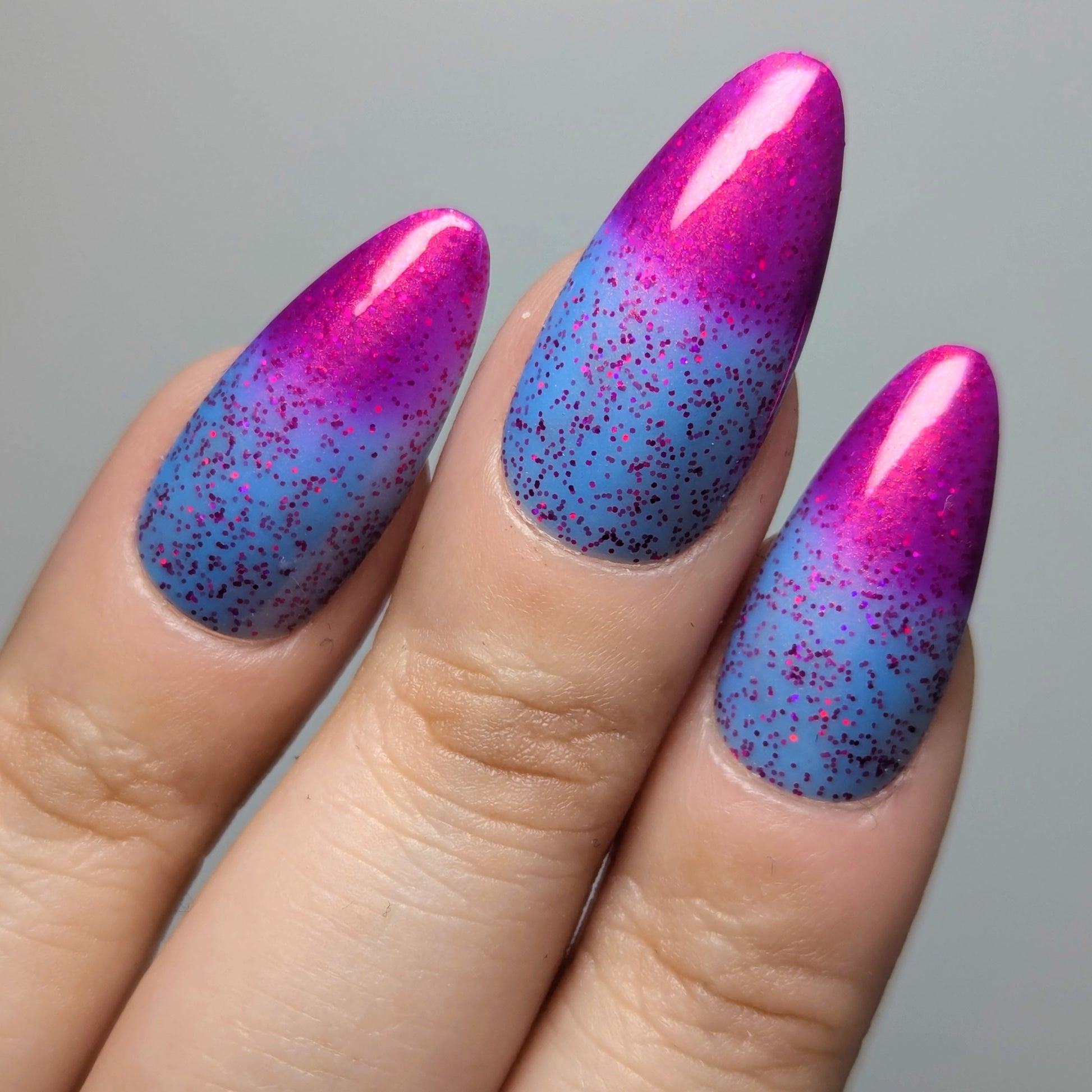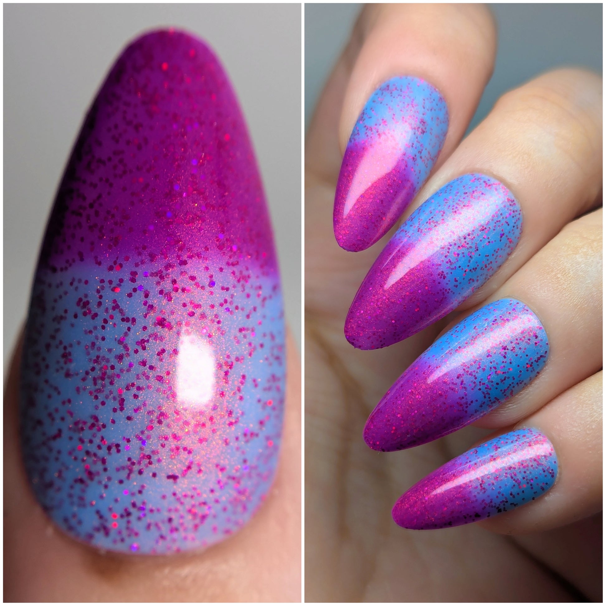 A purple (cold) thermal with glowey copper/red shimmer. When warm (88 degrees) it will change to a light blue revealing fuchsia glitter pigment.