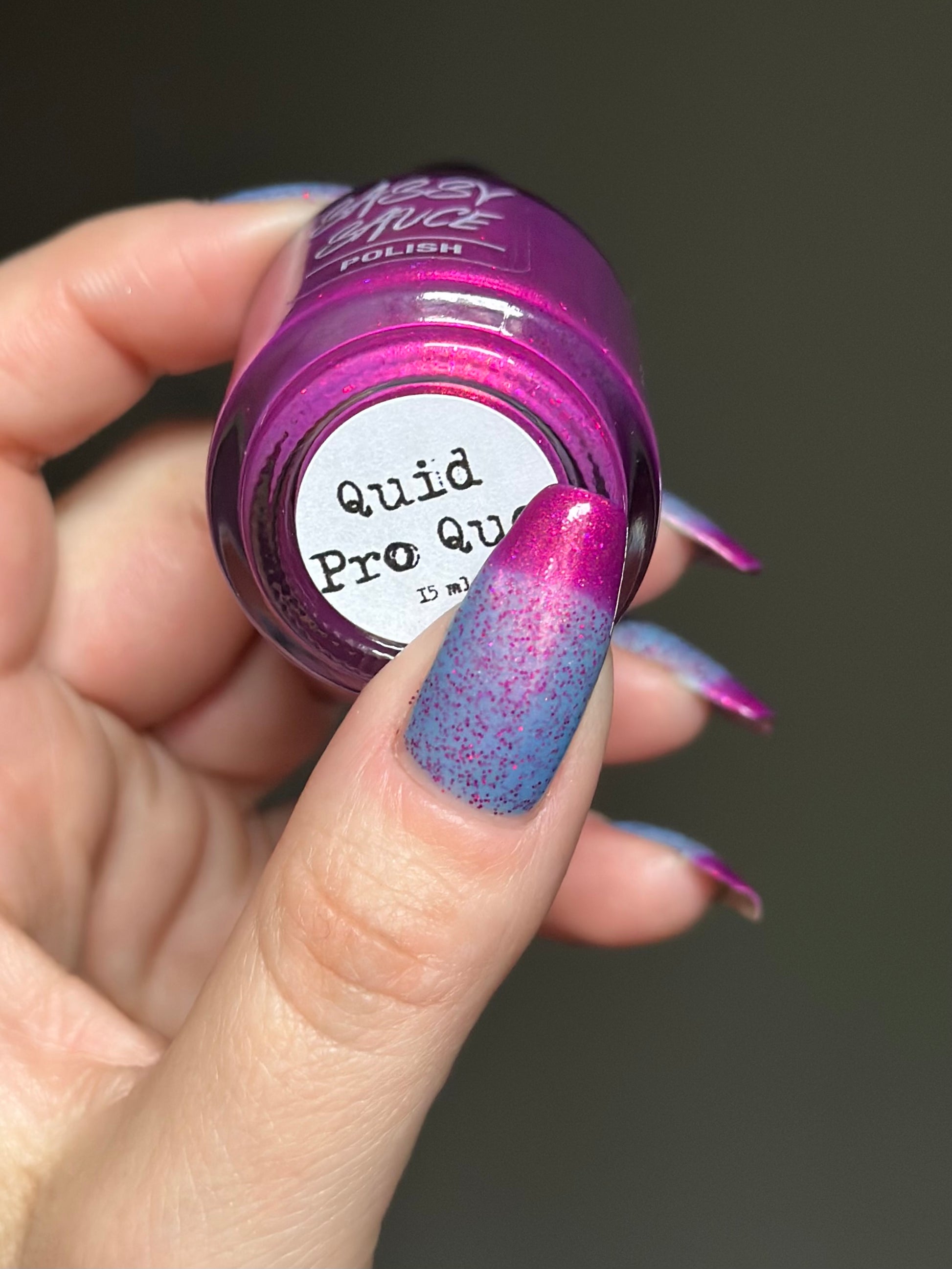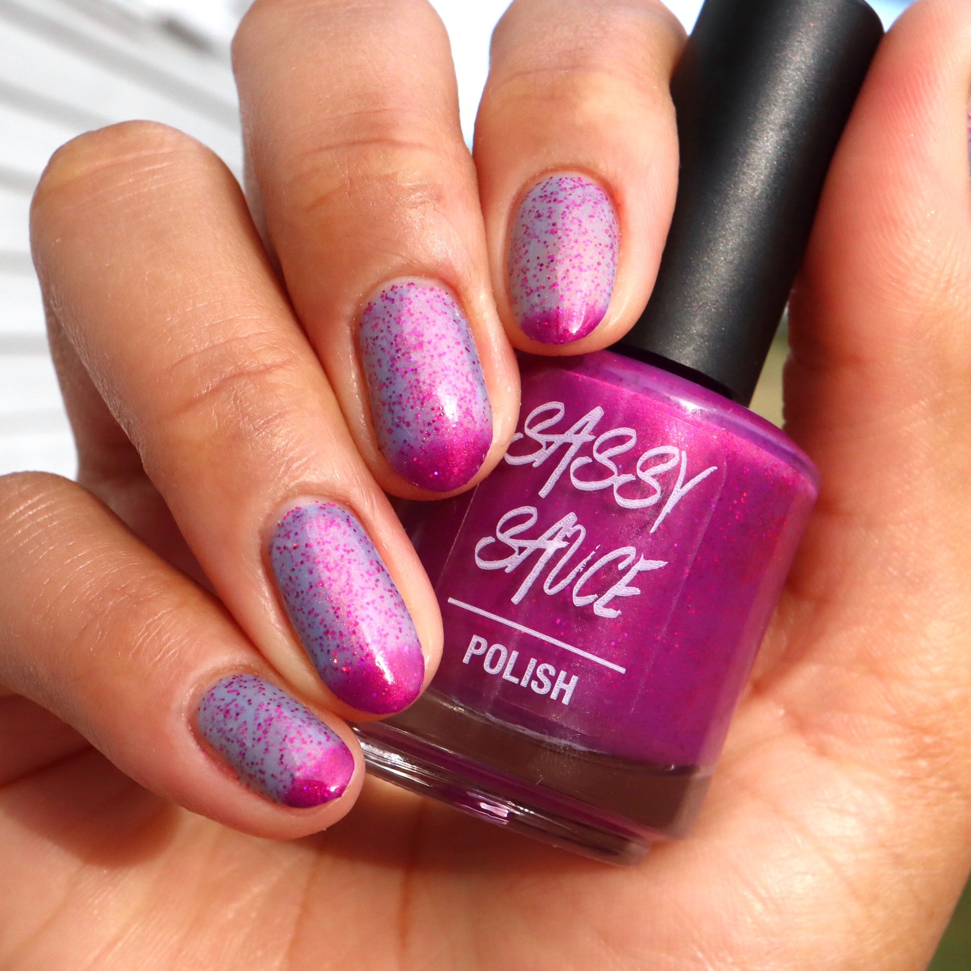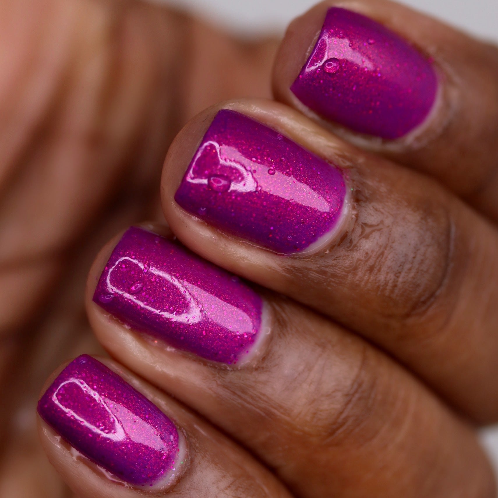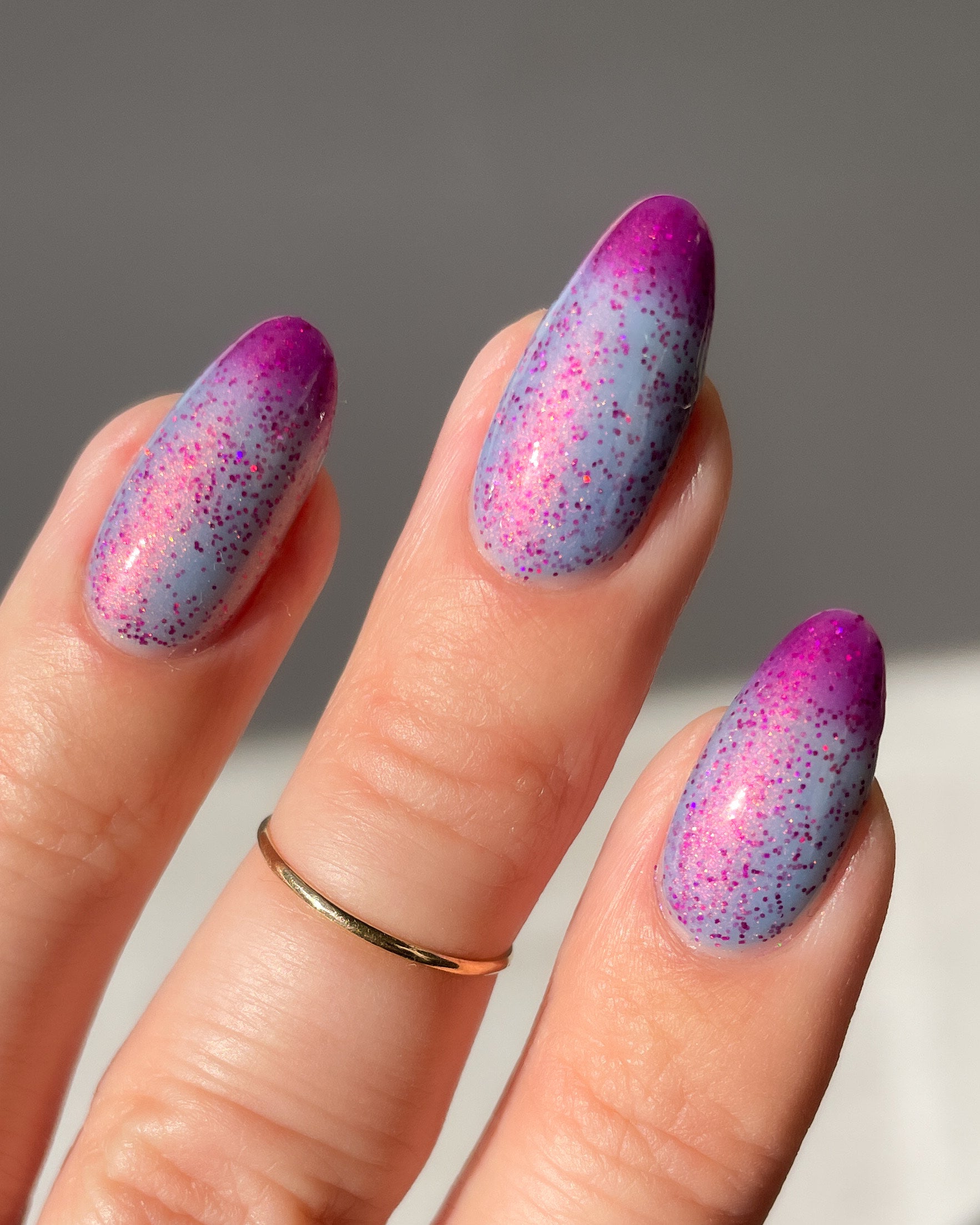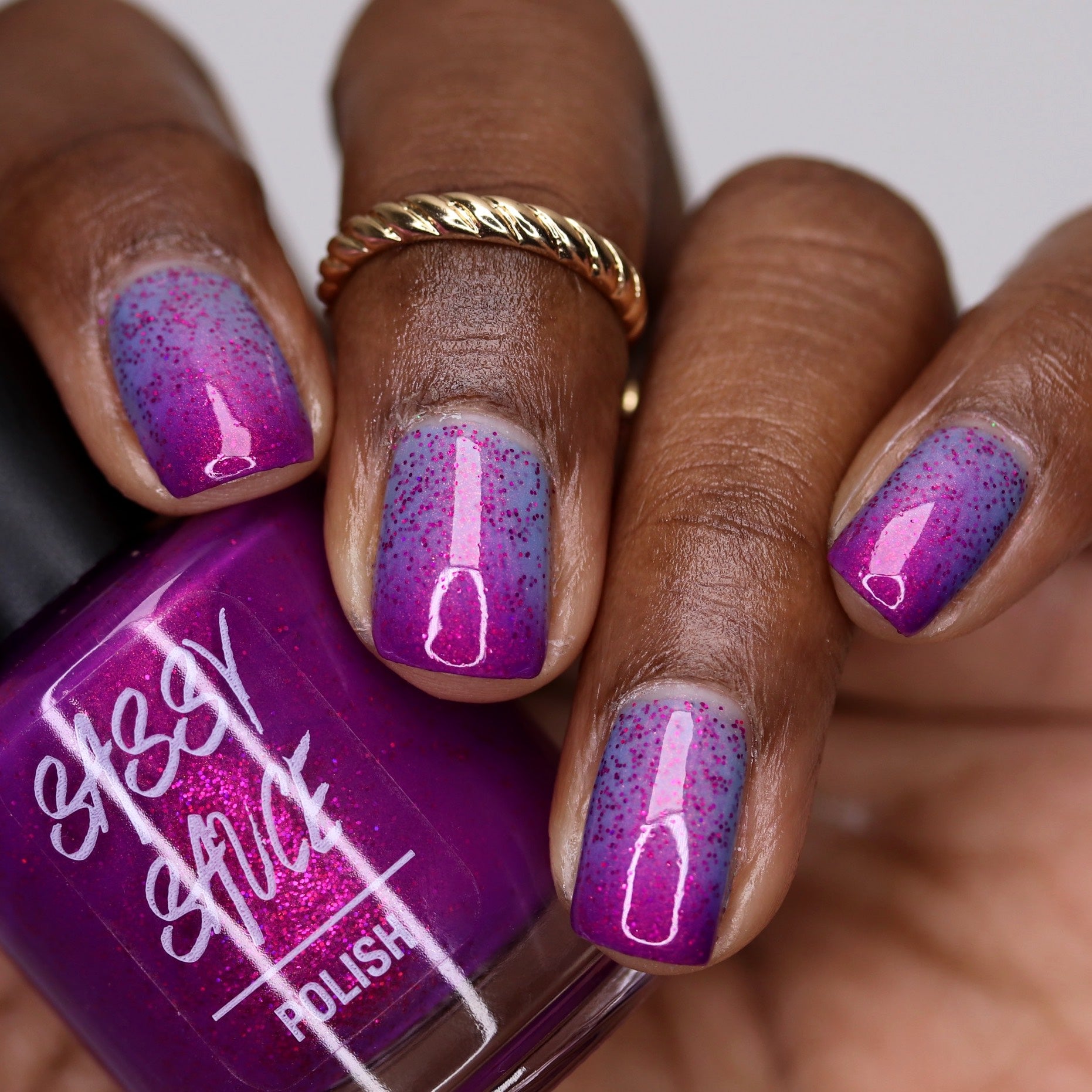 A purple (cold) thermal with glowey copper/red shimmer. When warm (88 degrees) it will change to a light blue revealing fuchsia glitter pigment.