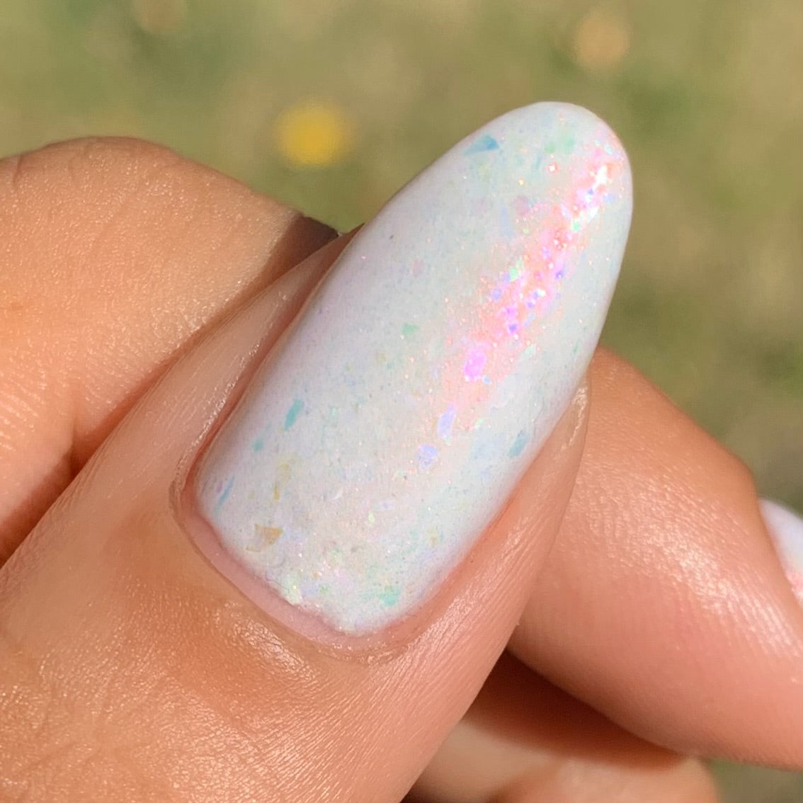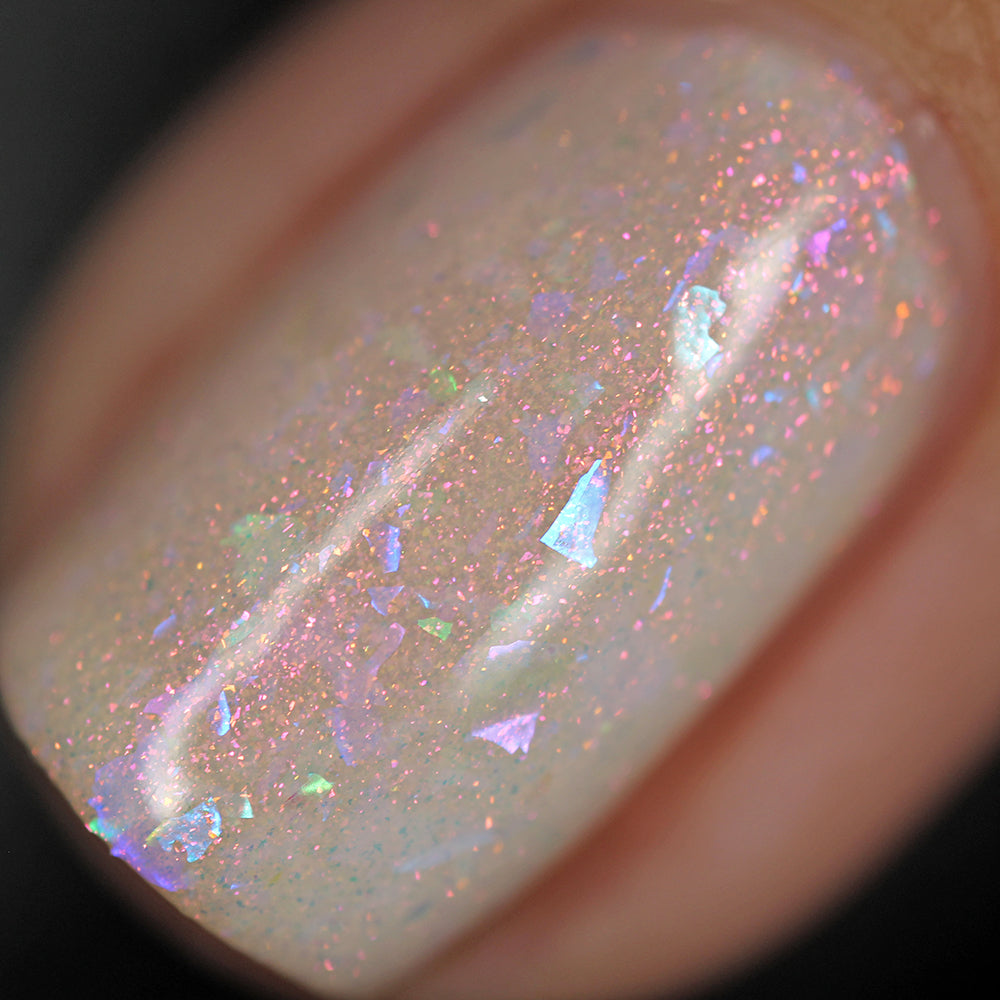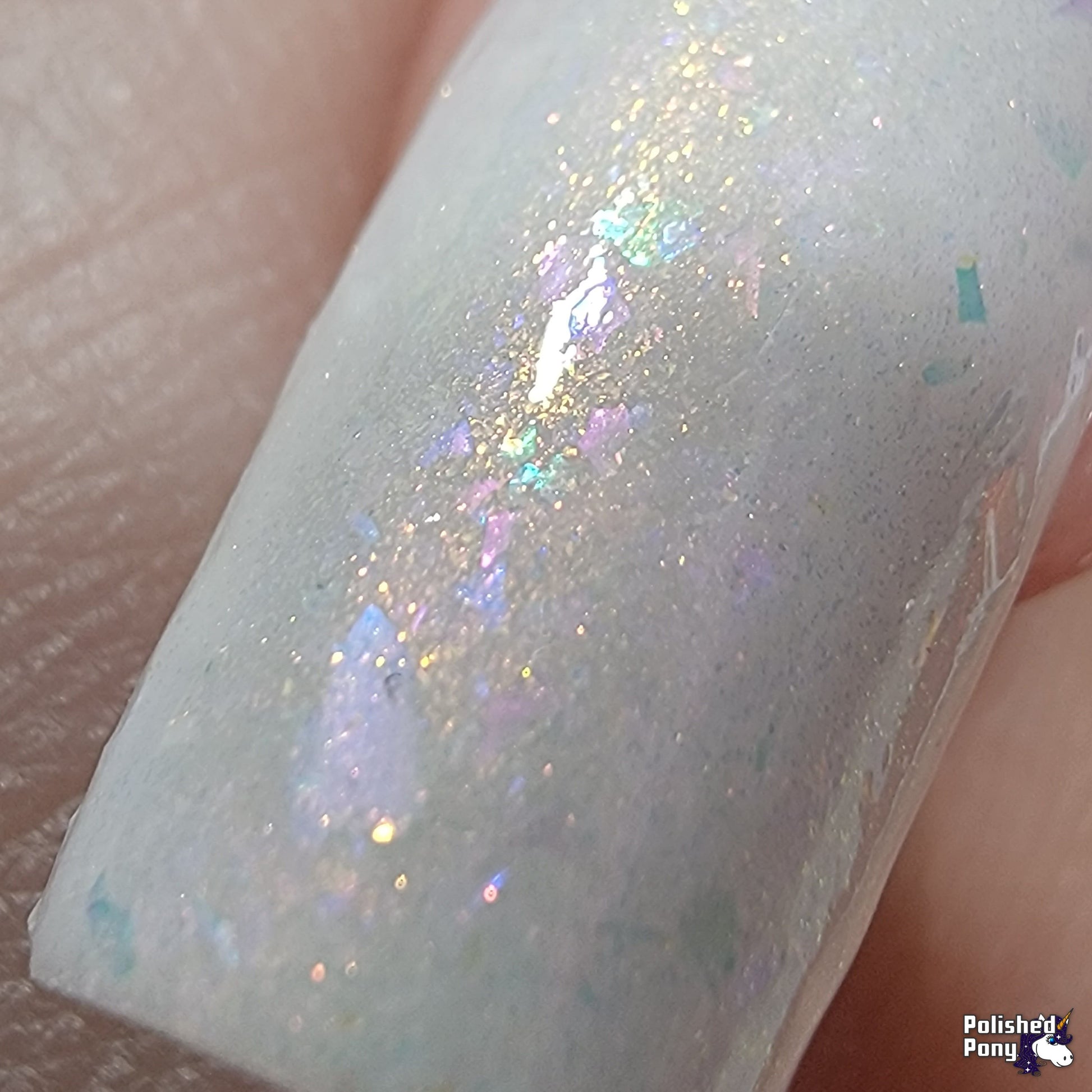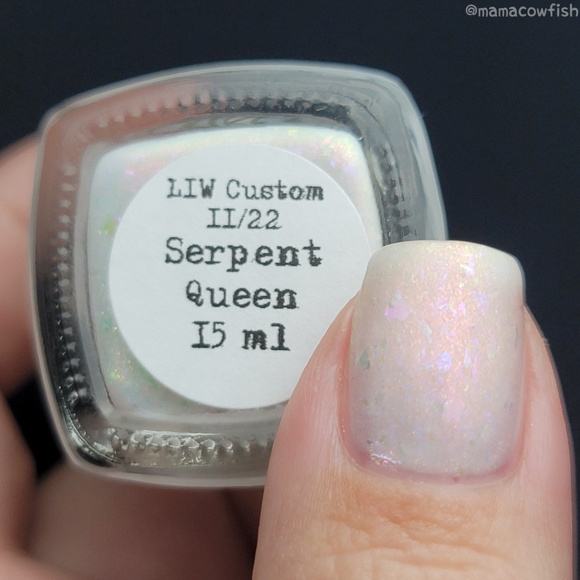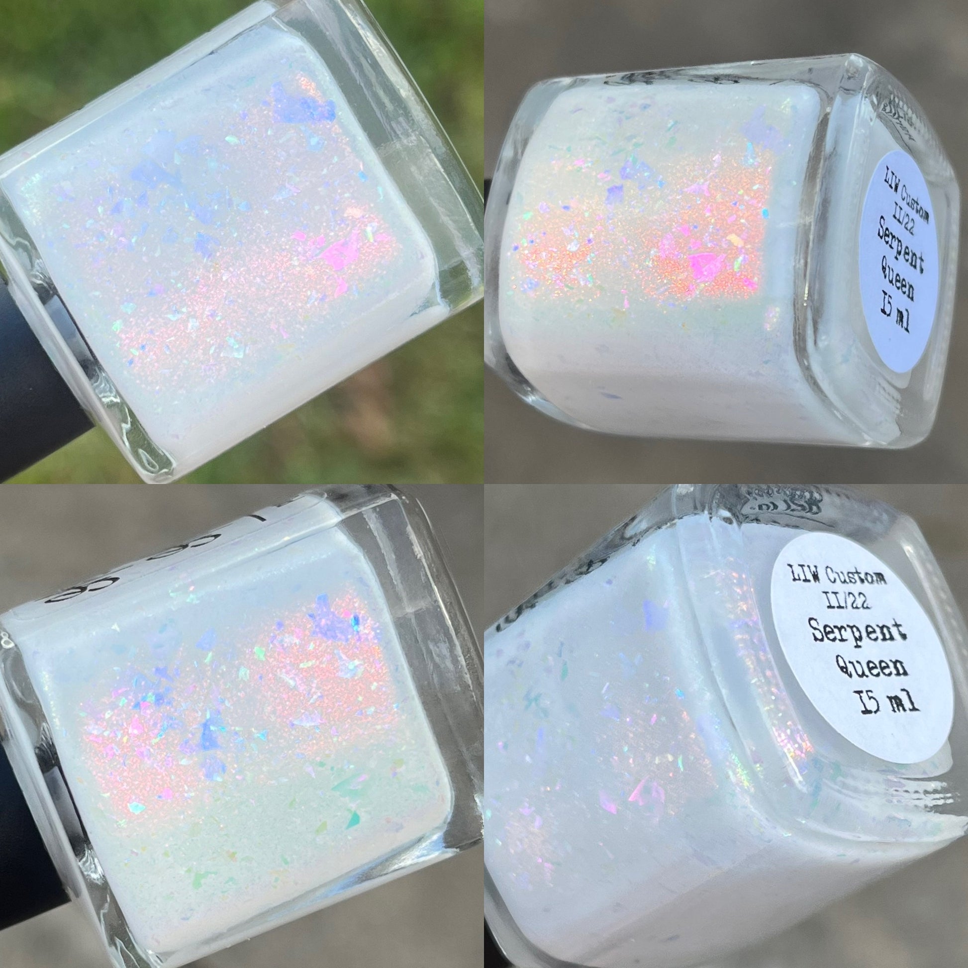 Serpent Queen- A milky white base with a strong, large particle shift of violet/copper/green/gold and assorted shifting ghost flakies. Named by Mary Sandberg. Inspo was chosen by Jennifer Lynn Markus.