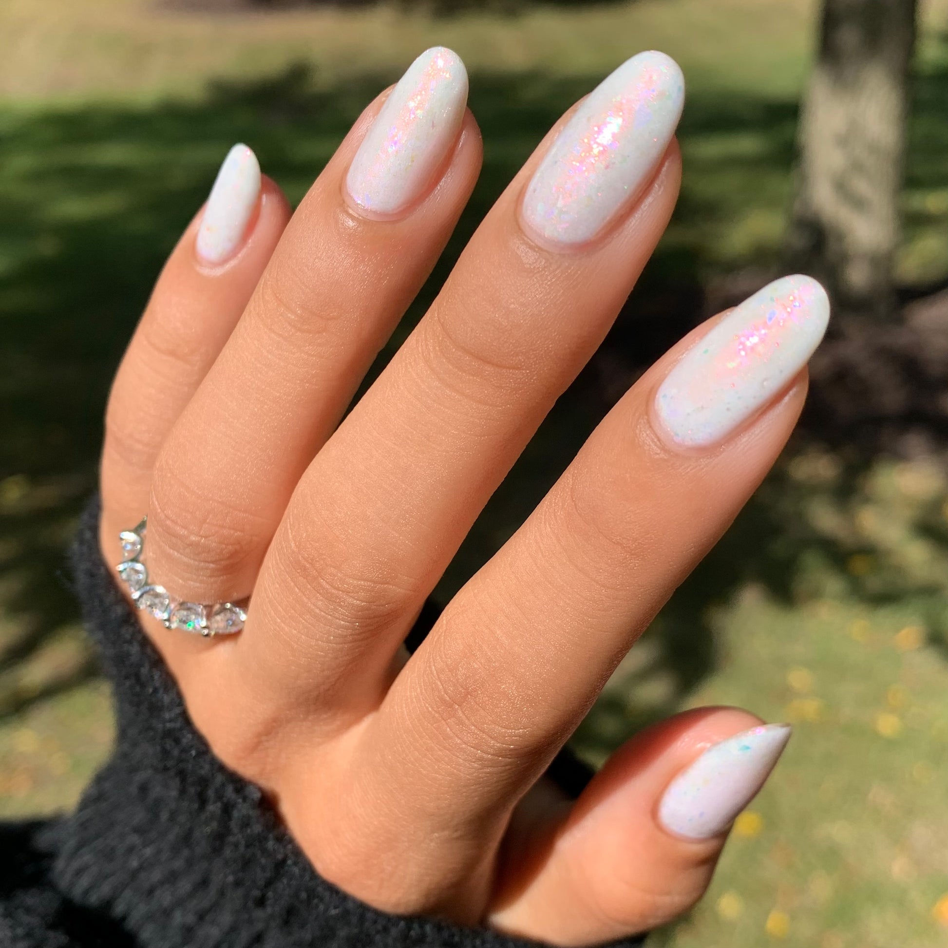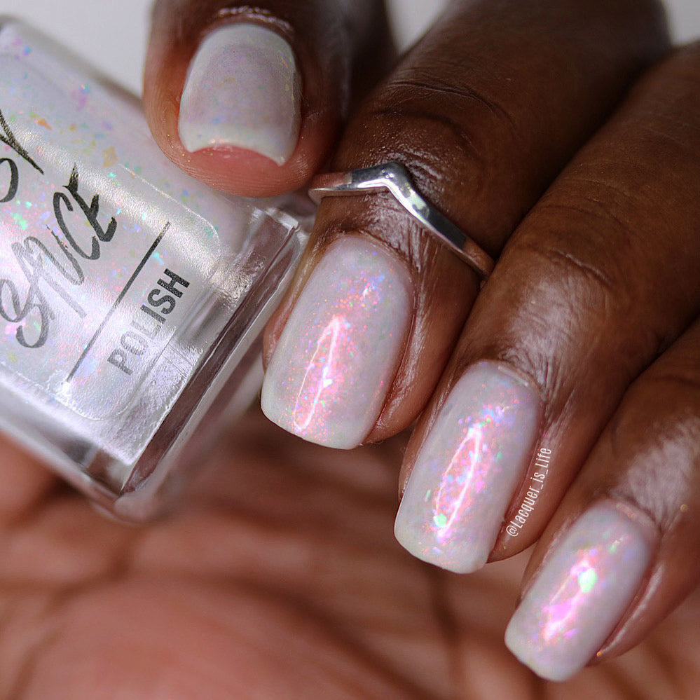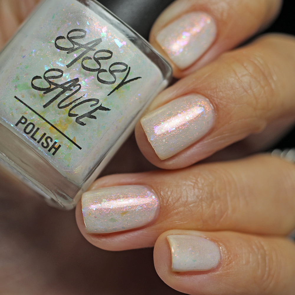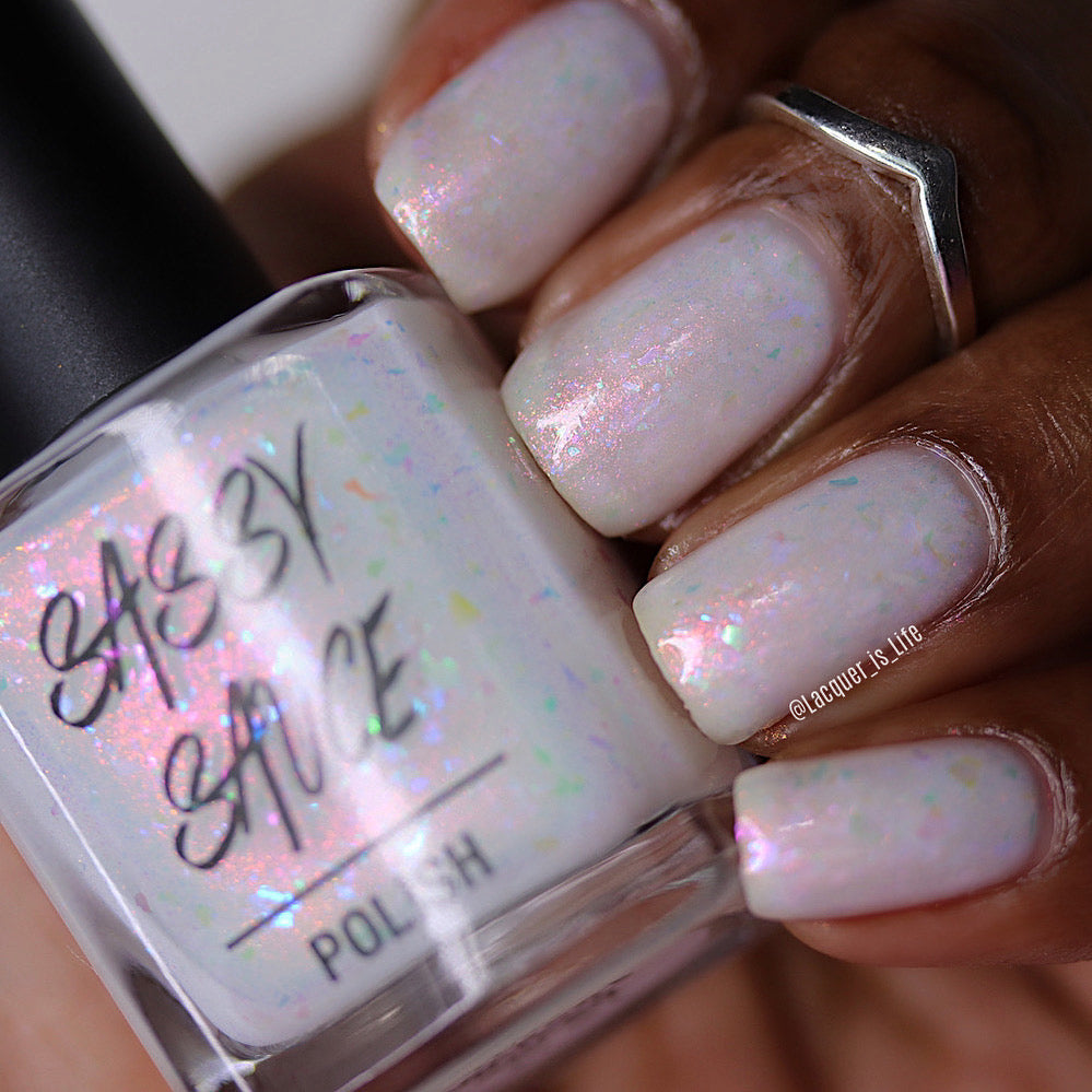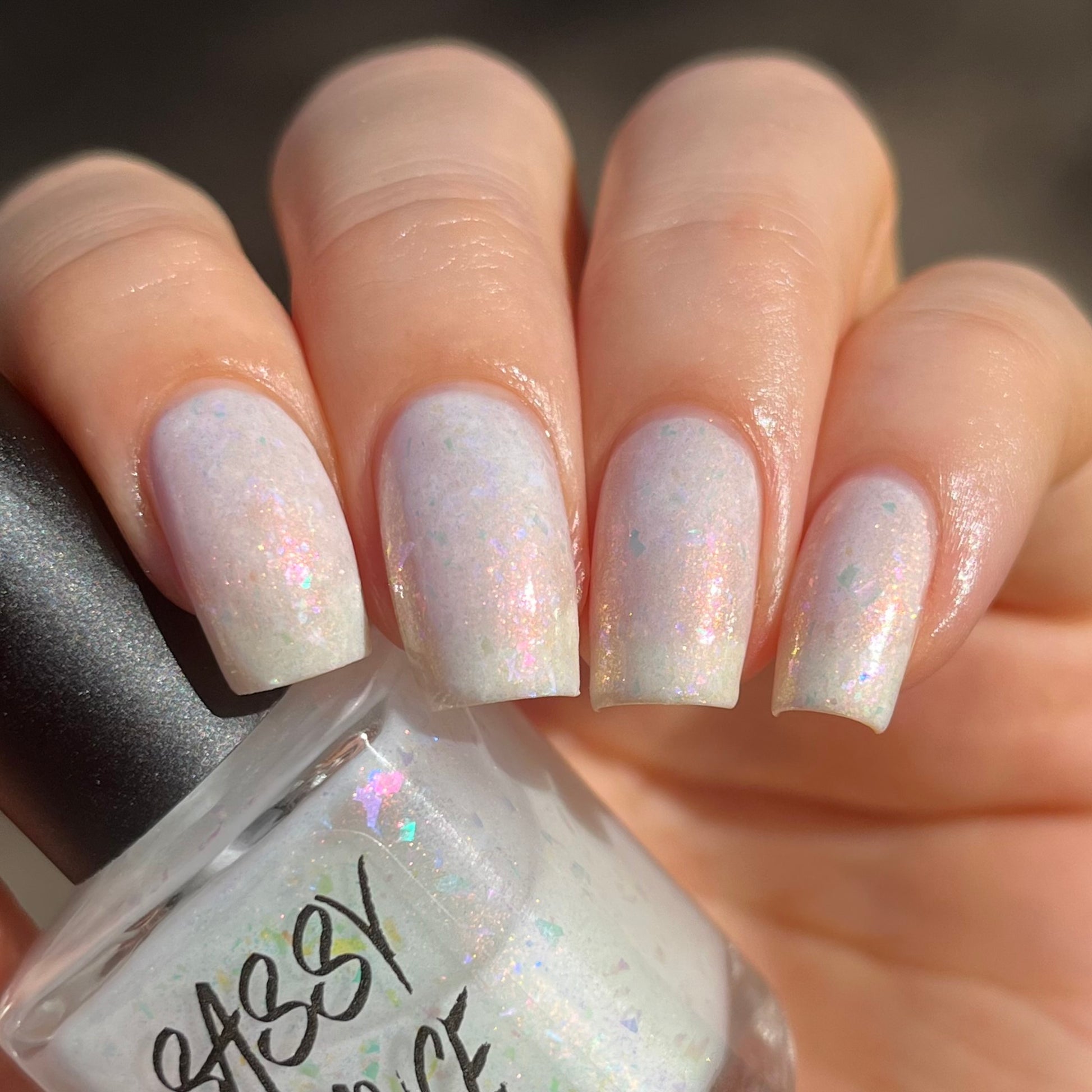 Serpent Queen- A milky white base with a strong, large particle shift of violet/copper/green/gold and assorted shifting ghost flakies. Named by Mary Sandberg. Inspo was chosen by Jennifer Lynn Markus.
