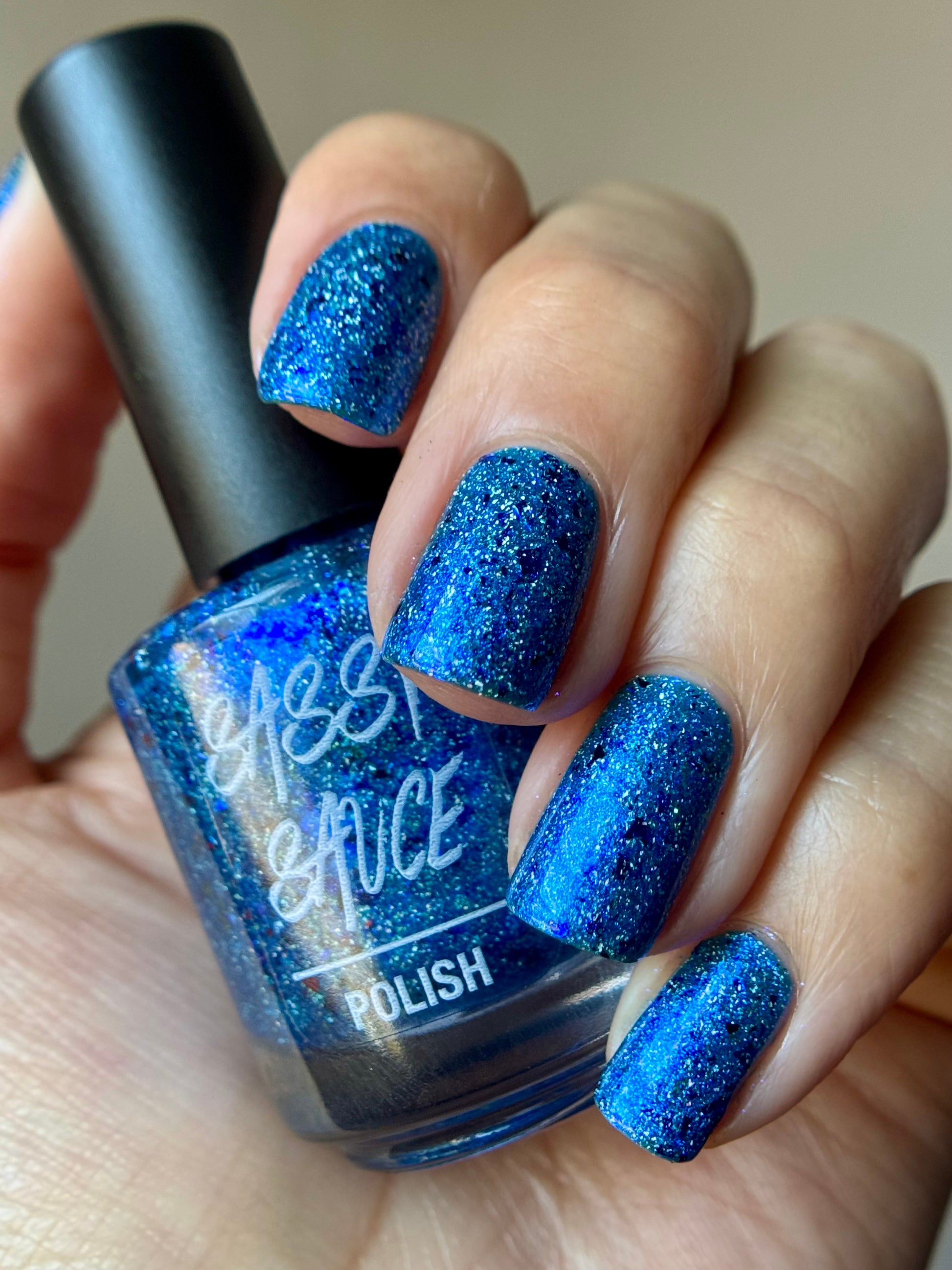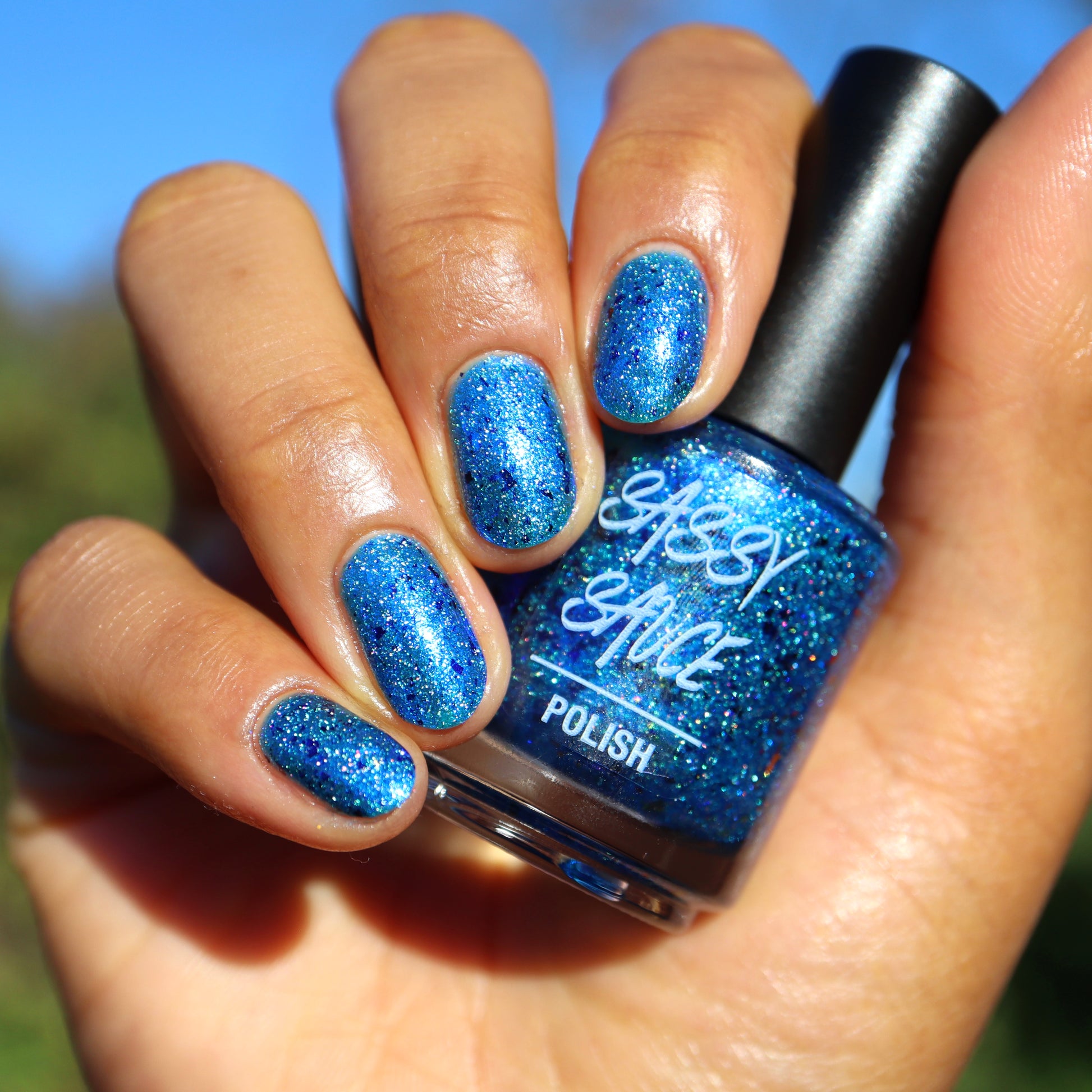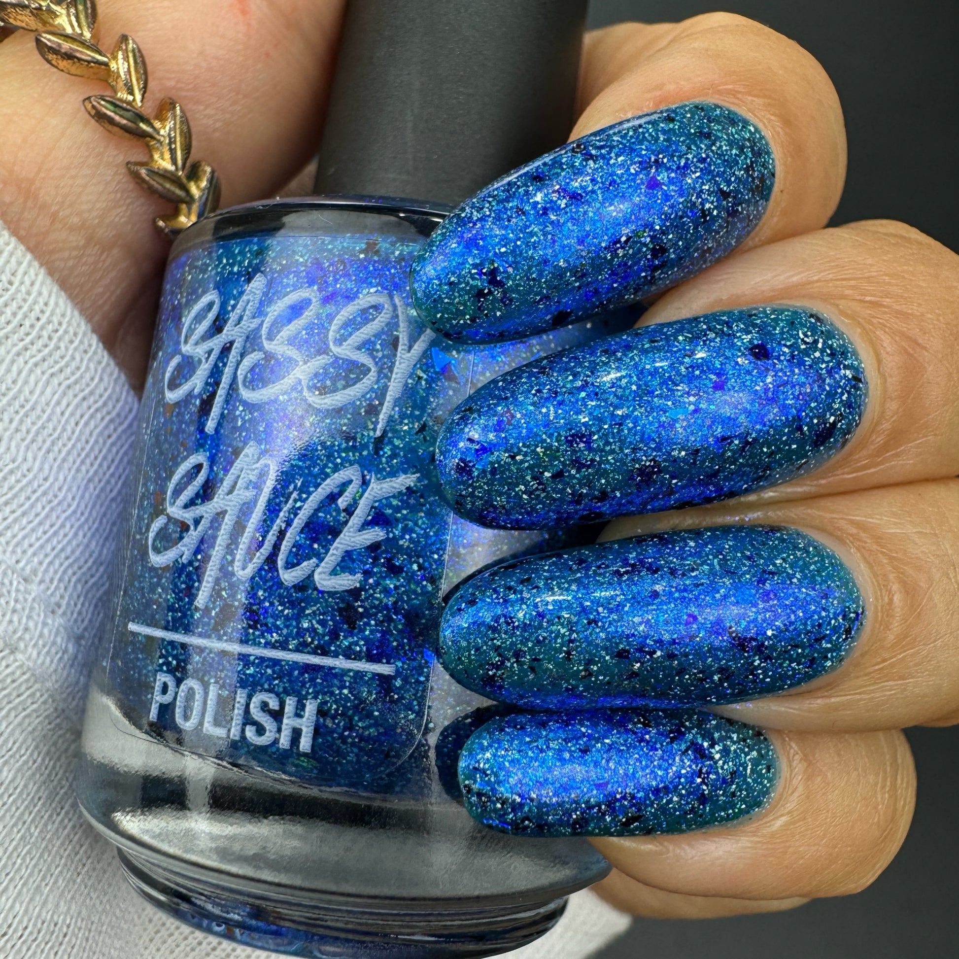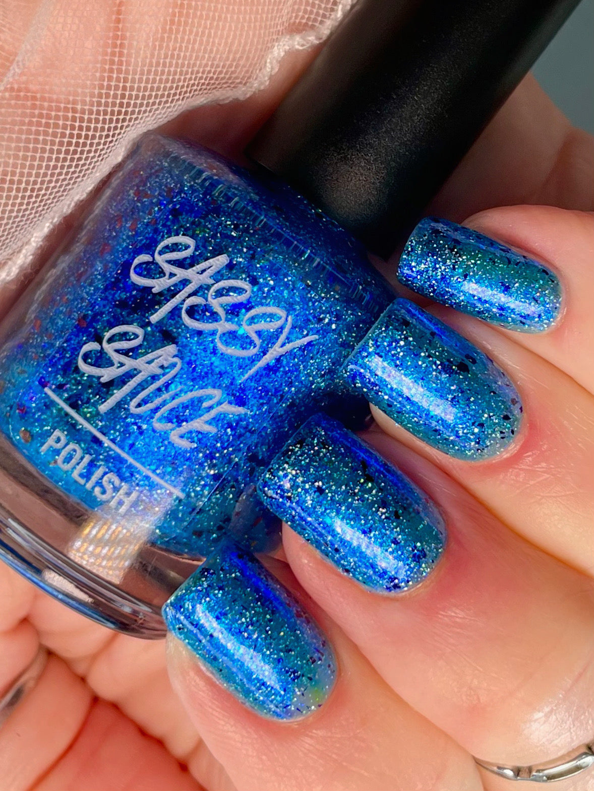 A glowey blue shimmer packed with holo and UCC blue/black flakies.