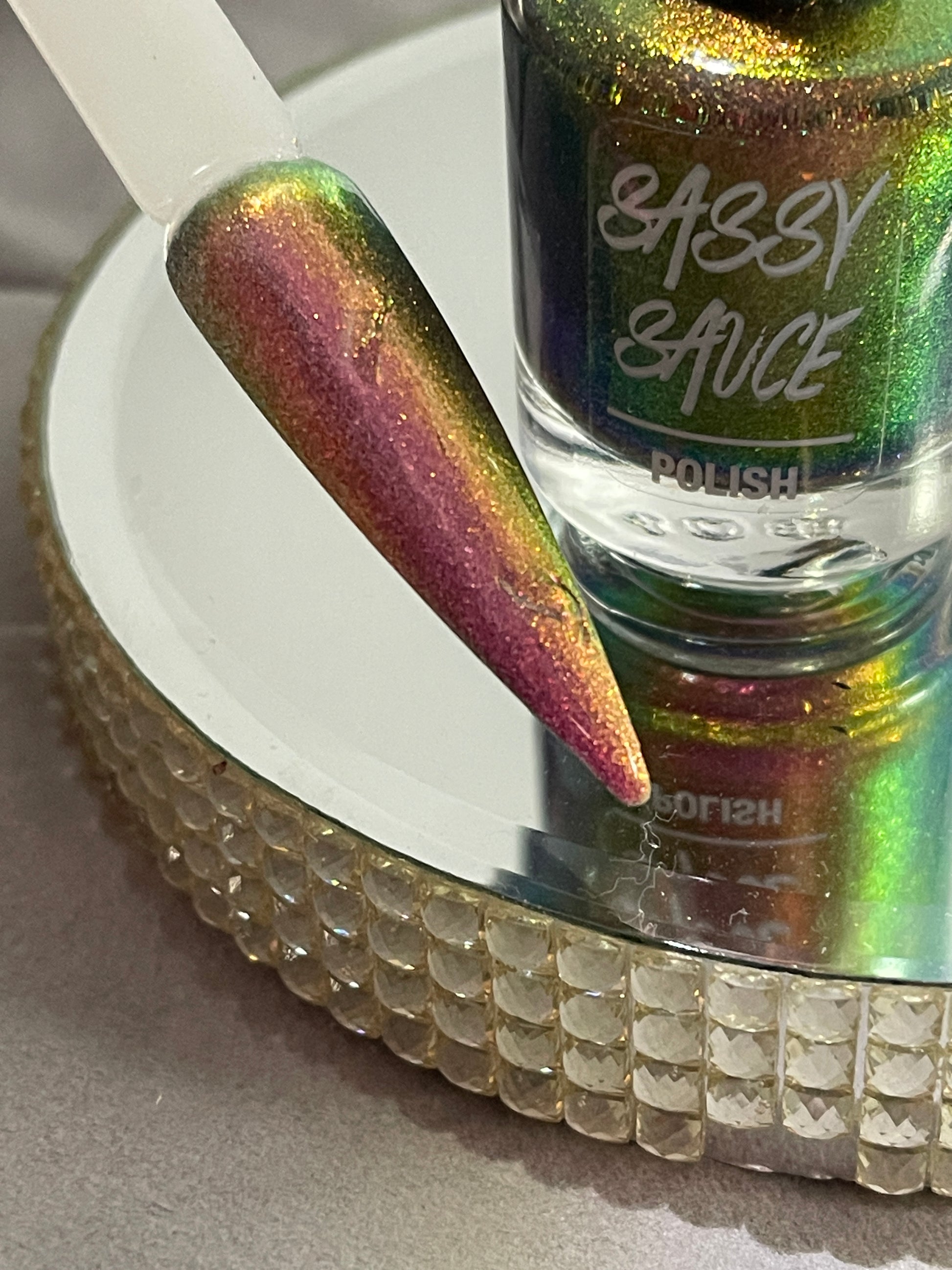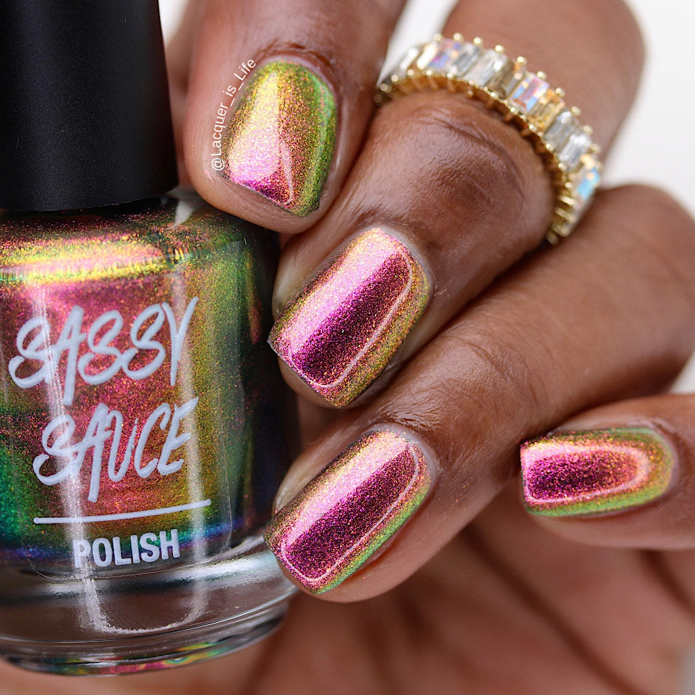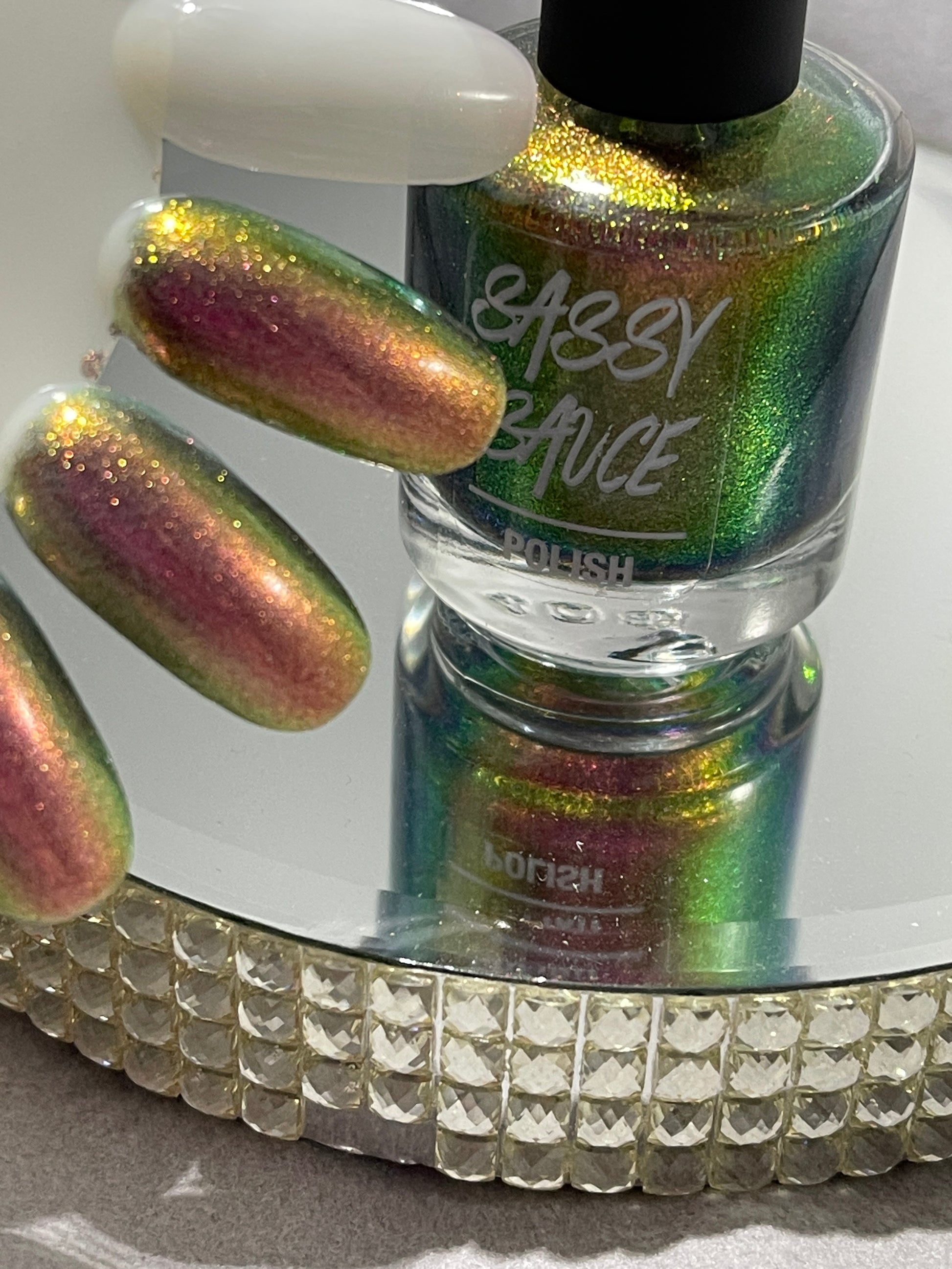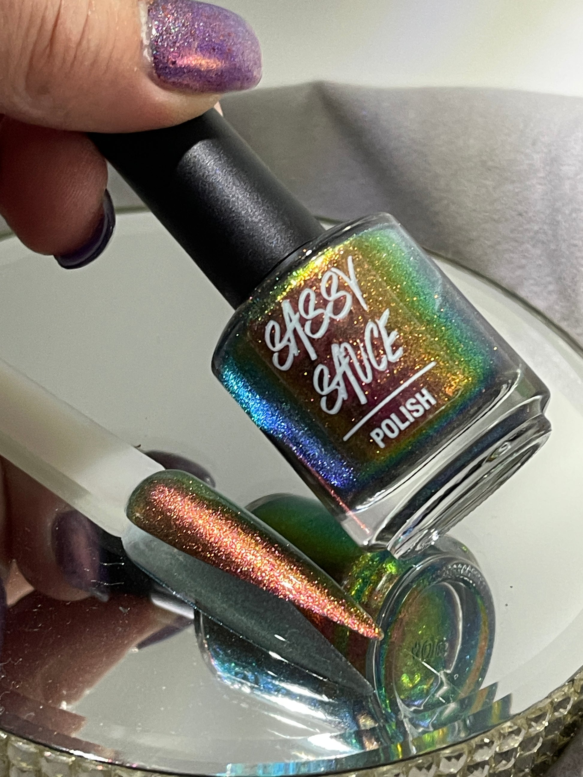 Vur.duh.grees-Means the oxidation of copper into shades of reds and greens whilst still being a copper oilslick. Will be available at sassysaucepolish.com 12/10 11 am cdt-12/31 11:59 pm cdt. Named by Mary Sandberg.