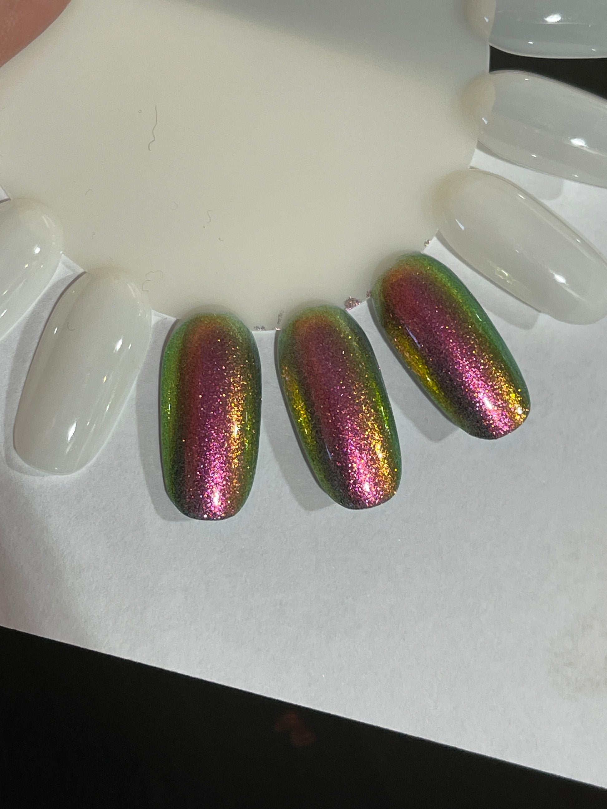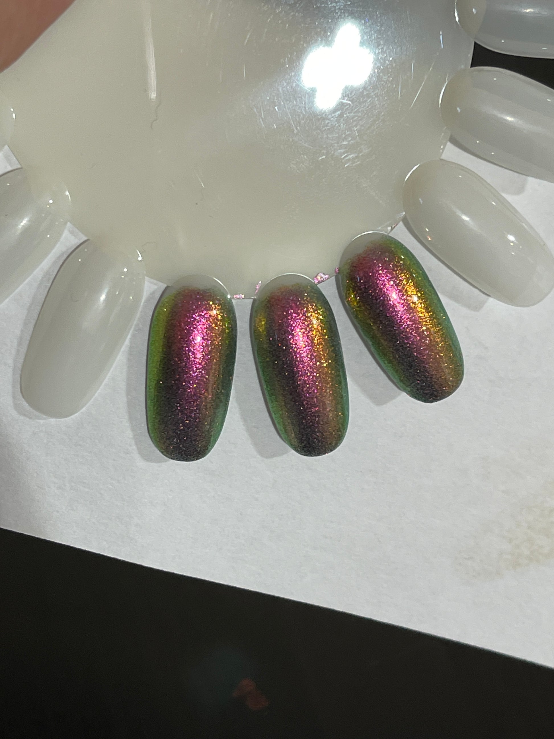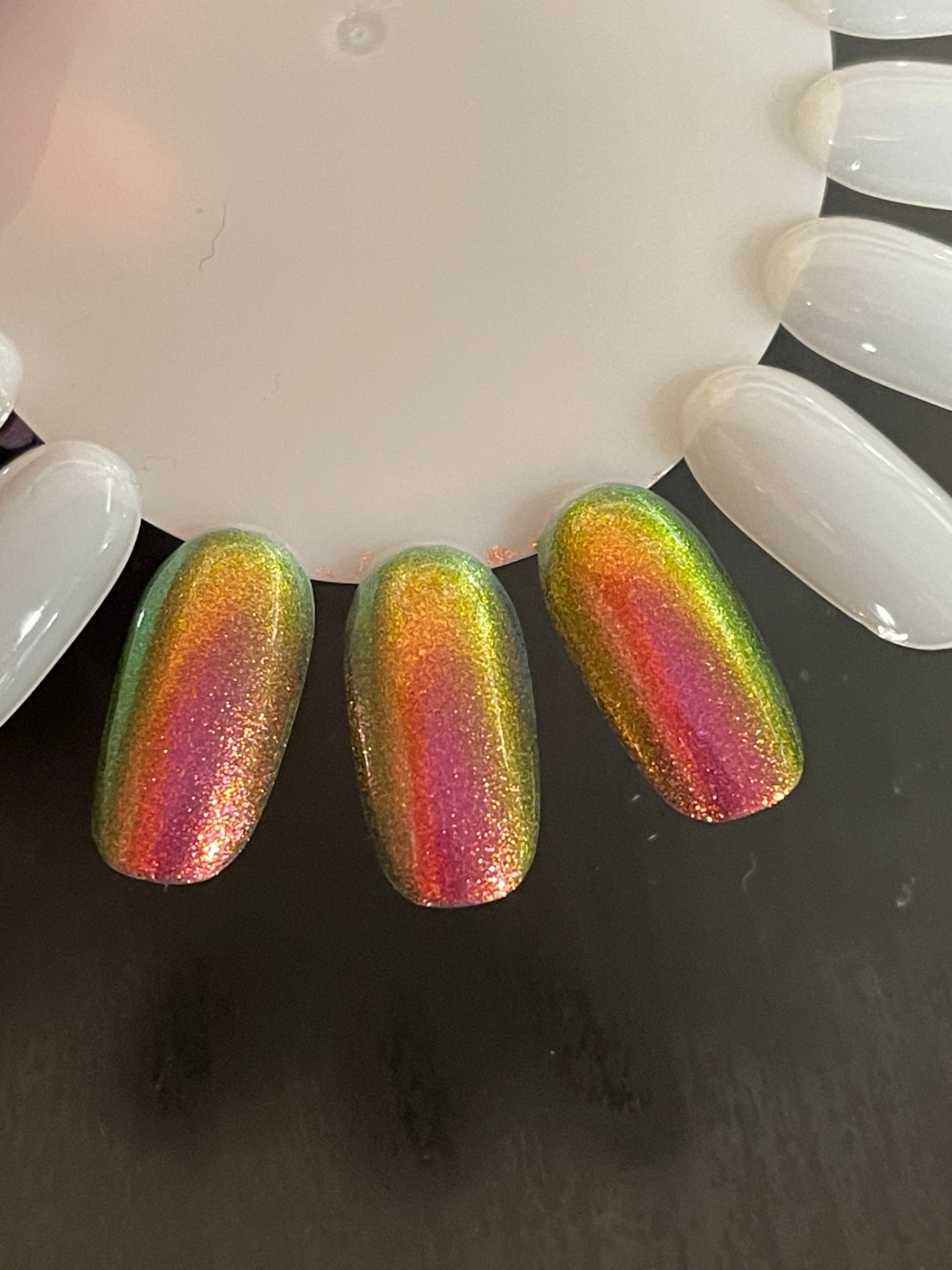A pink/copper/green/golden multichrome with a copper gold large particle aurora for that extra dazzle.