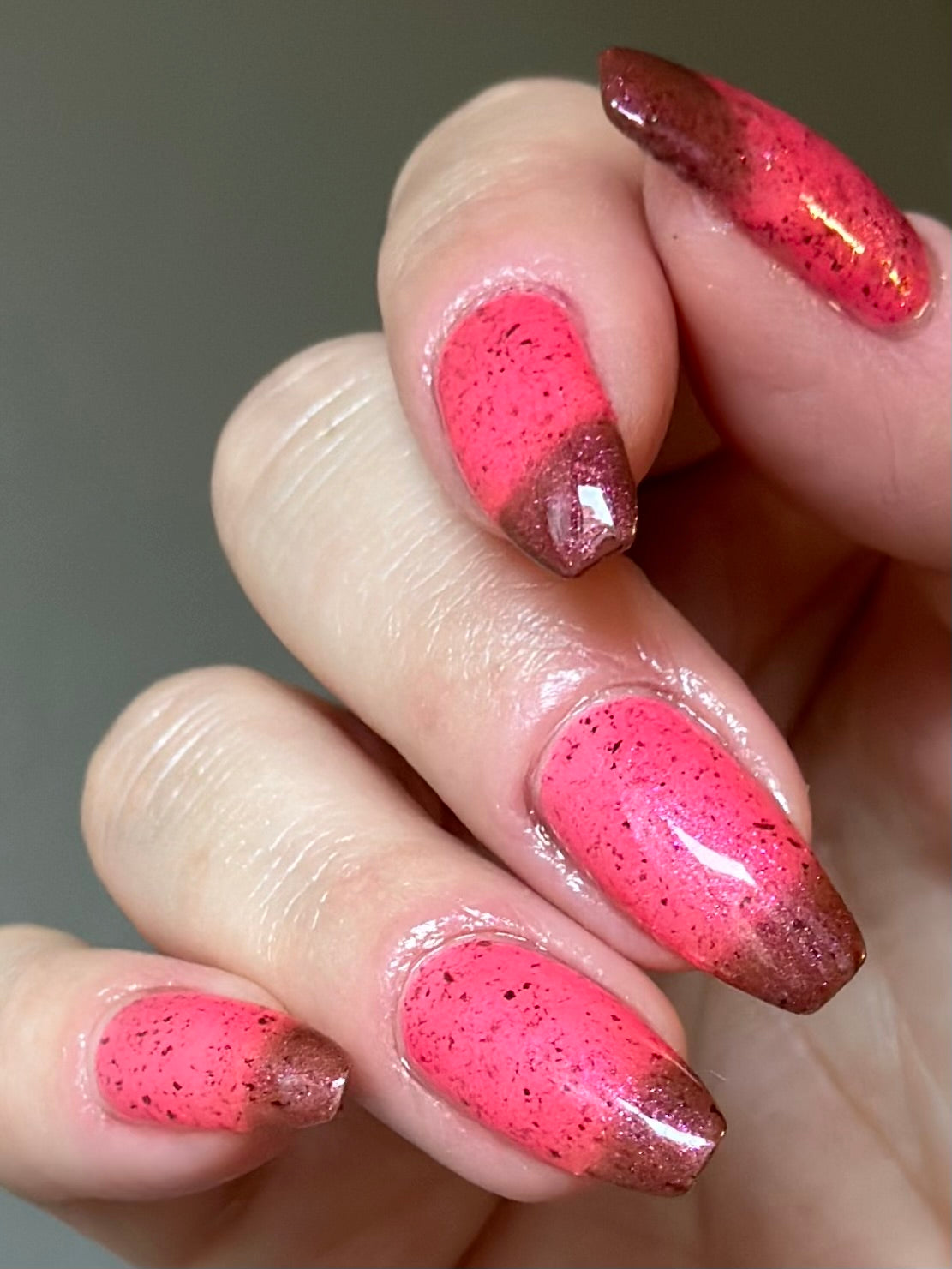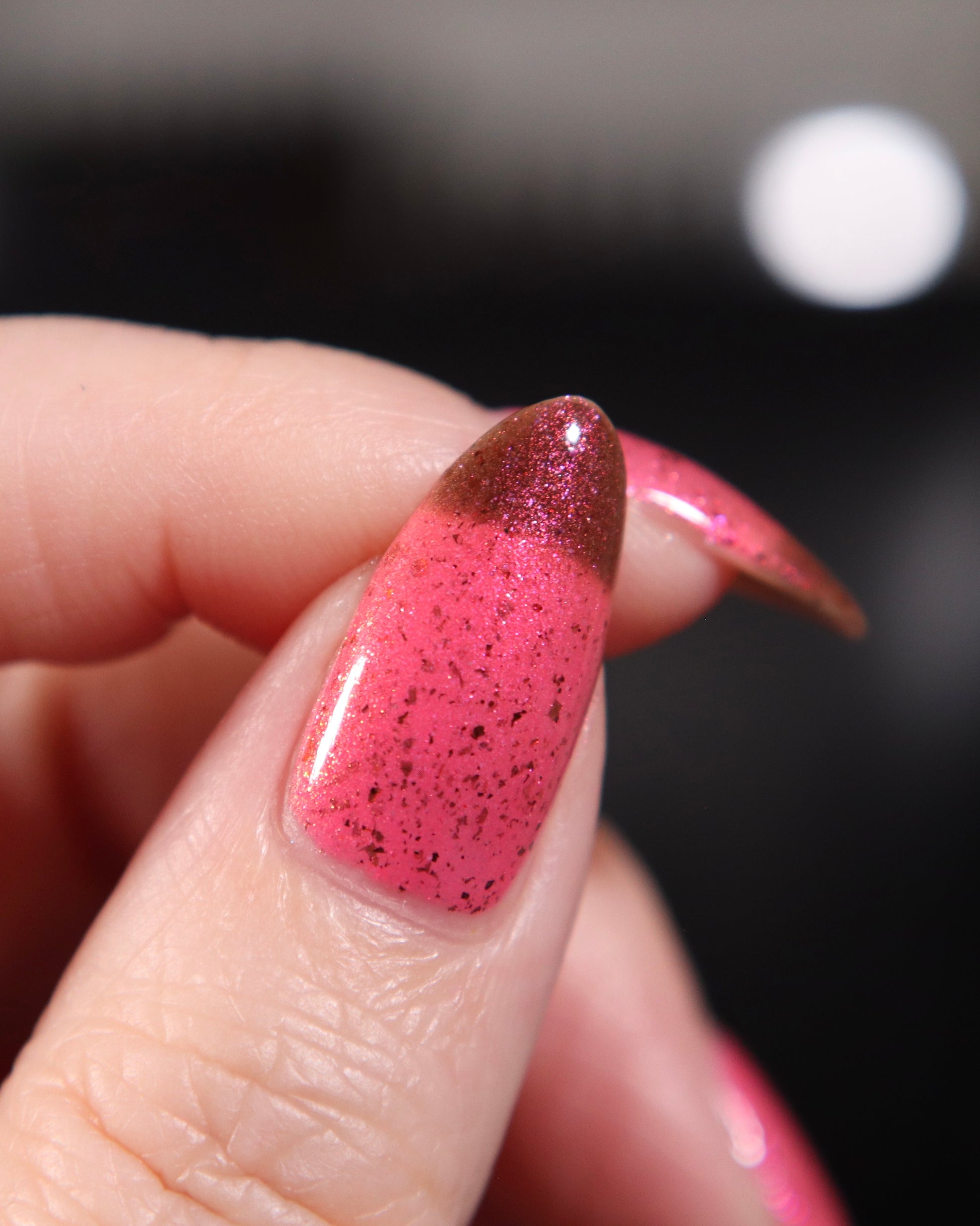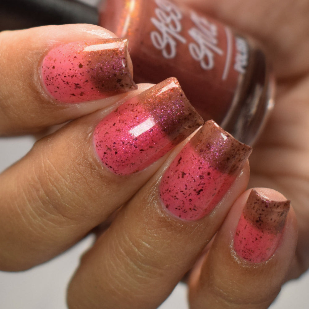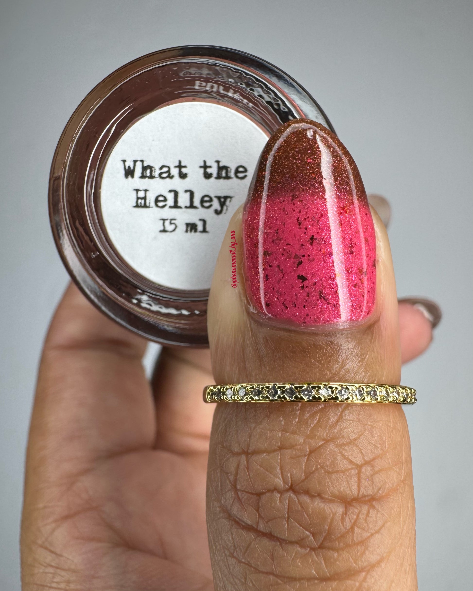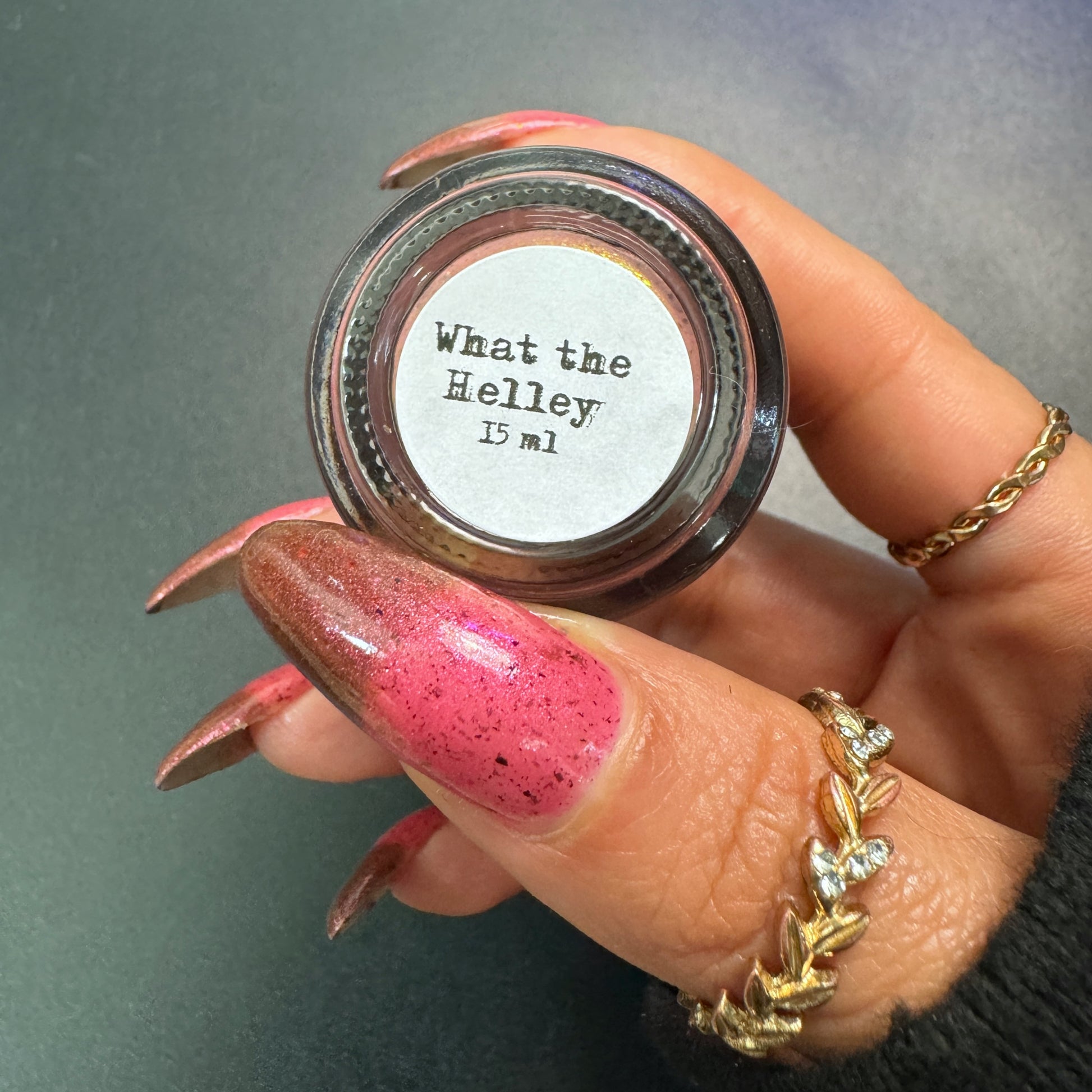 A brown (cold) to pink (warm) thermal with a golden pink shimmer and red/black UCC flakes. The name on this one came from some song. My daughter walks around the house saying what the helley all day long!!!! It just makes me giggle.