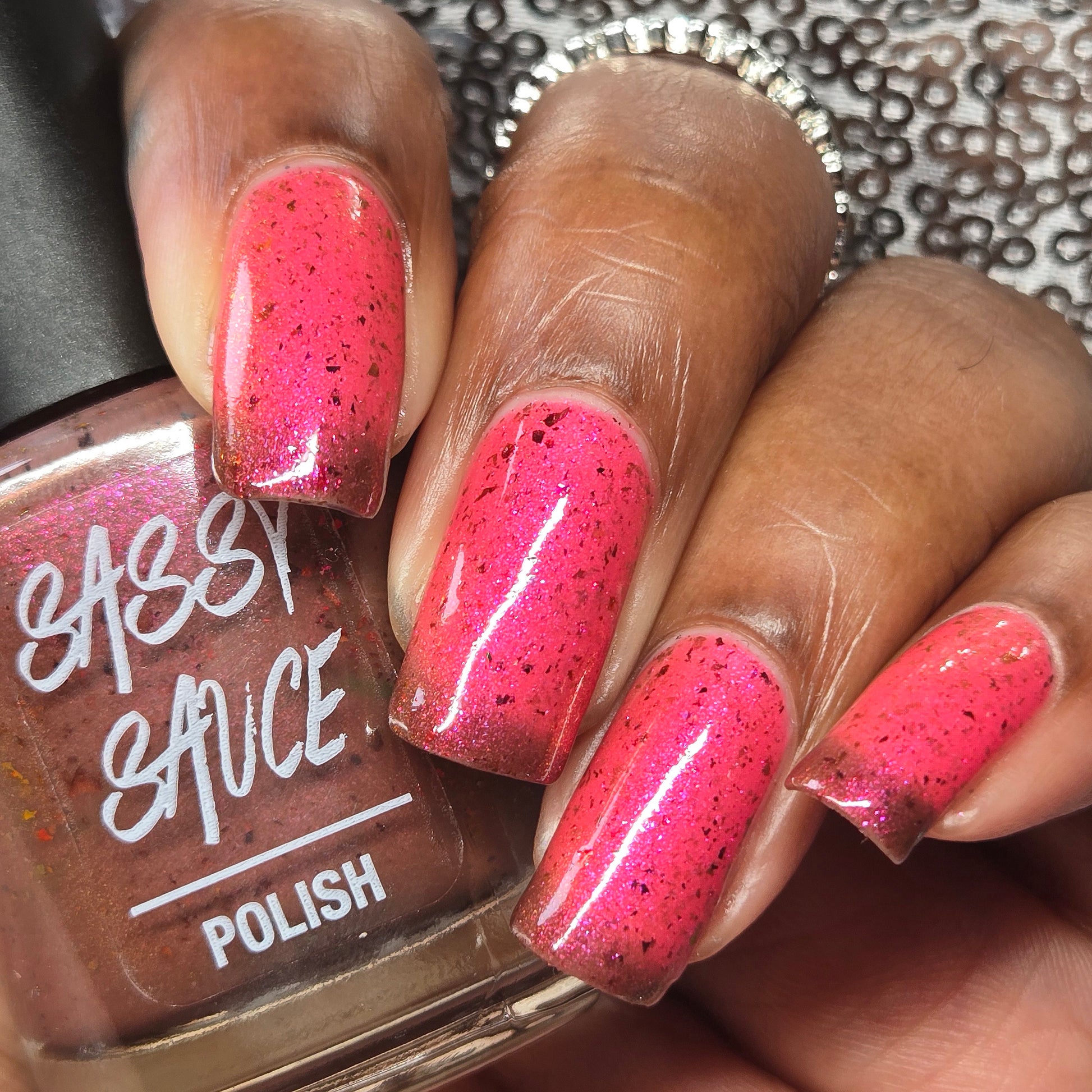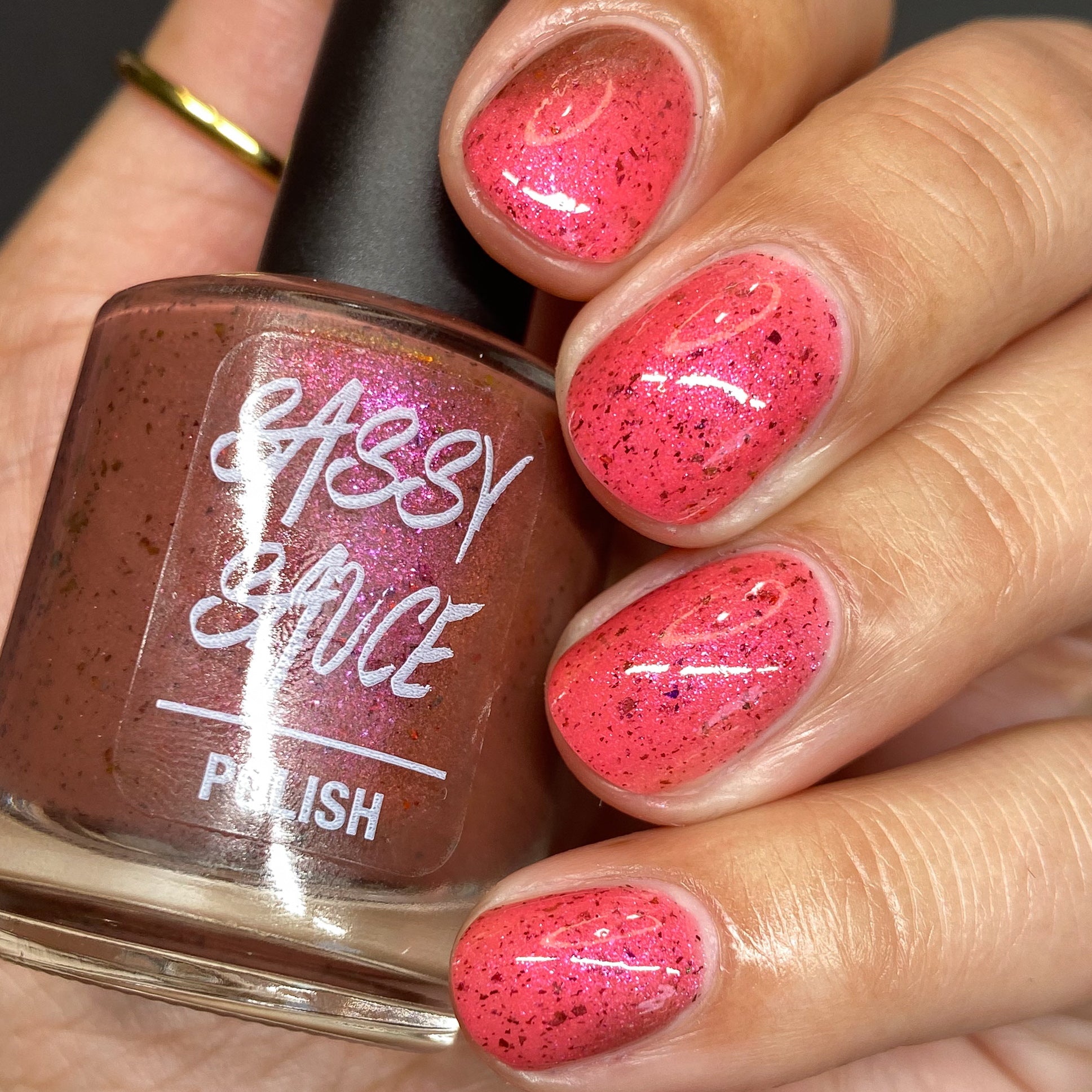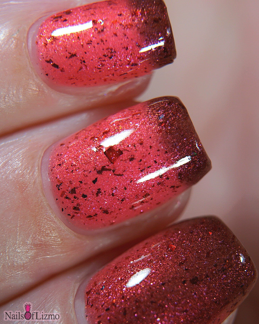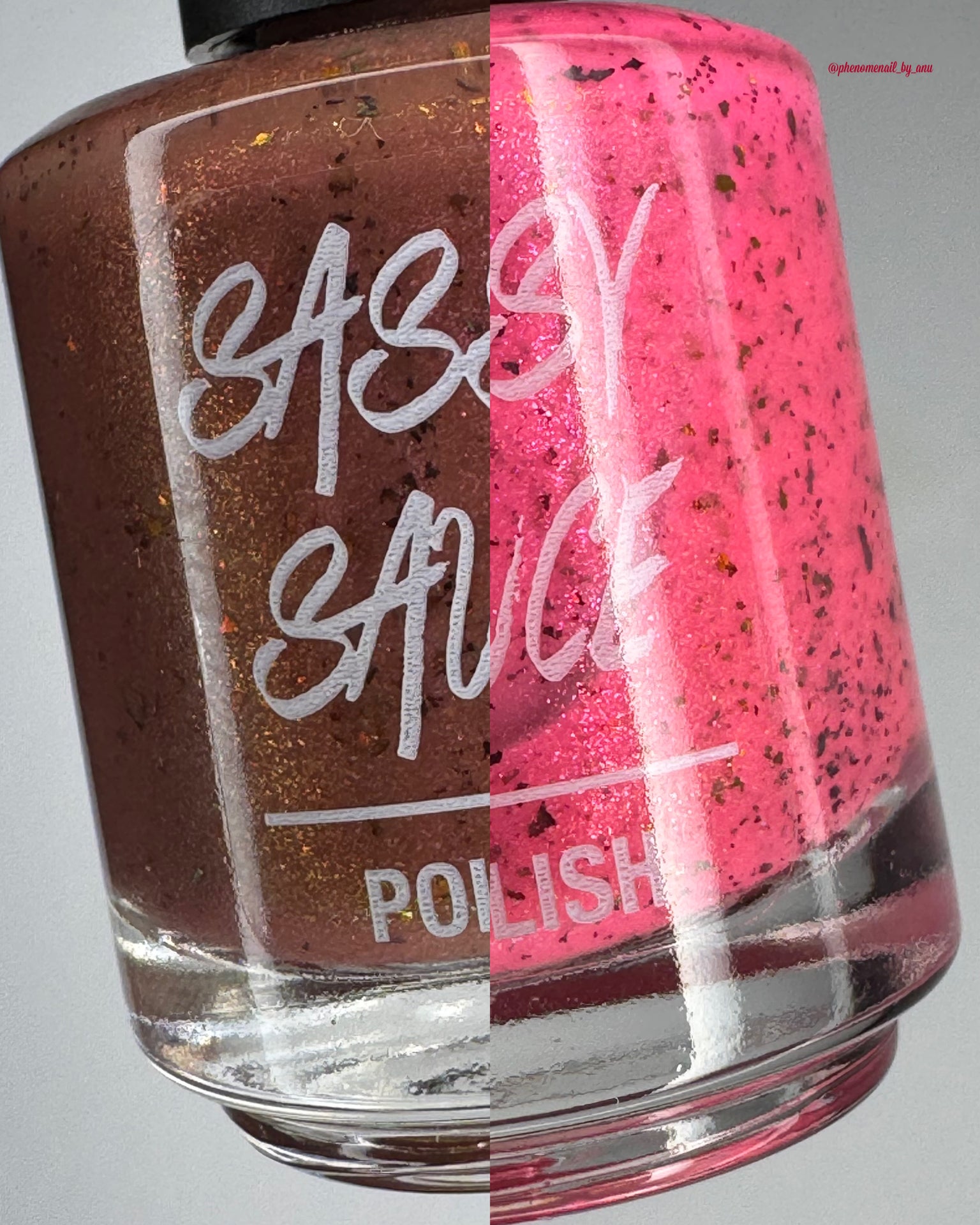 A brown (cold) to pink (warm) thermal with a golden pink shimmer and red/black UCC flakes. The name on this one came from some song. My daughter walks around the house saying what the helley all day long!!!! It just makes me giggle.