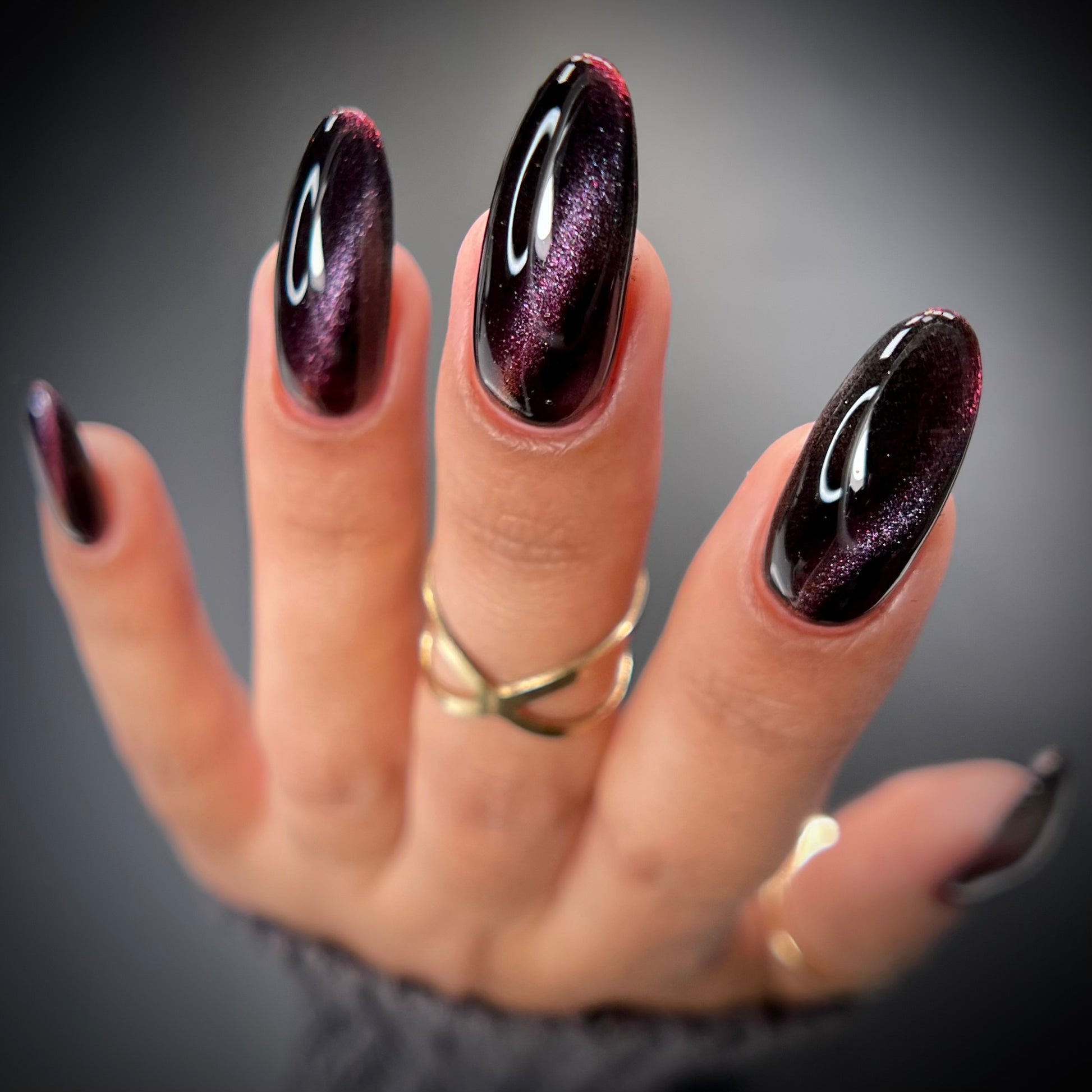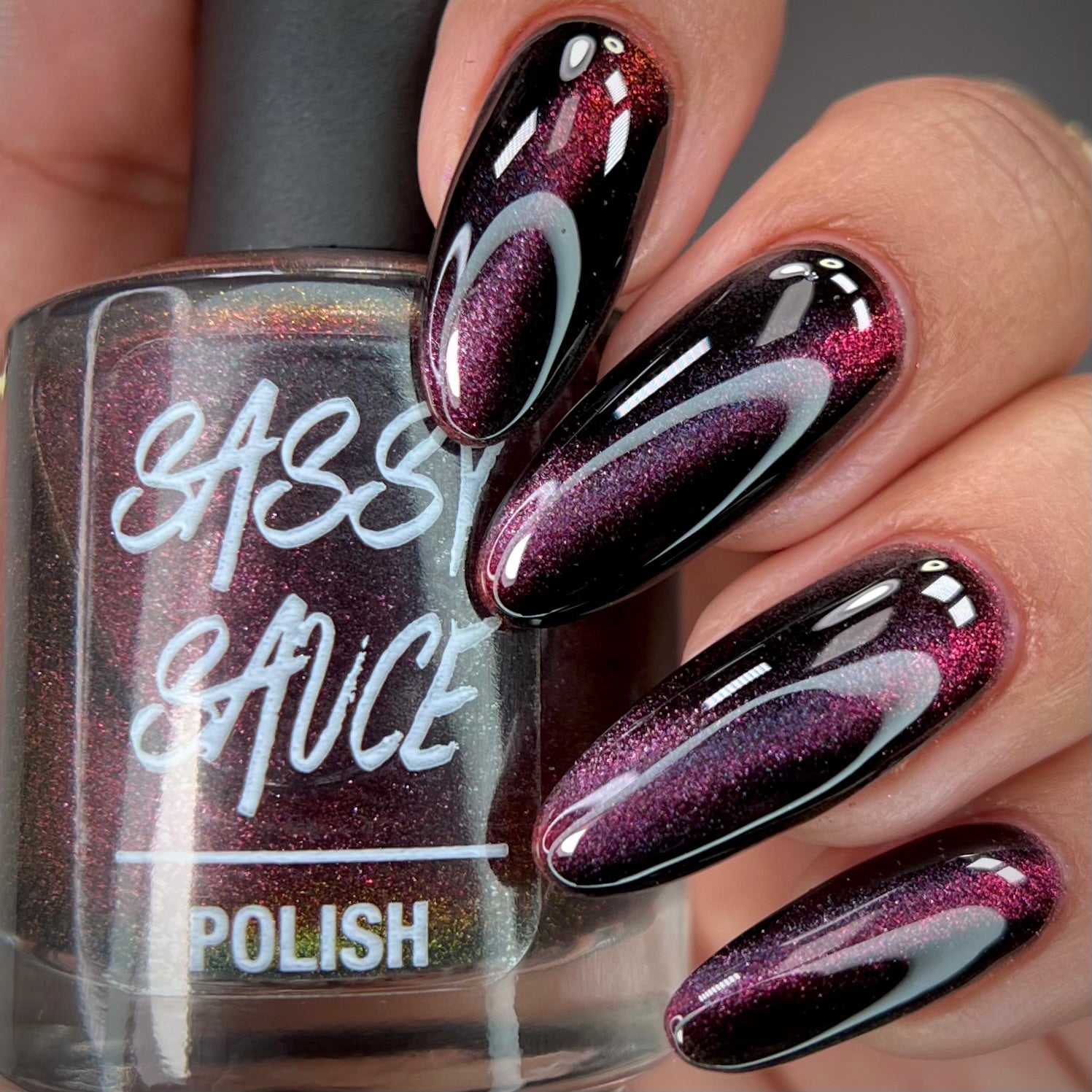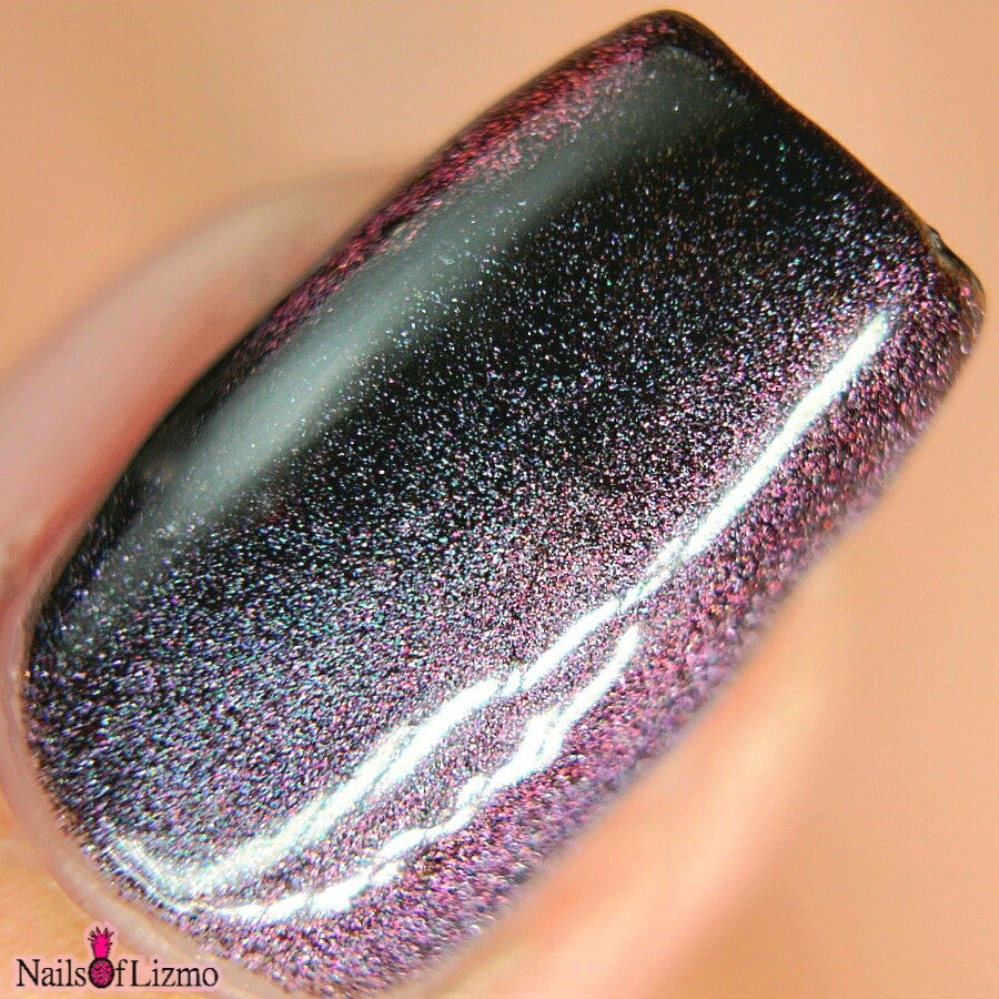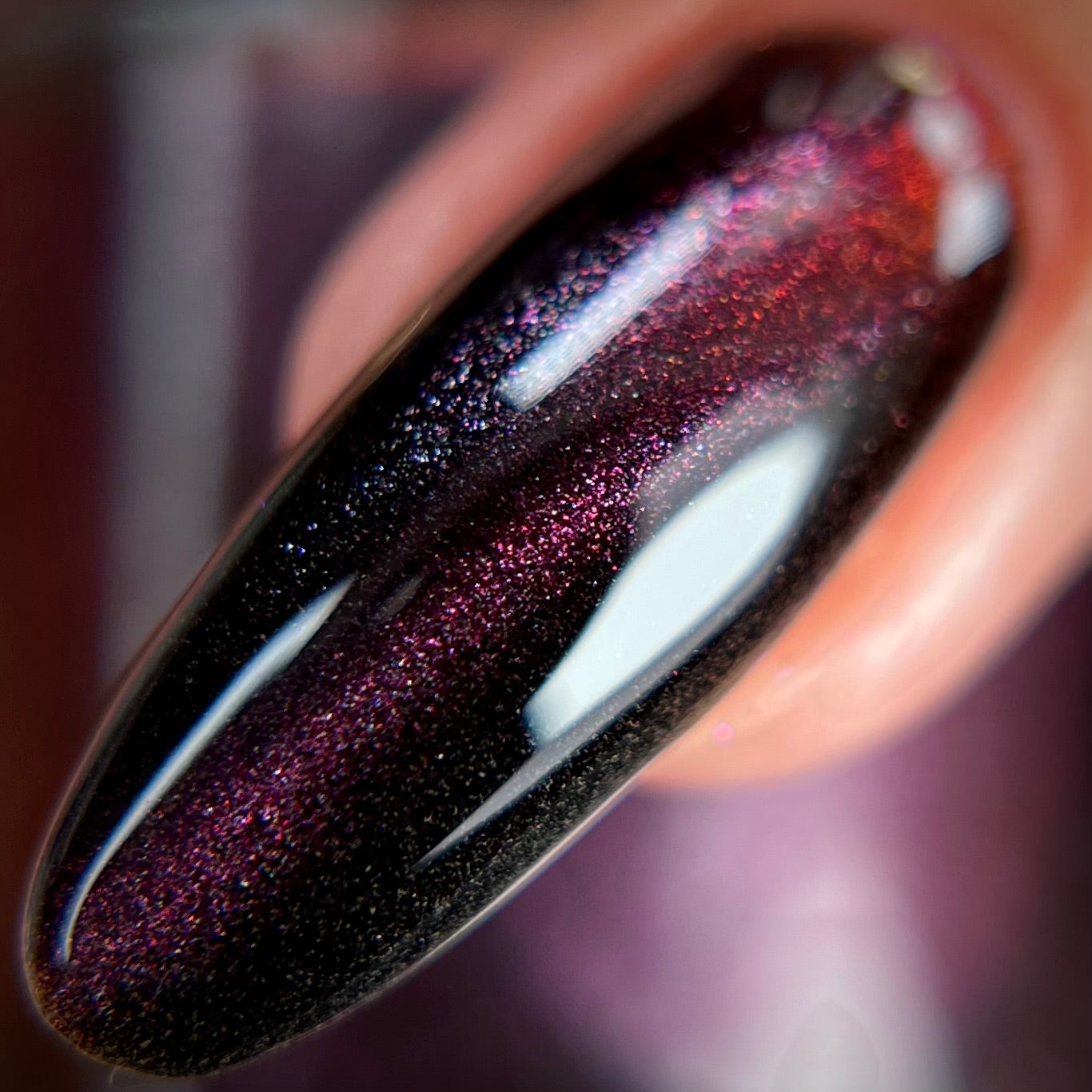 Remember the black/red multi chrome we all know and love? This is a magnetic version!!!! When magnetized, it will pull an eerie copper/red/silver cat eye!!!! This shade has many different faces and fair warning... it is very distracting!!!!! Named by Mary Sandberg.