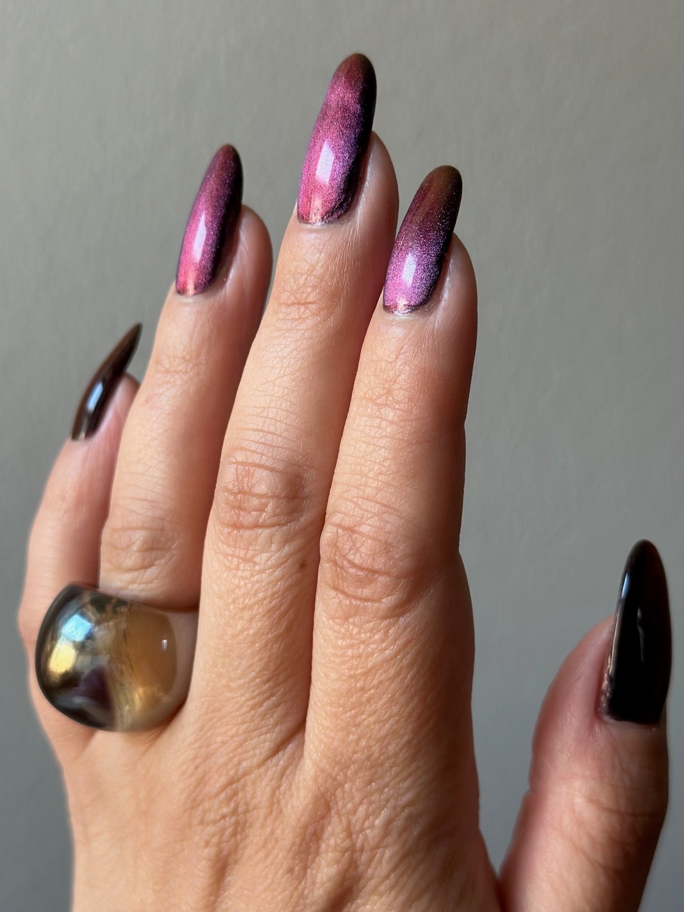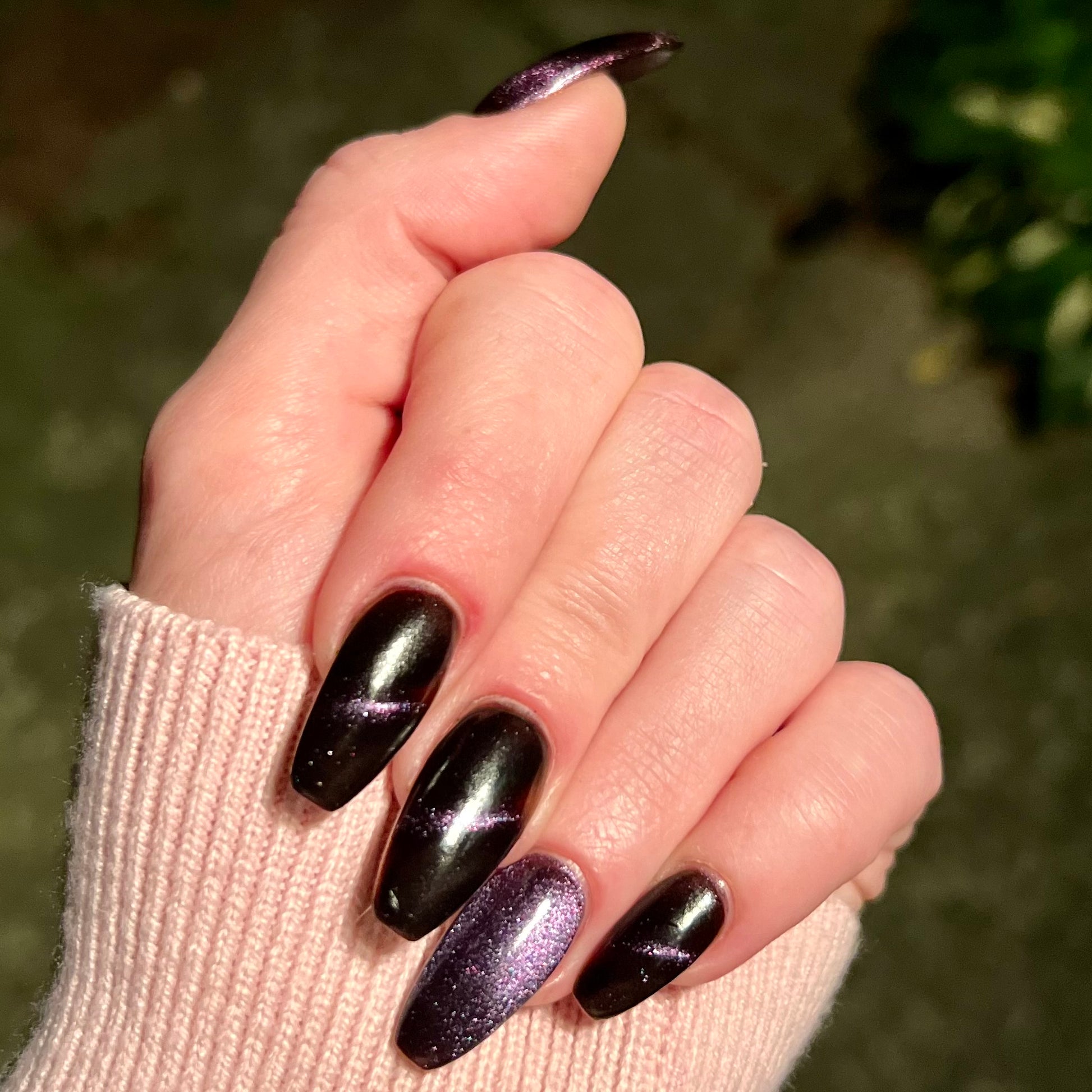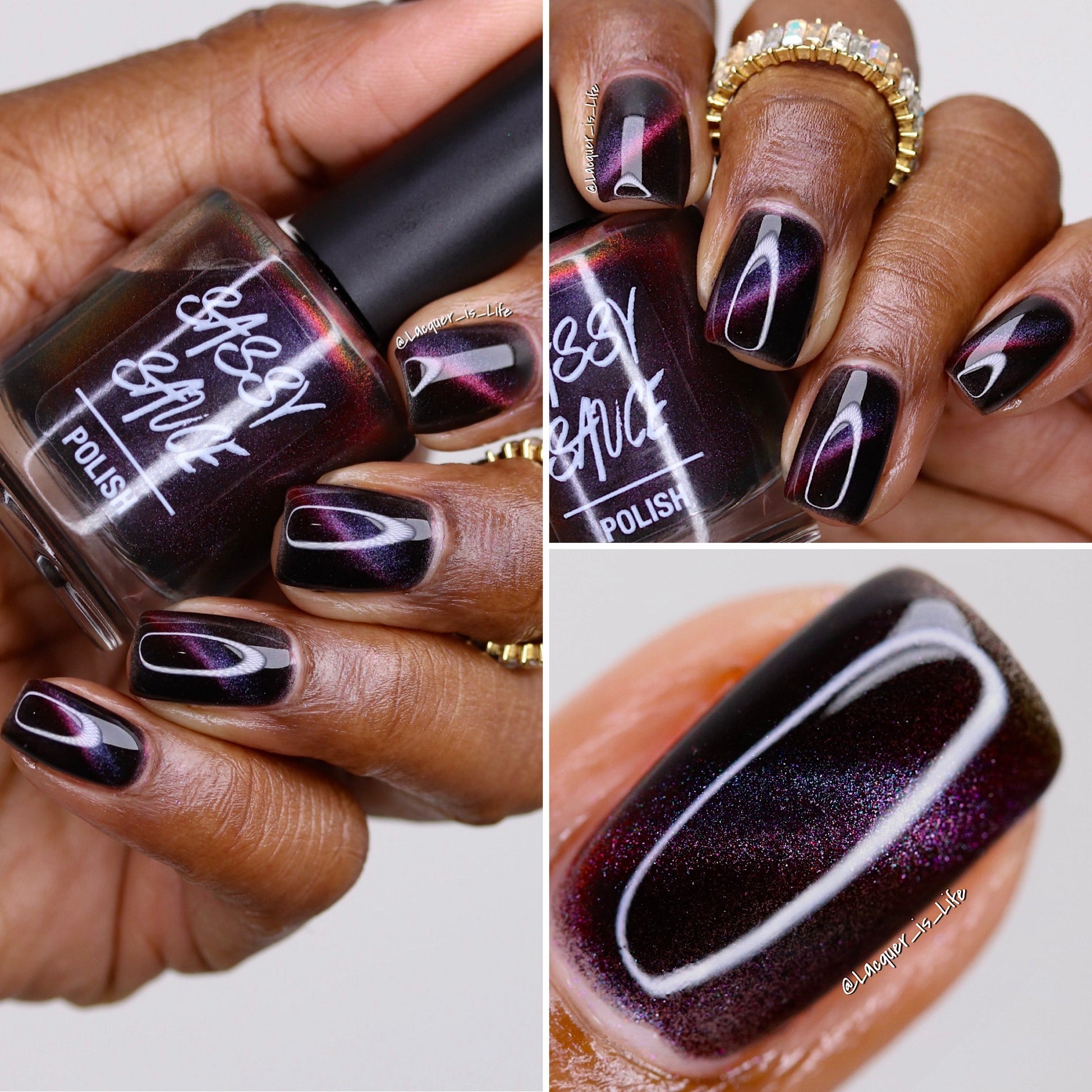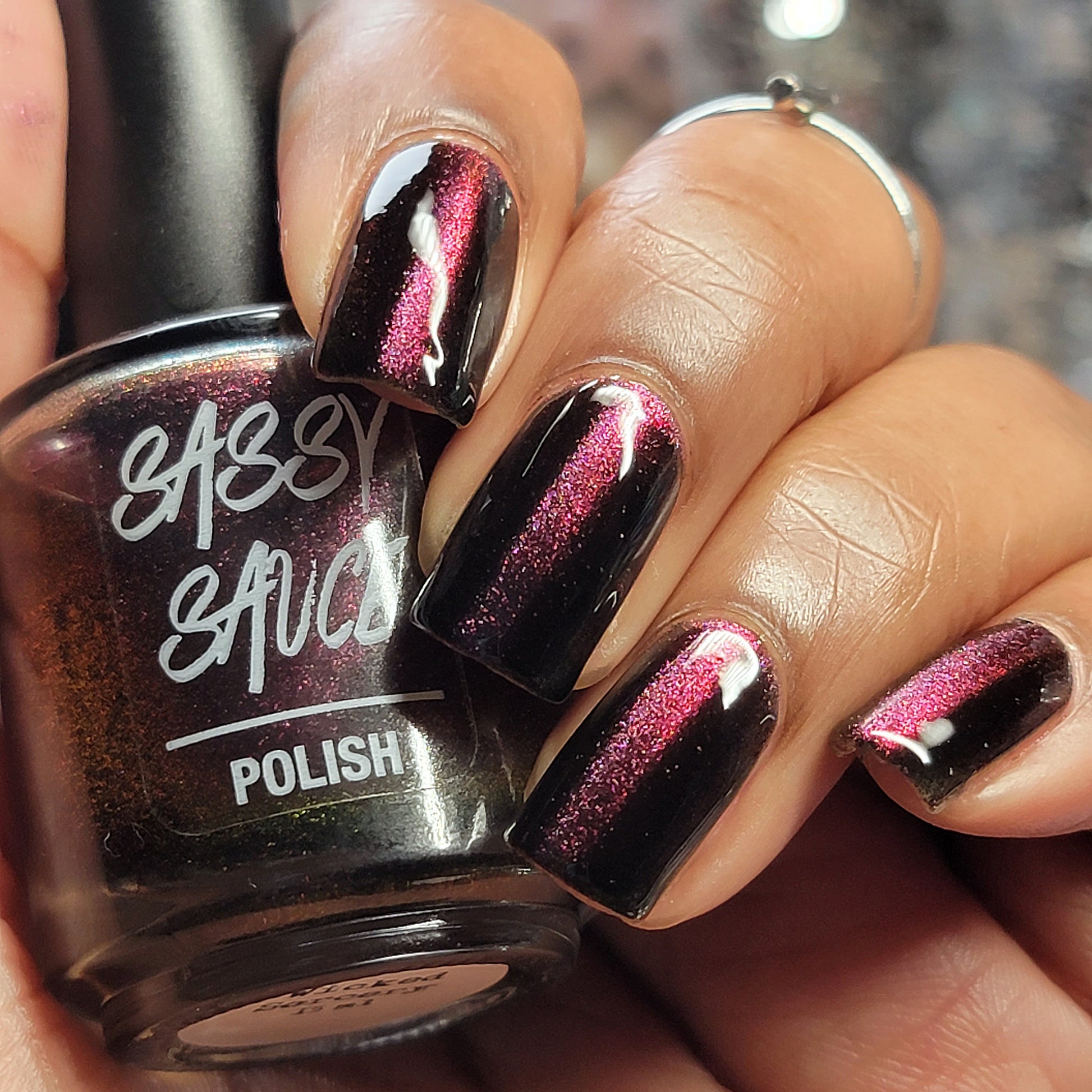 Remember the black/red multi chrome we all know and love? This is a magnetic version!!!! When magnetized, it will pull an eerie copper/red/silver cat eye!!!! This shade has many different faces and fair warning... it is very distracting!!!!! Named by Mary Sandberg.